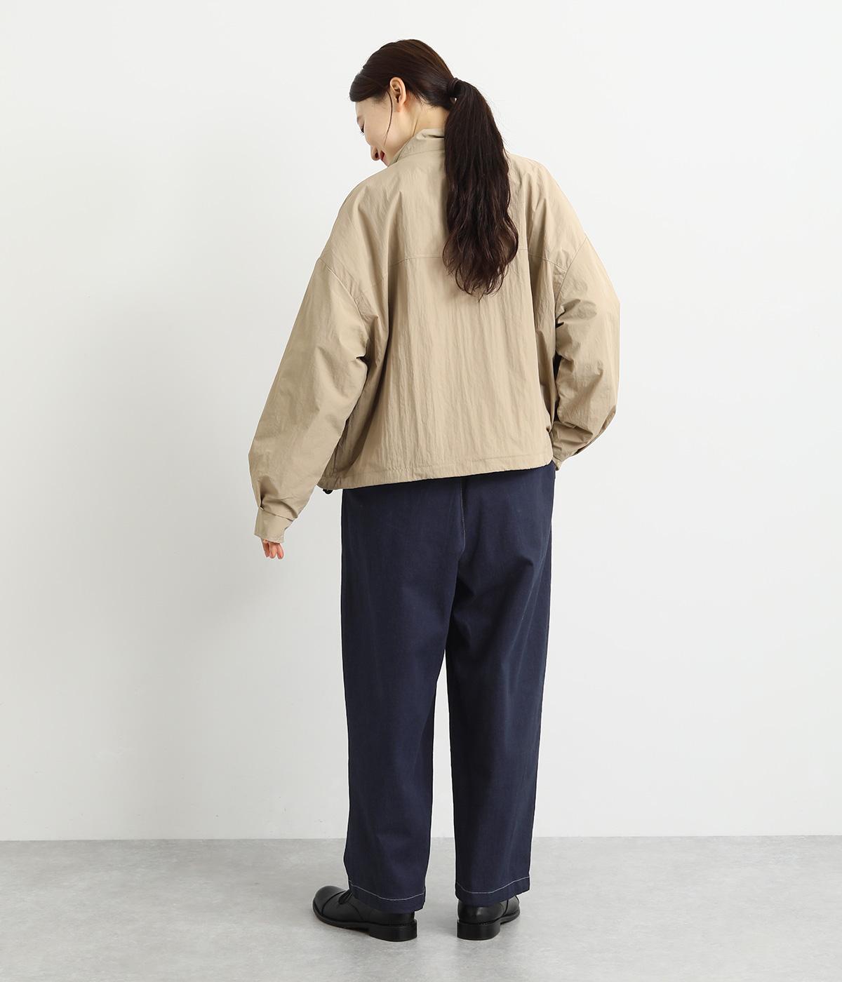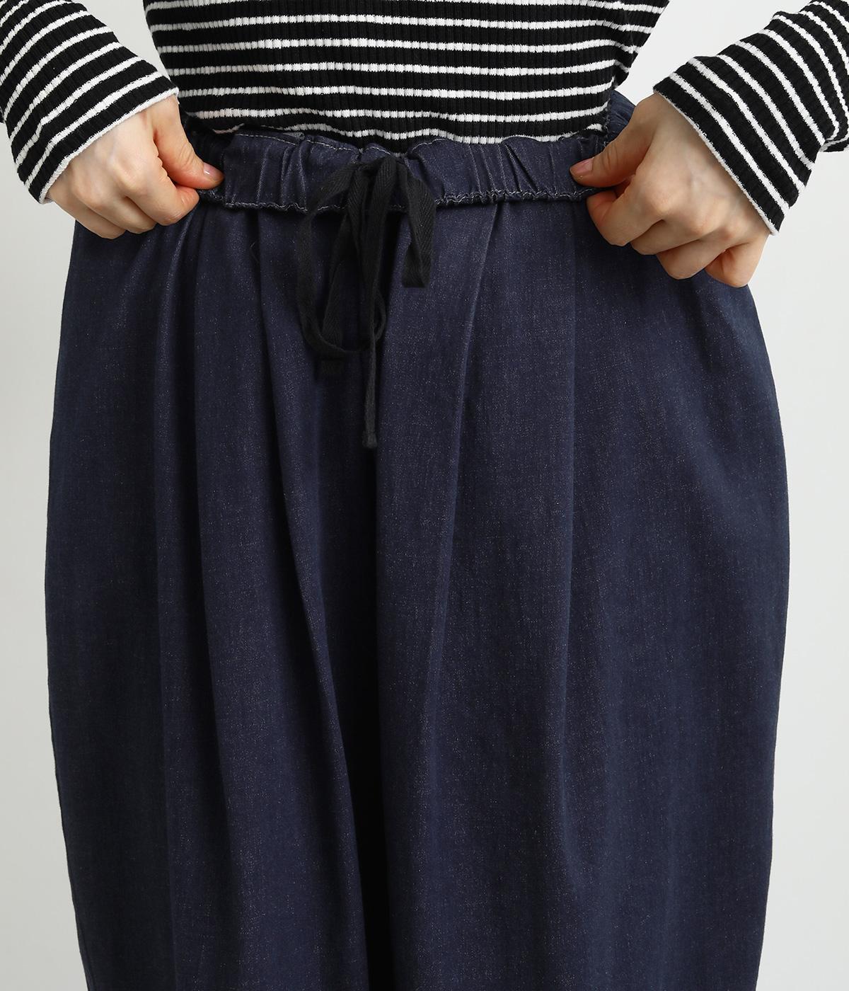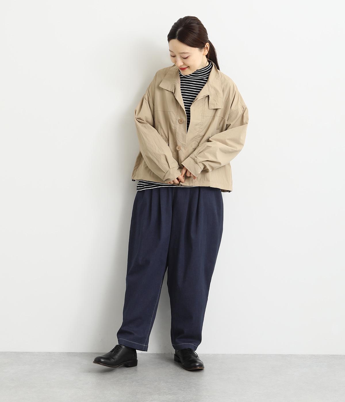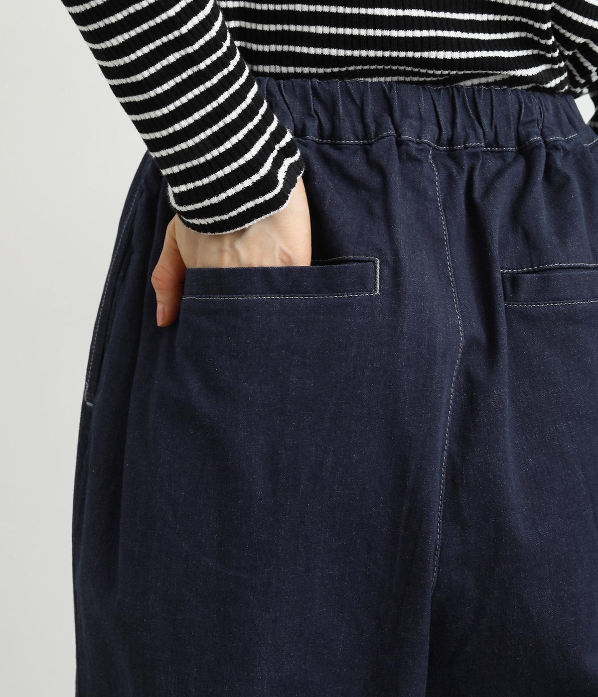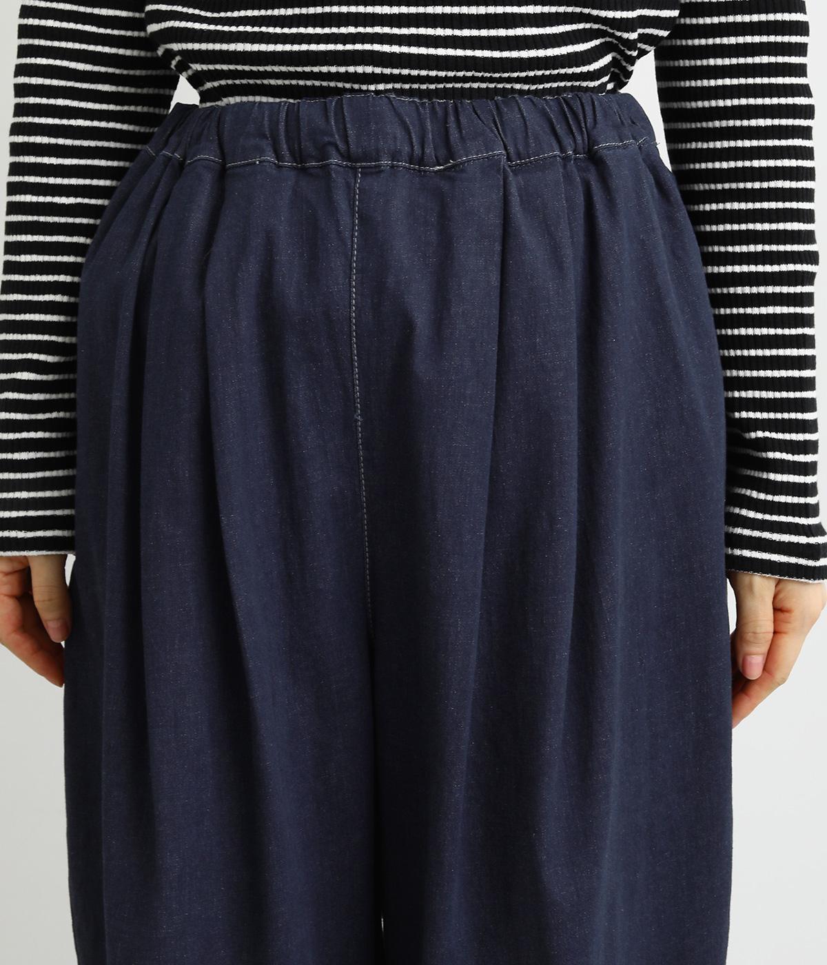 タック入りの緩やかなテーパードで、すっきりとした印象に。ウエストは総ゴムで紐で調節が可能です。バックポケットもさりげないアクセントになっています。動きやすく快適で、日常に寄り添う一本です。
