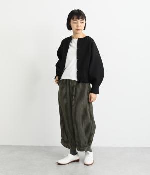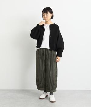 細いストライプのプリントで、ポケットと裾はボーダーで遊び心を演出しています。裾がすぼまって丸みのあるシルエット。体のラインを拾わずにゆったりした着心地です。ウエストは総ゴムで紐で調節できます。
