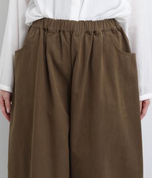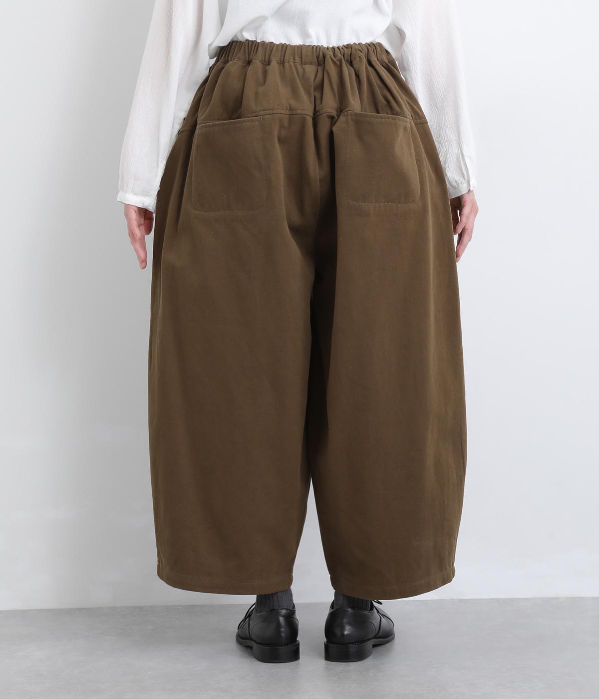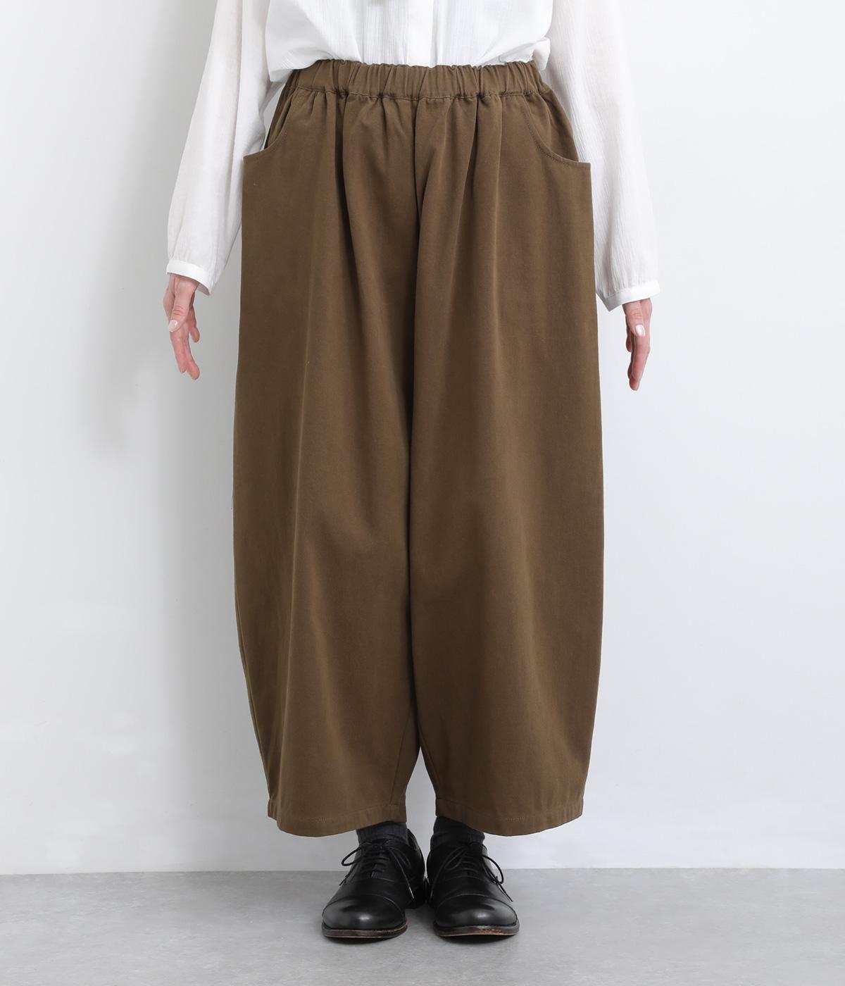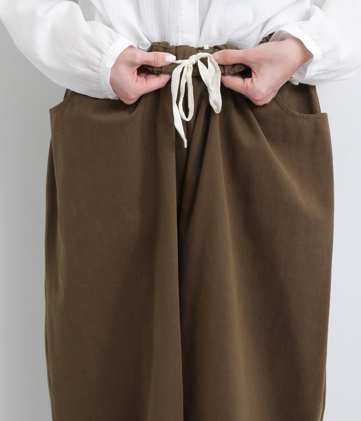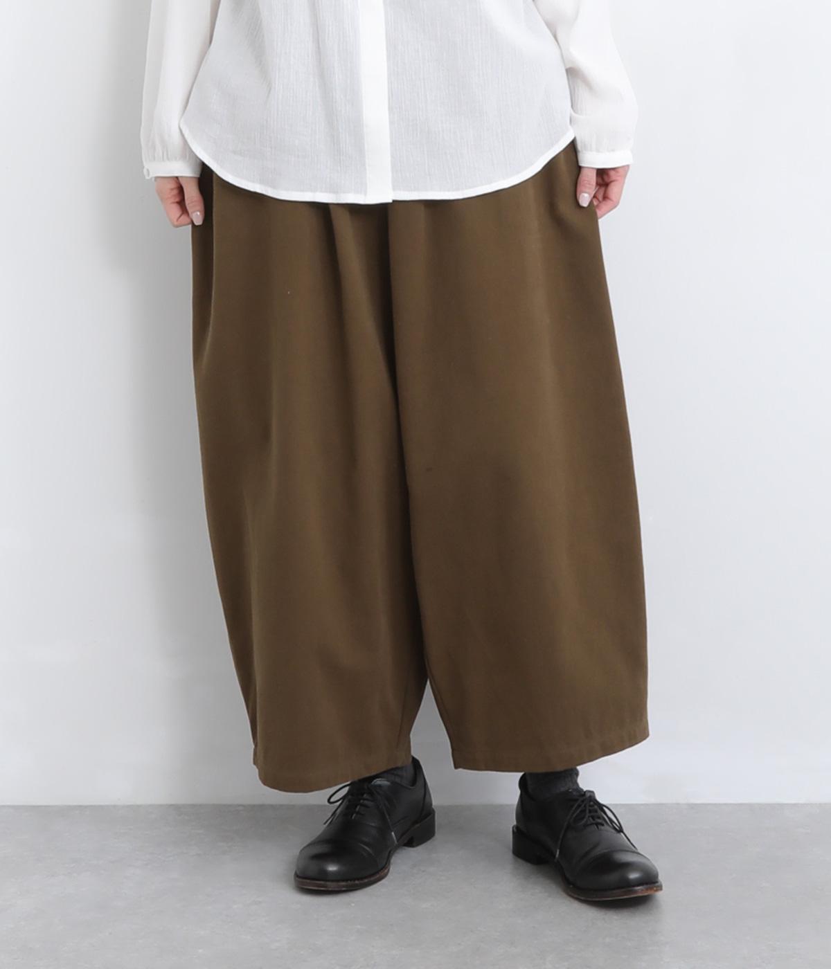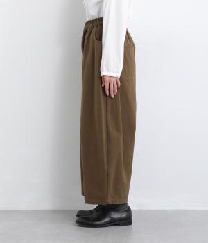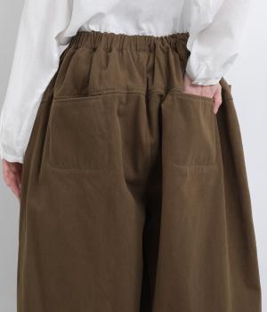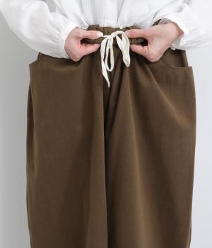 こなれ感のあるワイドシルエットをテーパードシルエットで仕上げました。たっぷりの生地がきれいな落ち感をつくり、カジュアルにもきれいめにも着まわせます。ウエストは総ゴム使用で紐でサイズ調節が可能です。
