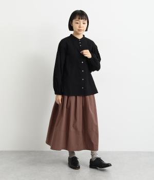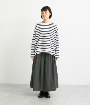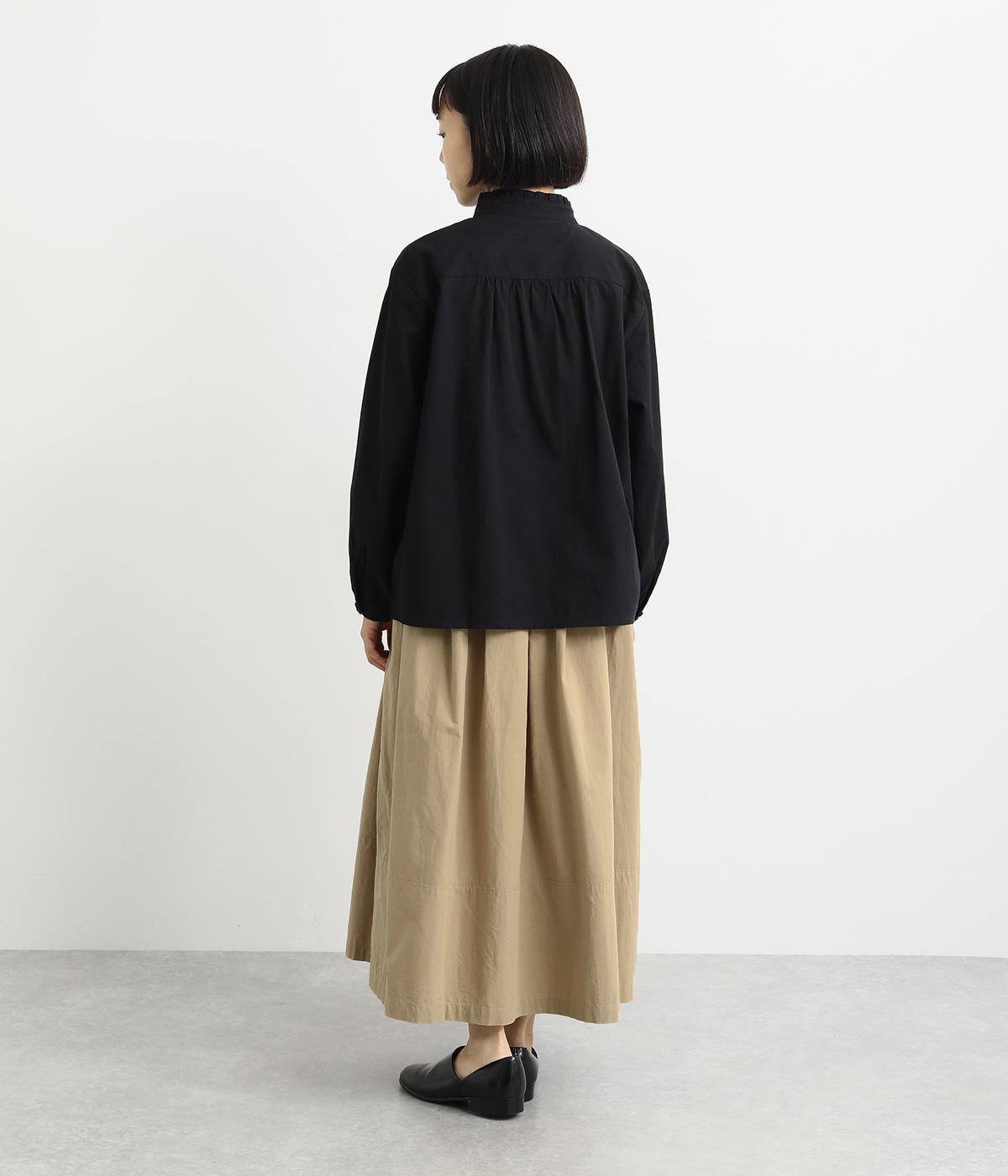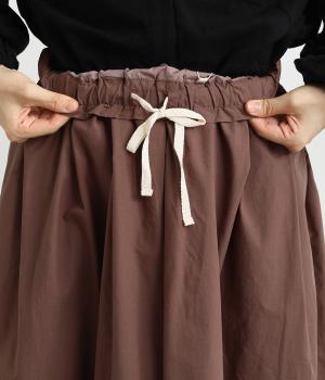シンプルでタイムレスな一枚です。たっぷり入ったギャザーがふわりと表情を与えます。裾部分に入った切り替え風のステッチがさりげないポイントに。ウエストは総ゴムで紐で調節できます。