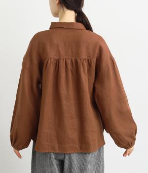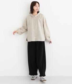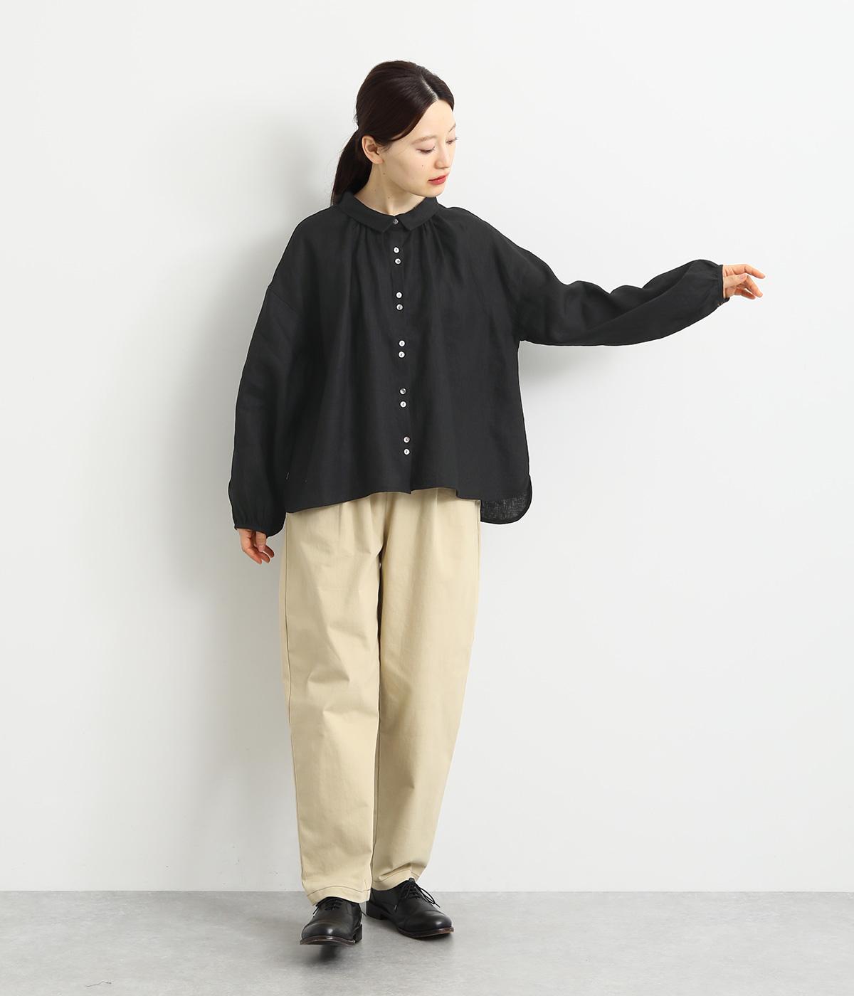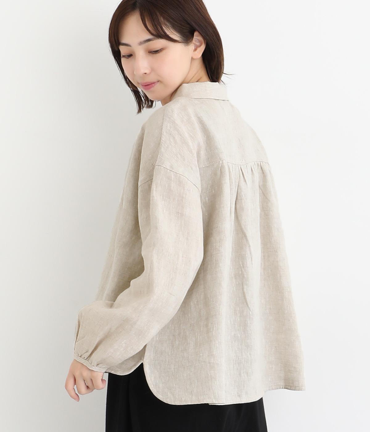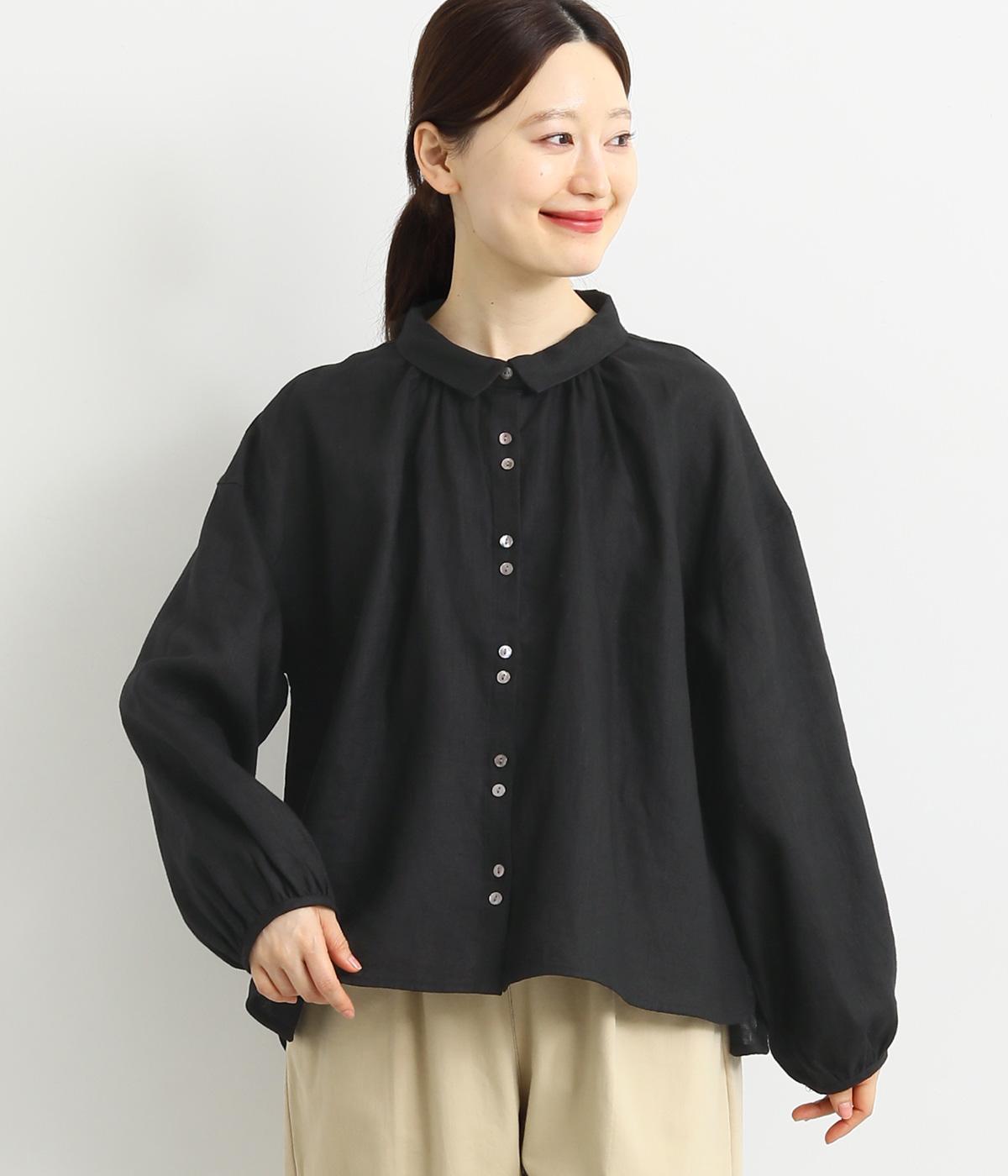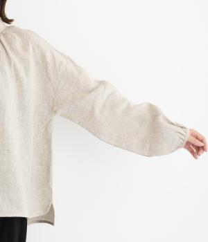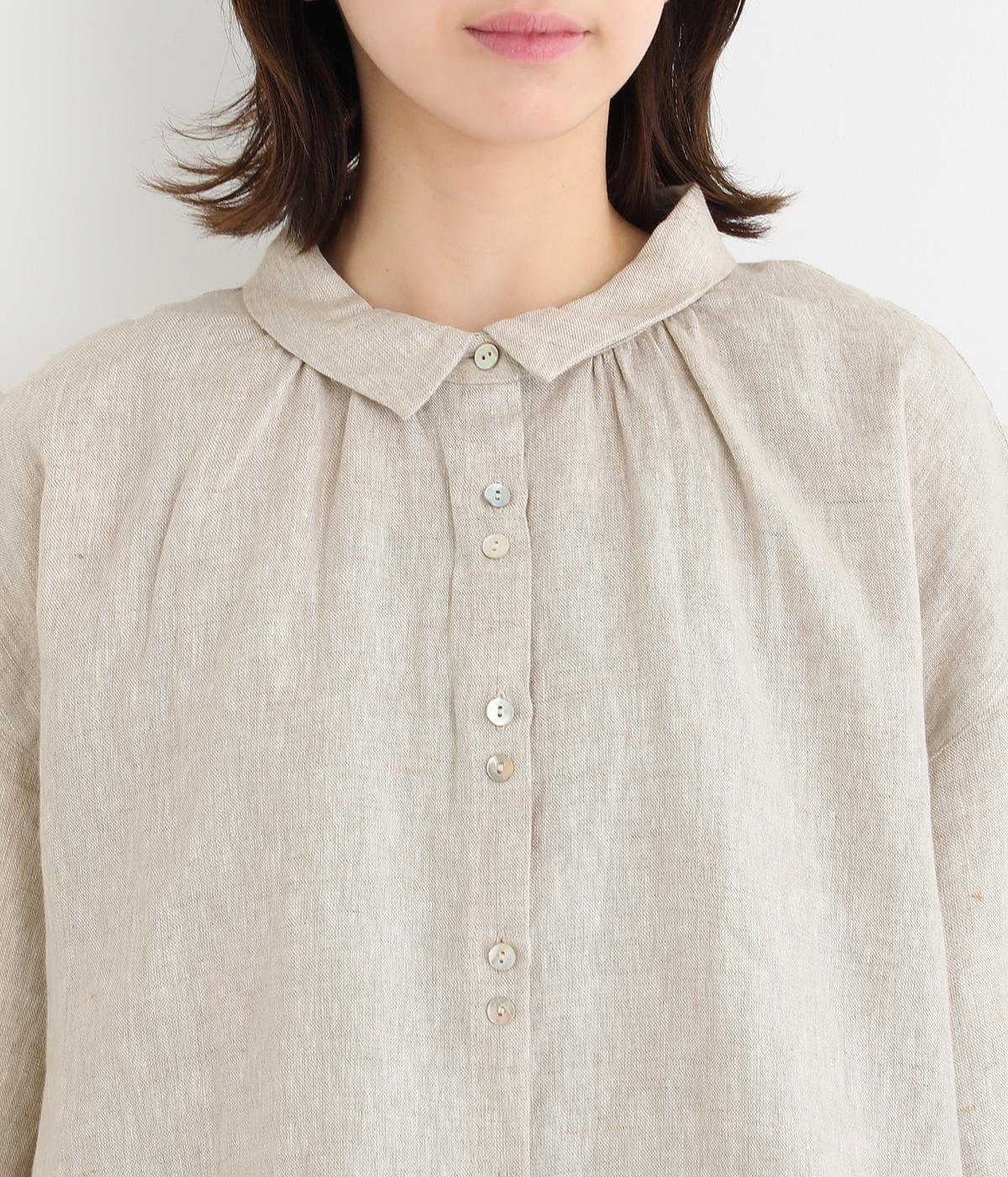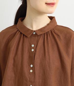 大人のナチュラルスタイルにぴったりなリネンブラウス。首元にやさしく添わせた小さめの襟と随所に施したギャザーが愛らしいムードを運びます。2つずつリズムよく並べたフロントボタンもアクセントに。前後差をつけたラウンドヘムが着こなしを整え、スカートにもパンツにも好相性です。