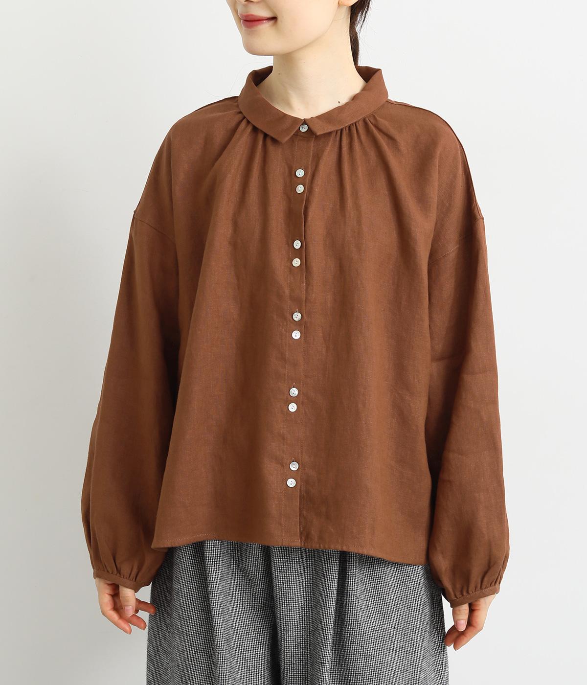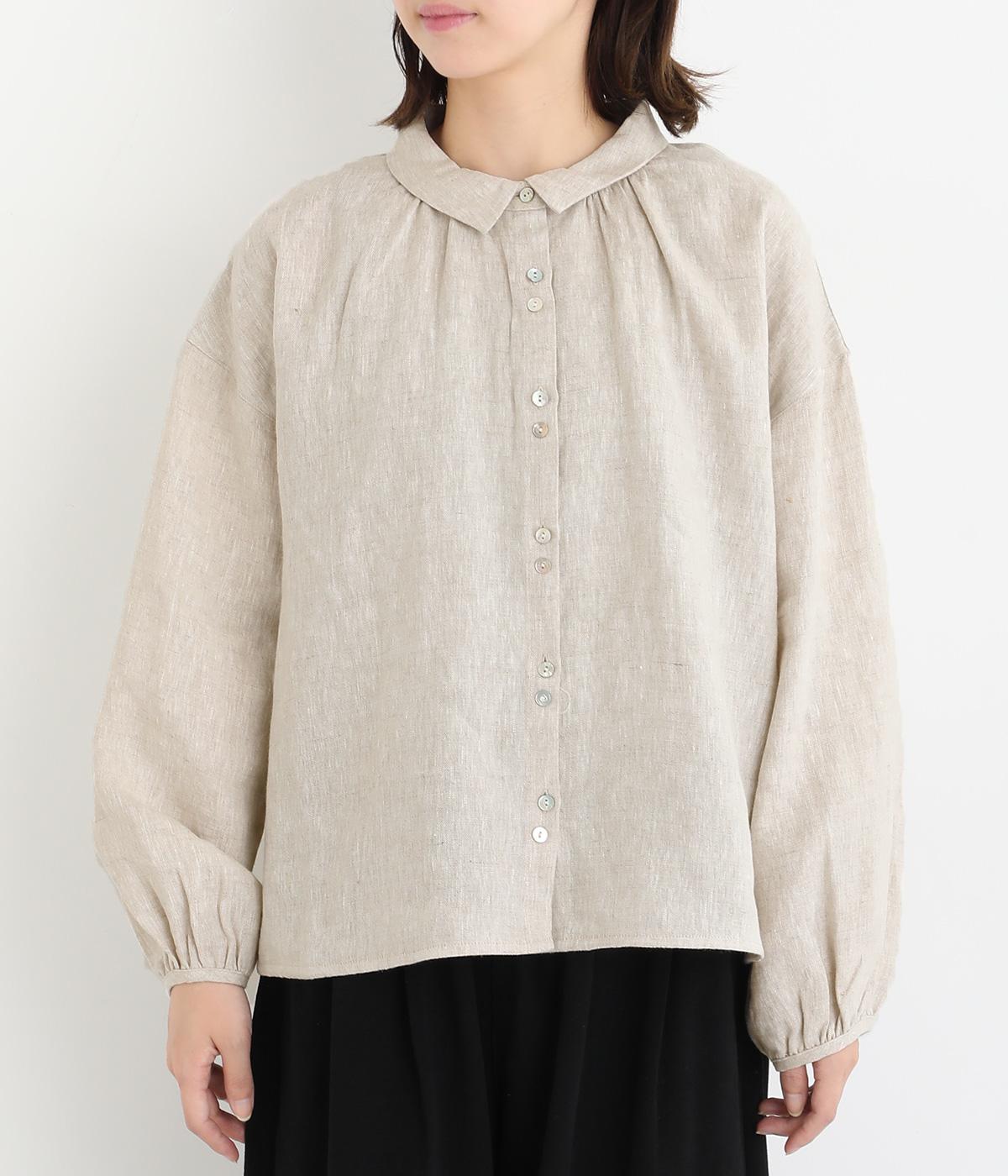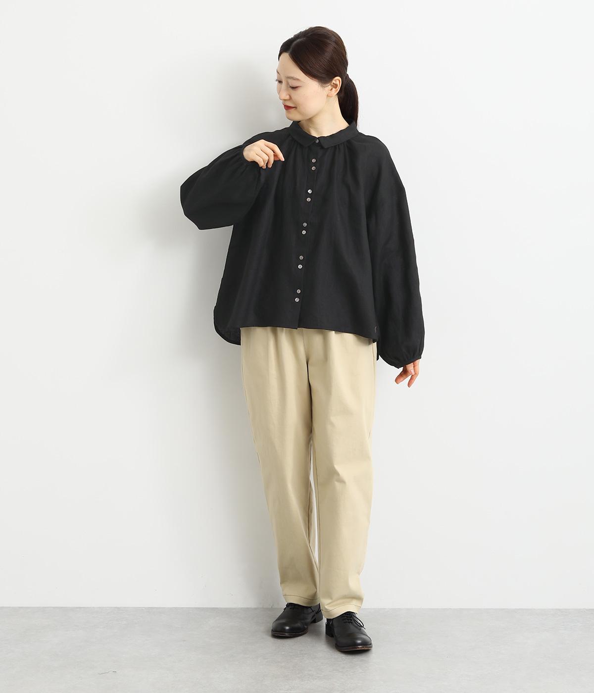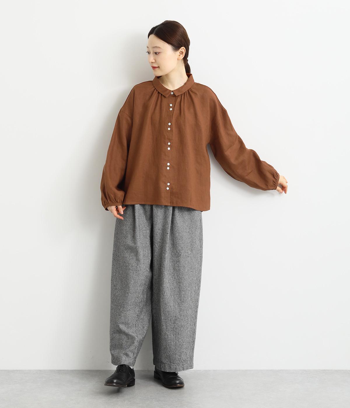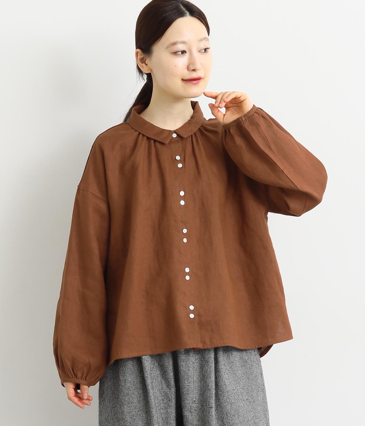 大人のナチュラルスタイルにぴったりなリネンブラウス。首元にやさしく添わせた小さめの襟と随所に施したギャザーが愛らしいムードを運びます。2つずつリズムよく並べたフロントボタンもアクセントに。前後差をつけたラウンドヘムが着こなしを整え、スカートにもパンツにも好相性です。