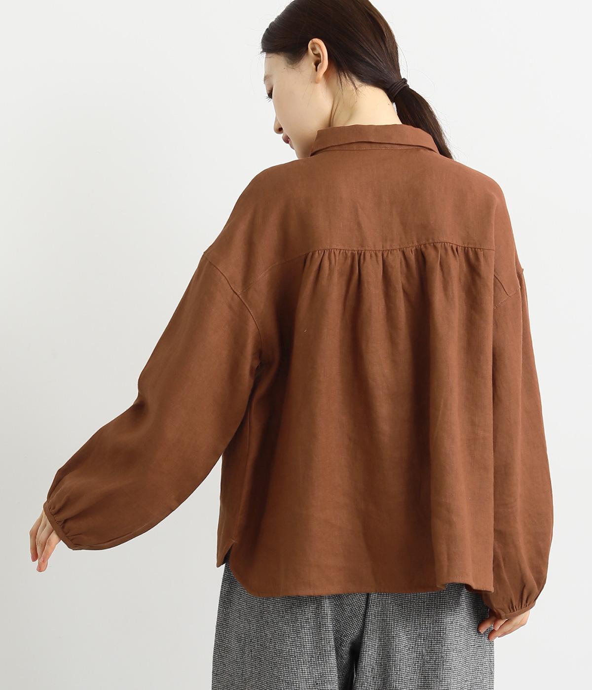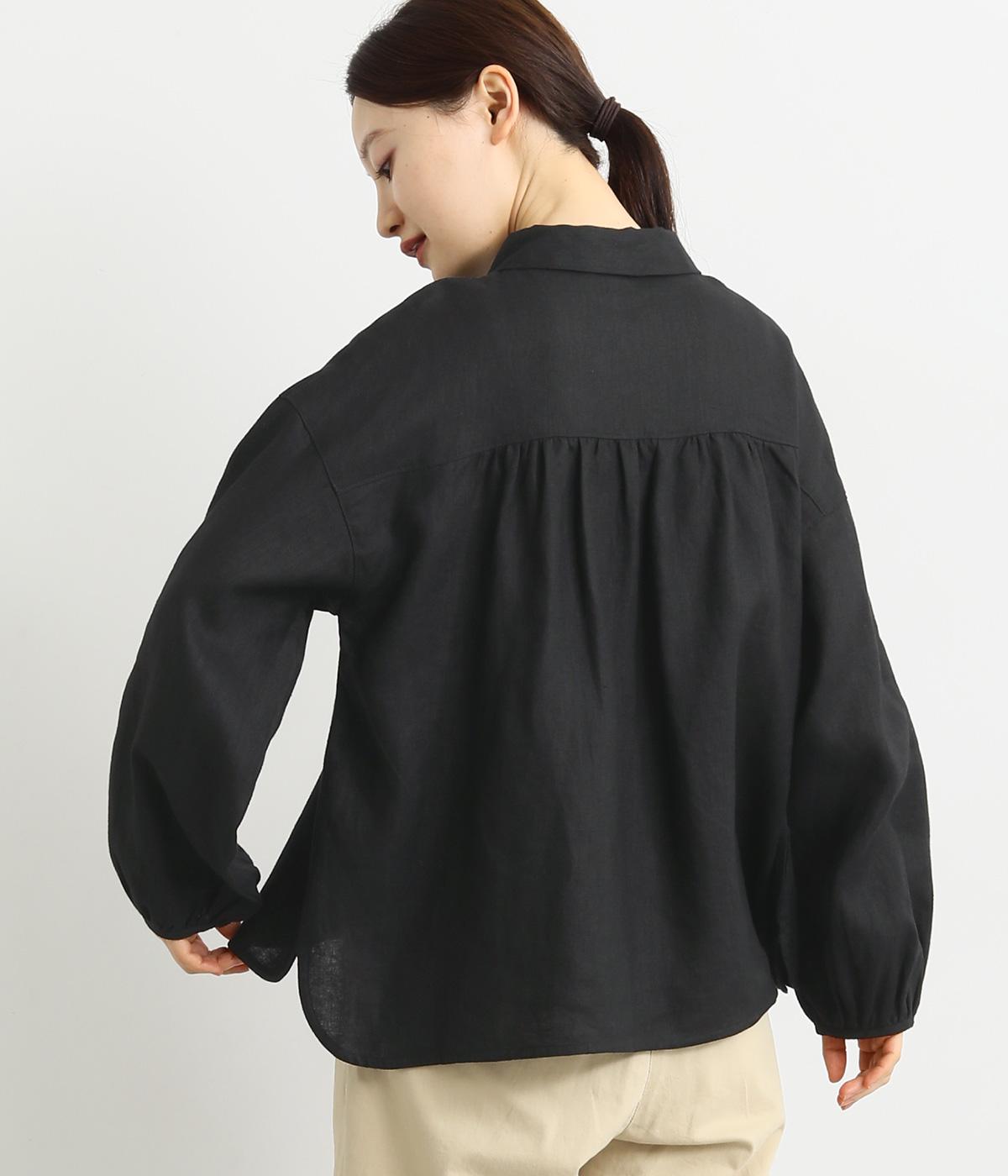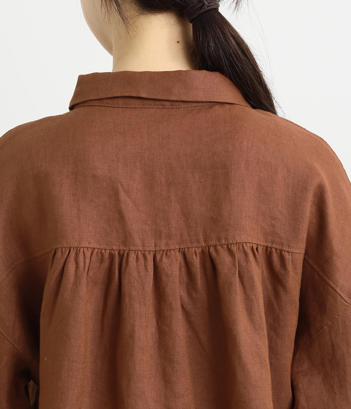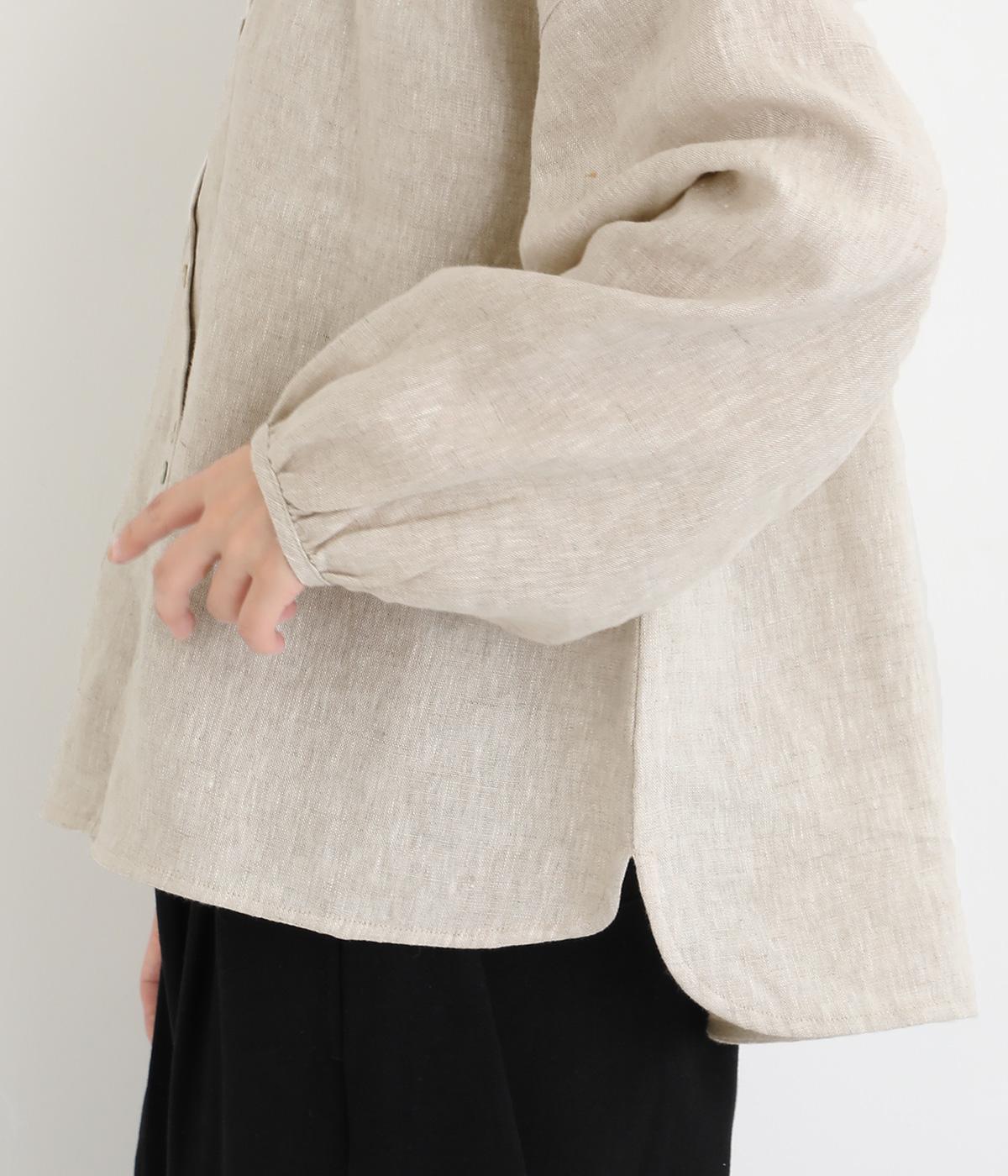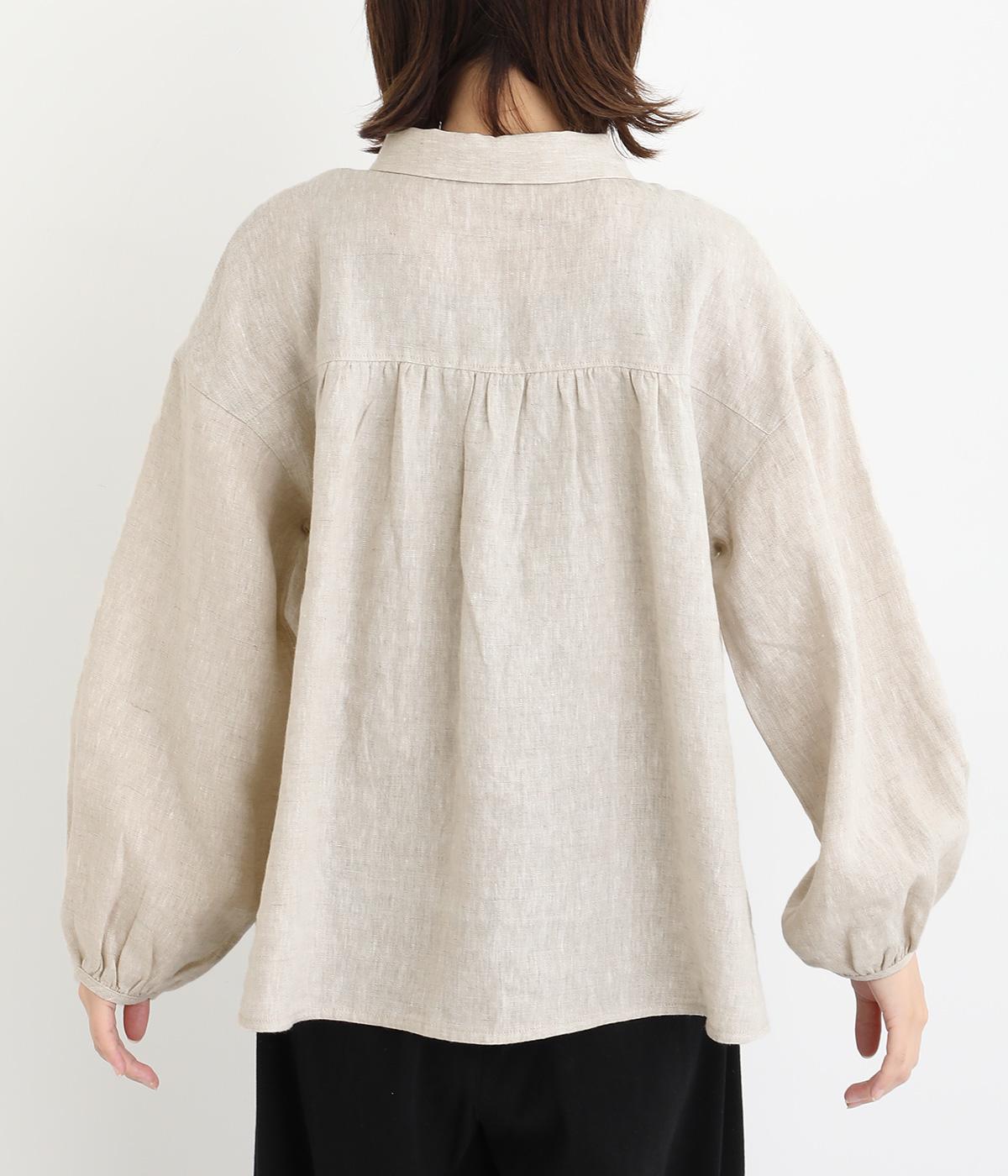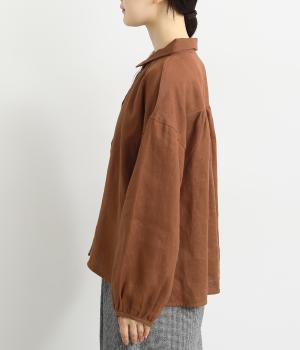 大人のナチュラルスタイルにぴったりなリネンブラウス。首元にやさしく添わせた小さめの襟と随所に施したギャザーが愛らしいムードを運びます。2つずつリズムよく並べたフロントボタンもアクセントに。前後差をつけたラウンドヘムが着こなしを整え、スカートにもパンツにも好相性です。