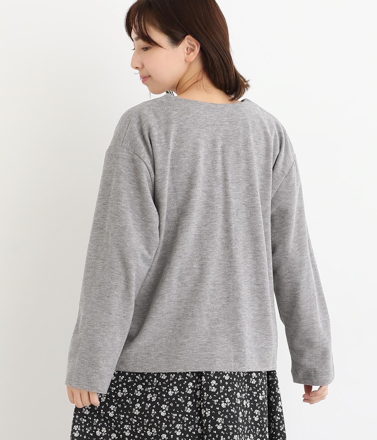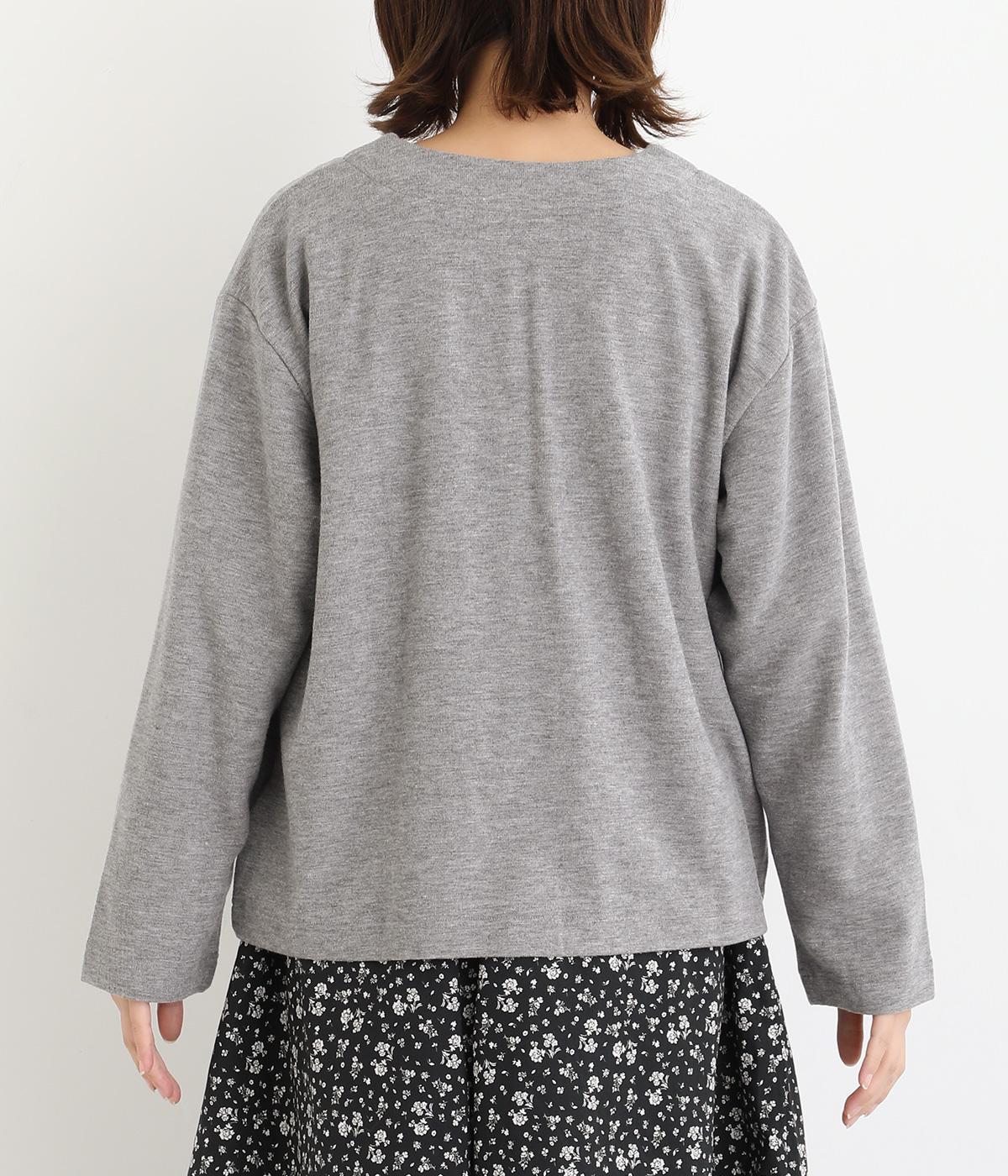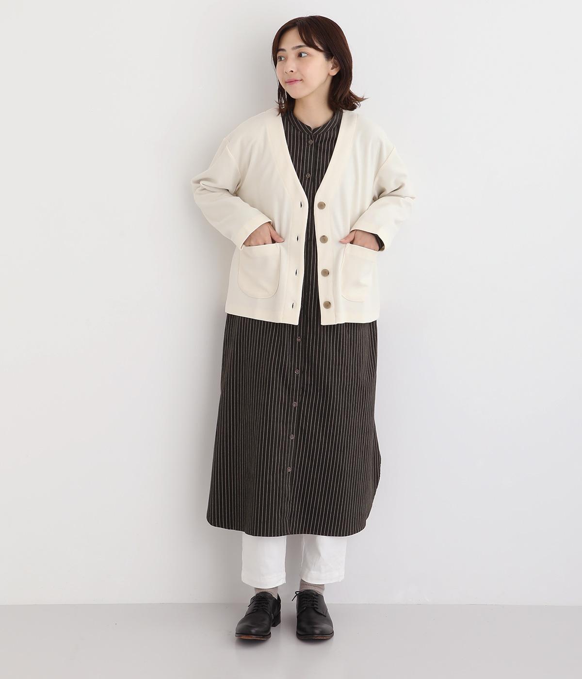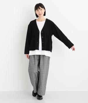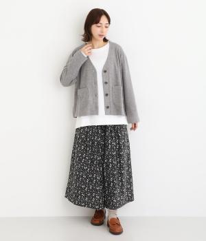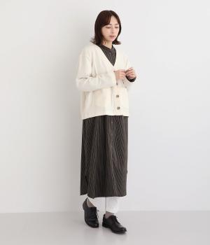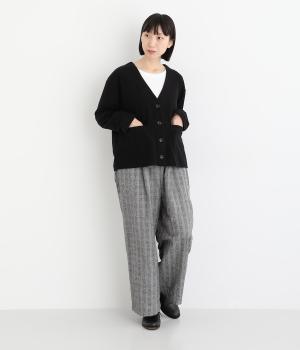 起毛感のある生地と丸みを帯びたパッチポケットが女性らしいやわらかなムードを生むカーディガン。深めのVネックが抜け感を与え、ゆとりのある身幅をすっきりと見せてくれます。長めの袖丈に対して着丈はコンパクトに仕上げ、さまざまなボトムスにバランスよく合わせやすいのがグッドです。