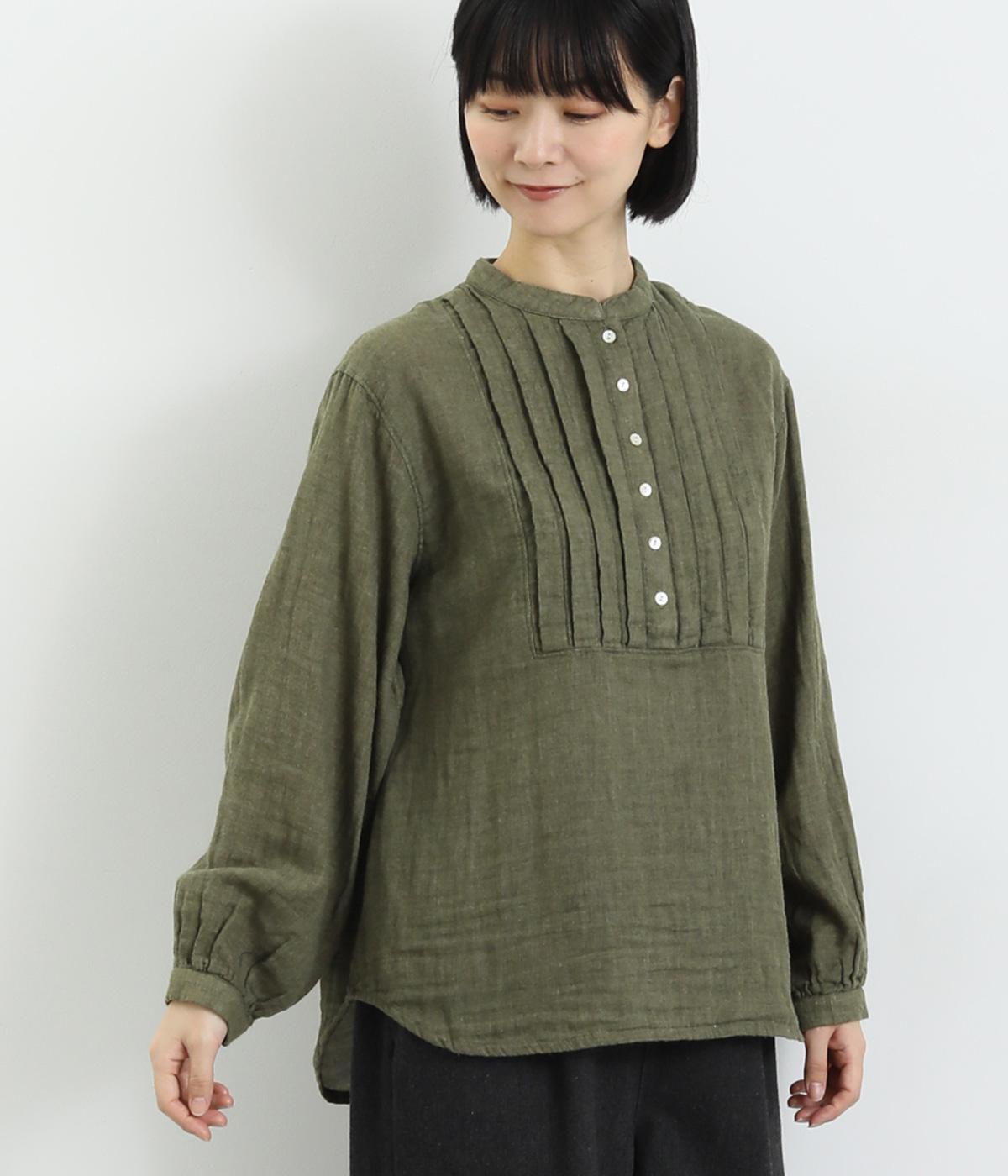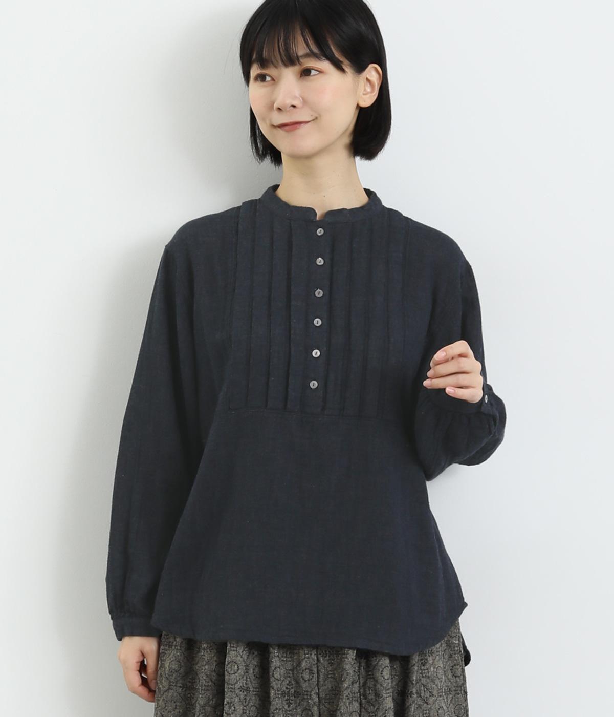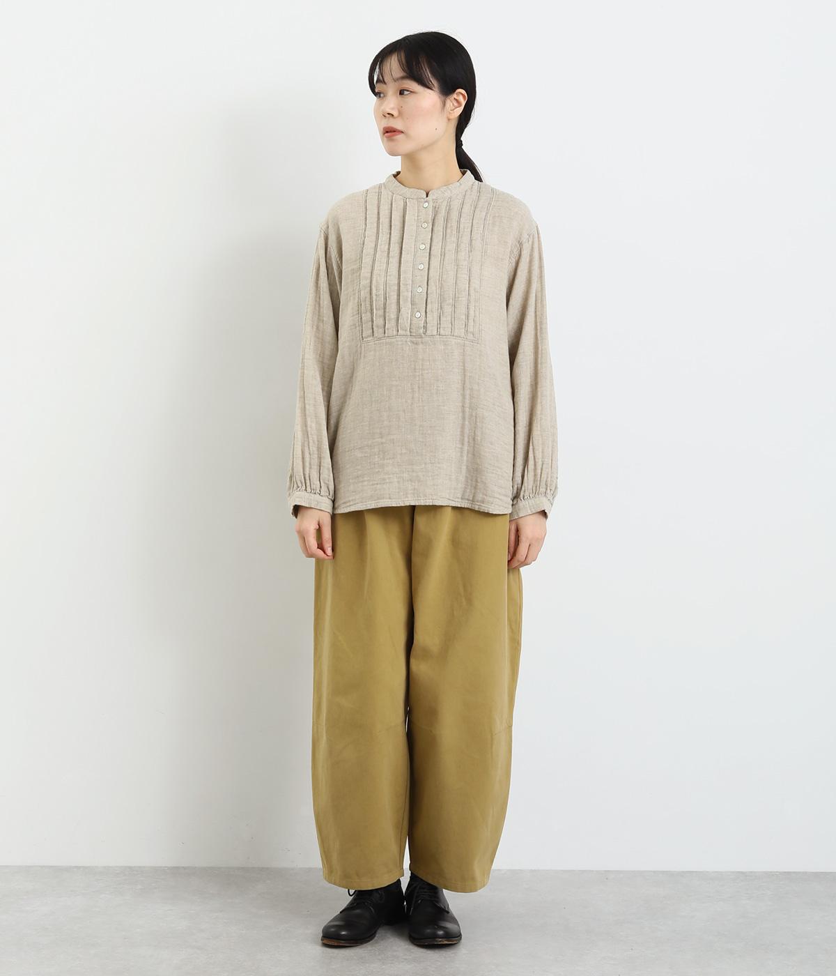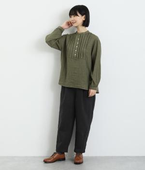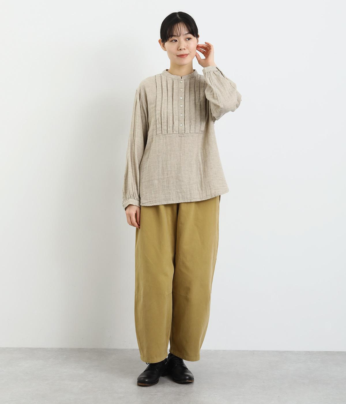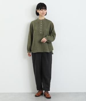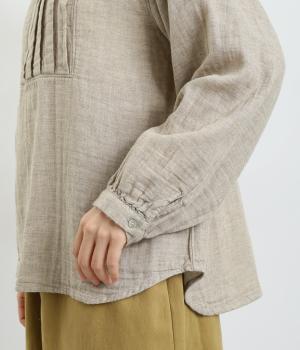 前身頃のピンタックが全体の印象を引き締めるブラウスです。後ろ身頃はギャザーで立体感を出しつつ、動きやすい仕様に。ふんわりとした袖口もポイントです。ナチュラルで洗練された着こなしを叶える一着です。