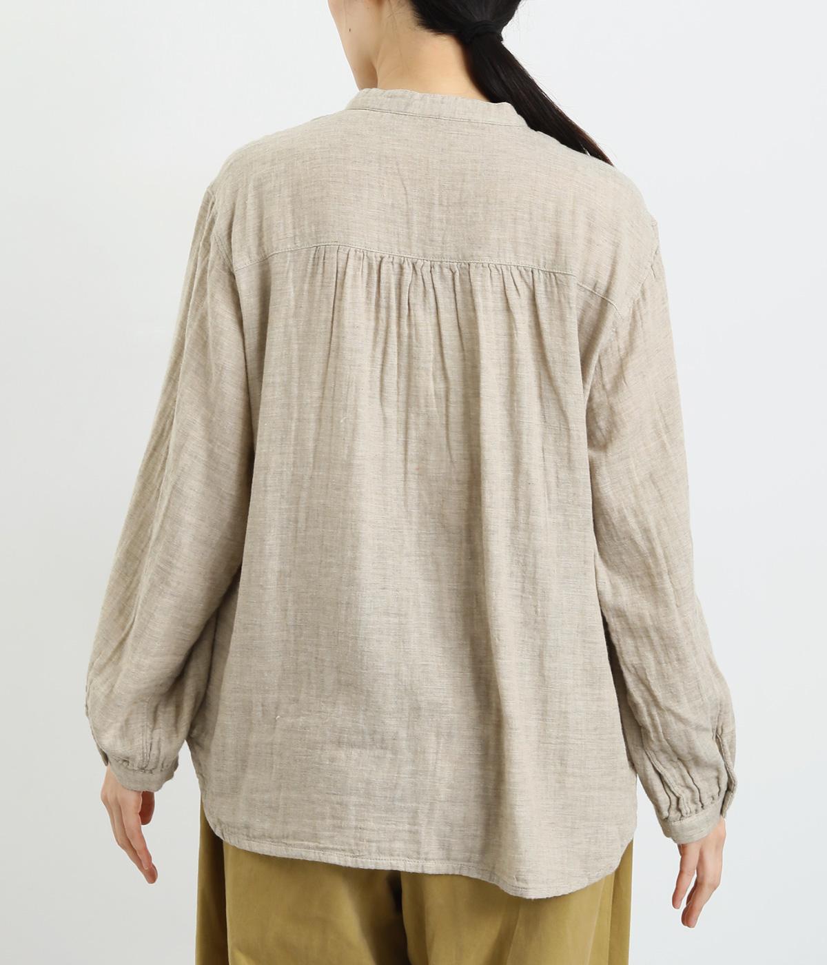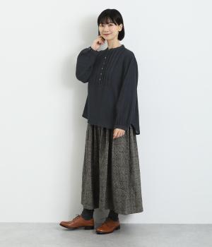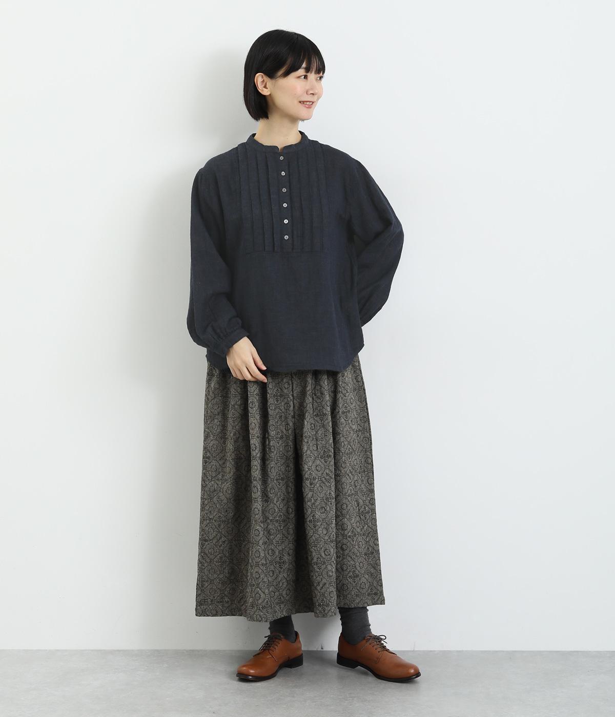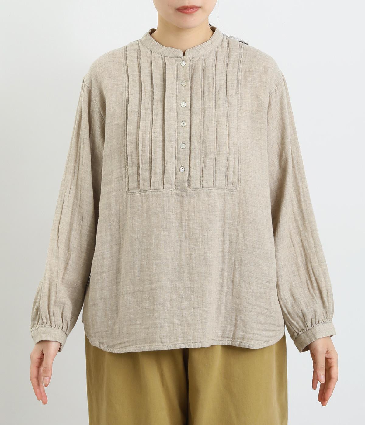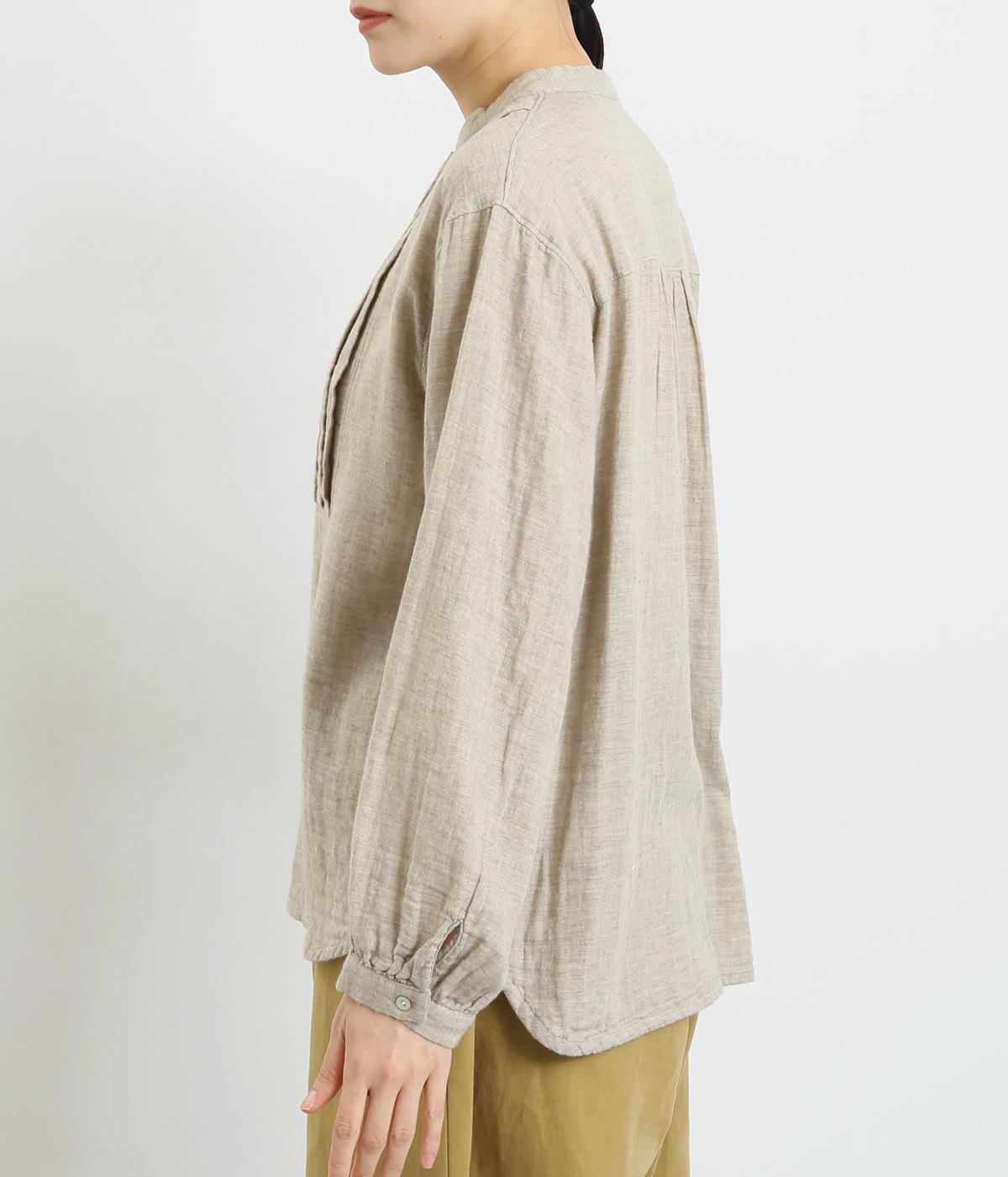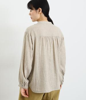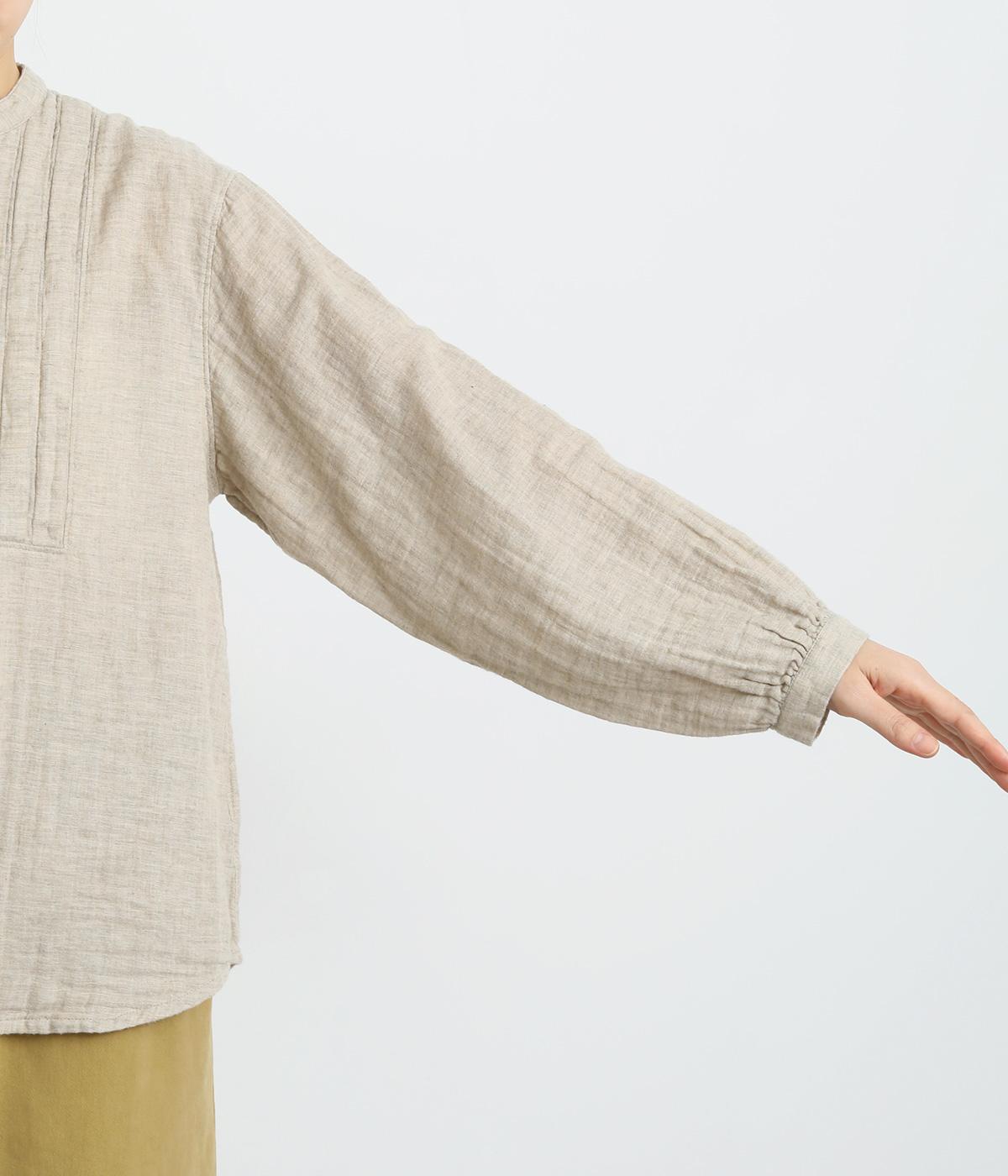 前身頃のピンタックが全体の印象を引き締めるブラウスです。後ろ身頃はギャザーで立体感を出しつつ、動きやすい仕様に。ふんわりとした袖口もポイントです。ナチュラルで洗練された着こなしを叶える一着です。
