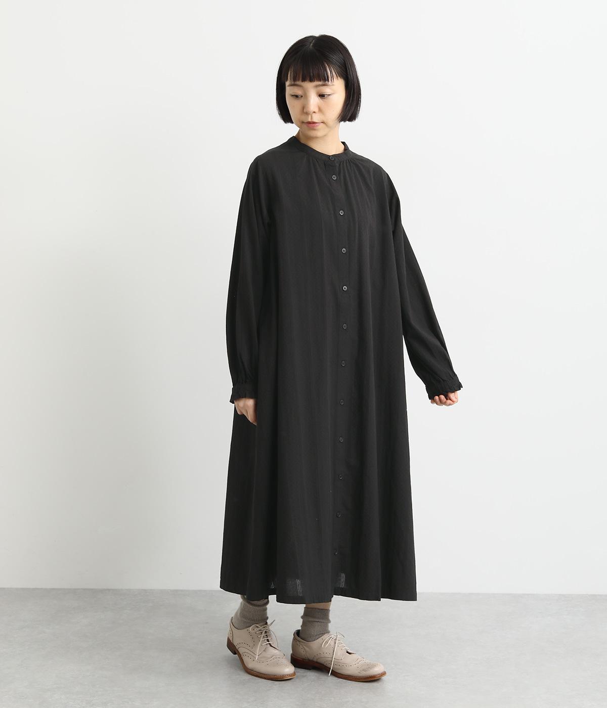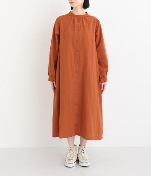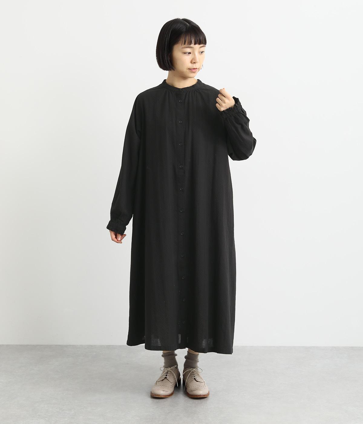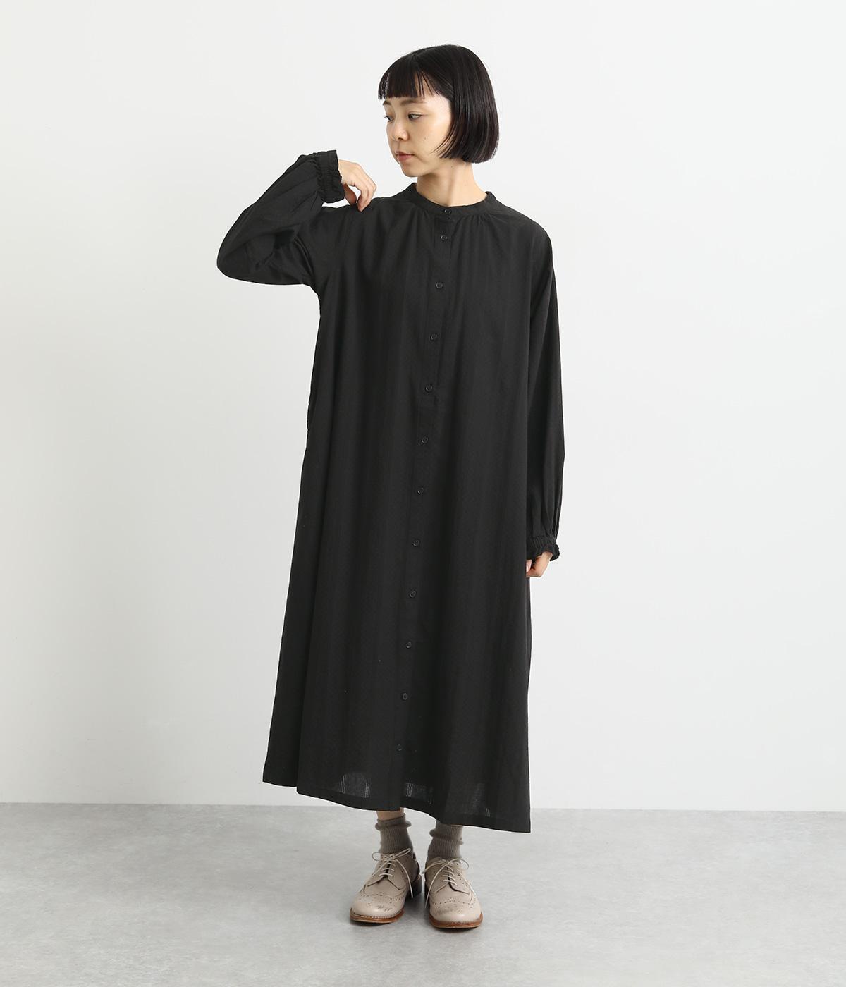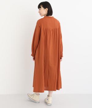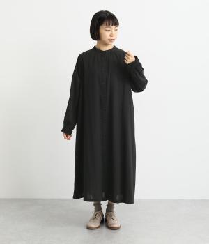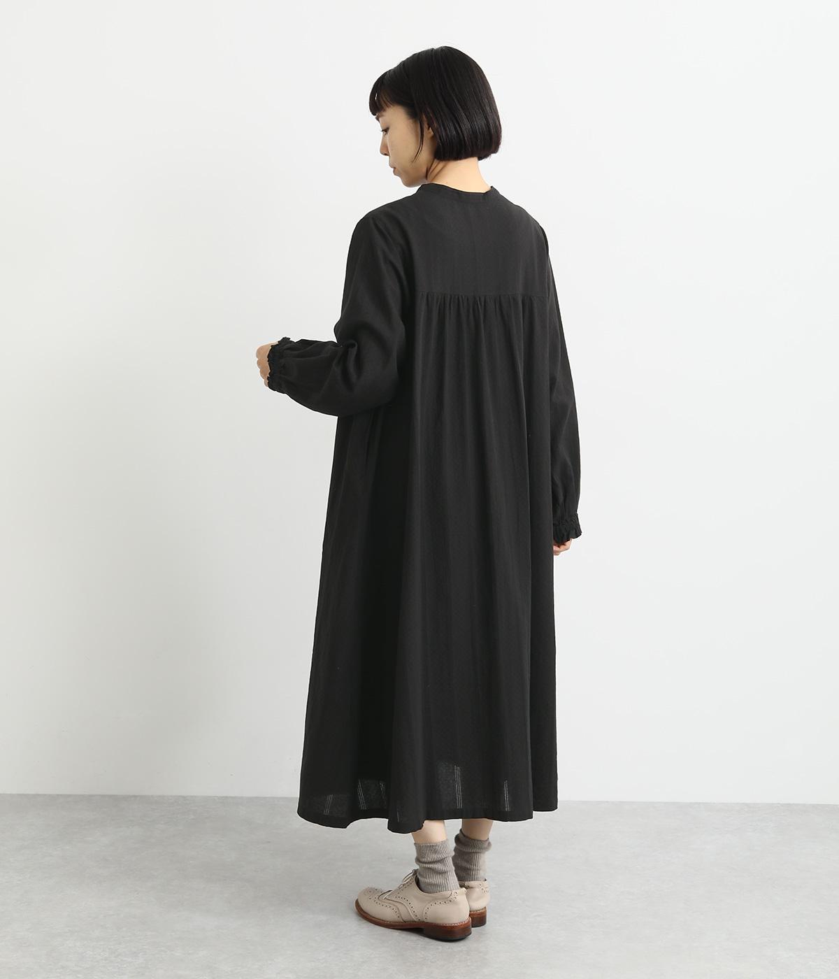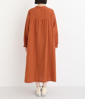 バックヨーク下に贅沢にギャザーをあしらったゆったりシルエットのワンピース。首元に沿うバンドカラーがきちんと感をプラスしてくれます。袖口にはゴムを通しているので、たくし上げても素敵。サイドには便利なポケットを配しています。