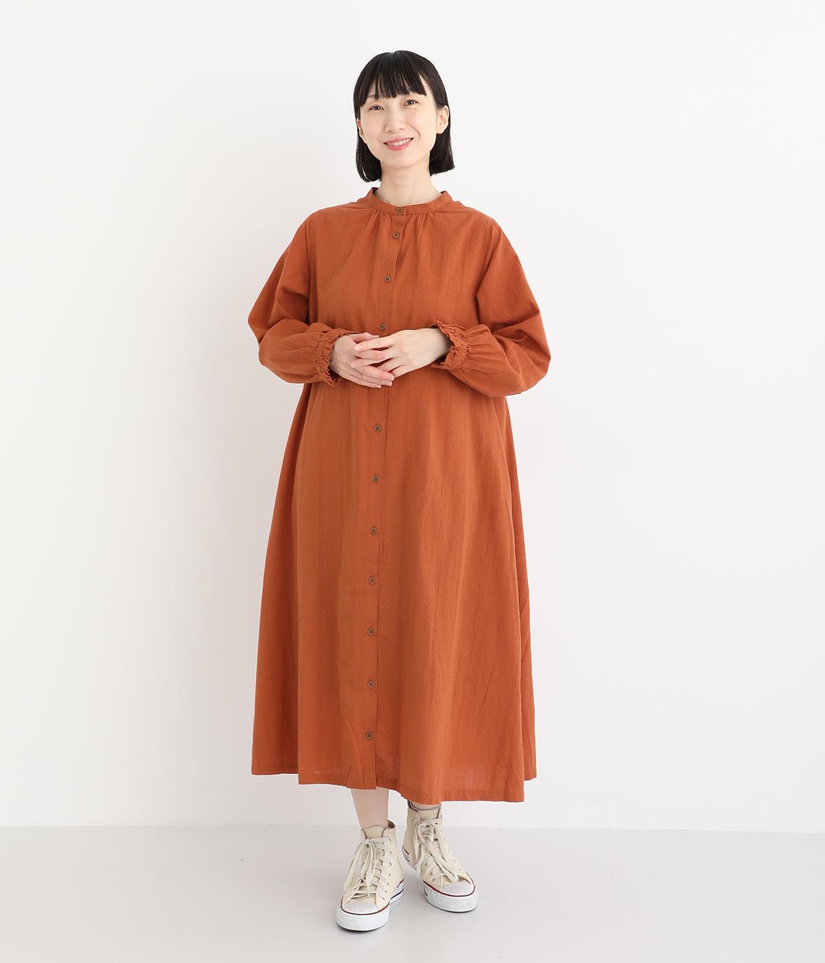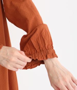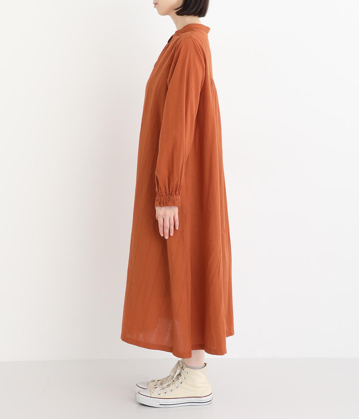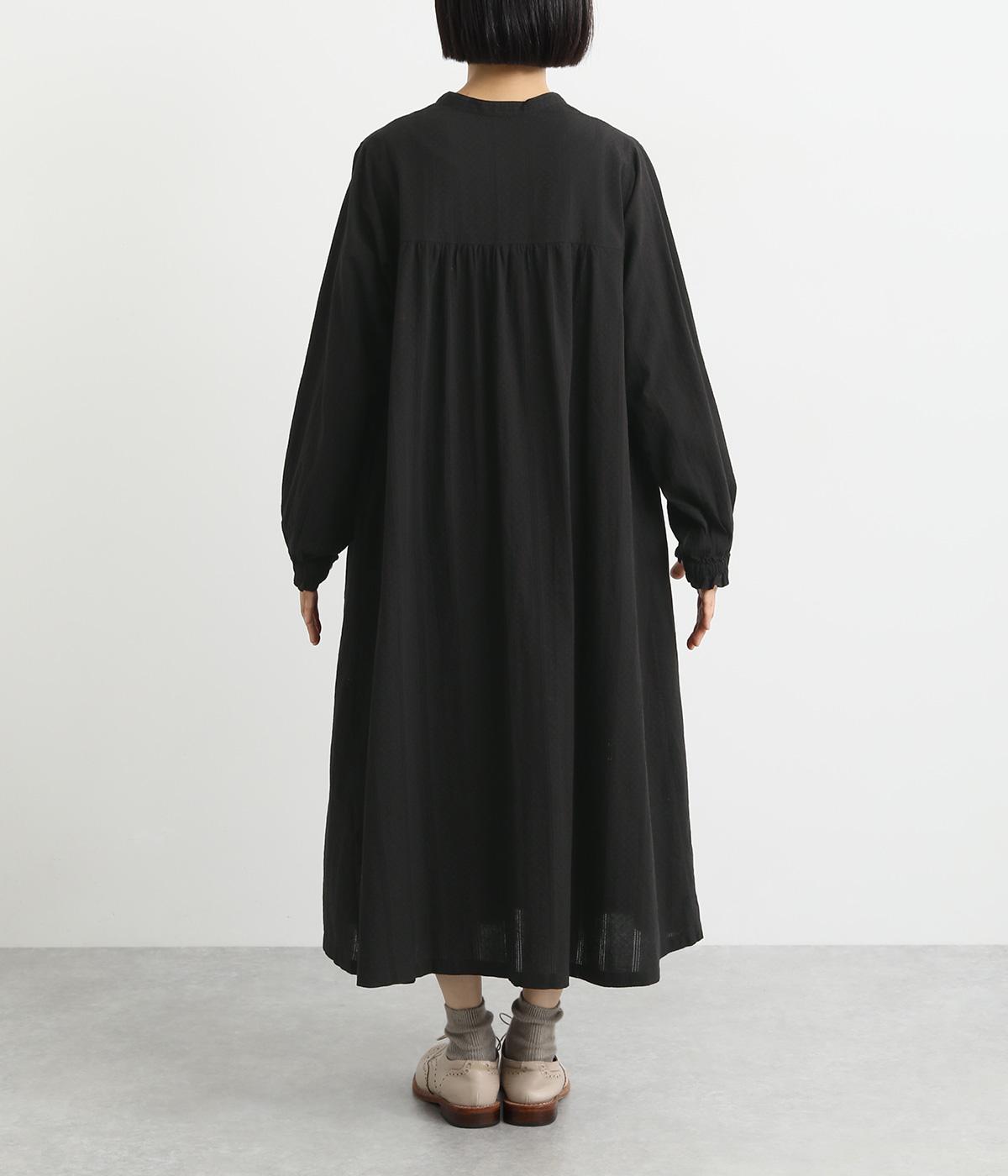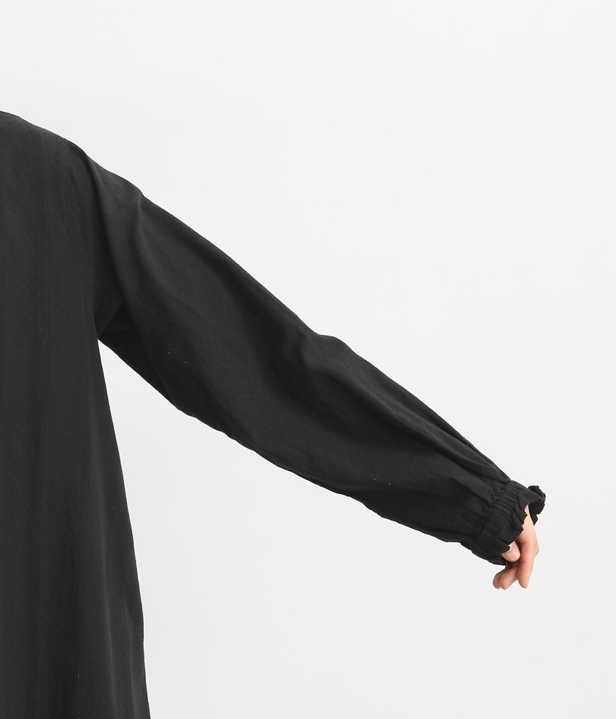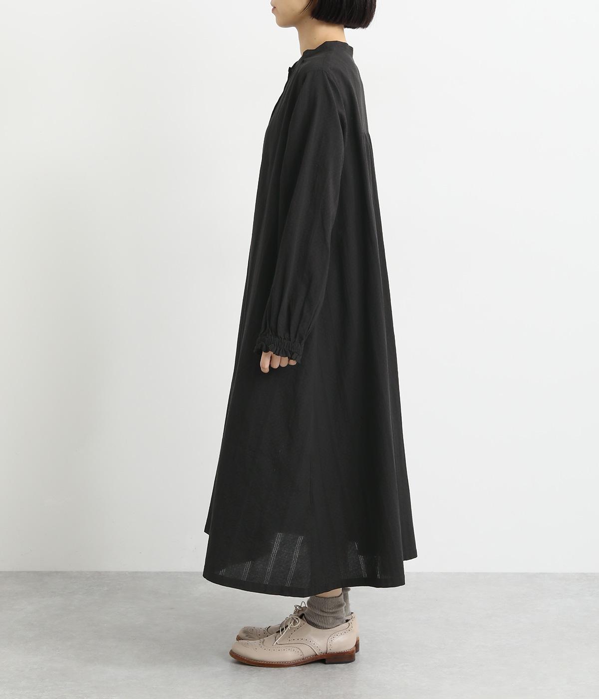 バックヨーク下に贅沢にギャザーをあしらったゆったりシルエットのワンピース。首元に沿うバンドカラーがきちんと感をプラスしてくれます。袖口にはゴムを通しているので、たくし上げても素敵。サイドには便利なポケットを配しています。