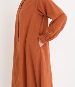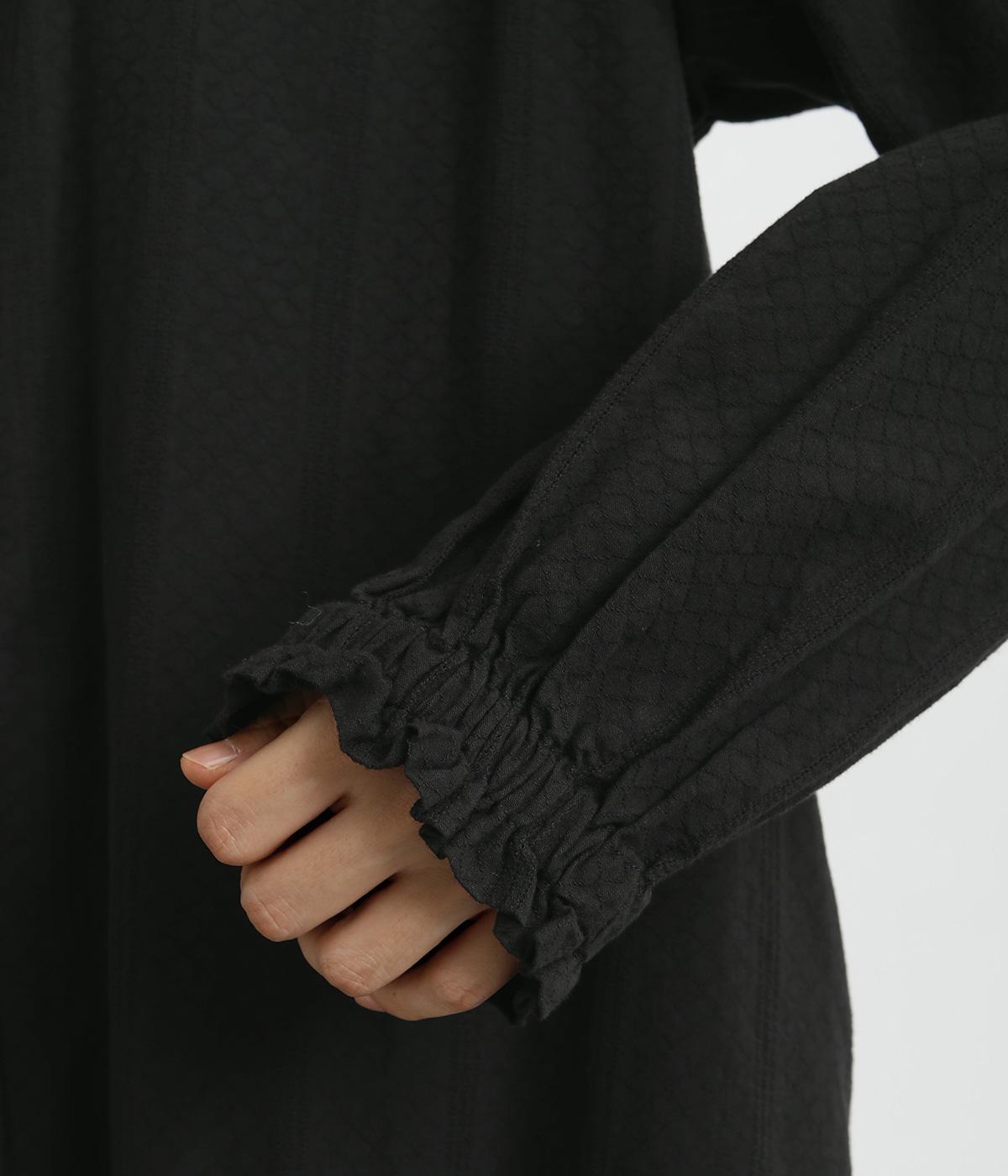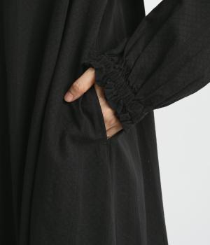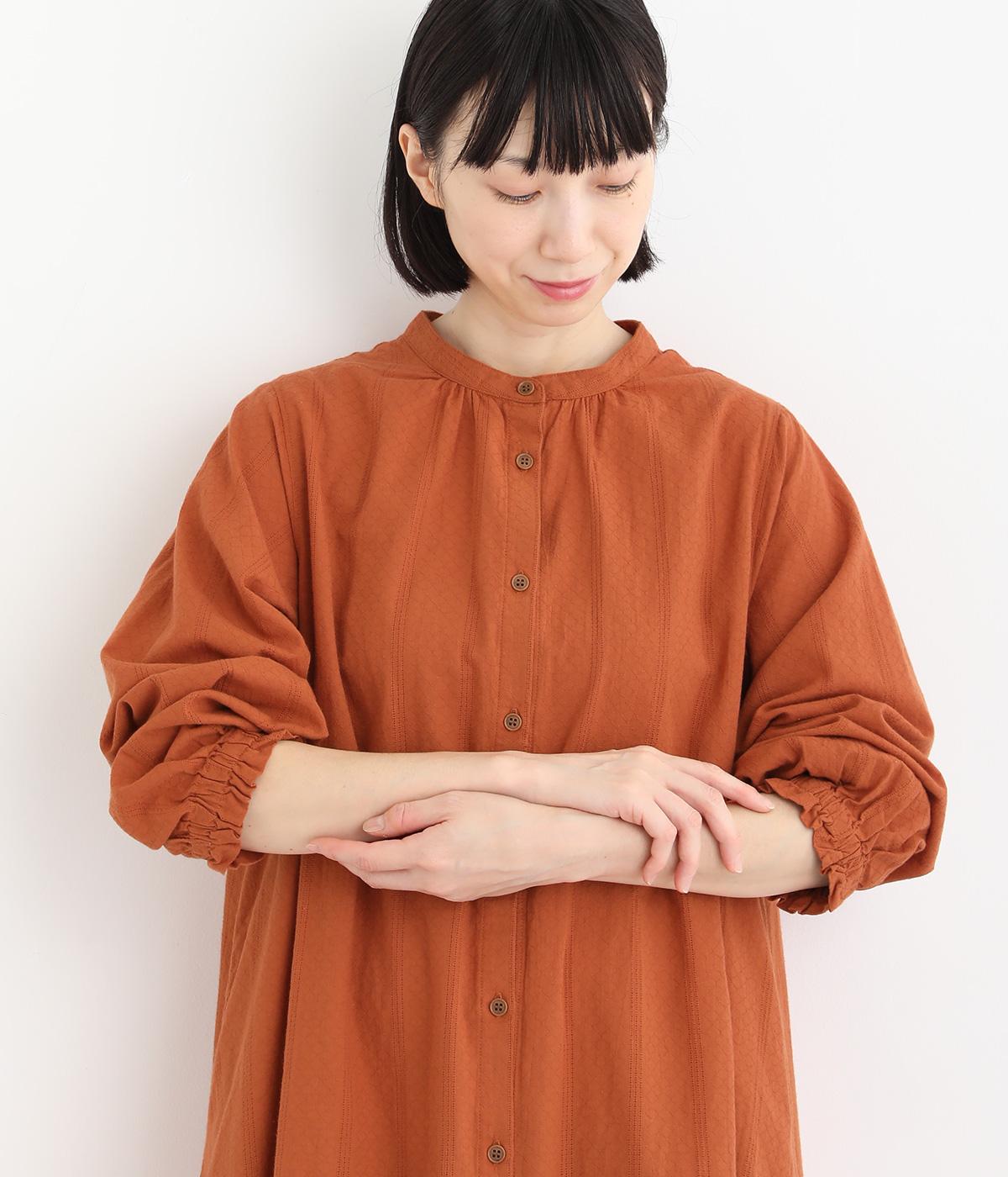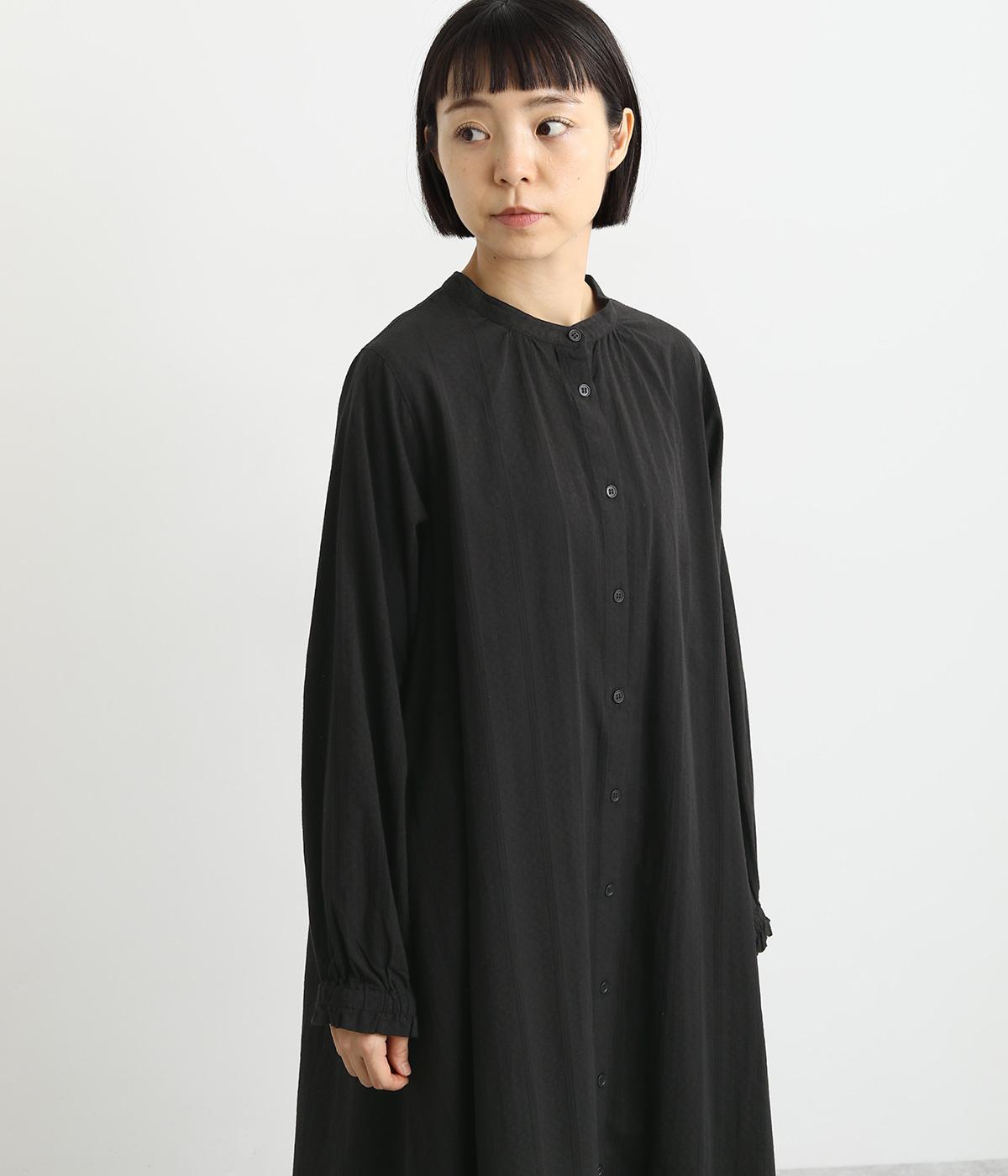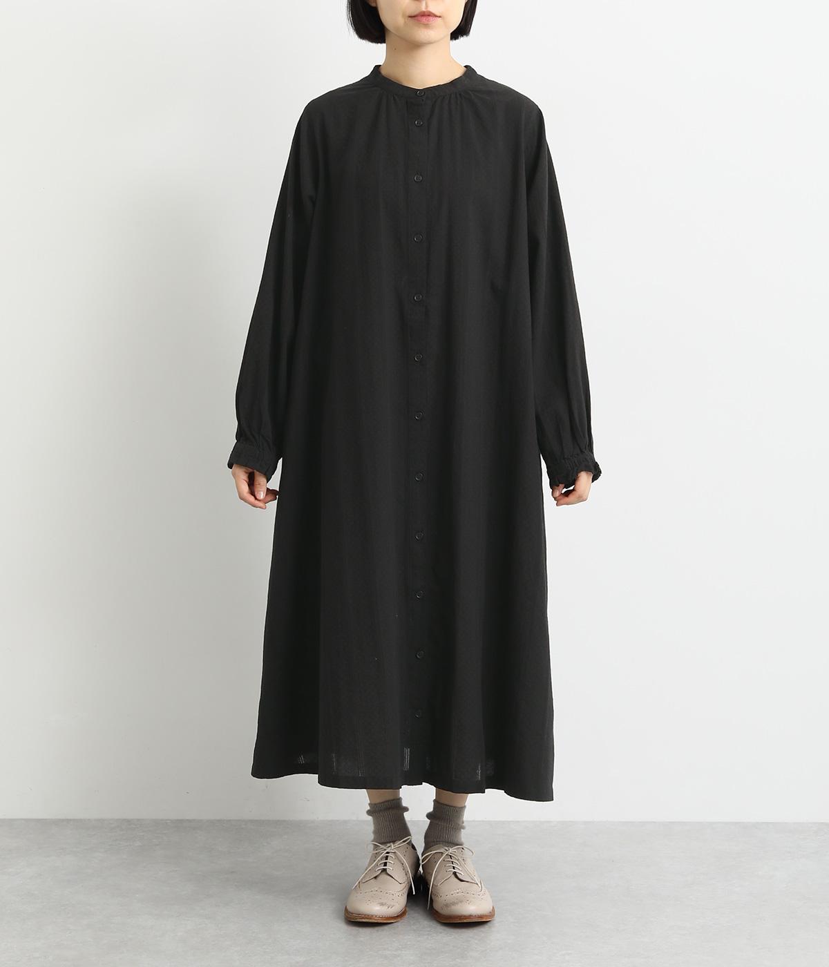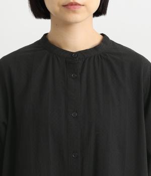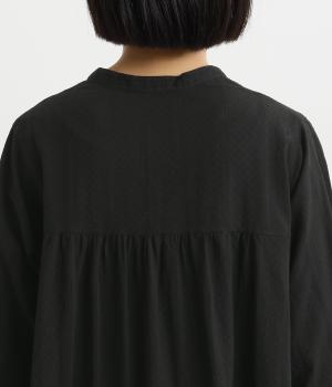 バックヨーク下に贅沢にギャザーをあしらったゆったりシルエットのワンピース。首元に沿うバンドカラーがきちんと感をプラスしてくれます。袖口にはゴムを通しているので、たくし上げても素敵。サイドには便利なポケットを配しています。