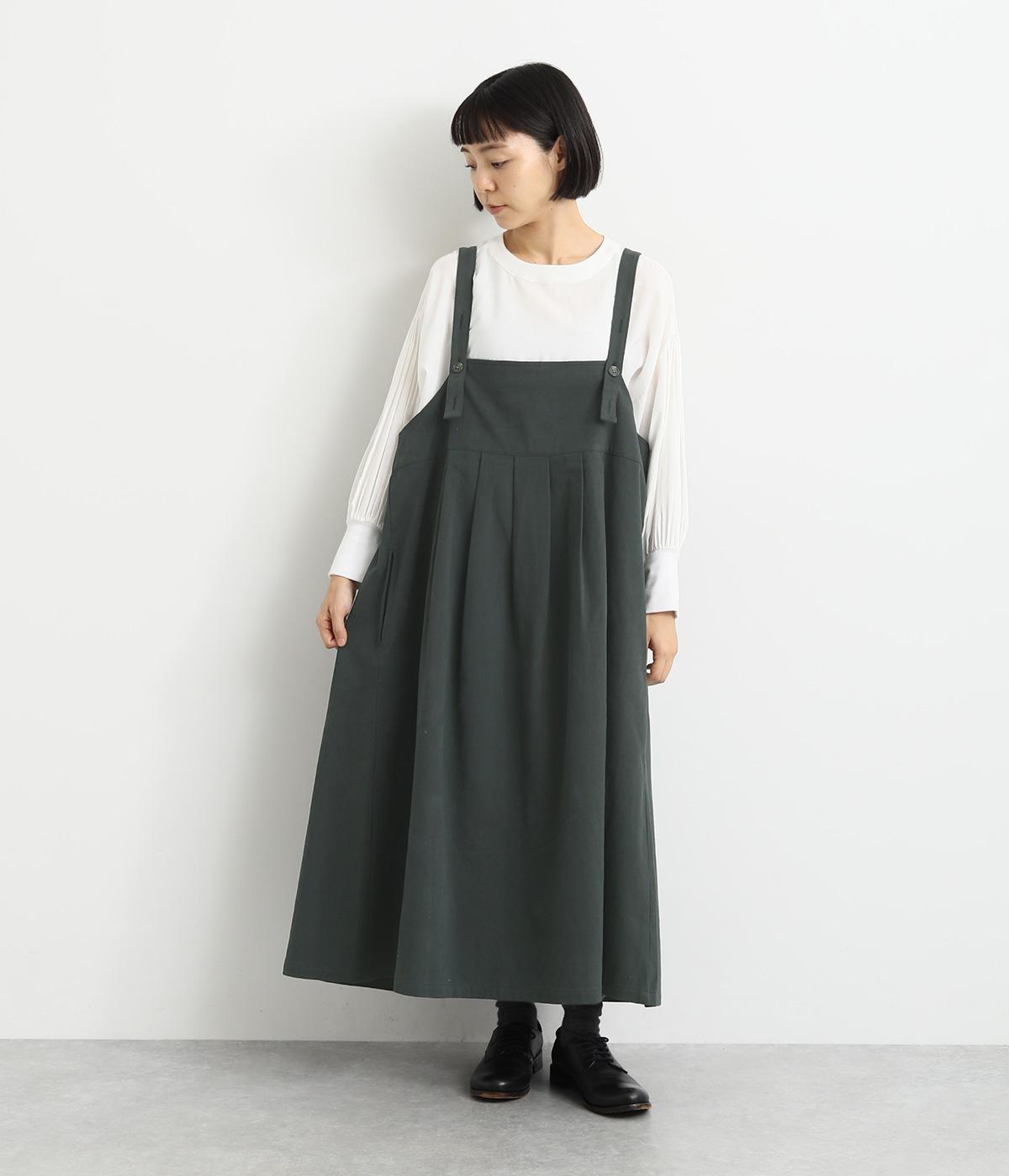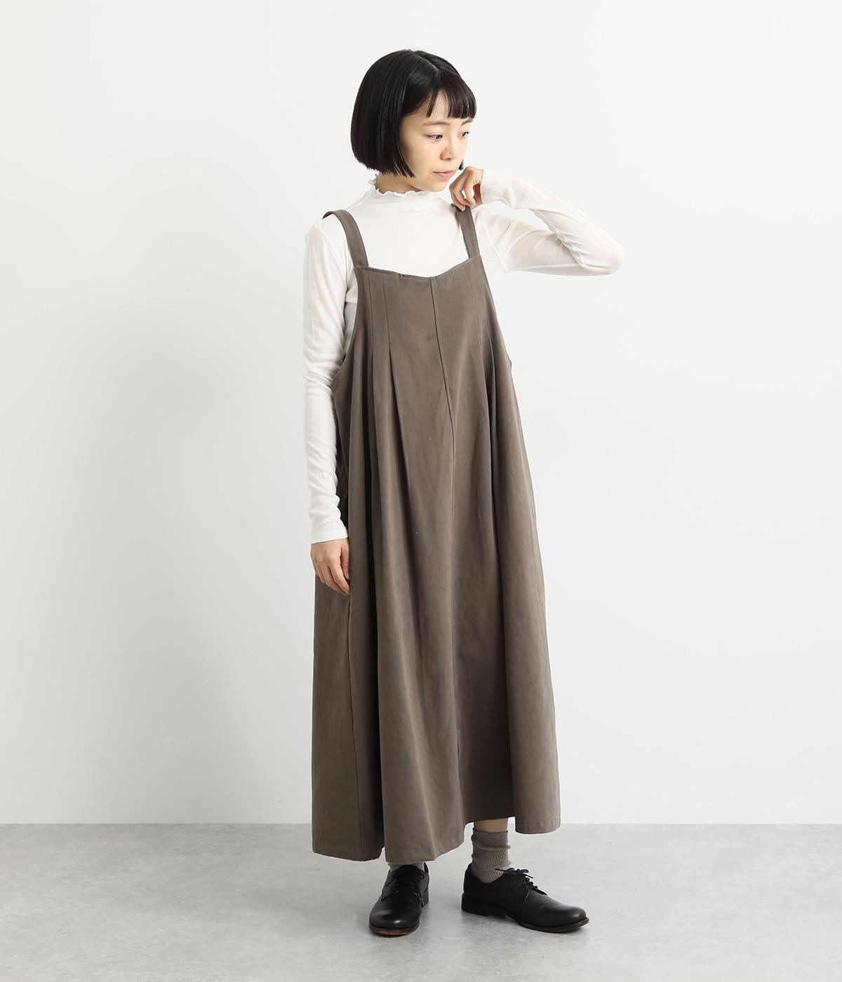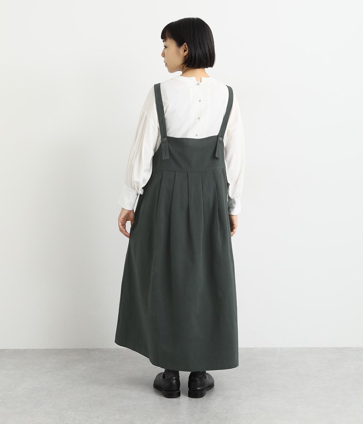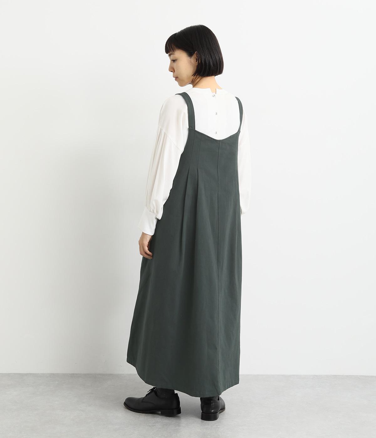 胸元からふわっと広がる面と、タックでストンと落ちる面の2way仕様。シルエットを変えて楽しめる一枚です。紐はボタンで調節可能です。カジュアルにもきれいめにも合わせやすく、ロングシーズン活躍します。