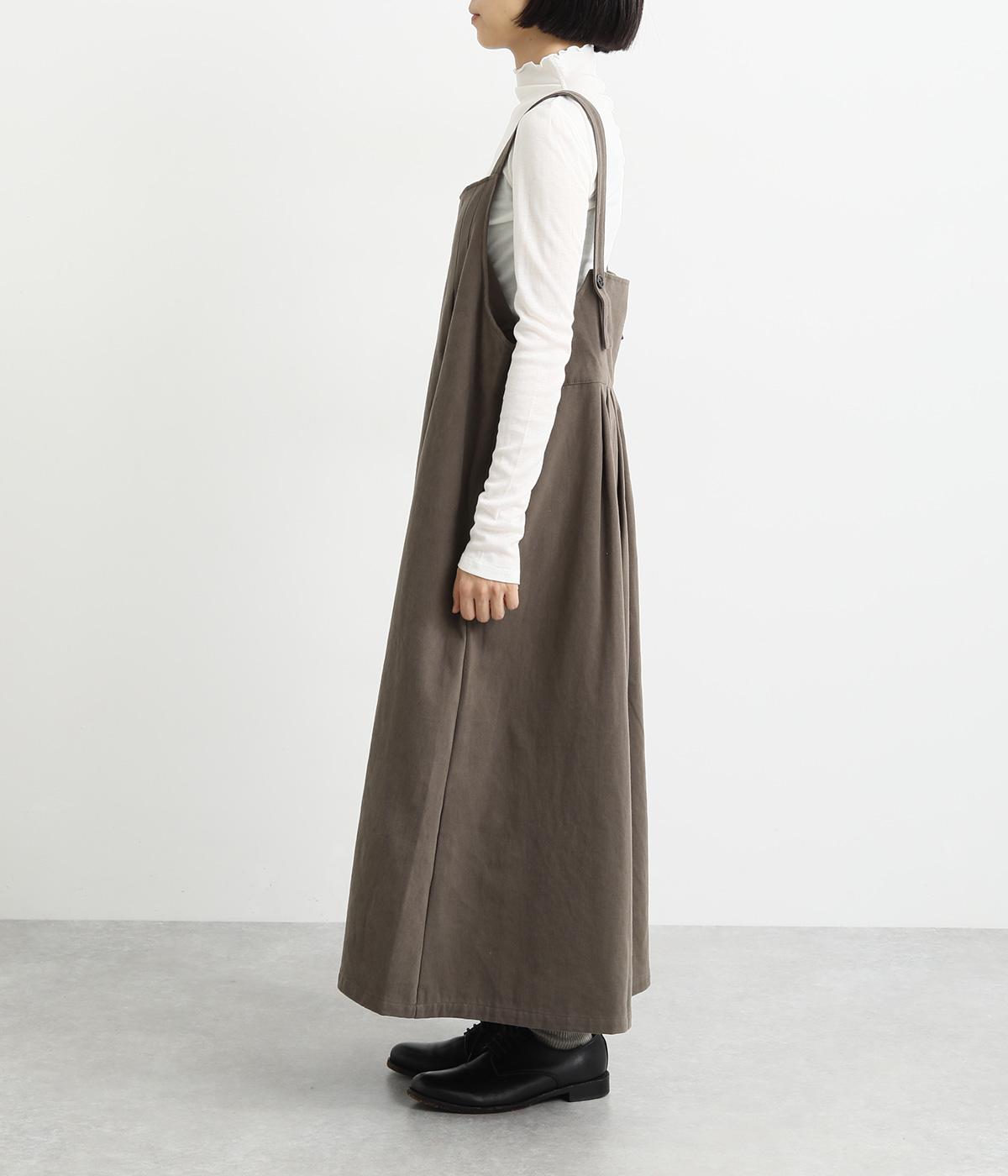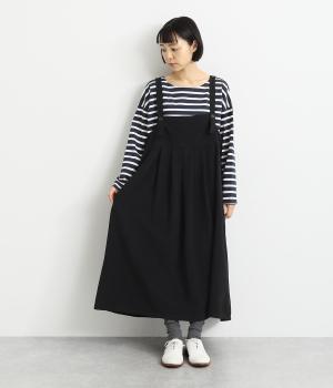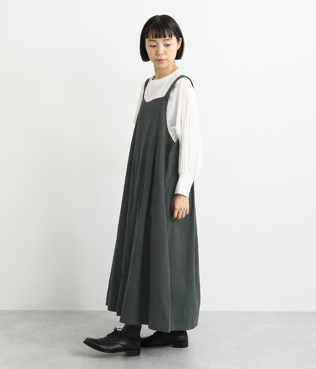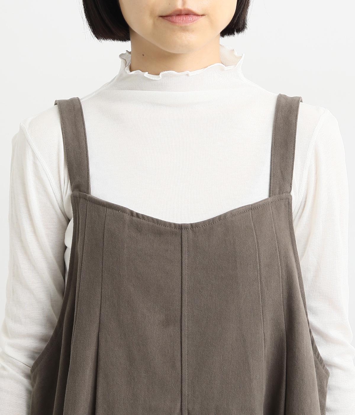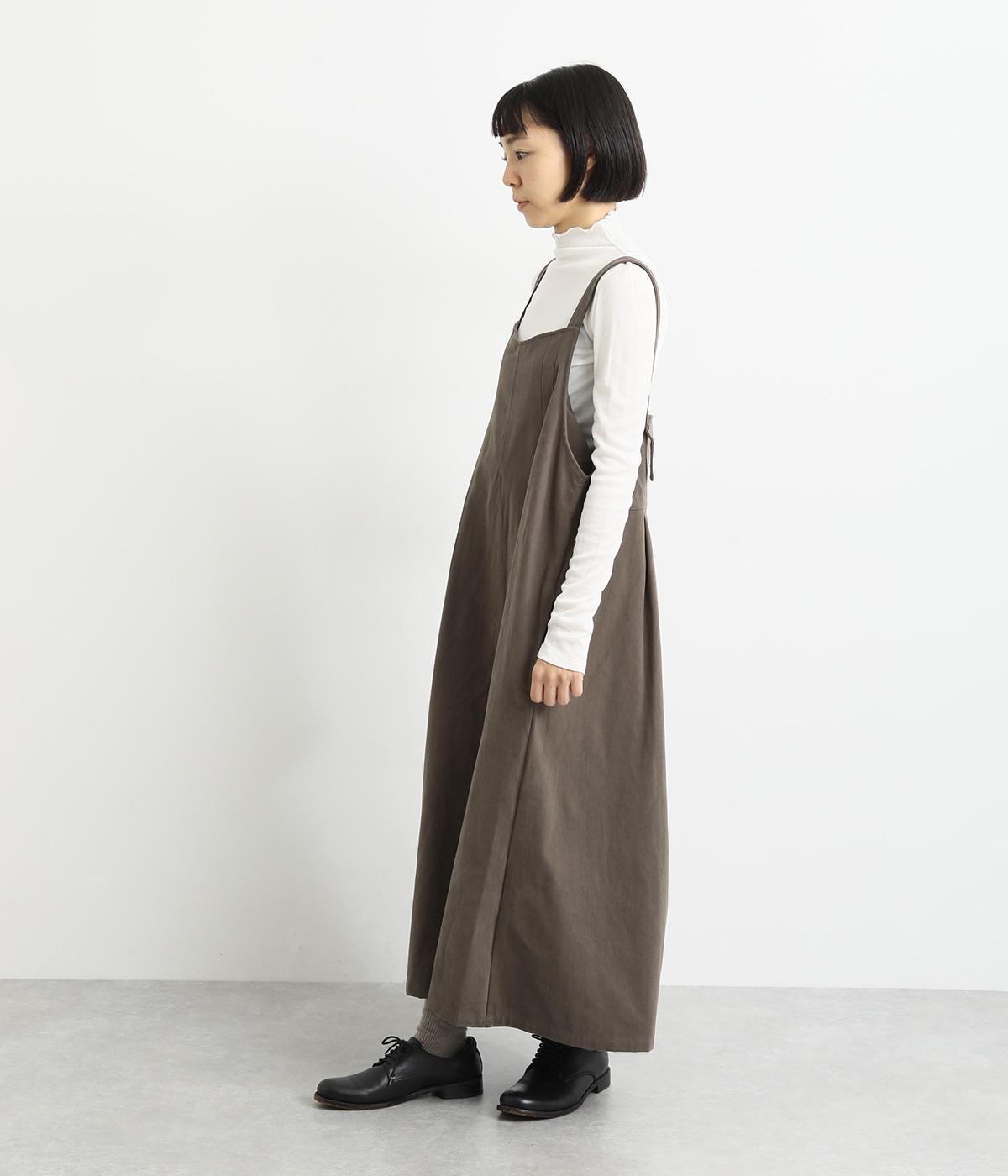 胸元からふわっと広がる面と、タックでストンと落ちる面の2way仕様。シルエットを変えて楽しめる一枚です。紐はボタンで調節可能です。カジュアルにもきれいめにも合わせやすく、ロングシーズン活躍します。