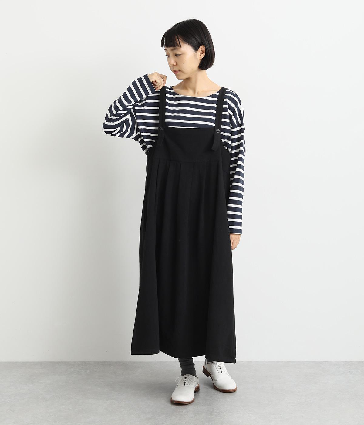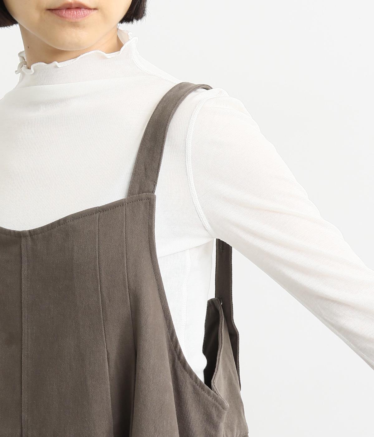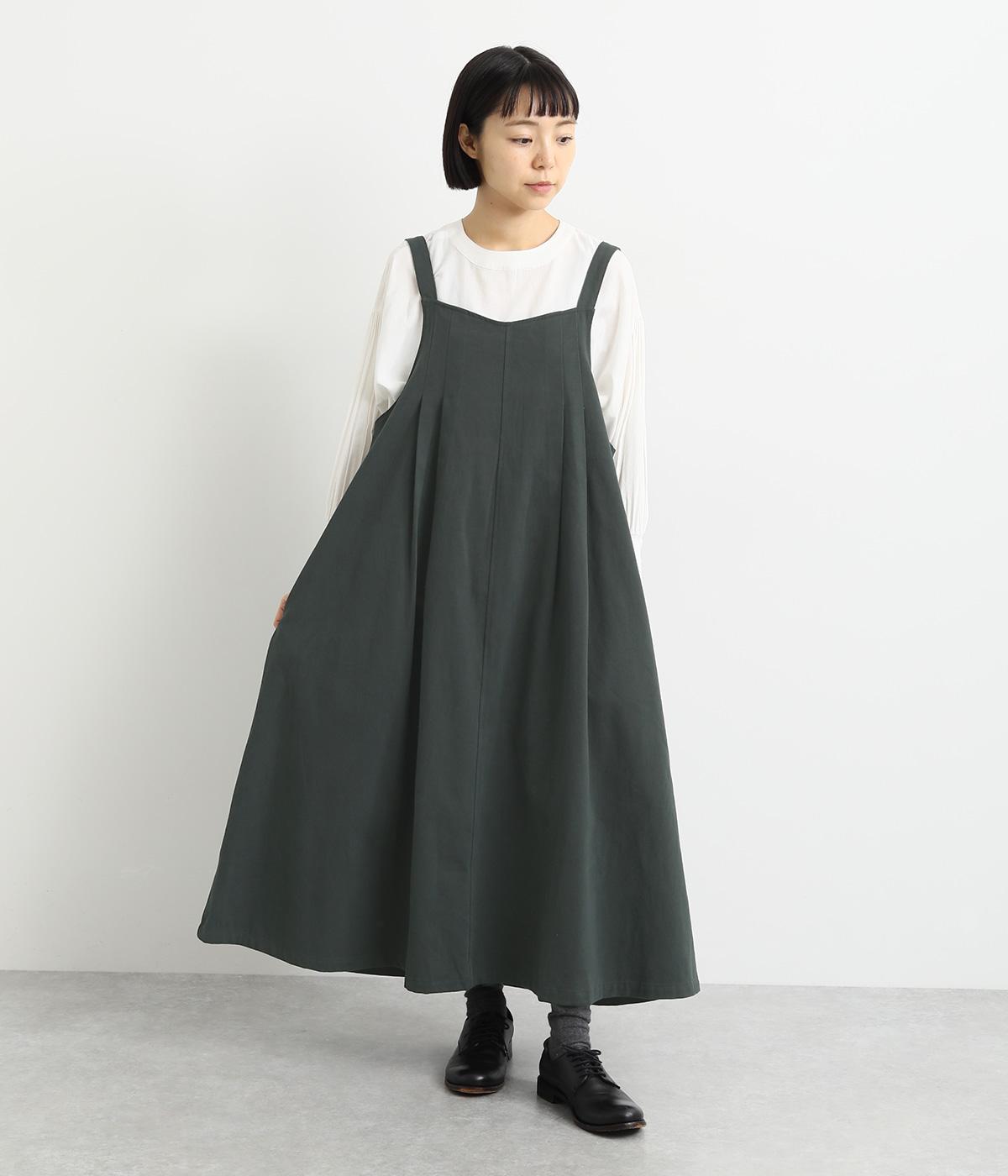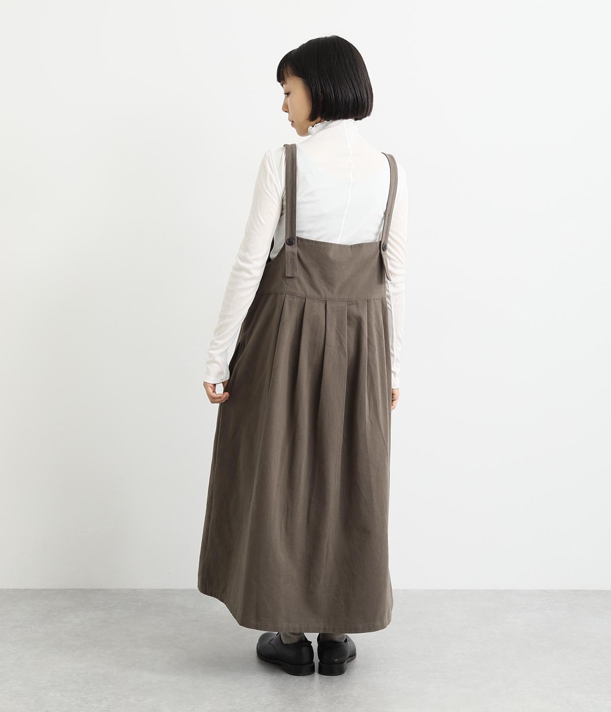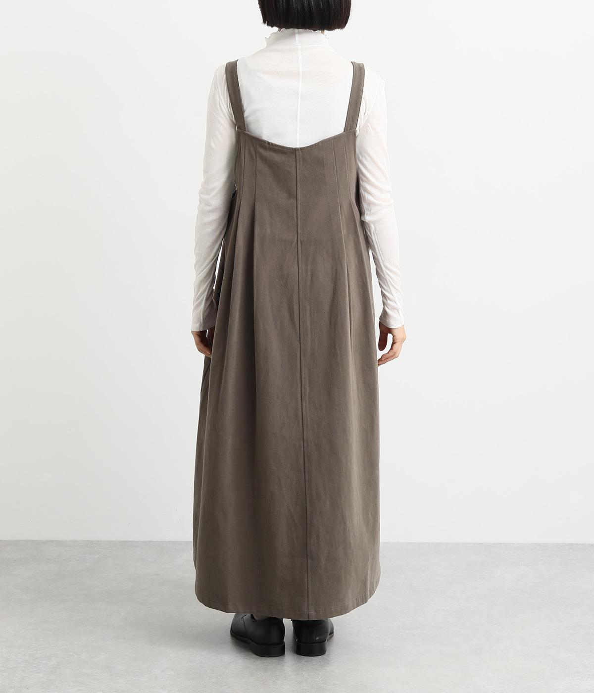 胸元からふわっと広がる面と、タックでストンと落ちる面の2way仕様。シルエットを変えて楽しめる一枚です。紐はボタンで調節可能です。カジュアルにもきれいめにも合わせやすく、ロングシーズン活躍します。