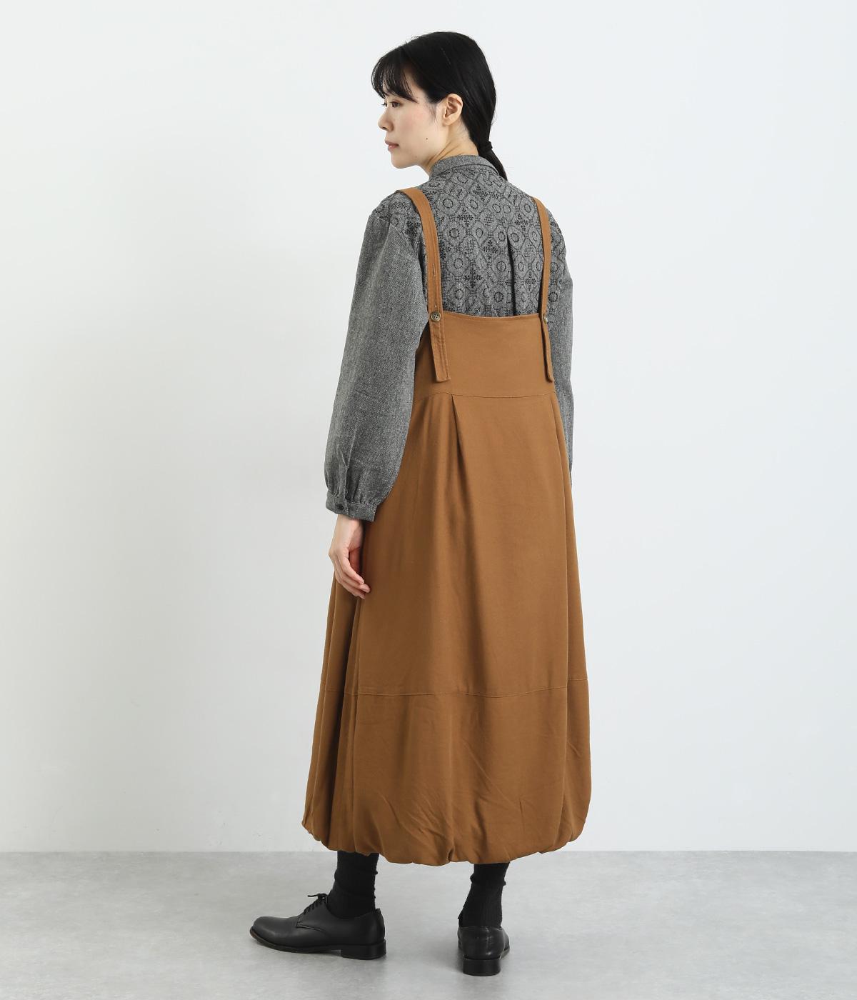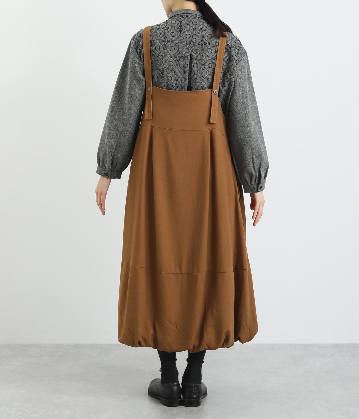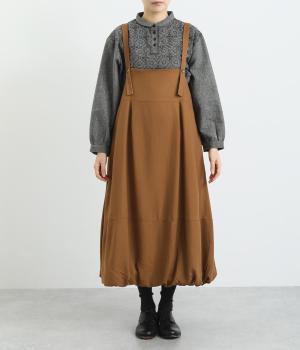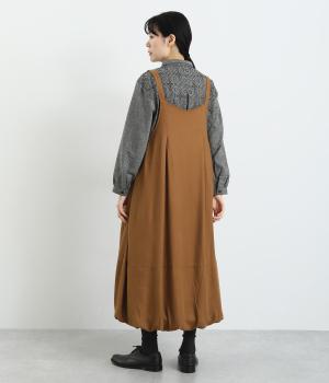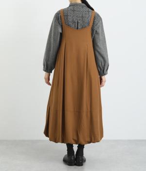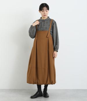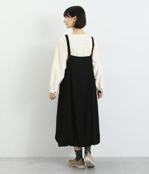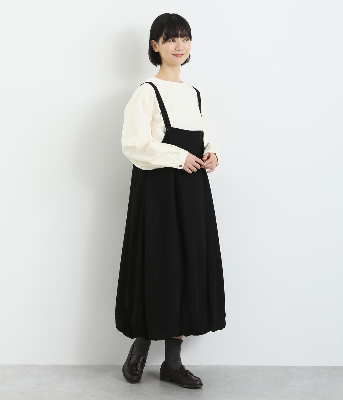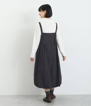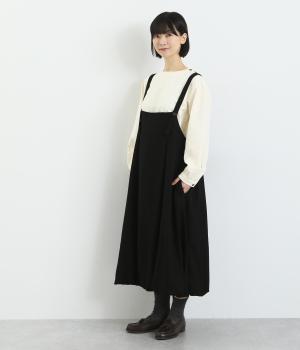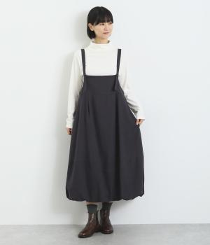 前後2wayで着用できる遊び心のあるジャンパースカートです。ふんわり広がる裾のボリュームがかわいらしく、一枚で存在感があります。肩のストラップで、長さの調節も可能。合わせるインナー次第でも、異なる表情が楽しめます。