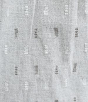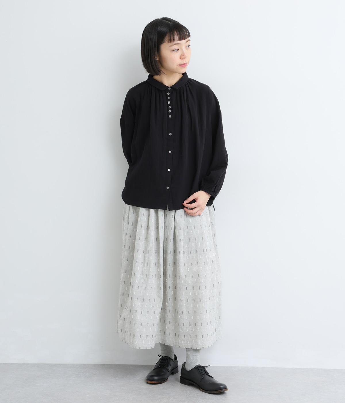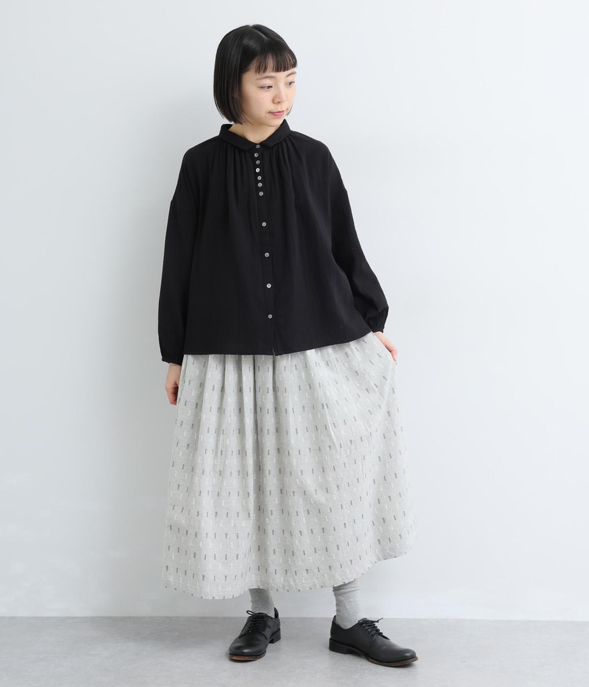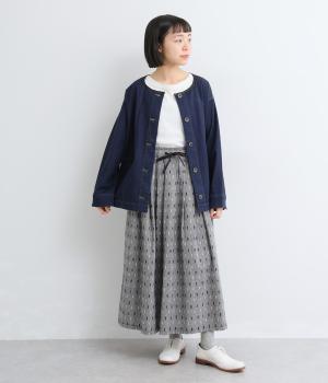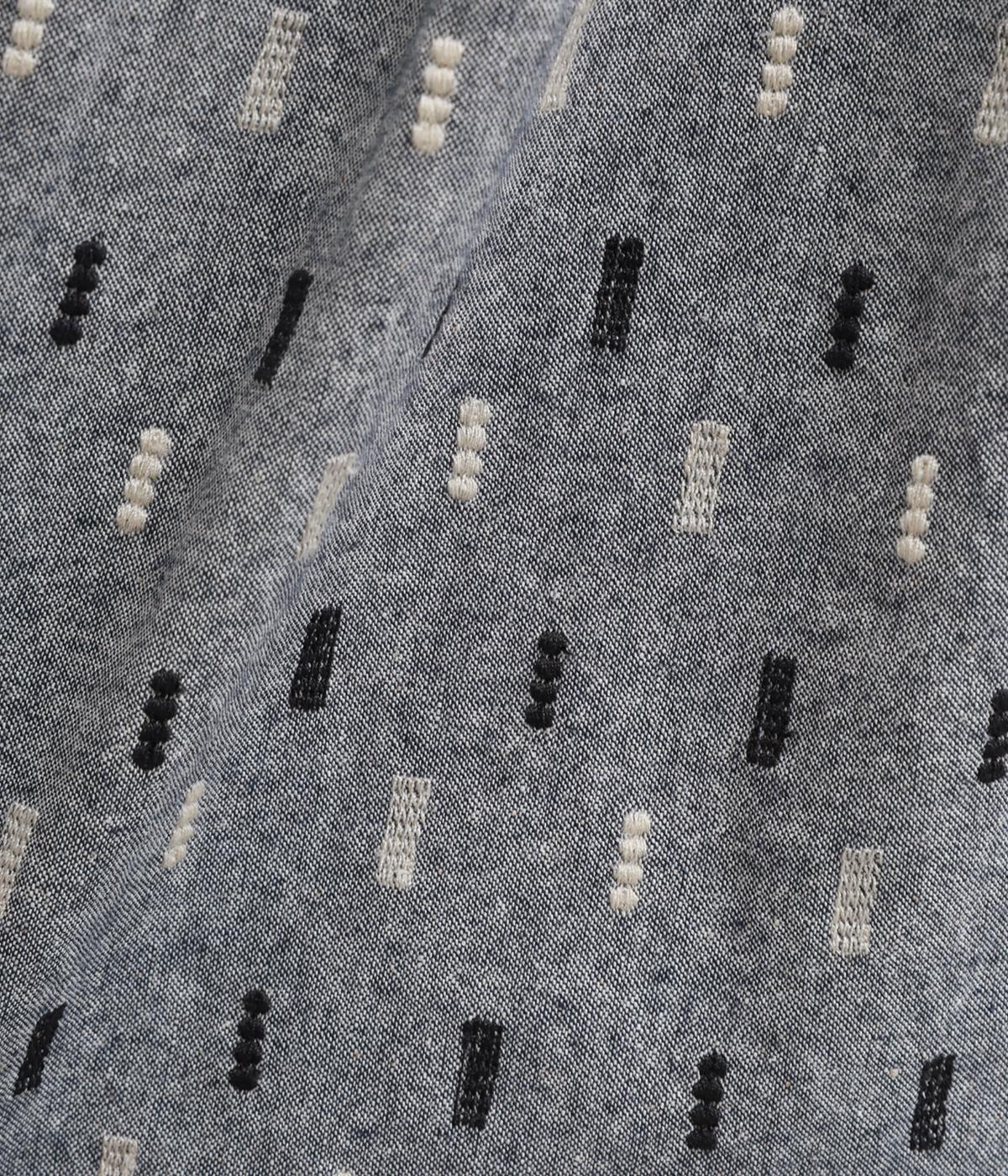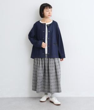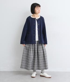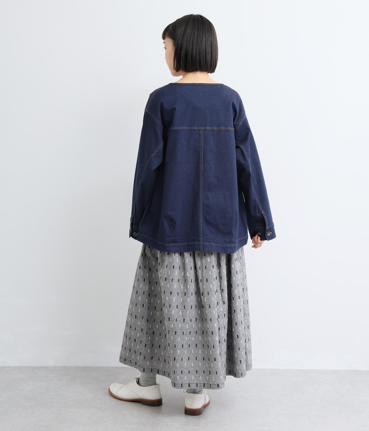 コットンダンガリーならではの、奥行きを感じる色合いが魅力の生地です。糸の表情がほのかにあらわれ、均一すぎない風合いがやさしい雰囲気を演出します。さらりとした肌ざわりと軽やかさがあり、心地よく着用できる素材感です。