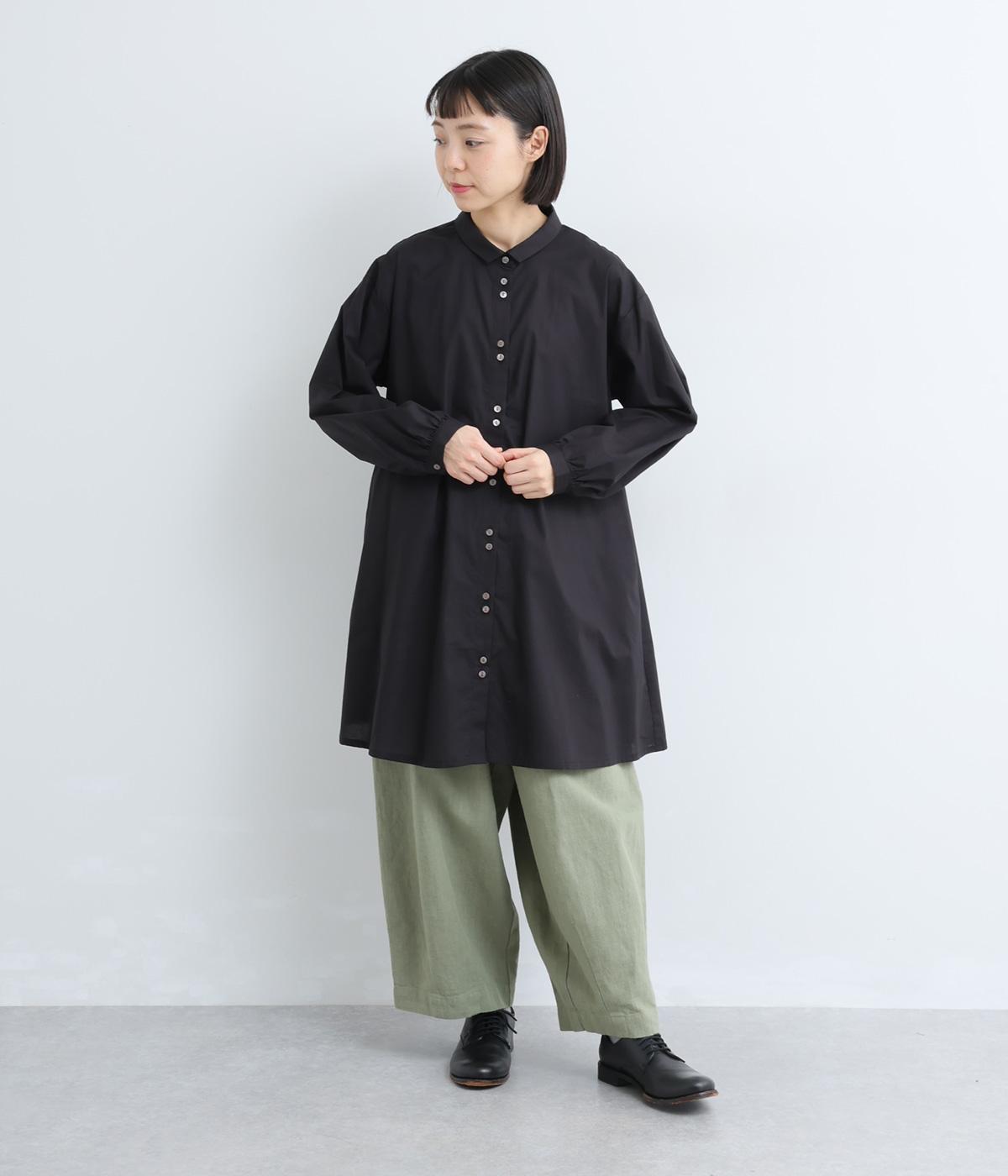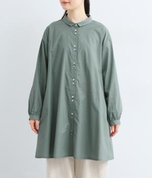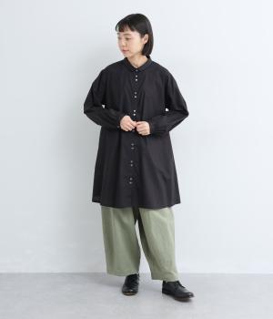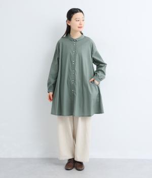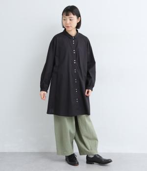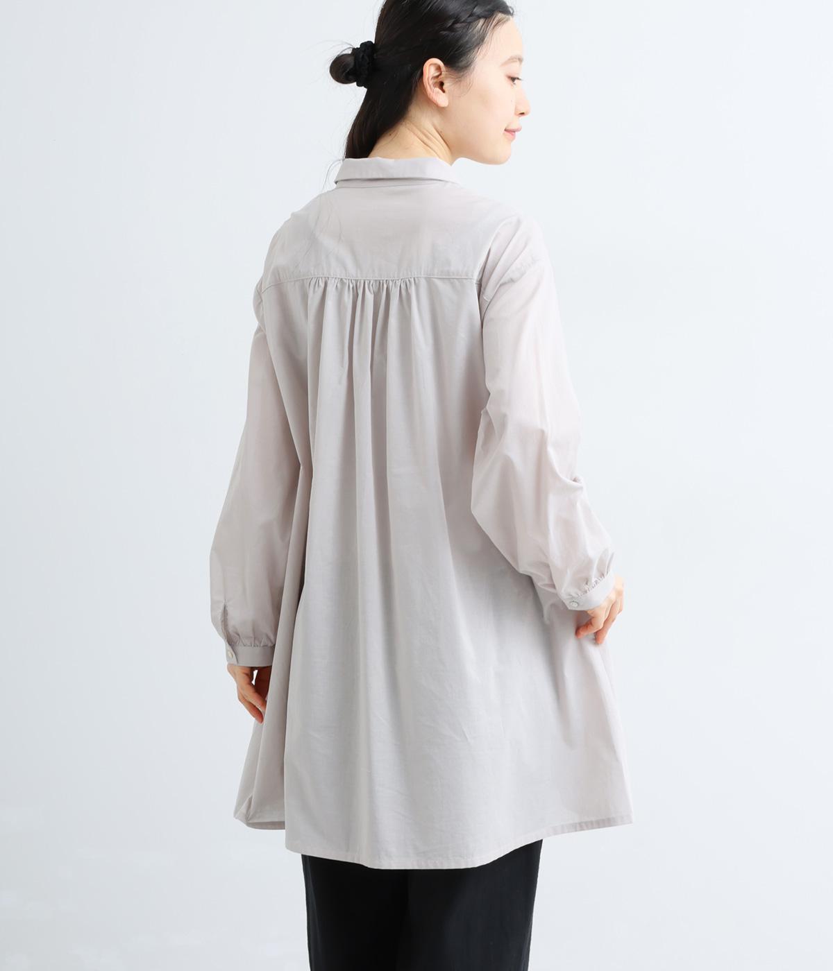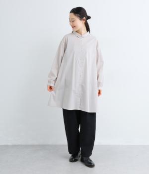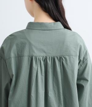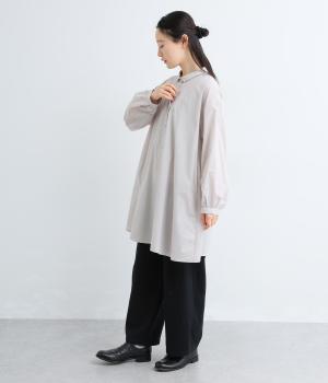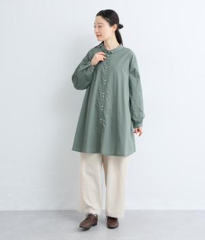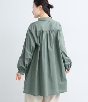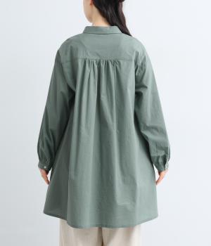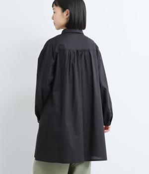 ゆったりとしたチュニック丈は、体のラインを拾いにくいのがうれしいポイント。フロントにはボタンを2つずつ並べ、さりげないリズム感をプラスしました。背面のギャザーが立体感を生み、小さめの襟が顔まわりをすっきり見せてくれます。ロングスカートやワイドパンツとのレイヤードスタイルもおすすめです。