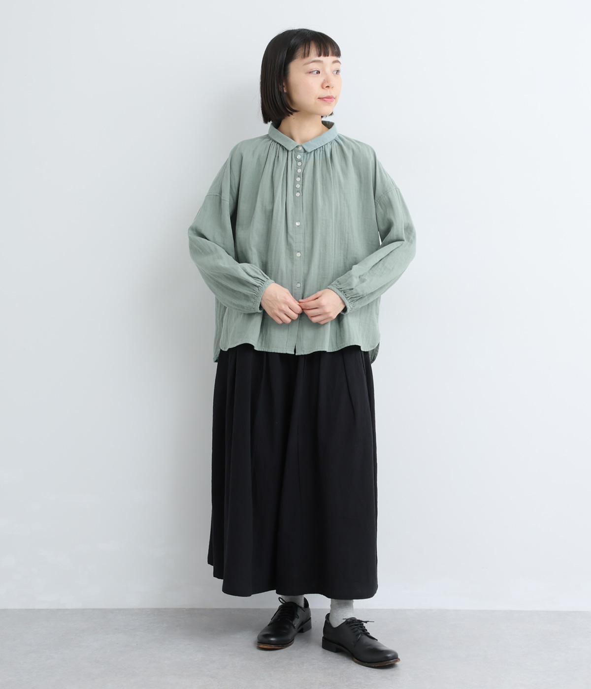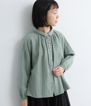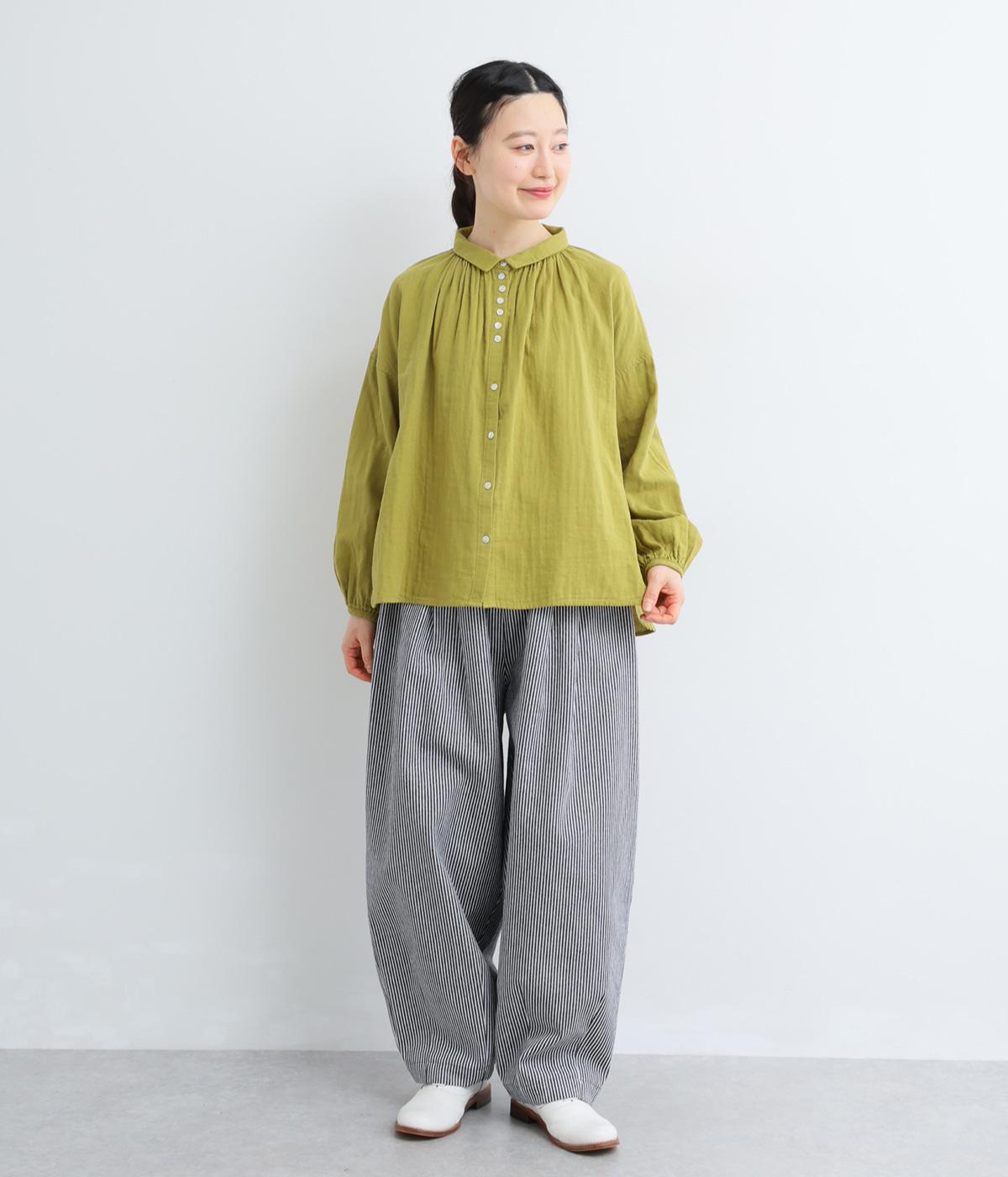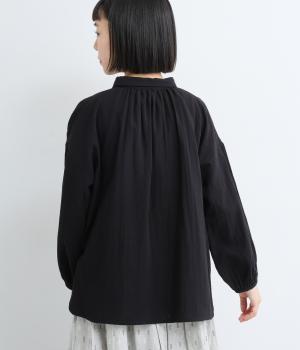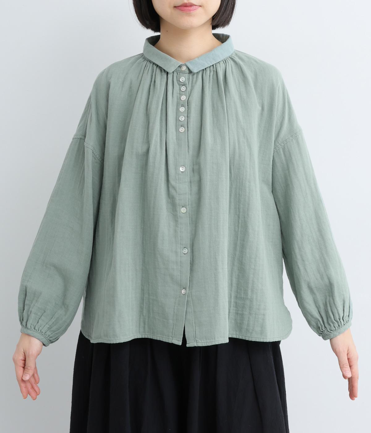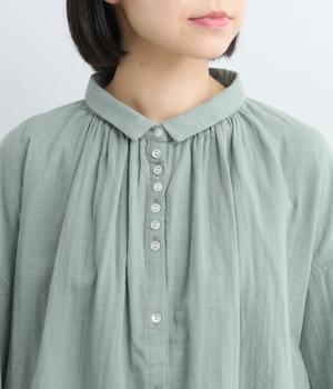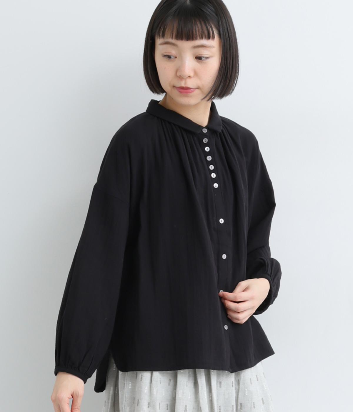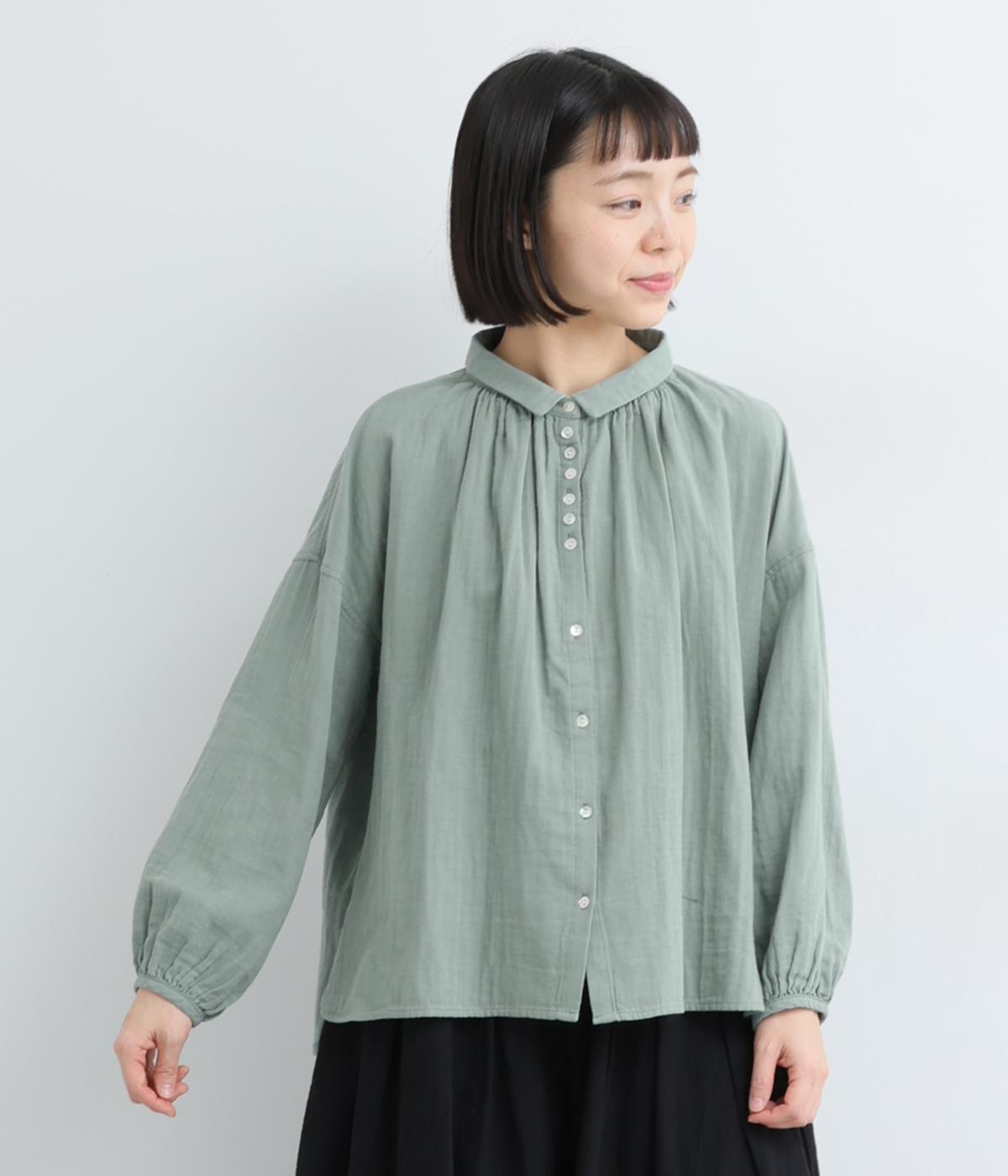 ゆったりと丸みのあるシルエットに、襟元と袖口へたっぷりと寄せたギャザーがやさしい表情を添えるブラウスです。縦ラインを意識した、メリハリのあるボタン配置がさりげないアクセント。前後差のある裾で、着こなしに軽やかな抜け感を演出します。