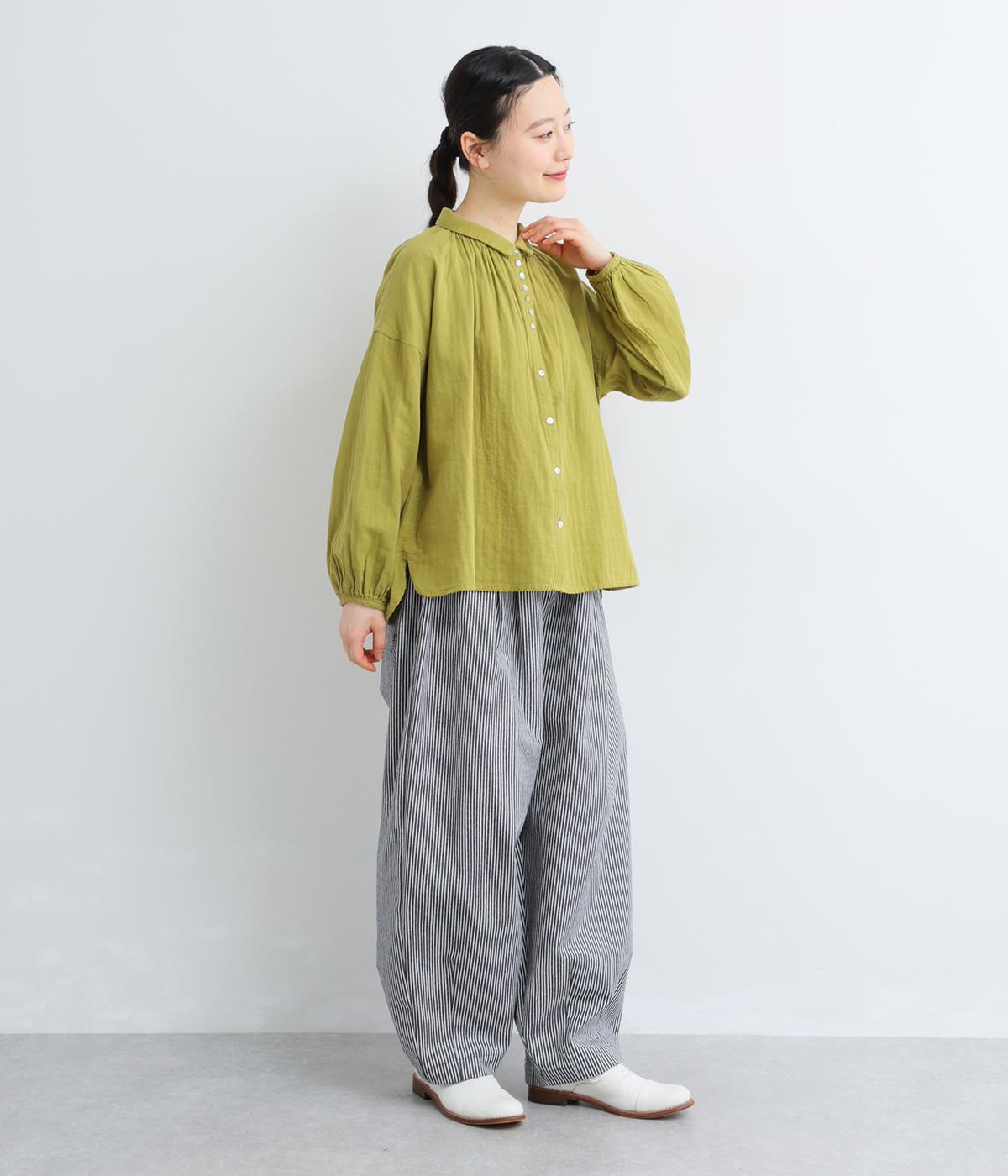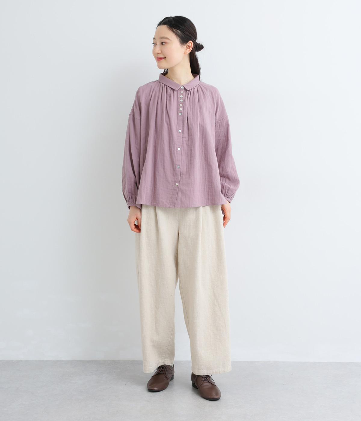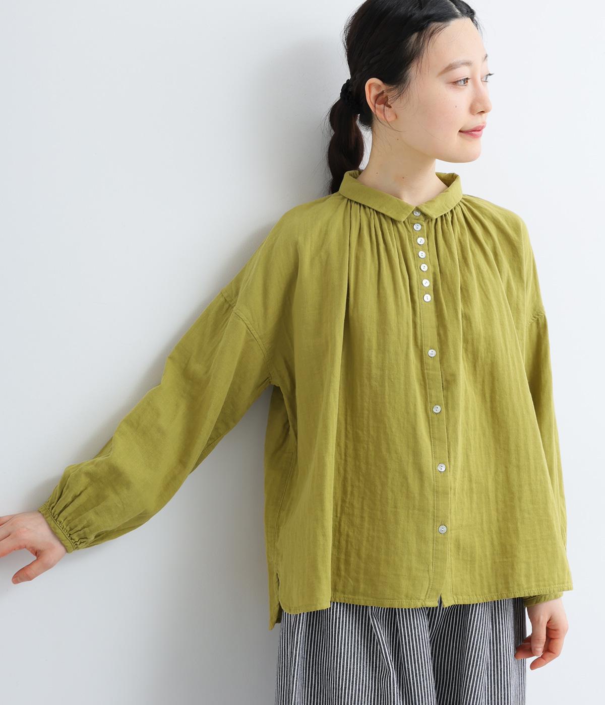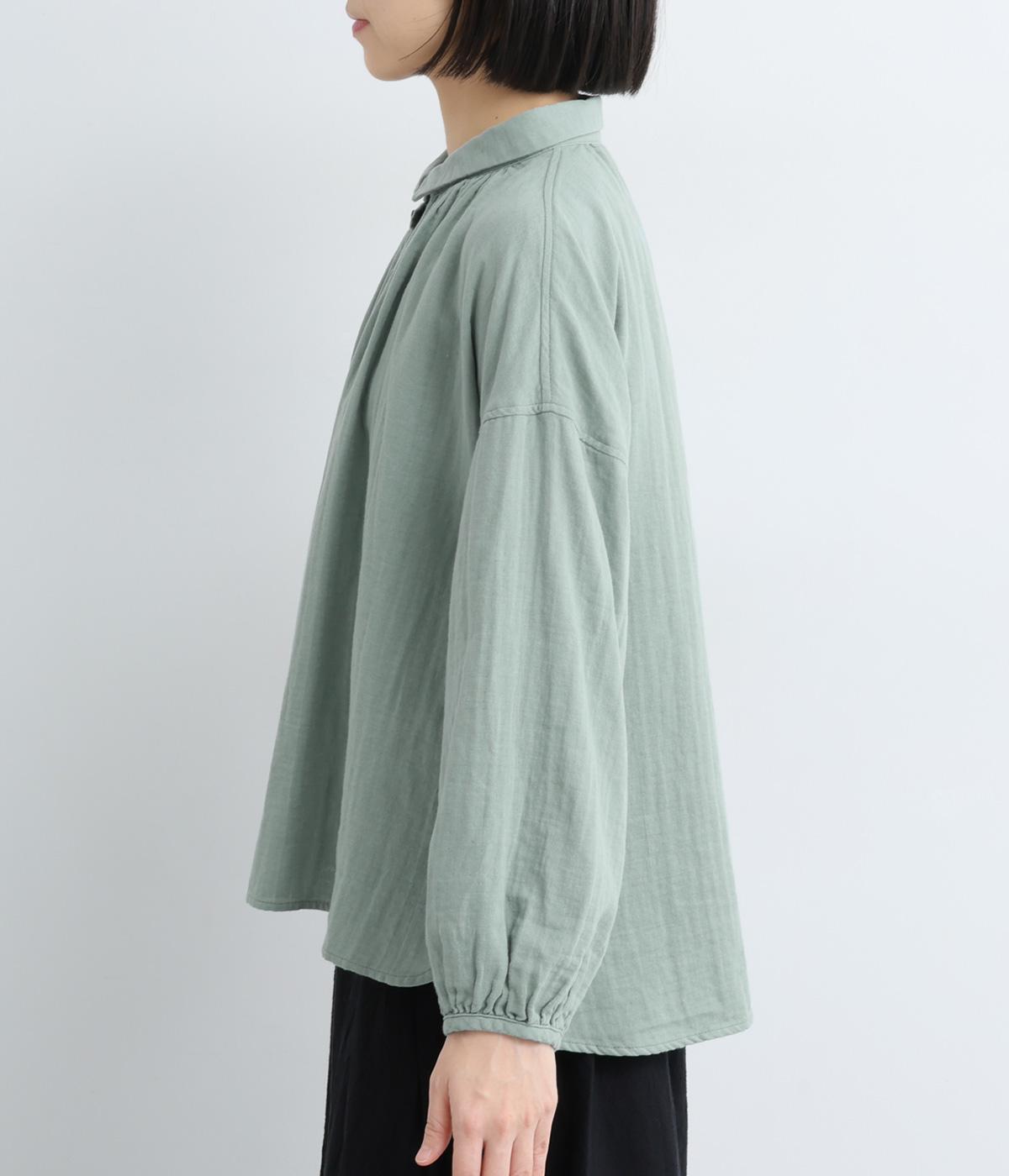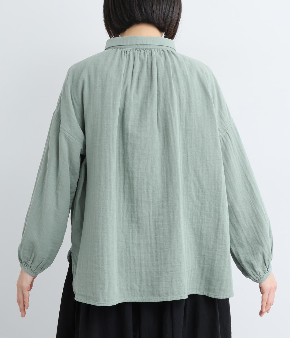 ゆったりと丸みのあるシルエットに、襟元と袖口へたっぷりと寄せたギャザーがやさしい表情を添えるブラウスです。縦ラインを意識した、メリハリのあるボタン配置がさりげないアクセント。前後差のある裾で、着こなしに軽やかな抜け感を演出します。