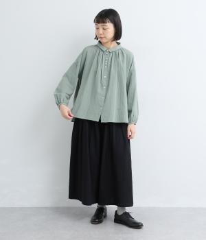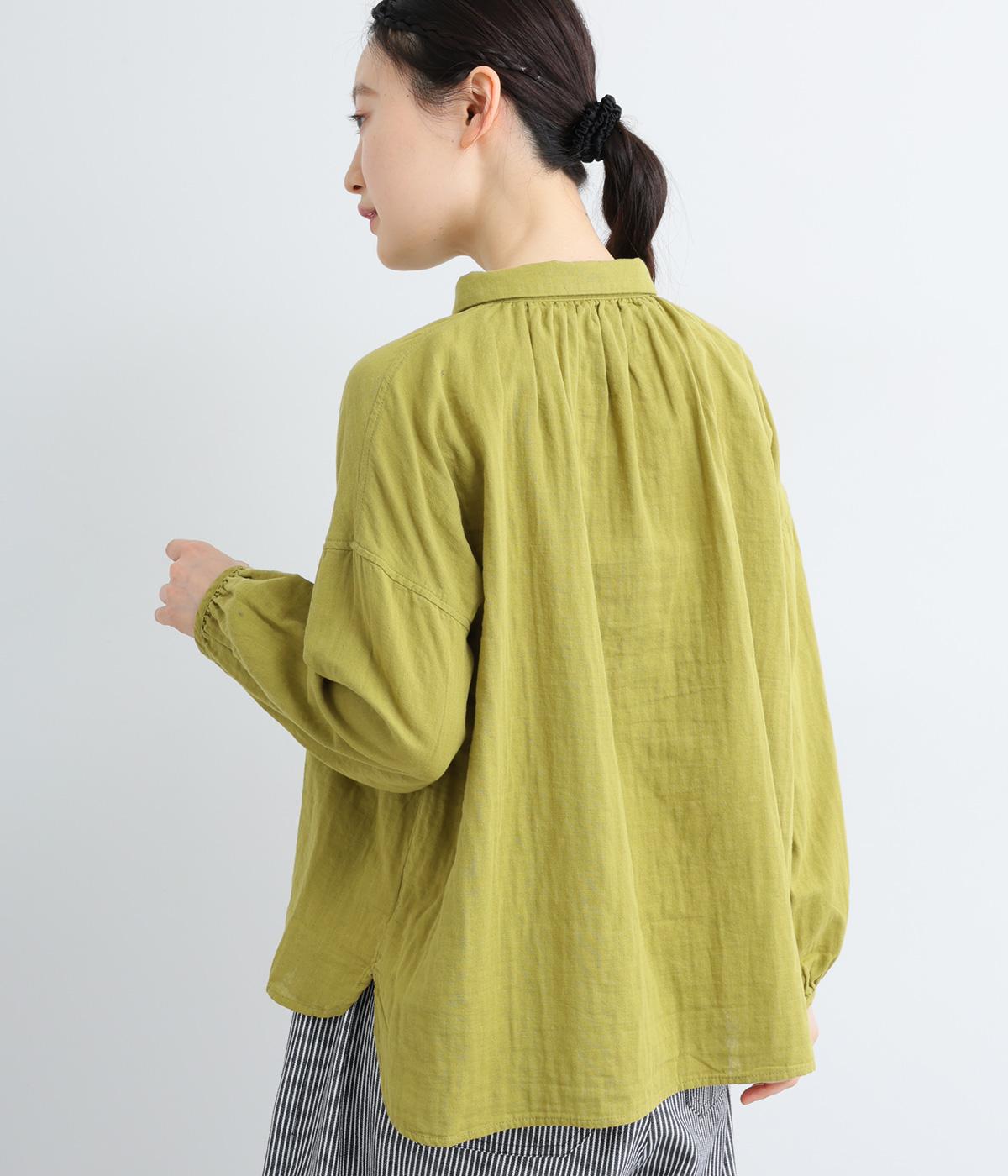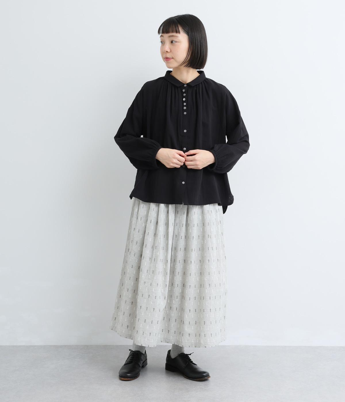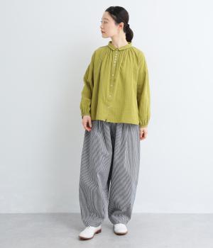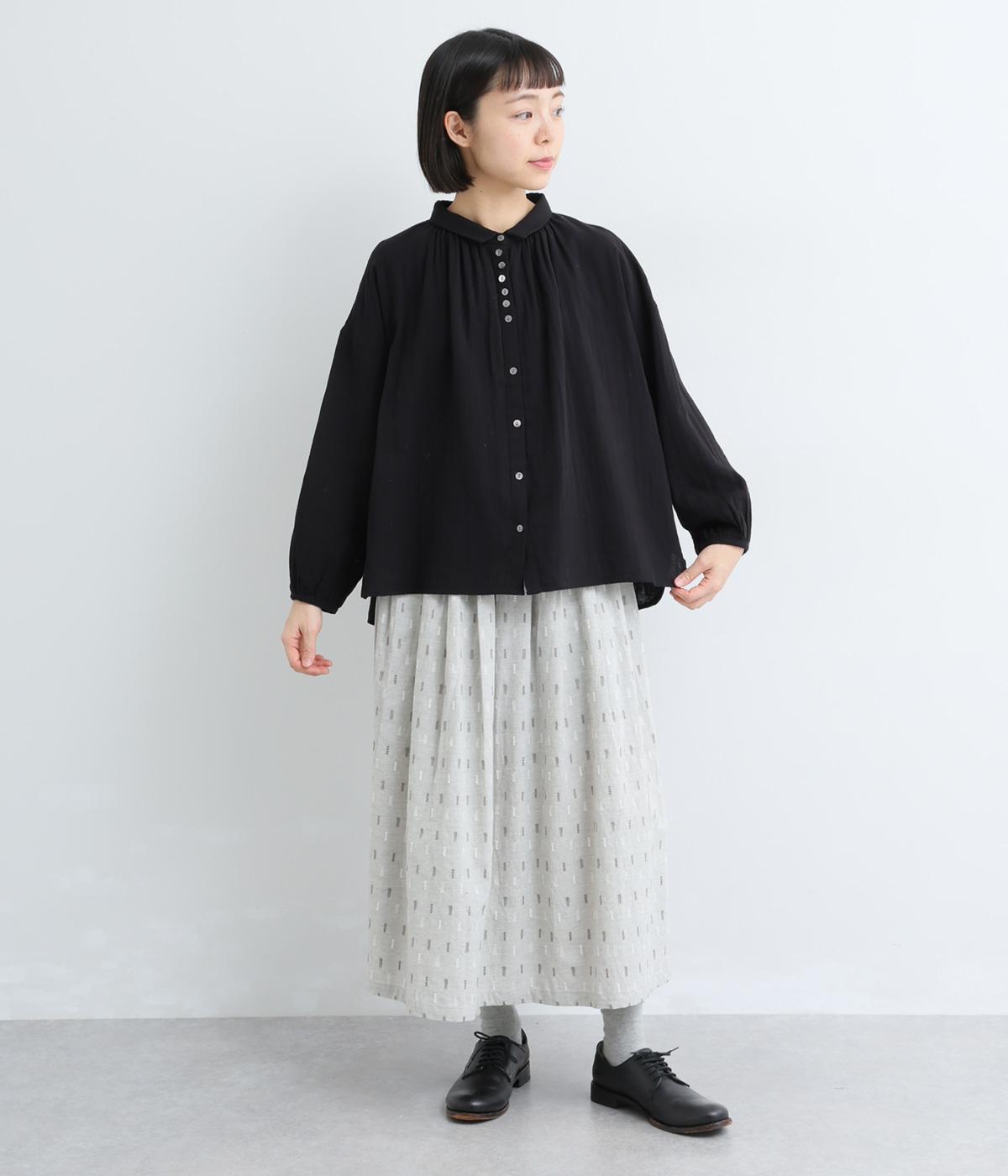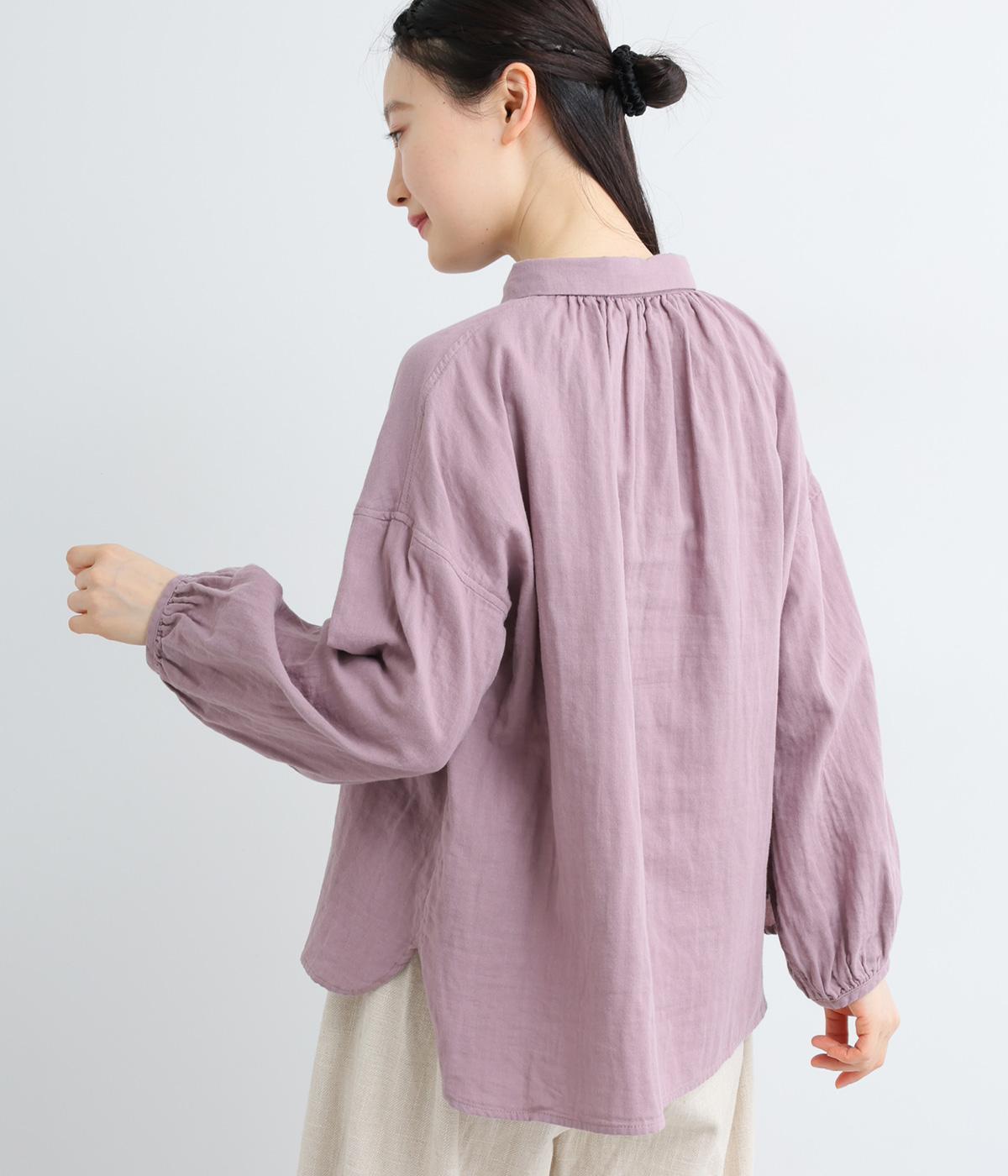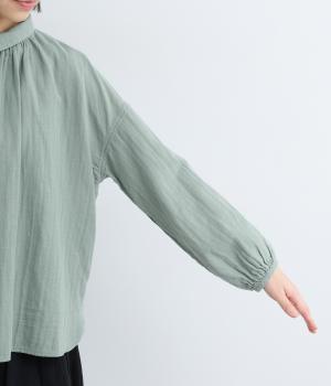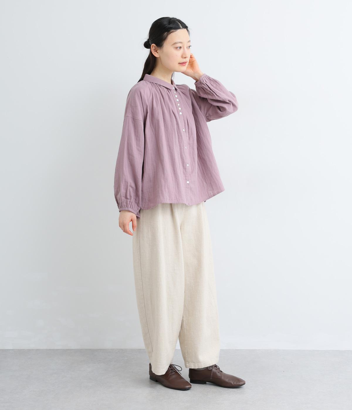 ゆったりと丸みのあるシルエットに、襟元と袖口へたっぷりと寄せたギャザーがやさしい表情を添えるブラウスです。縦ラインを意識した、メリハリのあるボタン配置がさりげないアクセント。前後差のある裾で、着こなしに軽やかな抜け感を演出します。