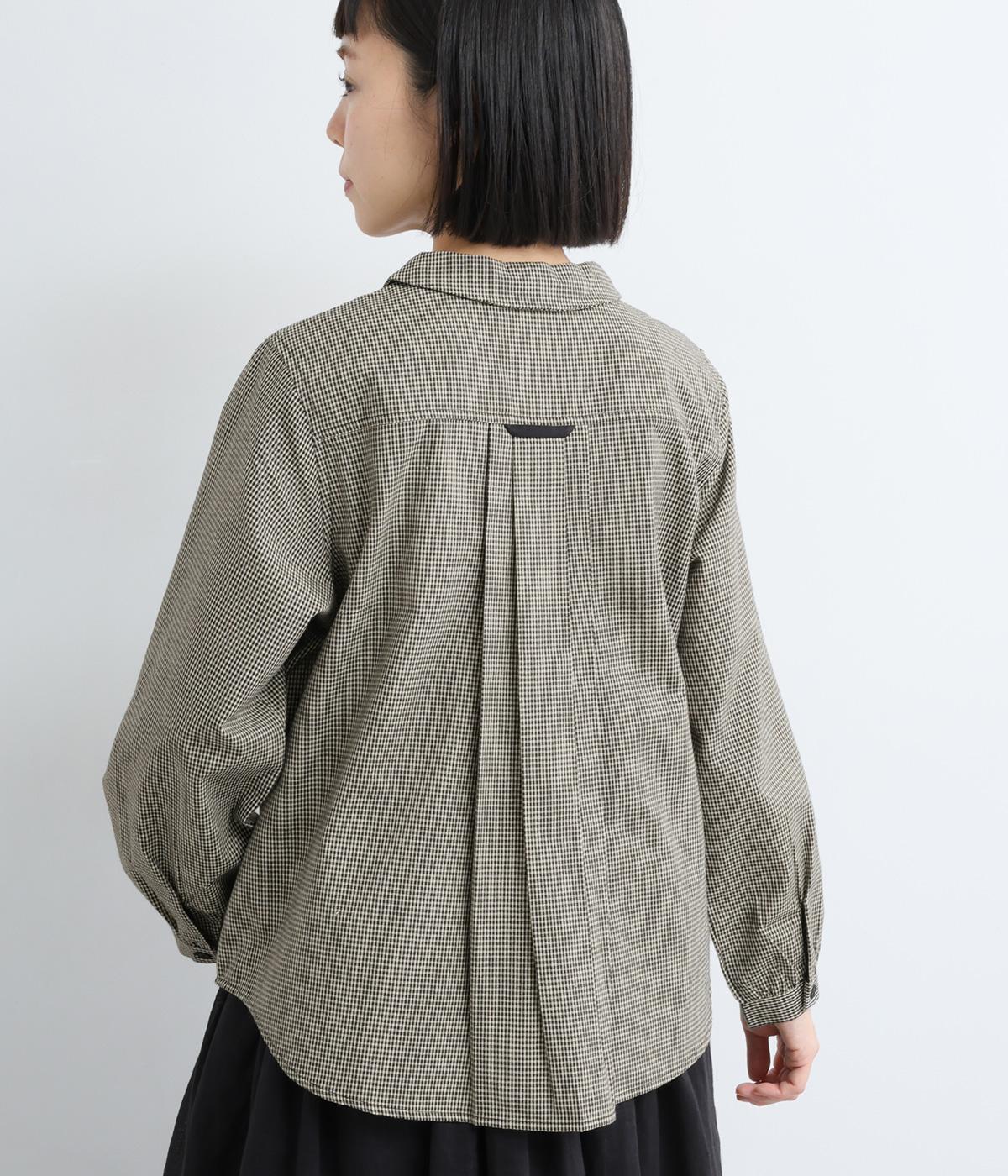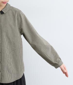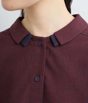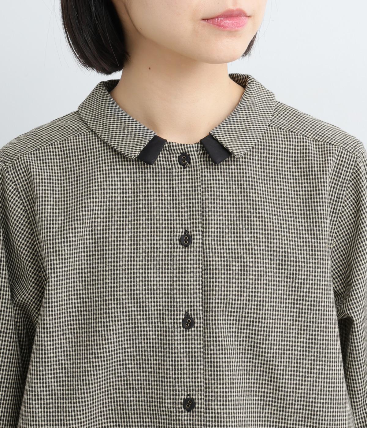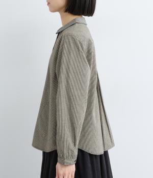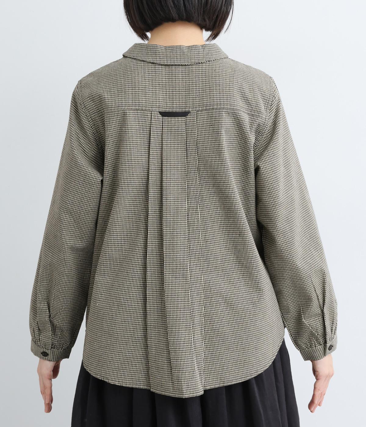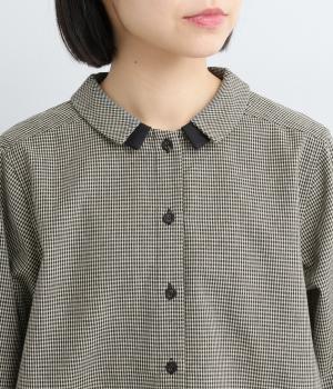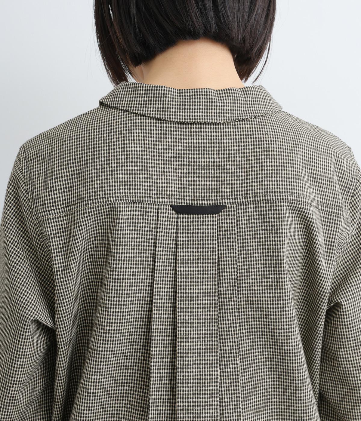 細かなチェック柄が、落ち着いた印象を与えるブラウスです。ボタンと配色を合わせた二重の襟が、シンプルさのなかに個性をプラスします。背面のボックスプリーツとハンガーループが、さりげないアクセント。大きめのポケットもついているので、機能性もばつぐんです。