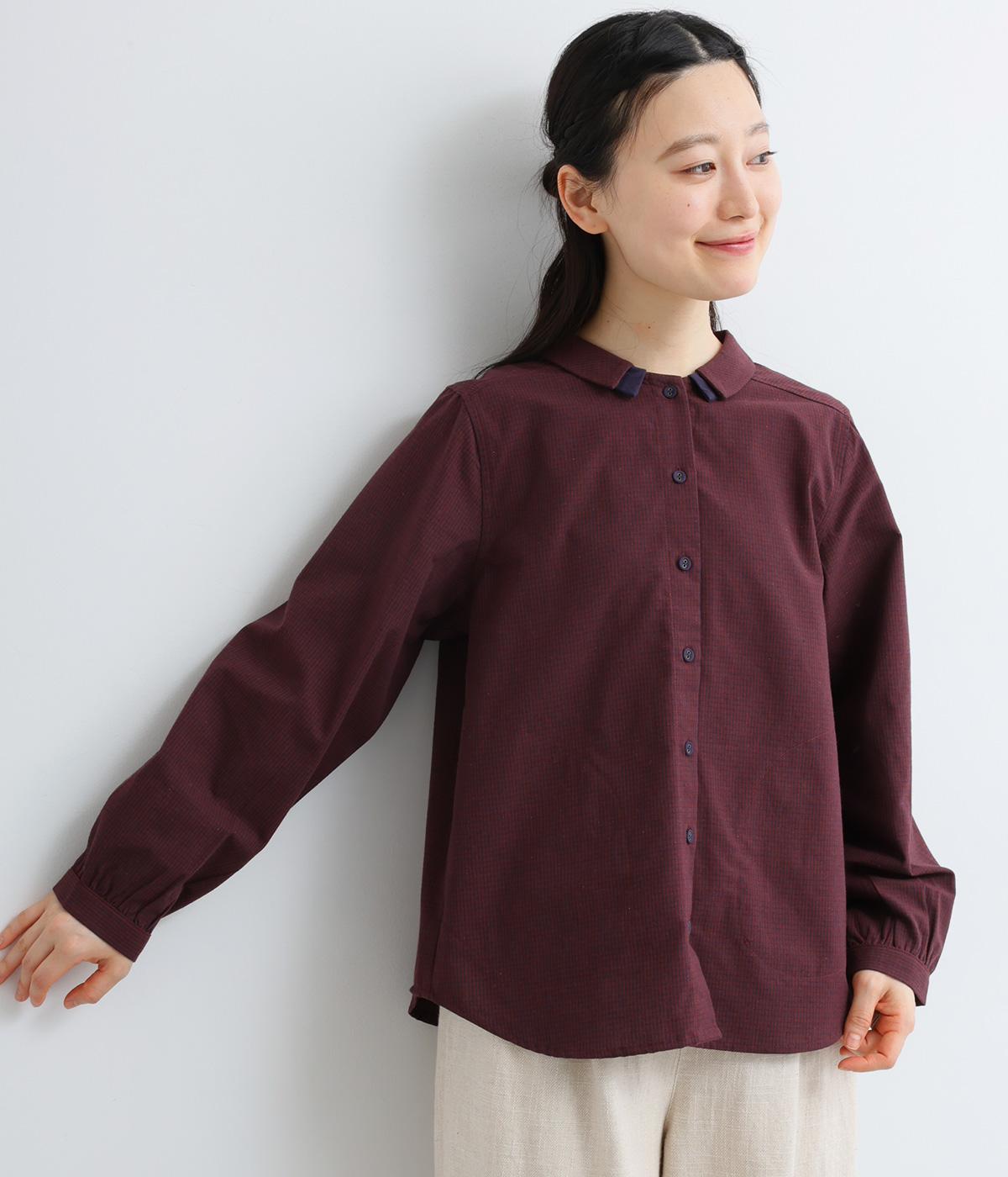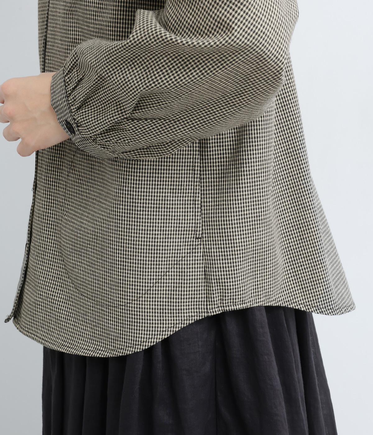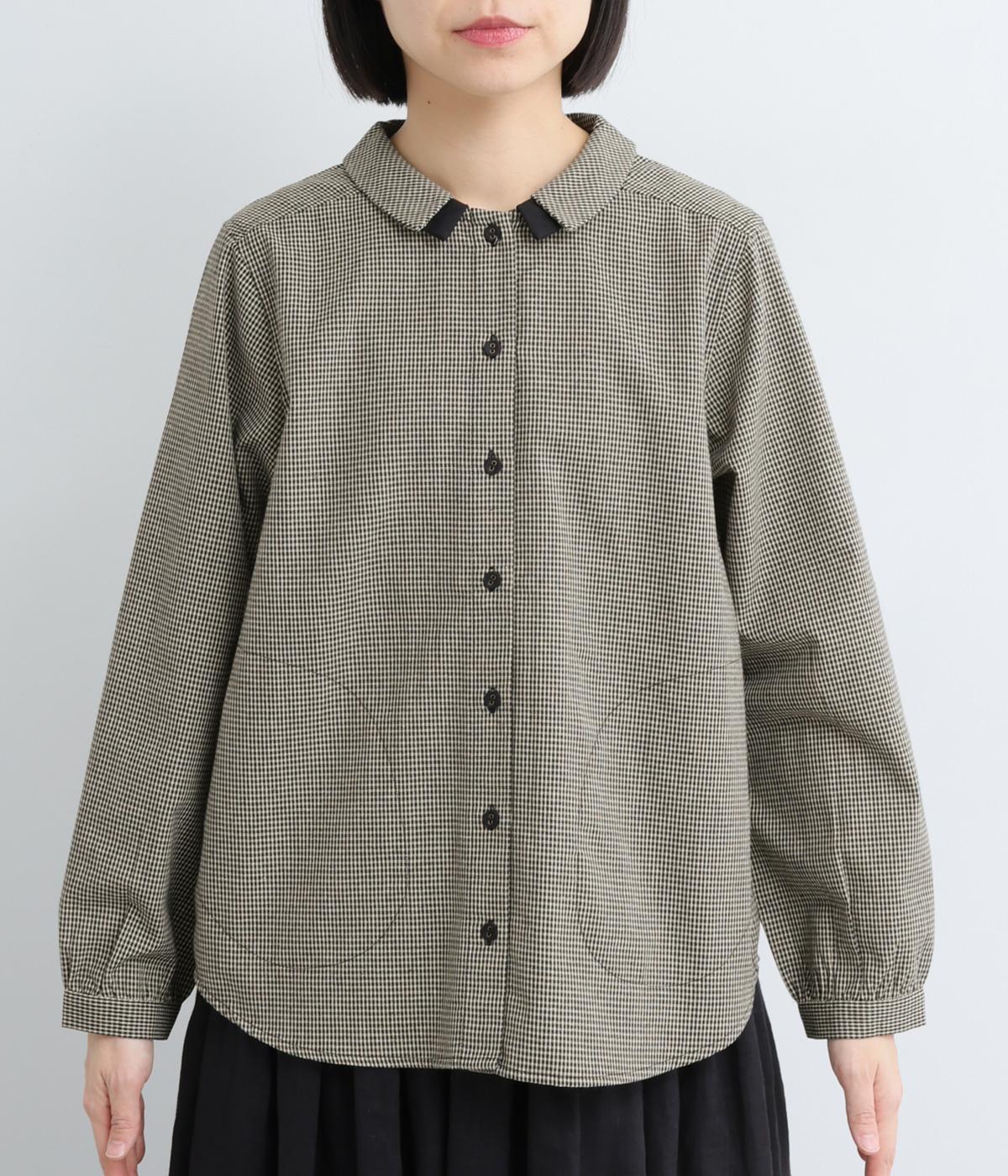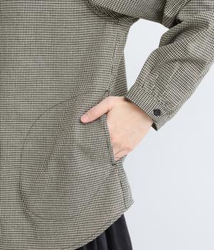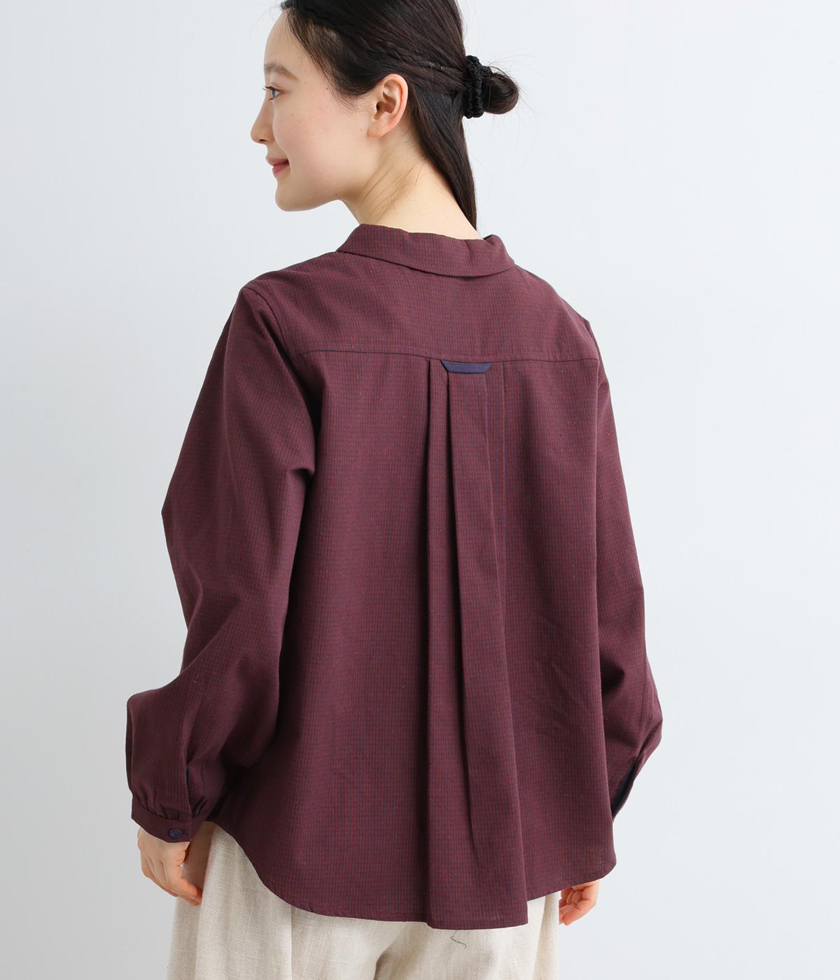 細かなチェック柄が、落ち着いた印象を与えるブラウスです。ボタンと配色を合わせた二重の襟が、シンプルさのなかに個性をプラスします。背面のボックスプリーツとハンガーループが、さりげないアクセント。大きめのポケットもついているので、機能性もばつぐんです。