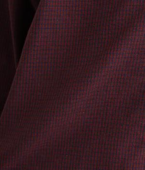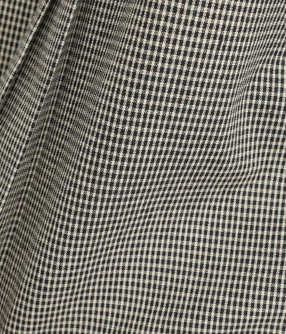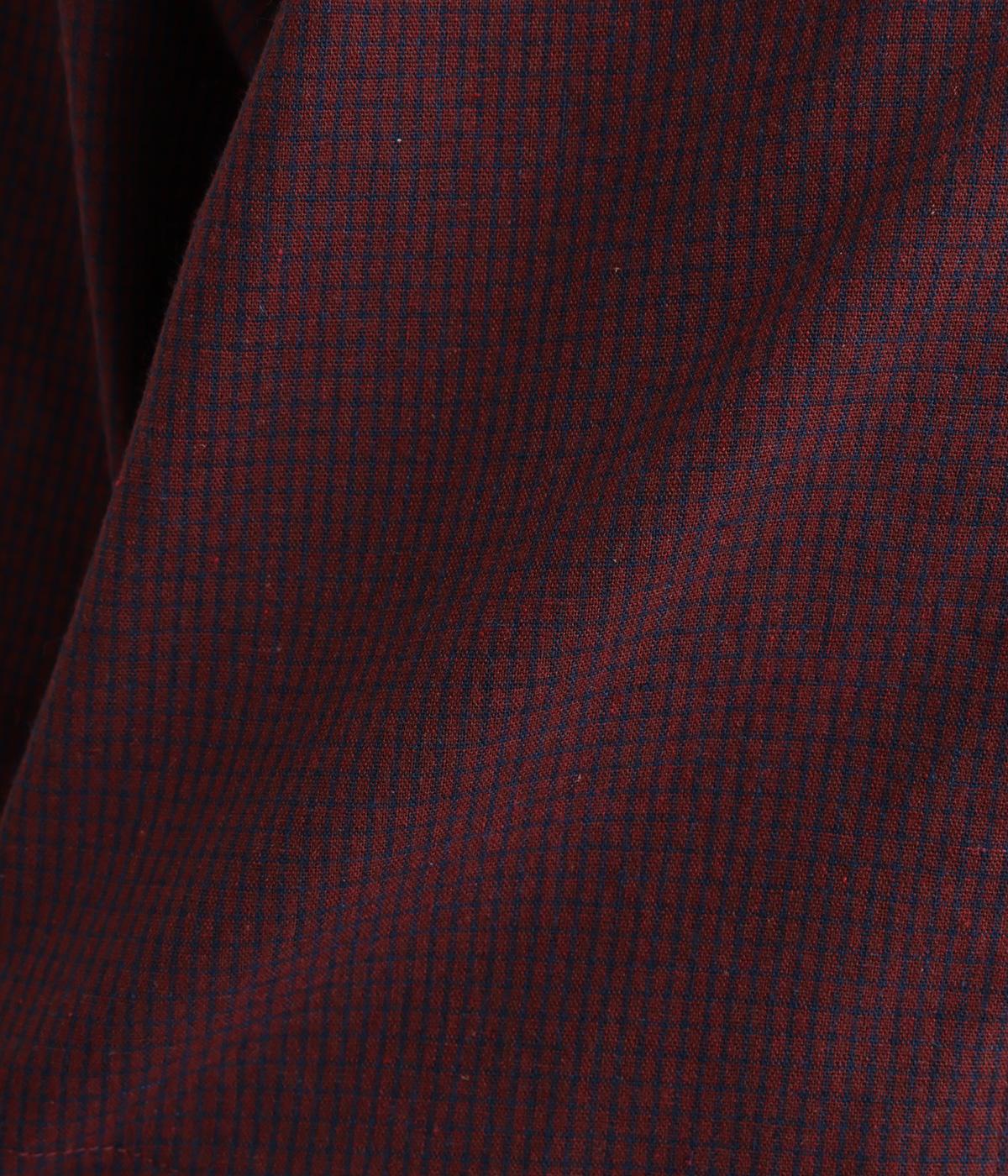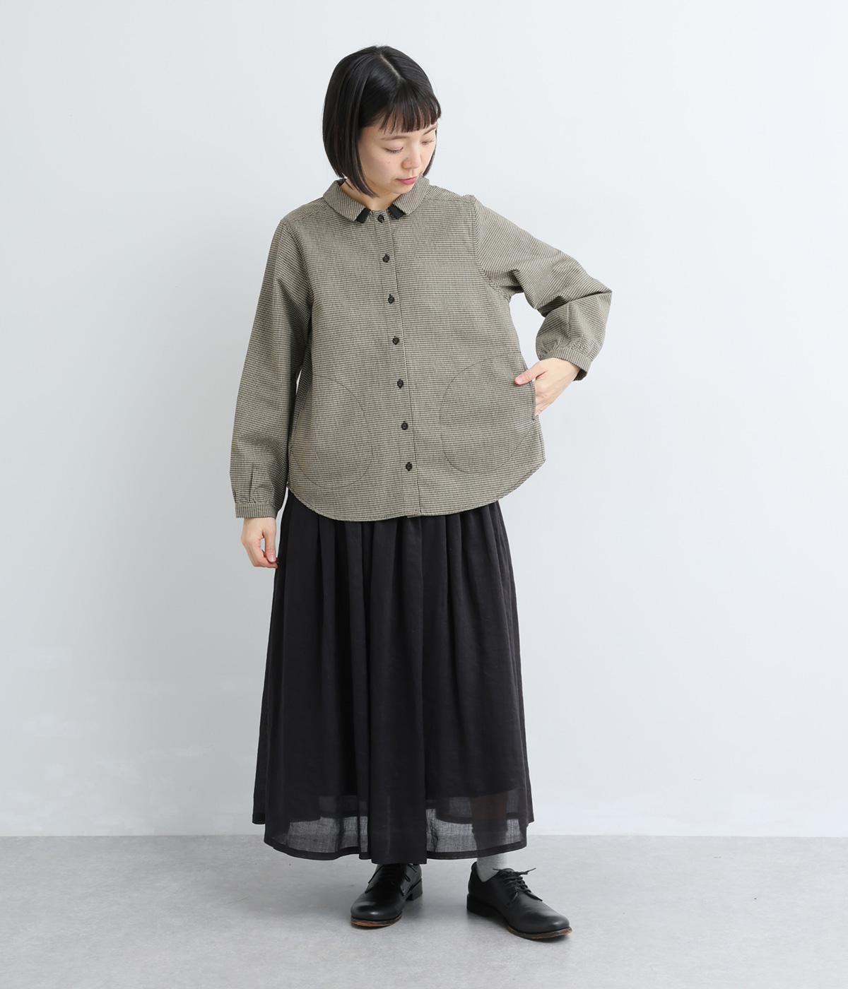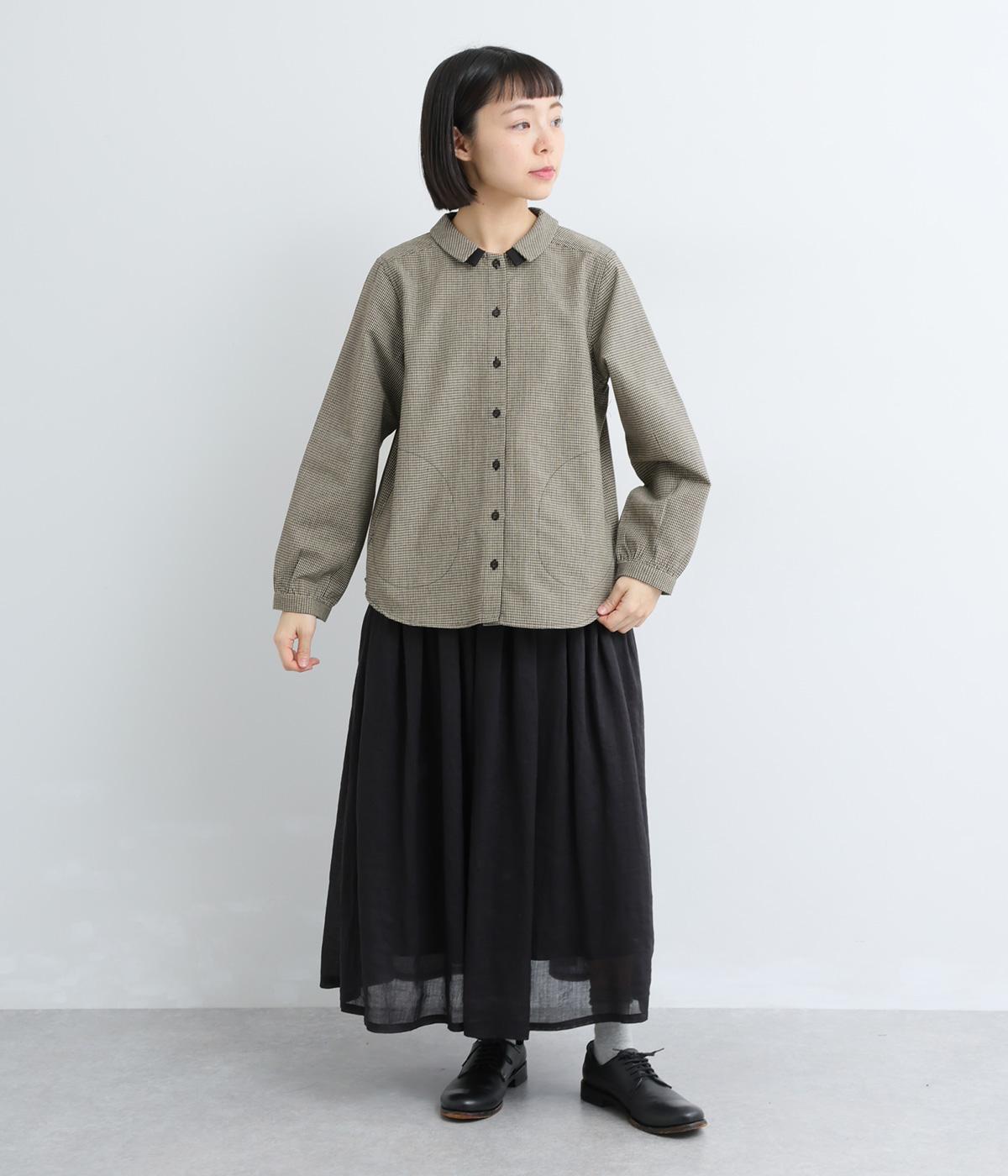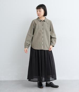細かなチェック柄が、落ち着いた印象を与えるブラウスです。ボタンと配色を合わせた二重の襟が、シンプルさのなかに個性をプラスします。背面のボックスプリーツとハンガーループが、さりげないアクセント。大きめのポケットもついているので、機能性もばつぐんです。