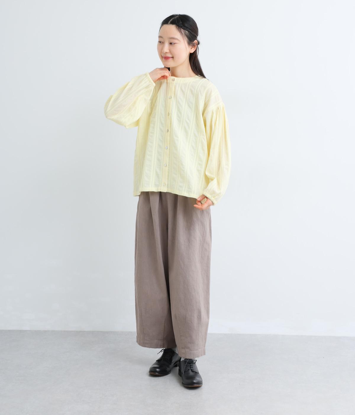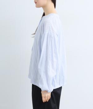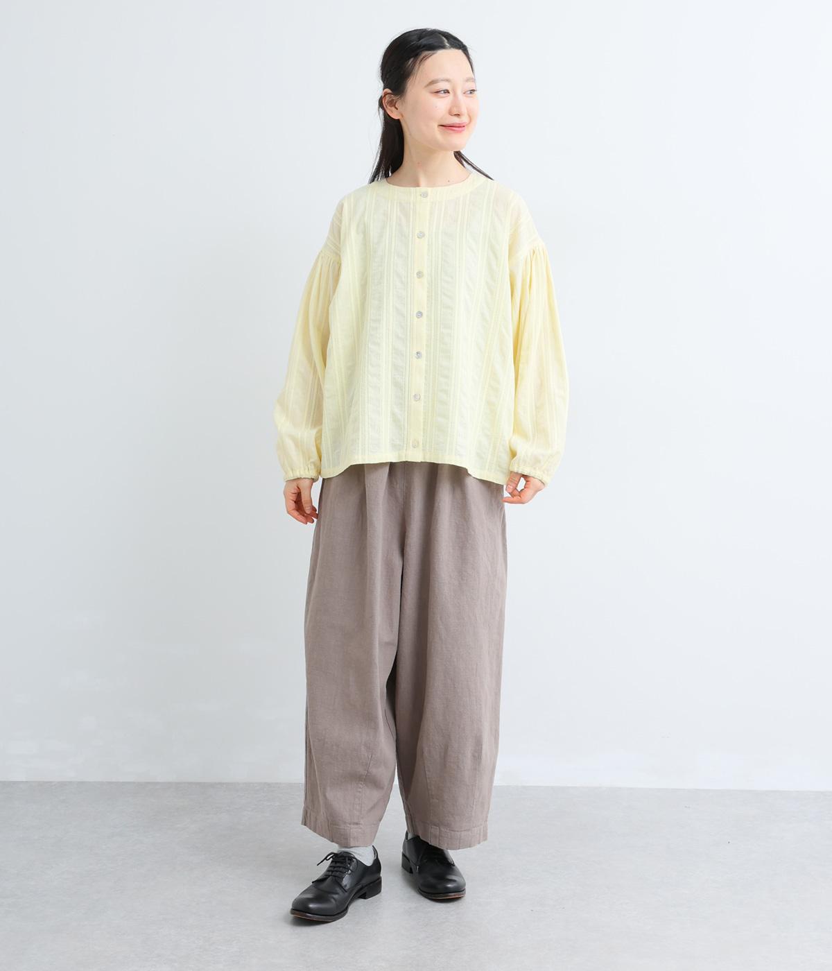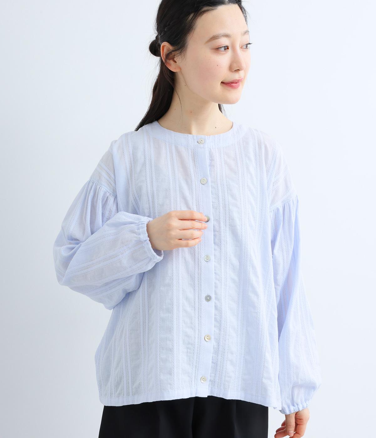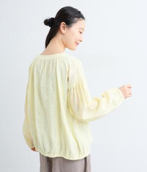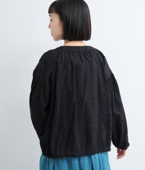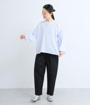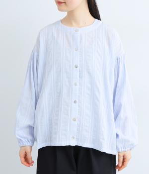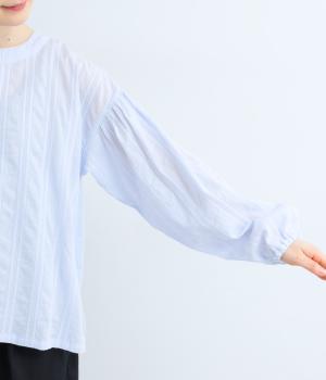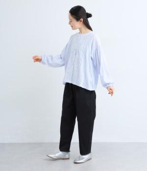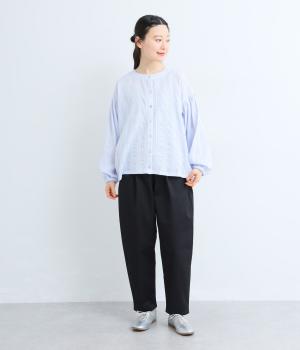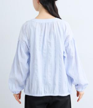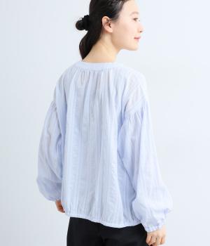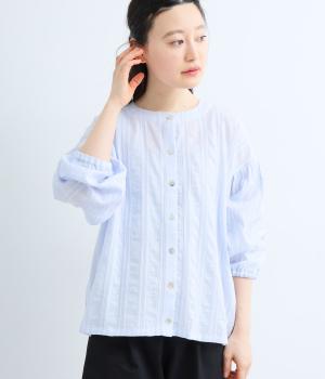 立体感のあるドビーストライプが、奥行きのある印象を演出。ナチュラルな雰囲気のなかに、主張しすぎない縦のラインがほどよいアクセントを加えています。袖の切り替えにはギャザーを寄せ、ふんわりと丸みのあるシルエットに。袖口はゴム仕様なので、たくしあげれば抜け感のある着こなしがたのしめます。