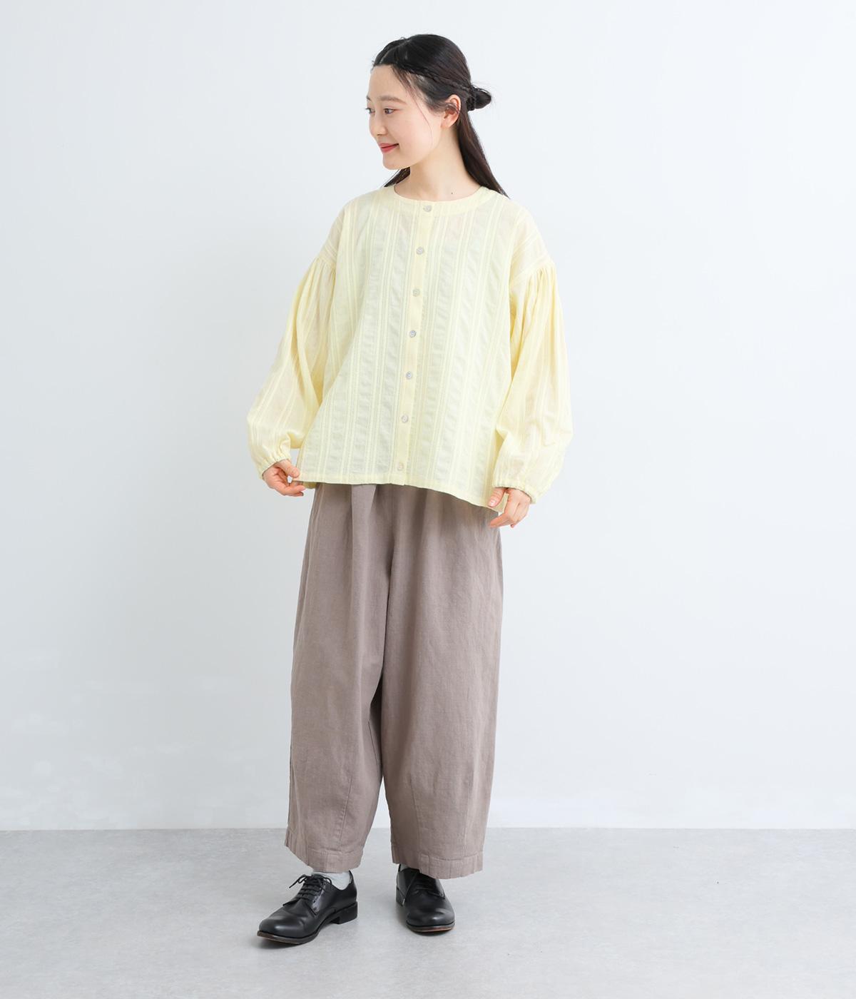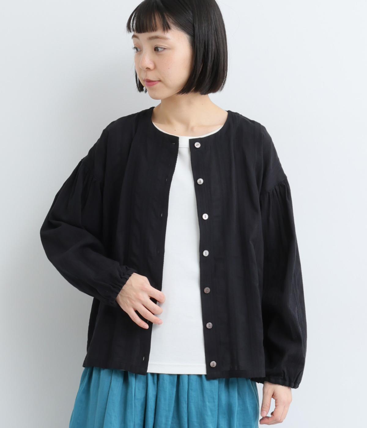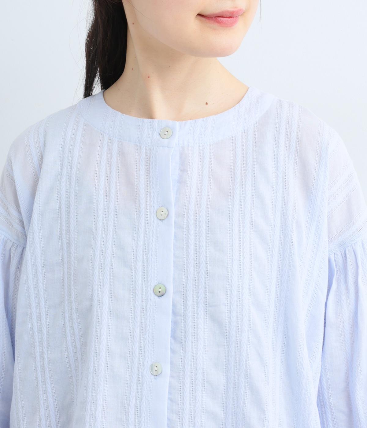 立体感のあるドビーストライプが、奥行きのある印象を演出。ナチュラルな雰囲気のなかに、主張しすぎない縦のラインがほどよいアクセントを加えています。袖の切り替えにはギャザーを寄せ、ふんわりと丸みのあるシルエットに。袖口はゴム仕様なので、たくしあげれば抜け感のある着こなしがたのしめます。
