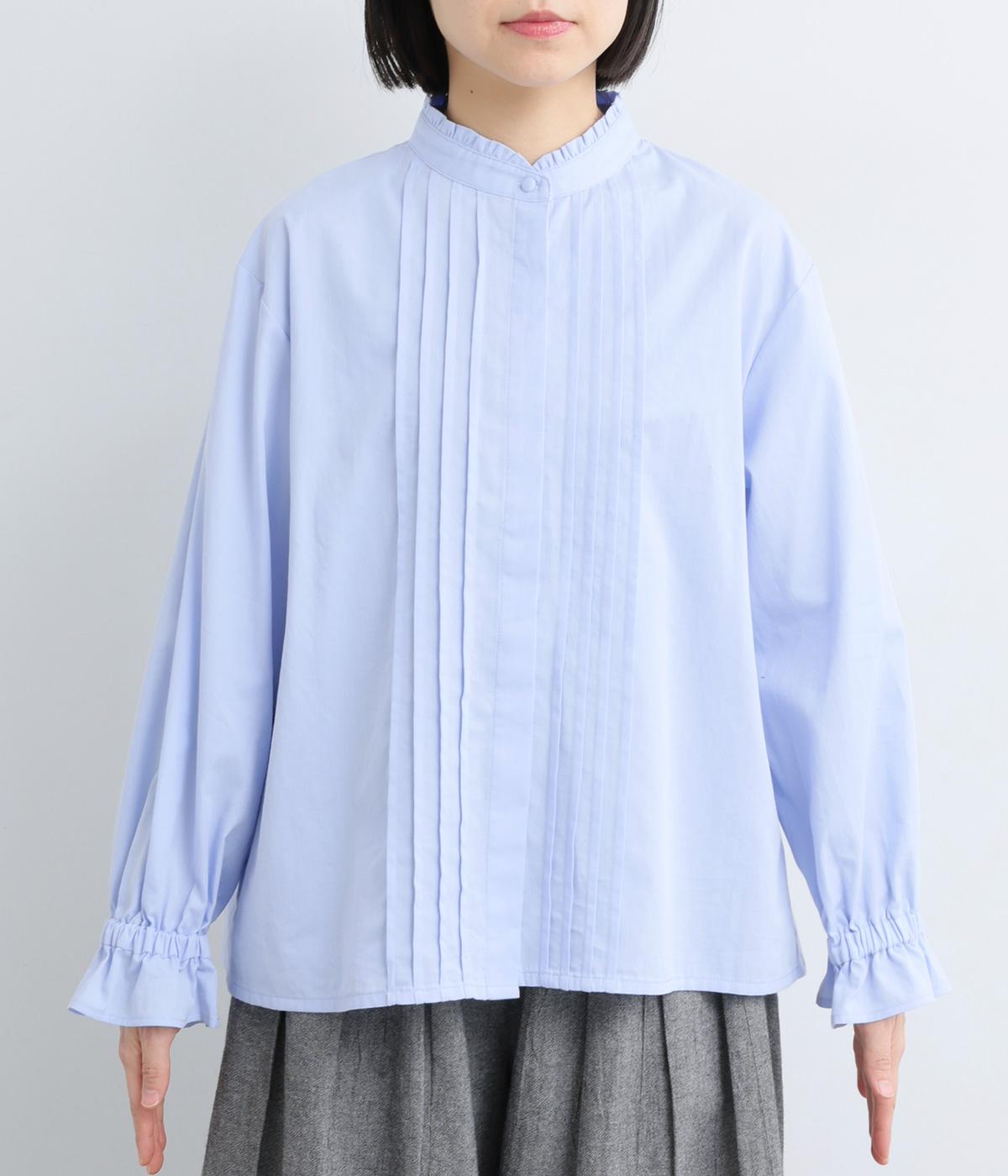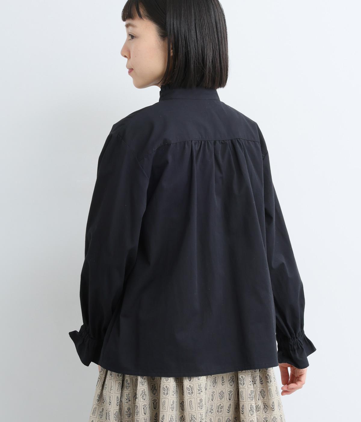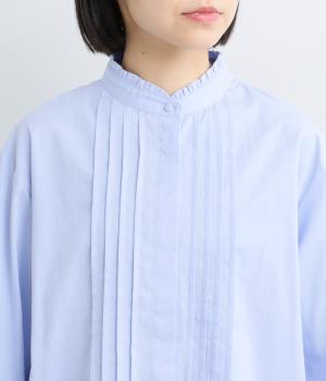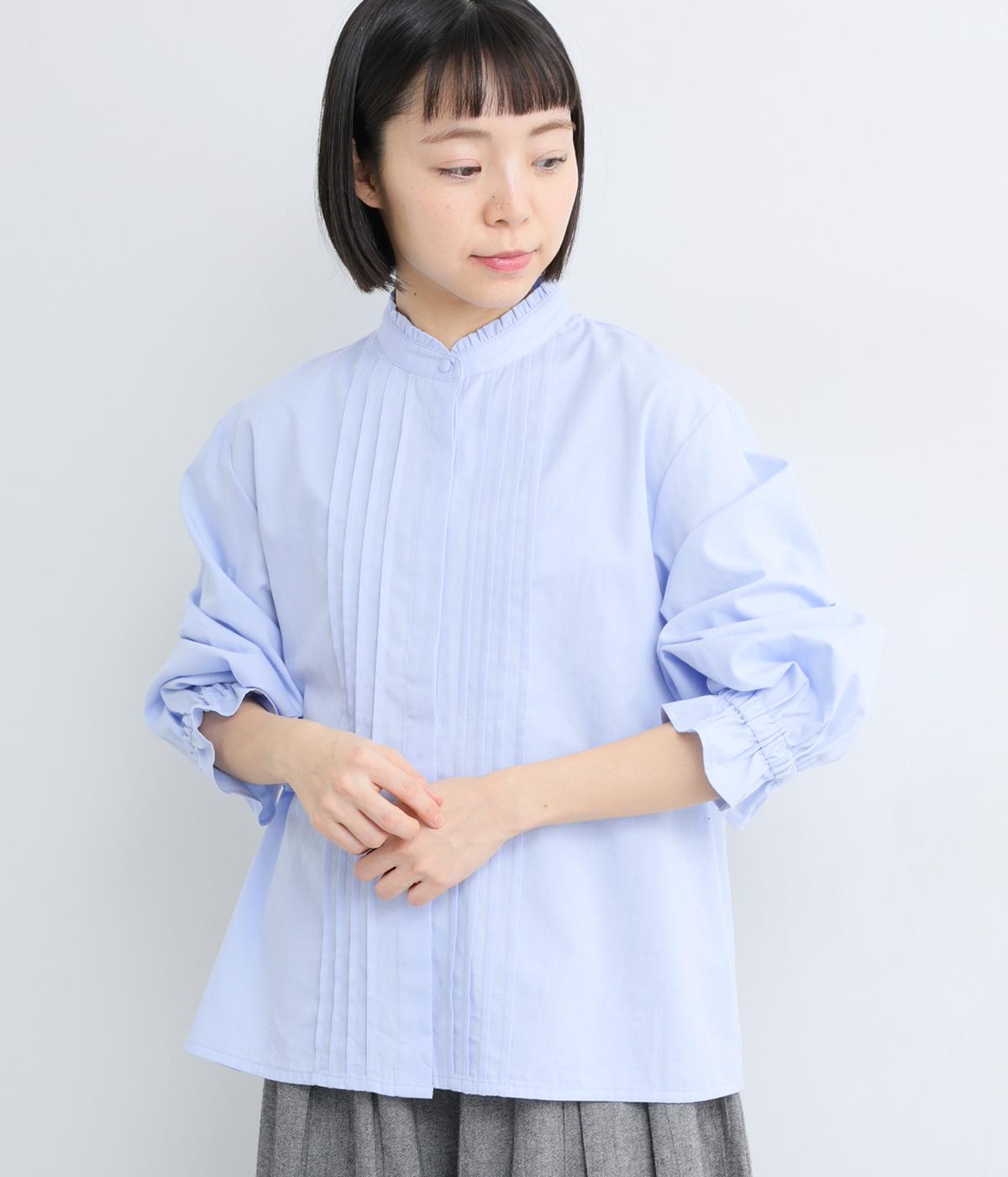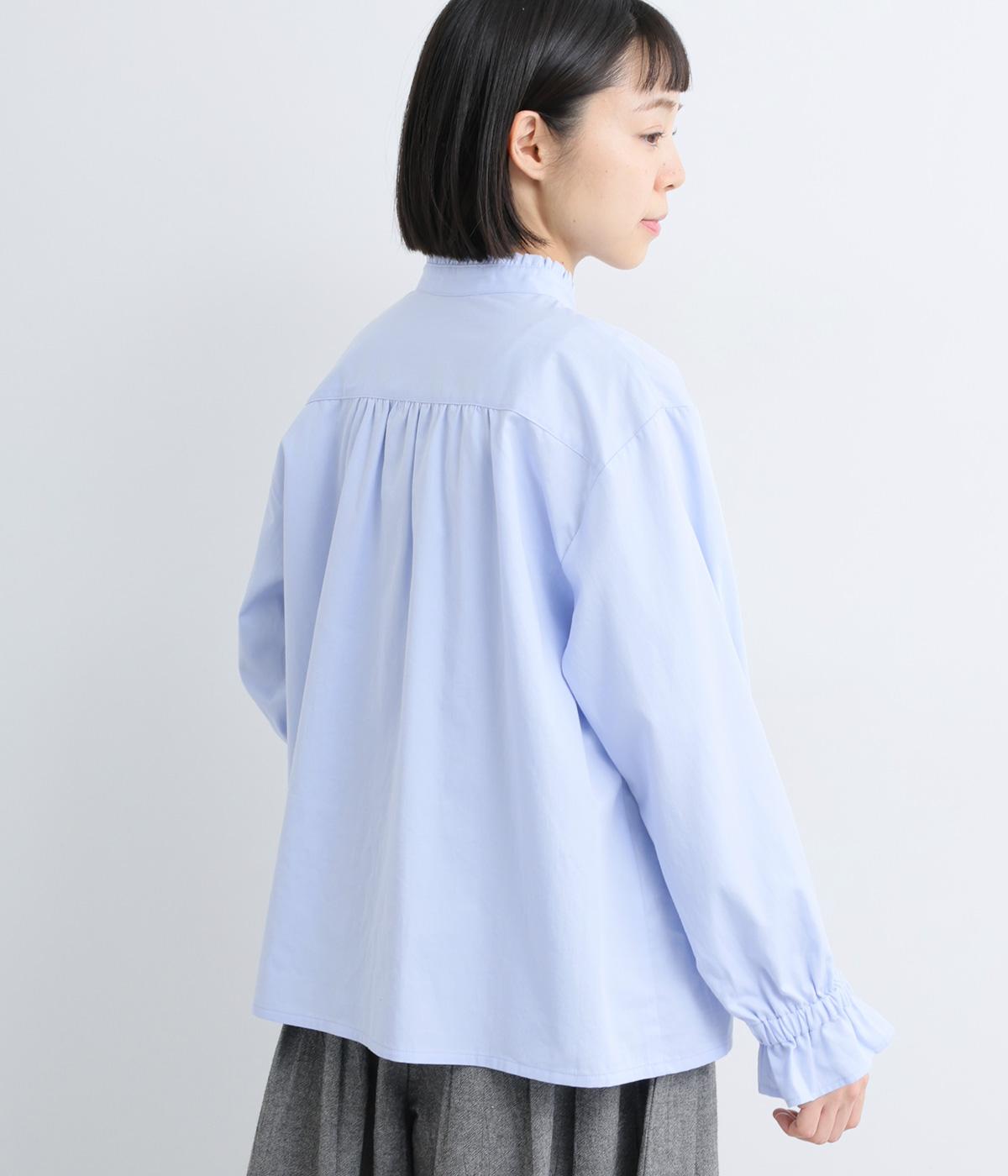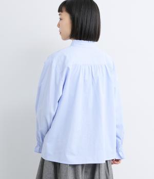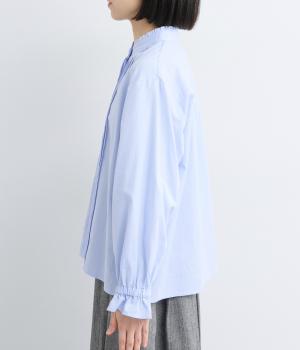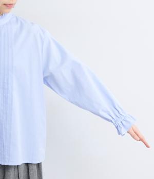 ちいさなフリルをあしらったスタンドネックが、顔まわりにやさしい華やぎを添える一枚。フロントにピンタックと比翼ボタンを施し、甘さをおさえた上品な佇まいに仕上げました。袖口にはボリューム感のあるフリルをあしらい、さりげないアクセントをプラスしています。ゴム仕様なので、着こなしをアレンジできるのも◎