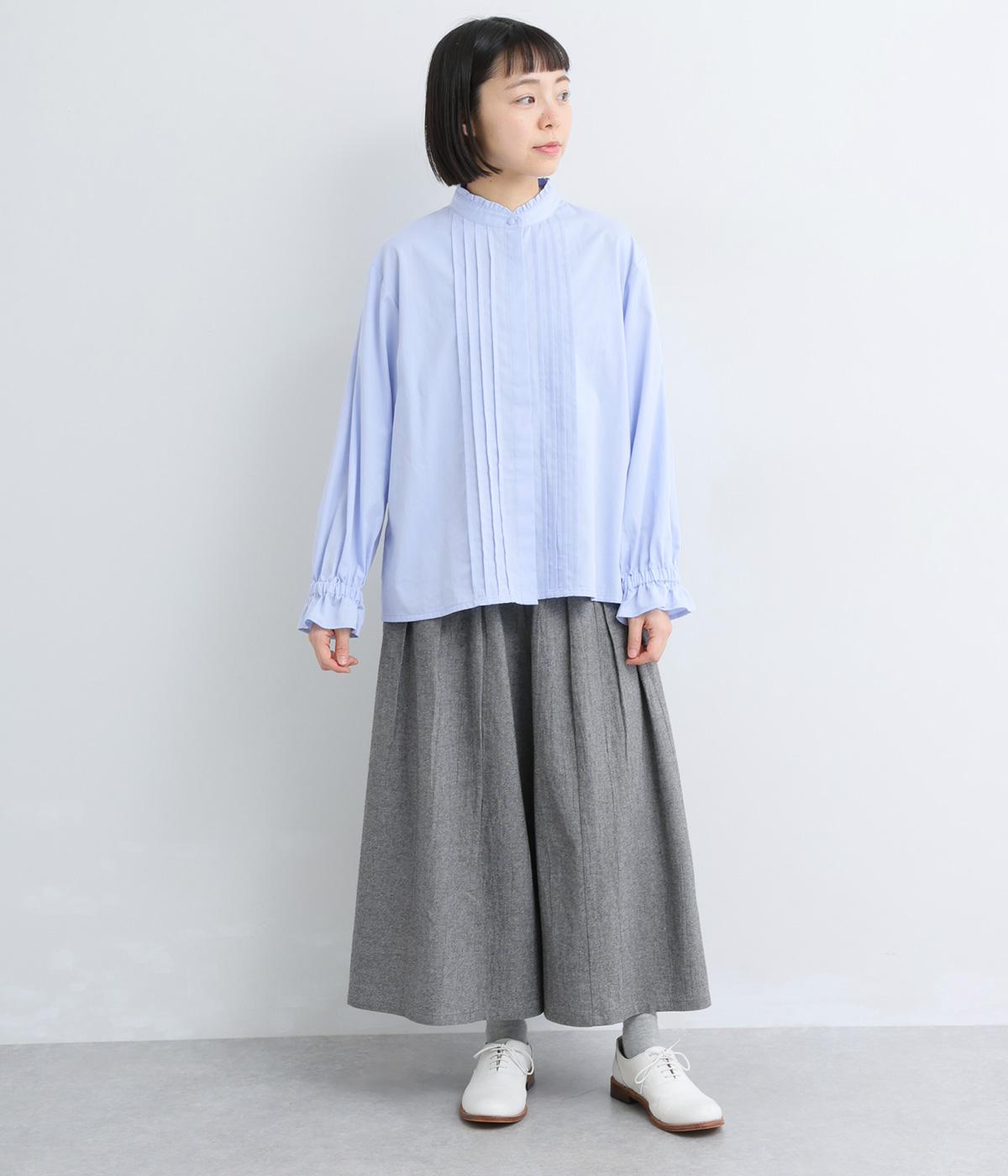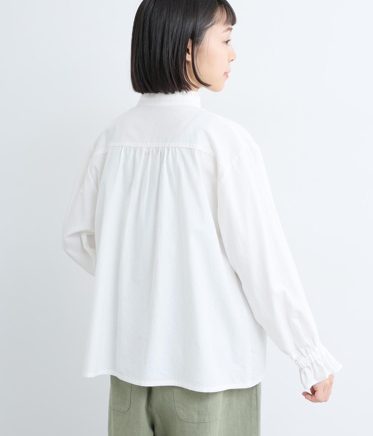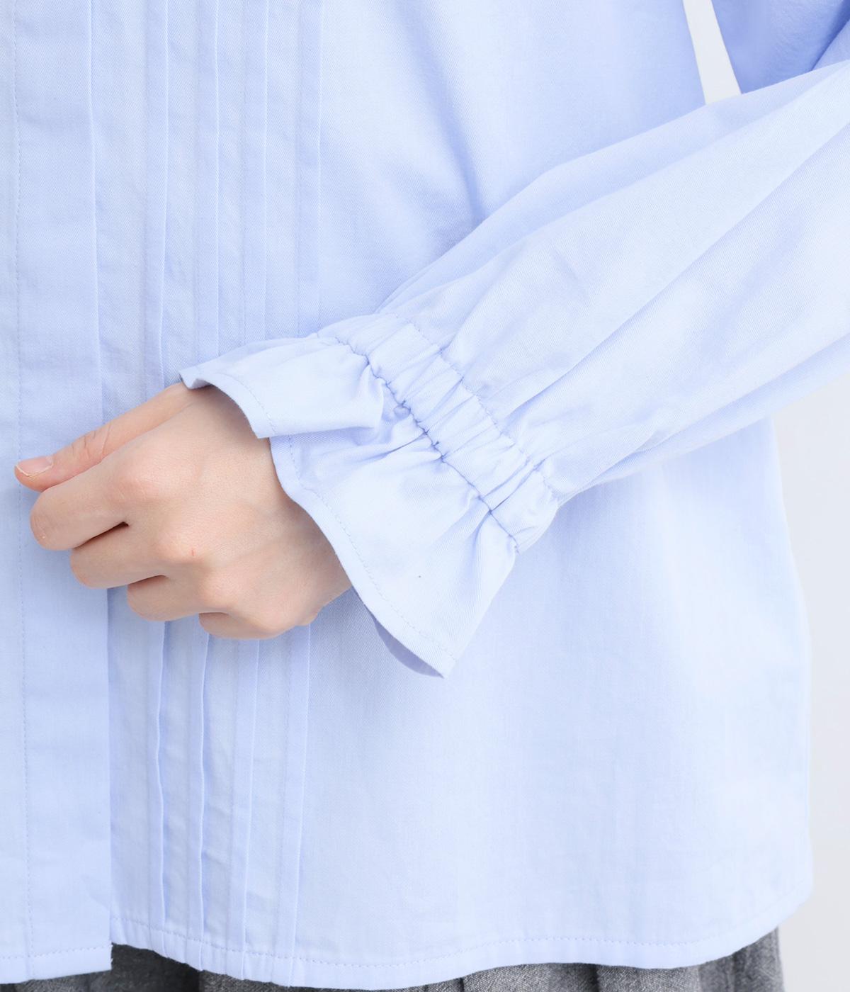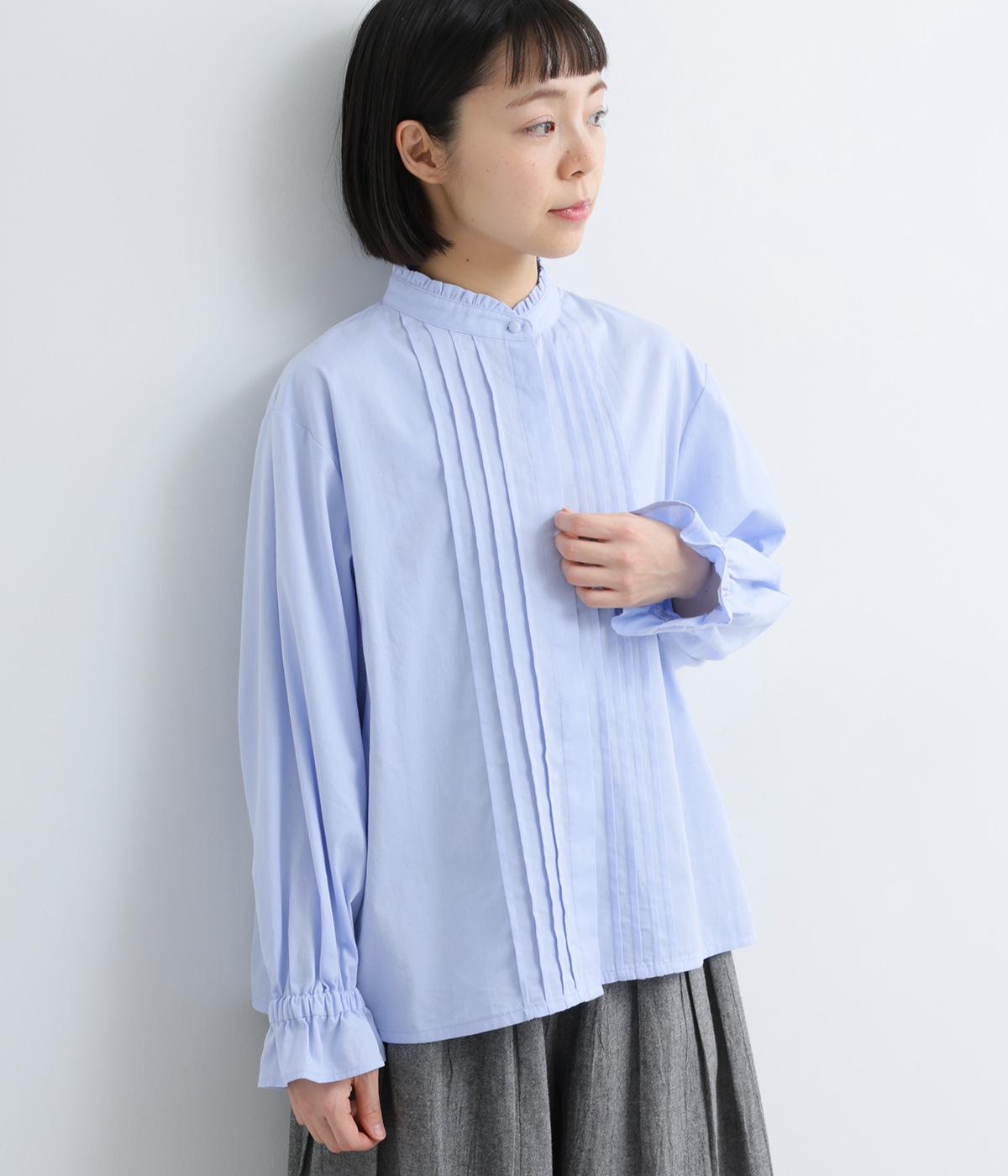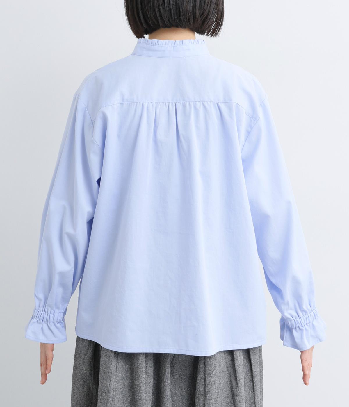 ちいさなフリルをあしらったスタンドネックが、顔まわりにやさしい華やぎを添える一枚。フロントにピンタックと比翼ボタンを施し、甘さをおさえた上品な佇まいに仕上げました。袖口にはボリューム感のあるフリルをあしらい、さりげないアクセントをプラスしています。ゴム仕様なので、着こなしをアレンジできるのも◎