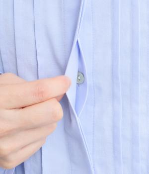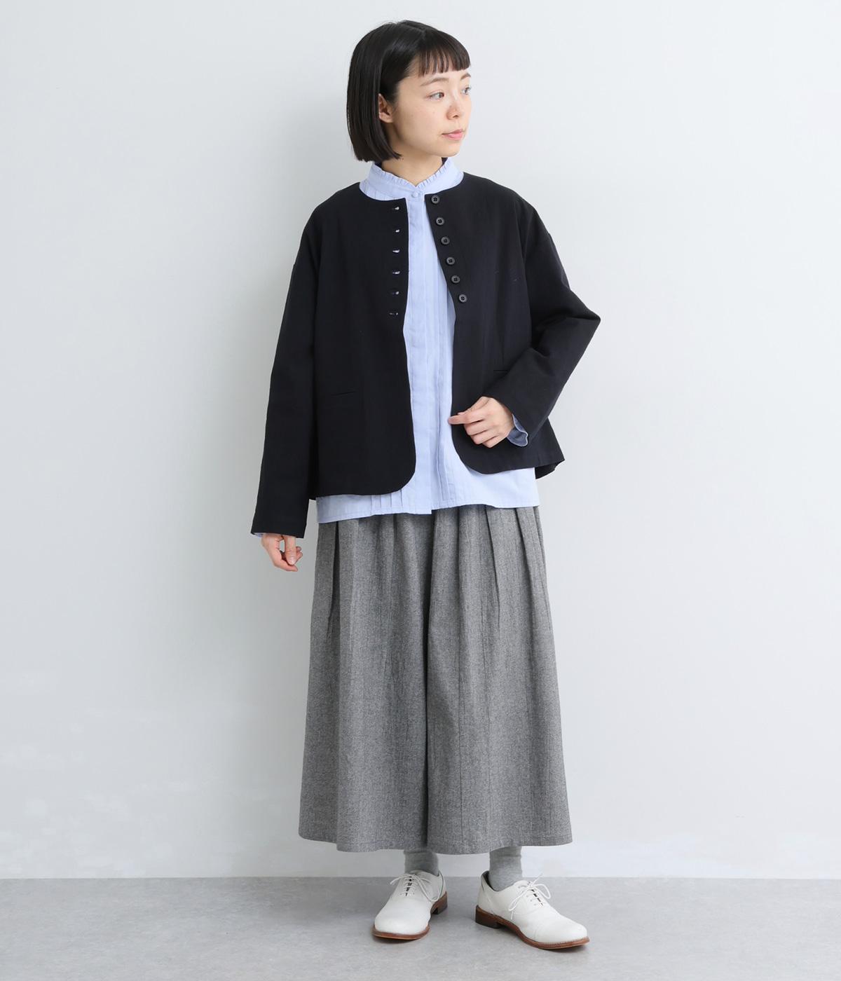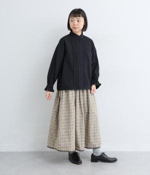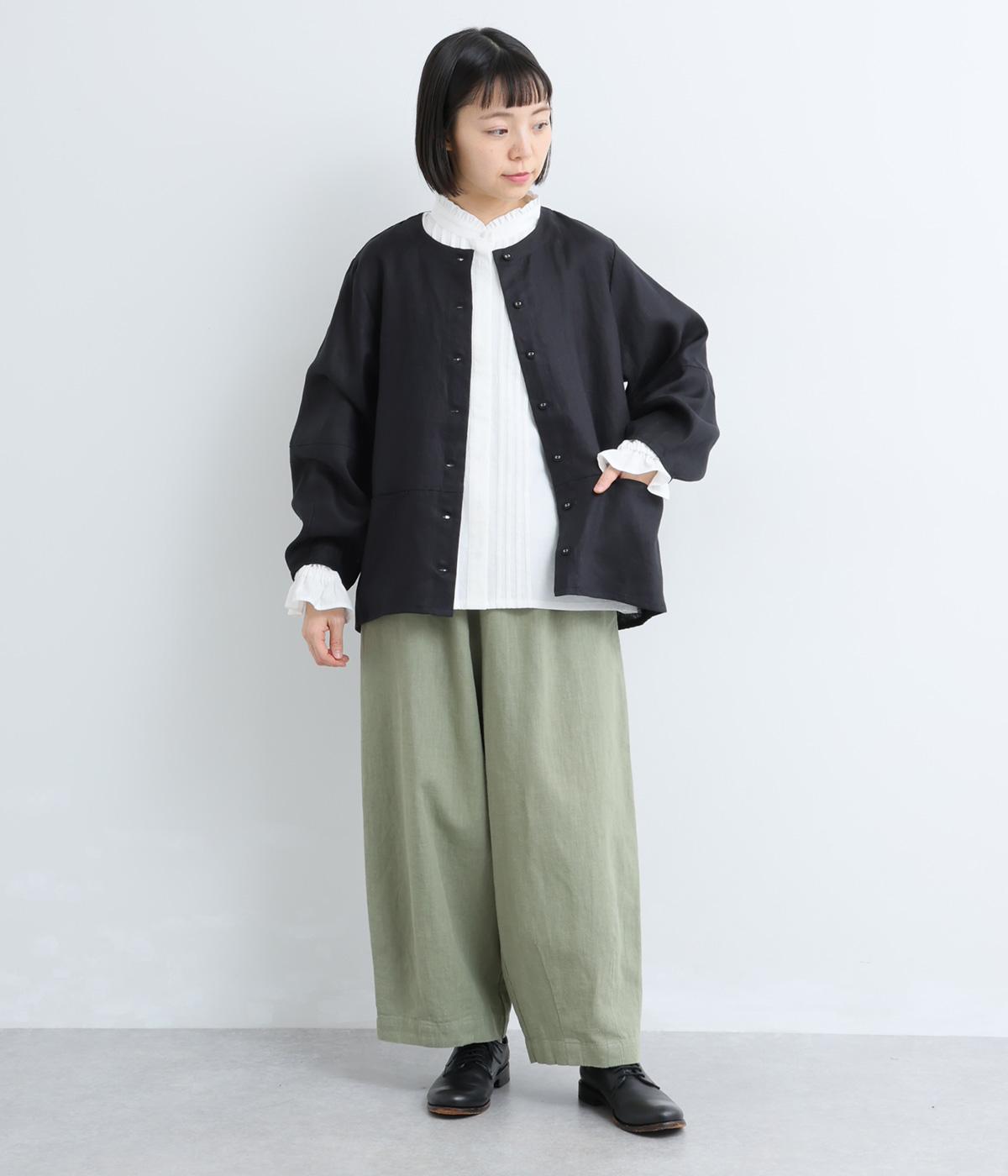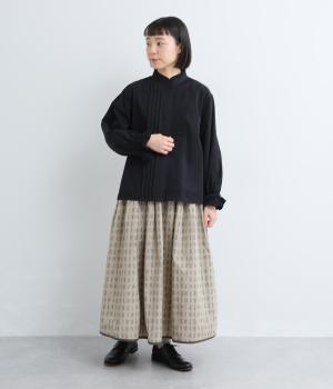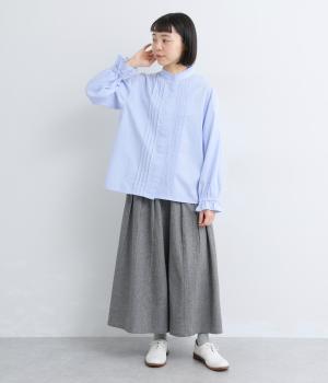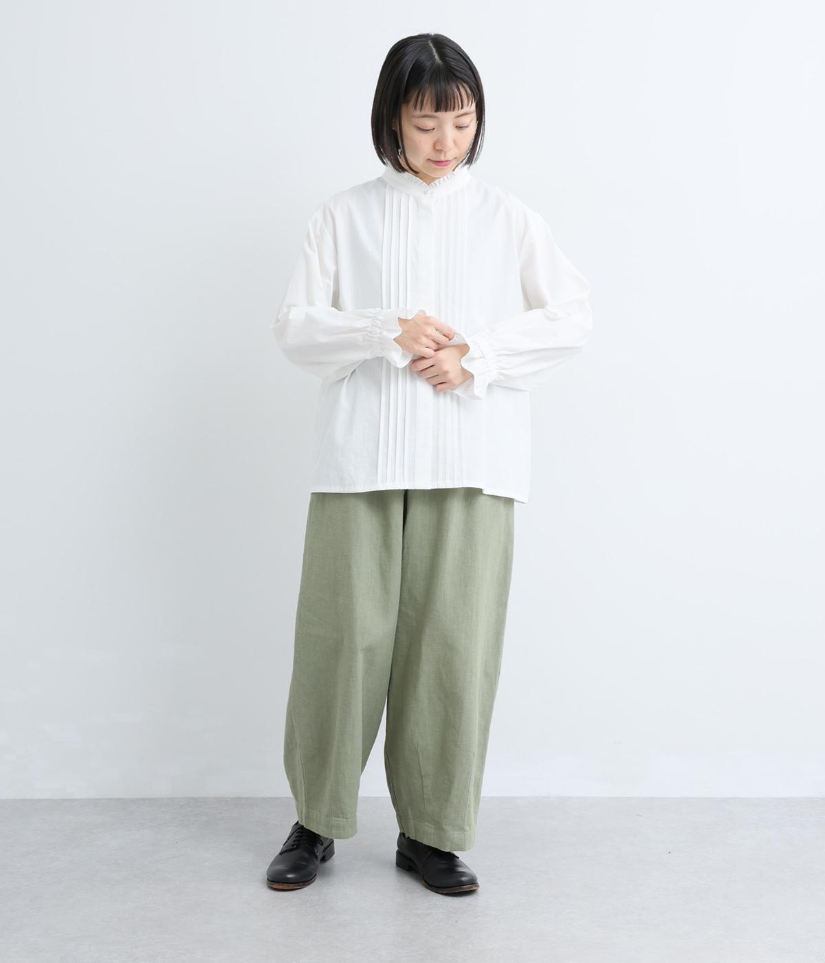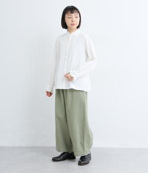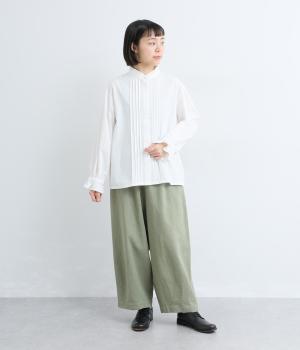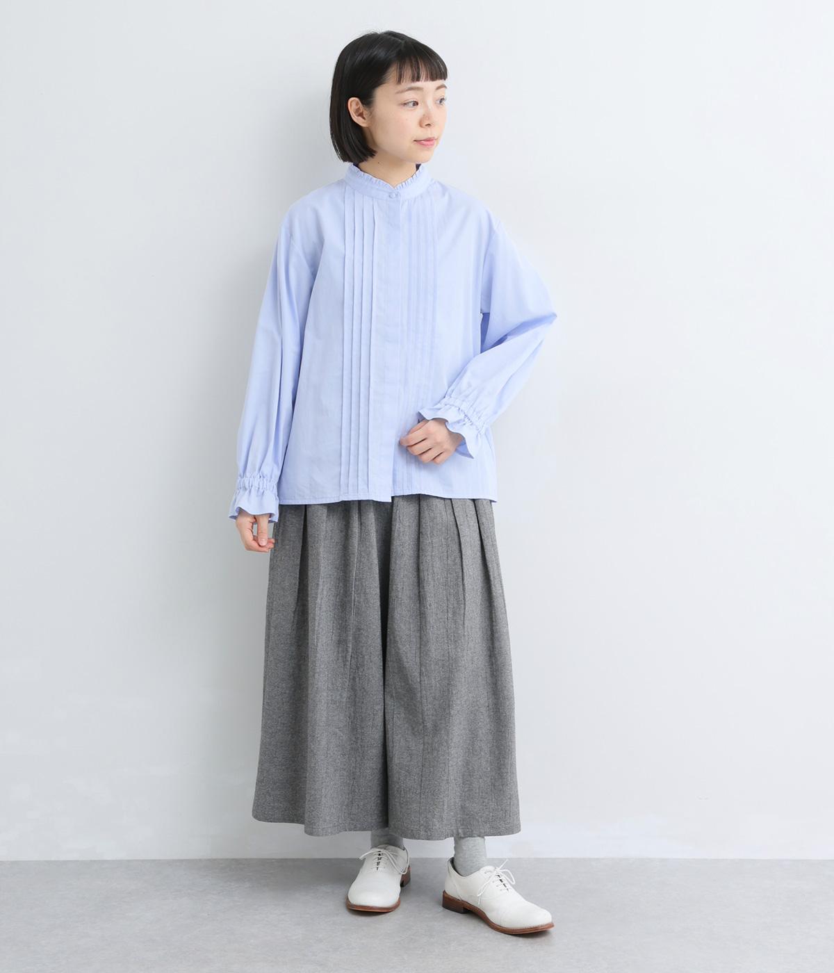 ちいさなフリルをあしらったスタンドネックが、顔まわりにやさしい華やぎを添える一枚。フロントにピンタックと比翼ボタンを施し、甘さをおさえた上品な佇まいに仕上げました。袖口にはボリューム感のあるフリルをあしらい、さりげないアクセントをプラスしています。ゴム仕様なので、着こなしをアレンジできるのも◎