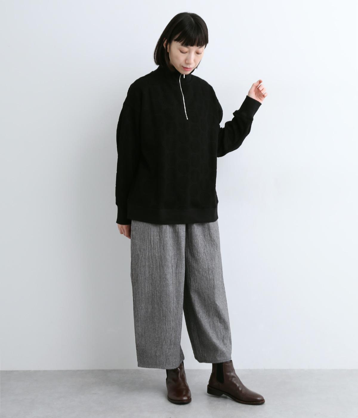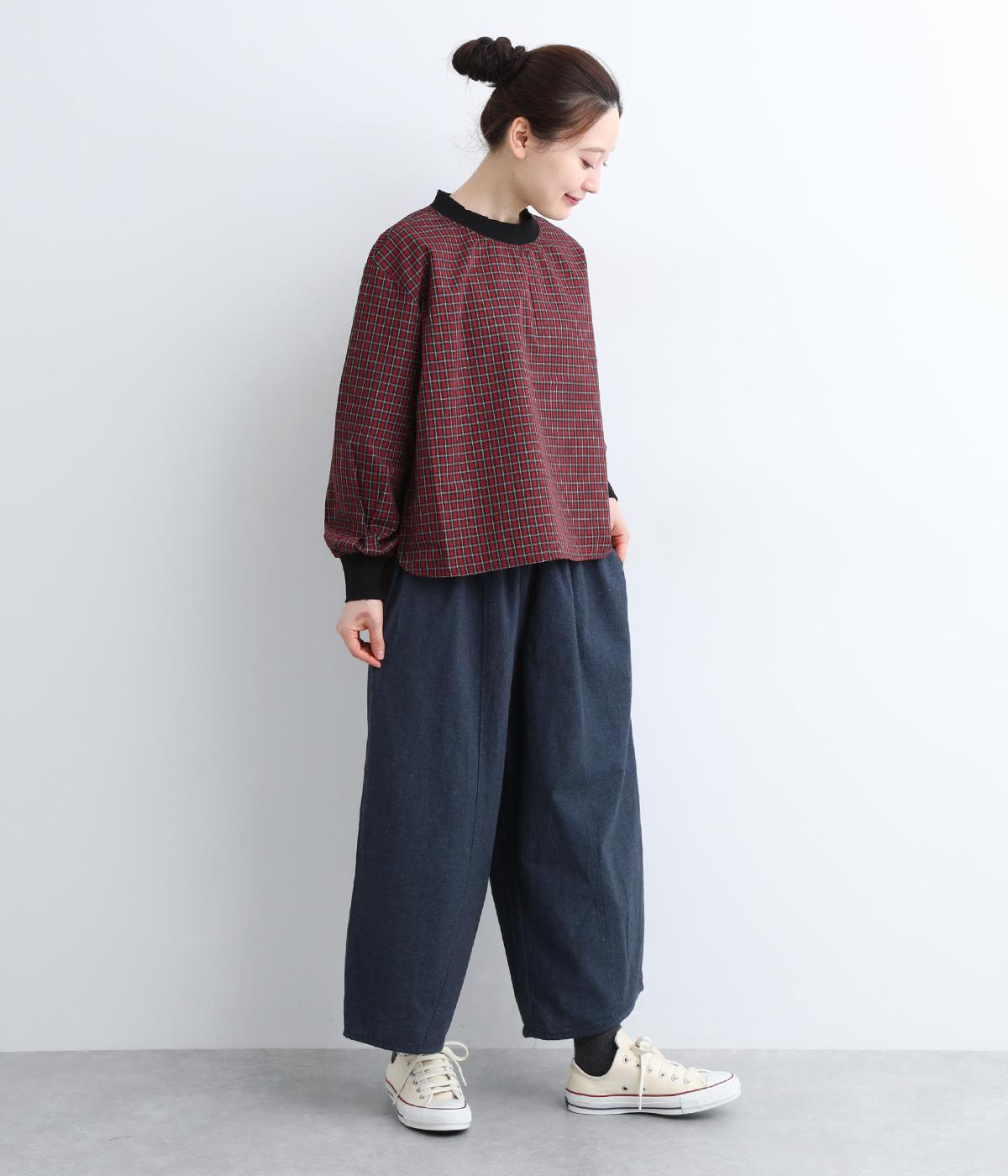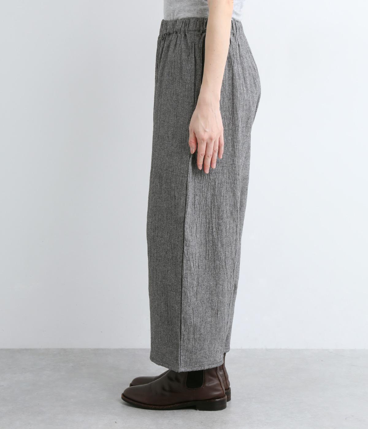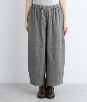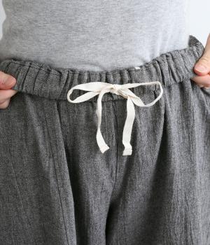 レッグラインを拾わない、太めなワイドシルエットがお洒落感を引き立ててくれます。ソックスを合わせたいやや短め丈だから、好きな色柄のソックスを忍ばせて自分好みに楽しめます。ウエストは総ゴム仕様で、内側の紐で調節も可能です。