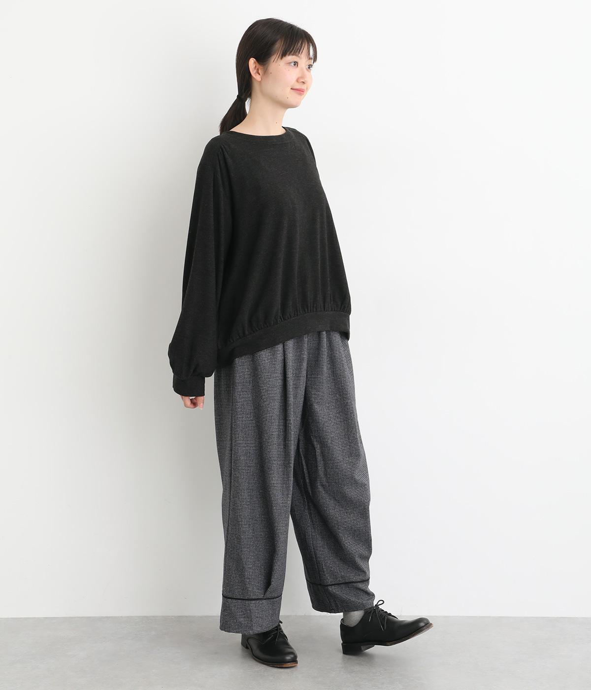 前ウエスト下と裾に繋がるようなタックを施し、ドレープを映えさせたパンツ。ワイドシルエットが体のラインをカバーしながら、こなれたムードを運びます。裾の切り替えラインとパイピングがアクセントに。ウエストにはゴムと紐をぐるりと通し、フィット感を高めました。