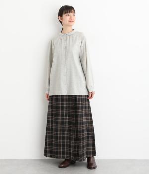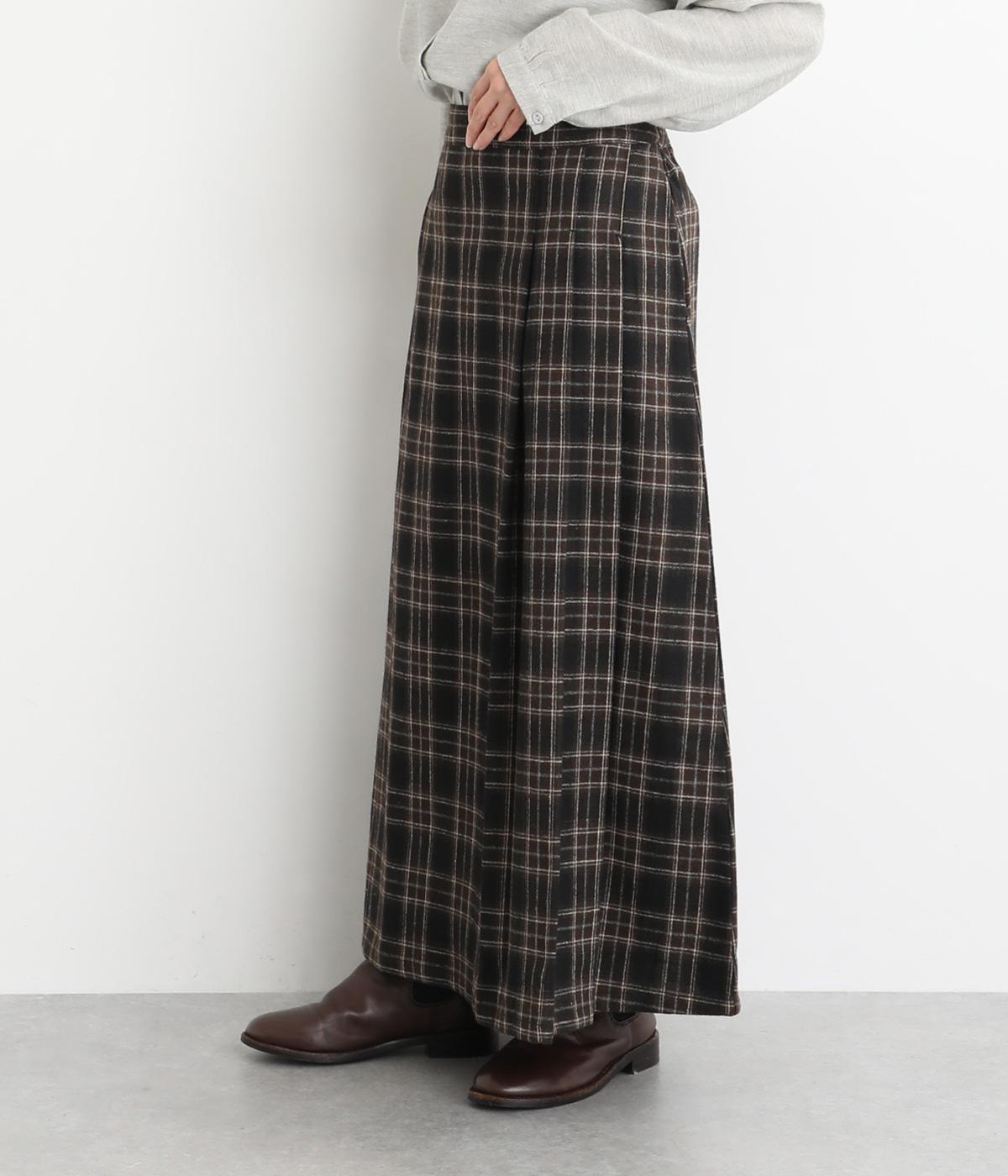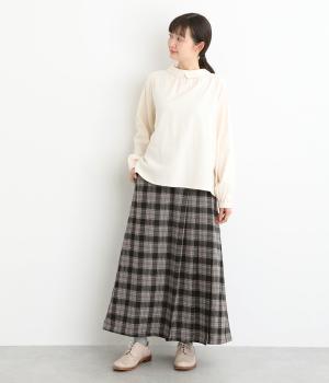 フロント左側にタックをほどこし、アシンメトリーな動きを出したスカート。ボリュームをおさえたAラインのシルエットが、カジュアルなチェック柄を大人っぽく見せてくれます。後ろウエストにはゴムを通し、フックとファスナーで着脱も簡単です。