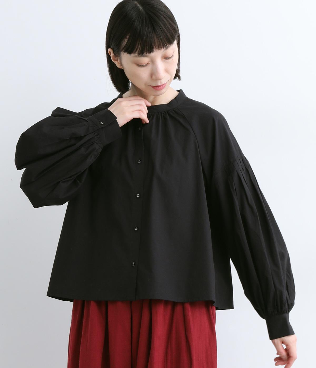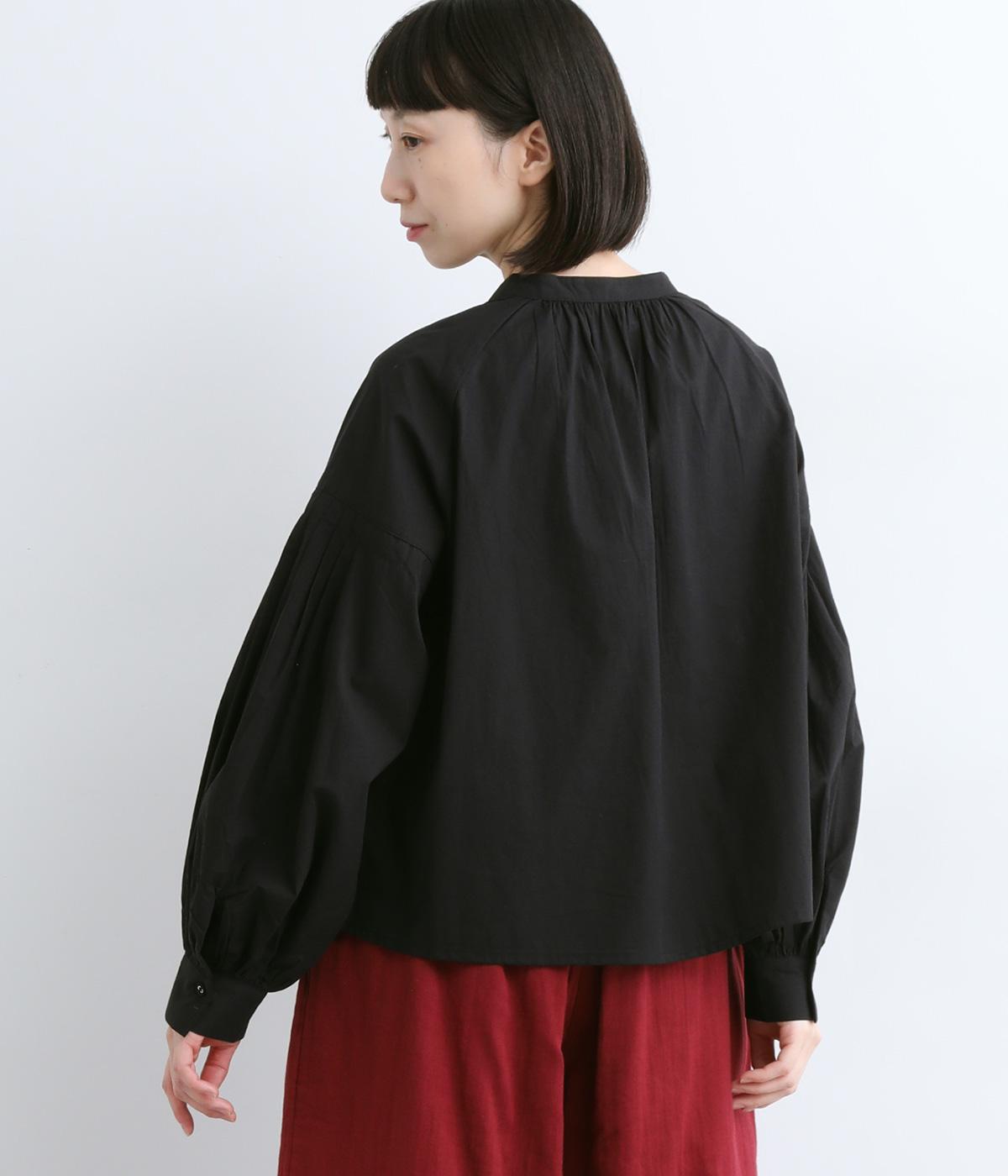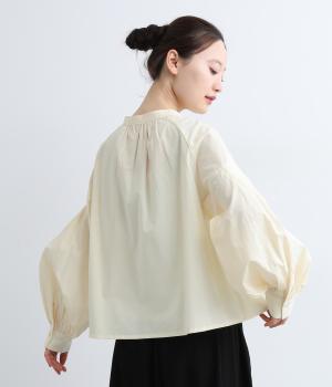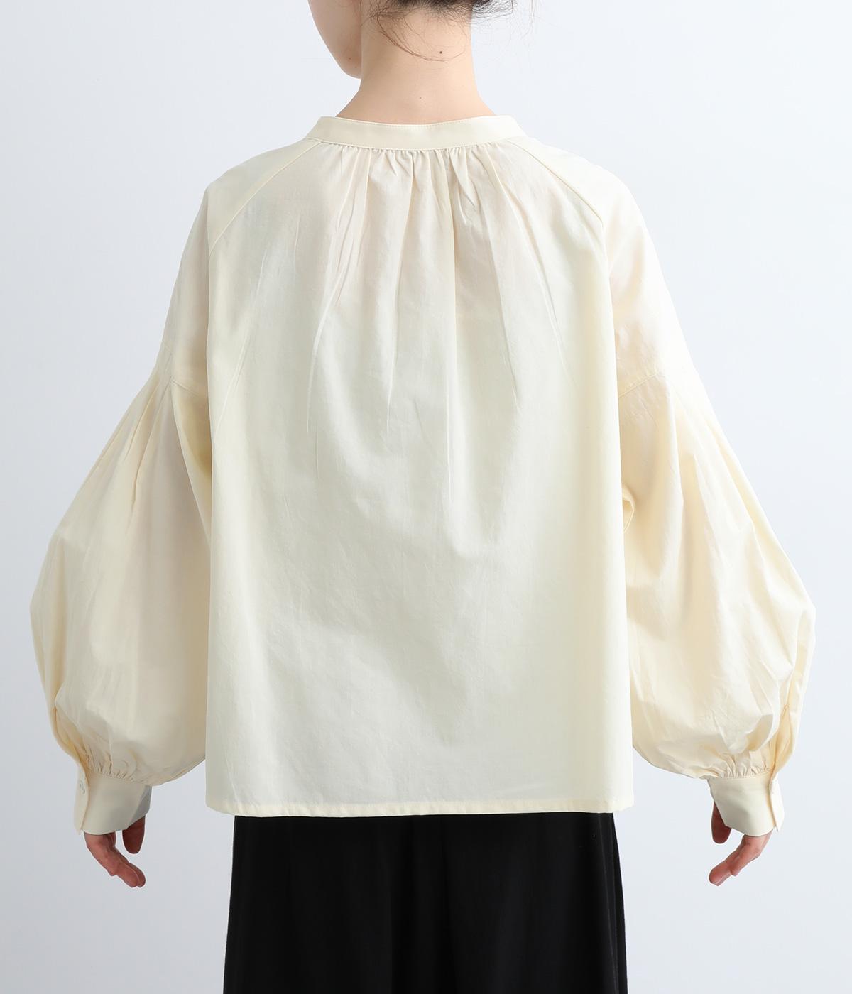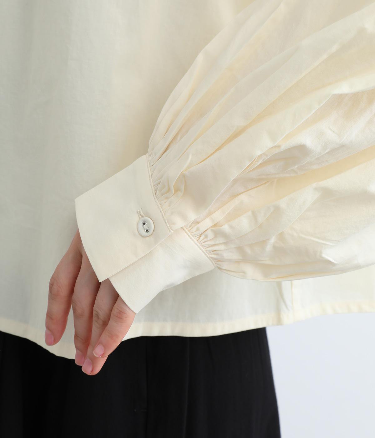 二の腕からふっくらと広がるバルーンスリーブが、フェミニンな愛らしさを引き立てるレディなブラウス。端正なスタンドカラーに対して、背面にはギャザーをたっぷりと施しふわりと優しく包み込んでくれます。体のラインを拾わず、着映えが叶う嬉しい一枚です。