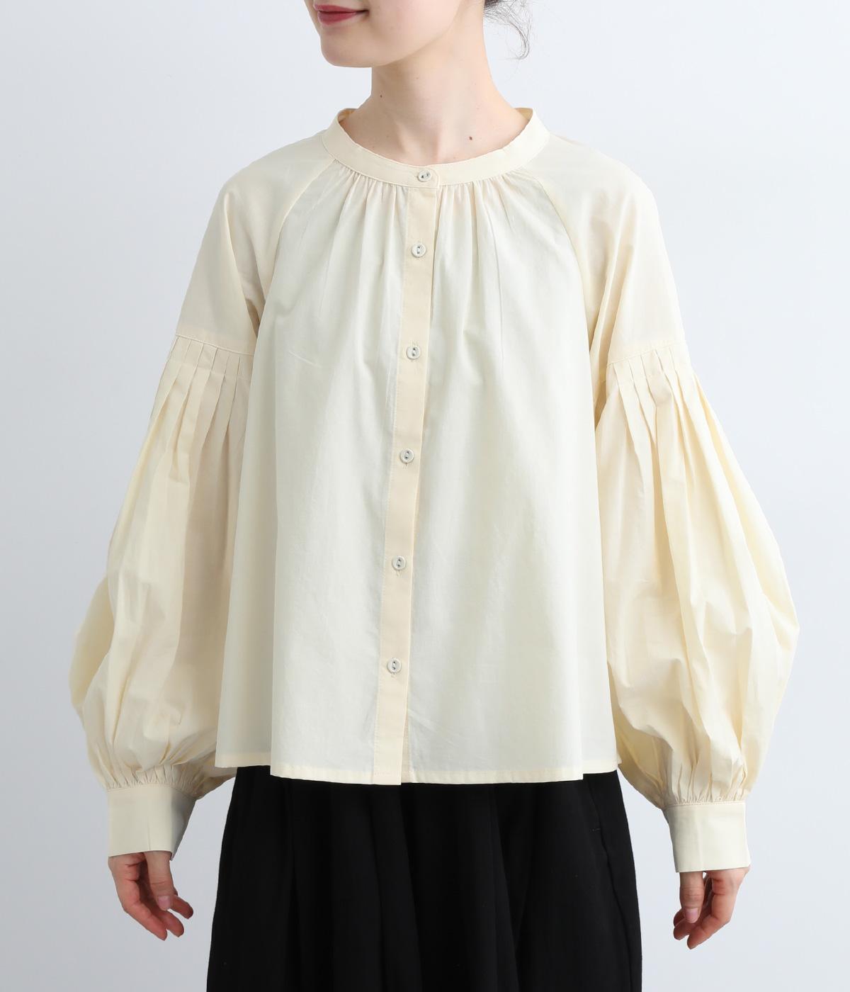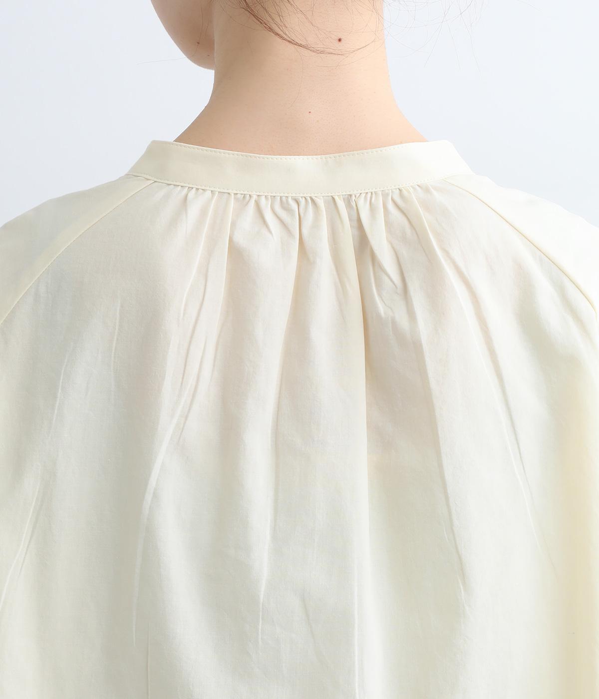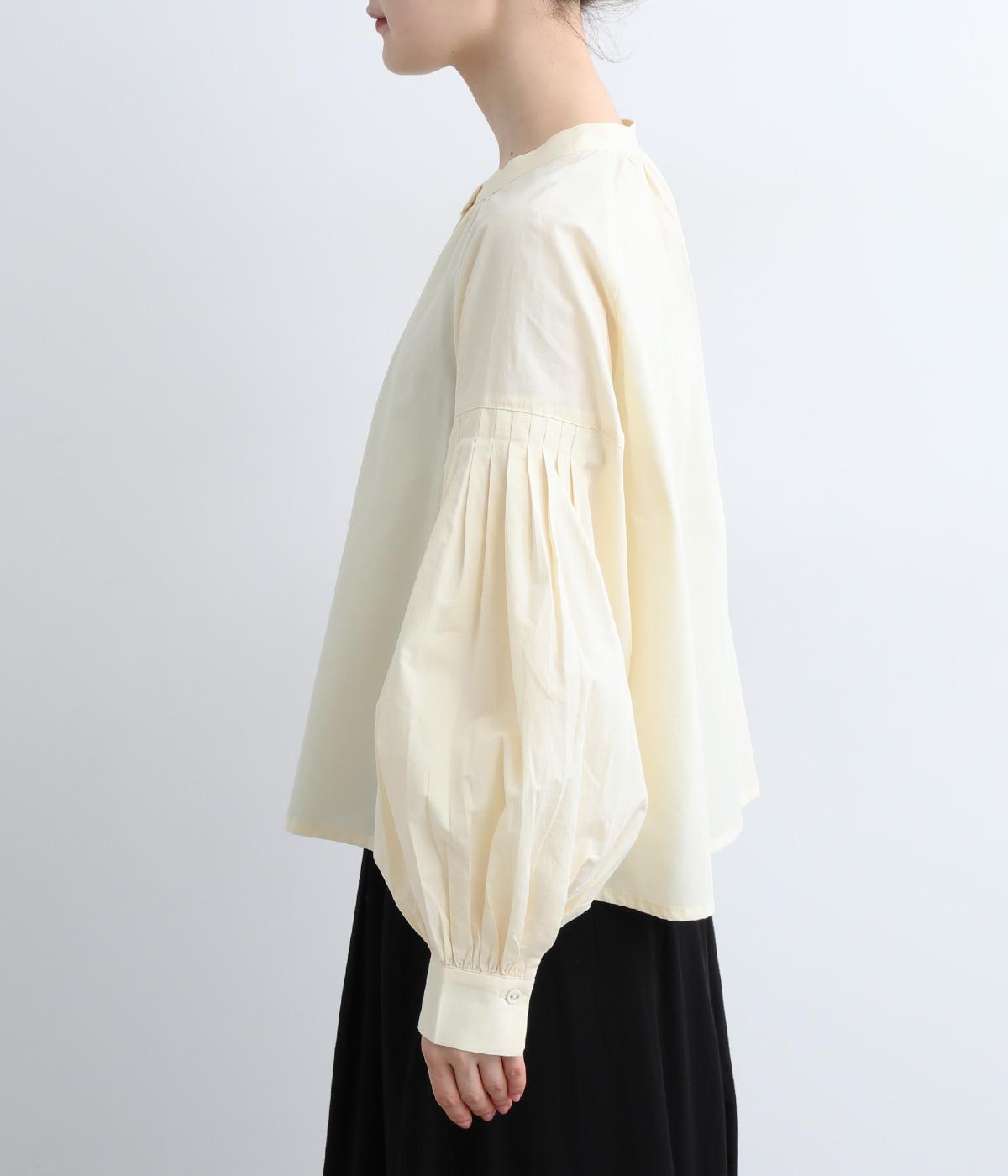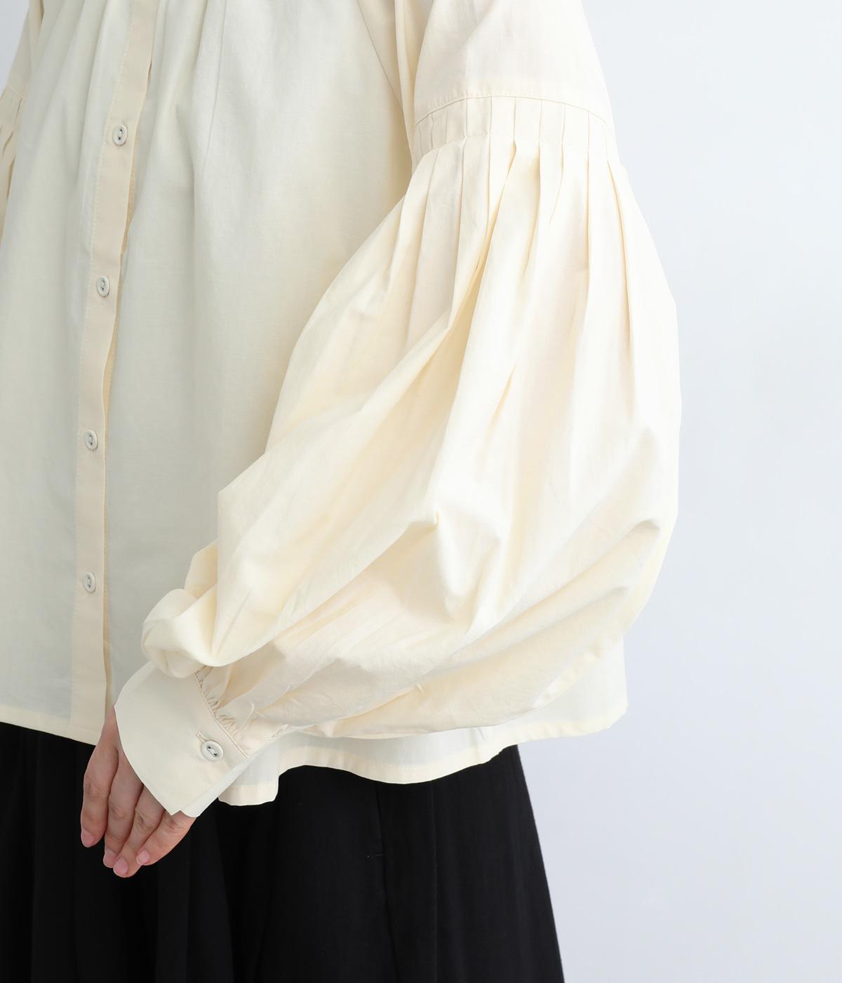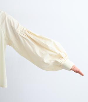 二の腕からふっくらと広がるバルーンスリーブが、フェミニンな愛らしさを引き立てるレディなブラウス。端正なスタンドカラーに対して、背面にはギャザーをたっぷりと施しふわりと優しく包み込んでくれます。体のラインを拾わず、着映えが叶う嬉しい一枚です。