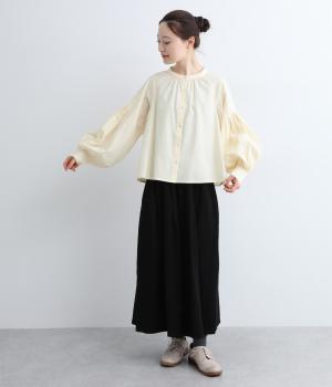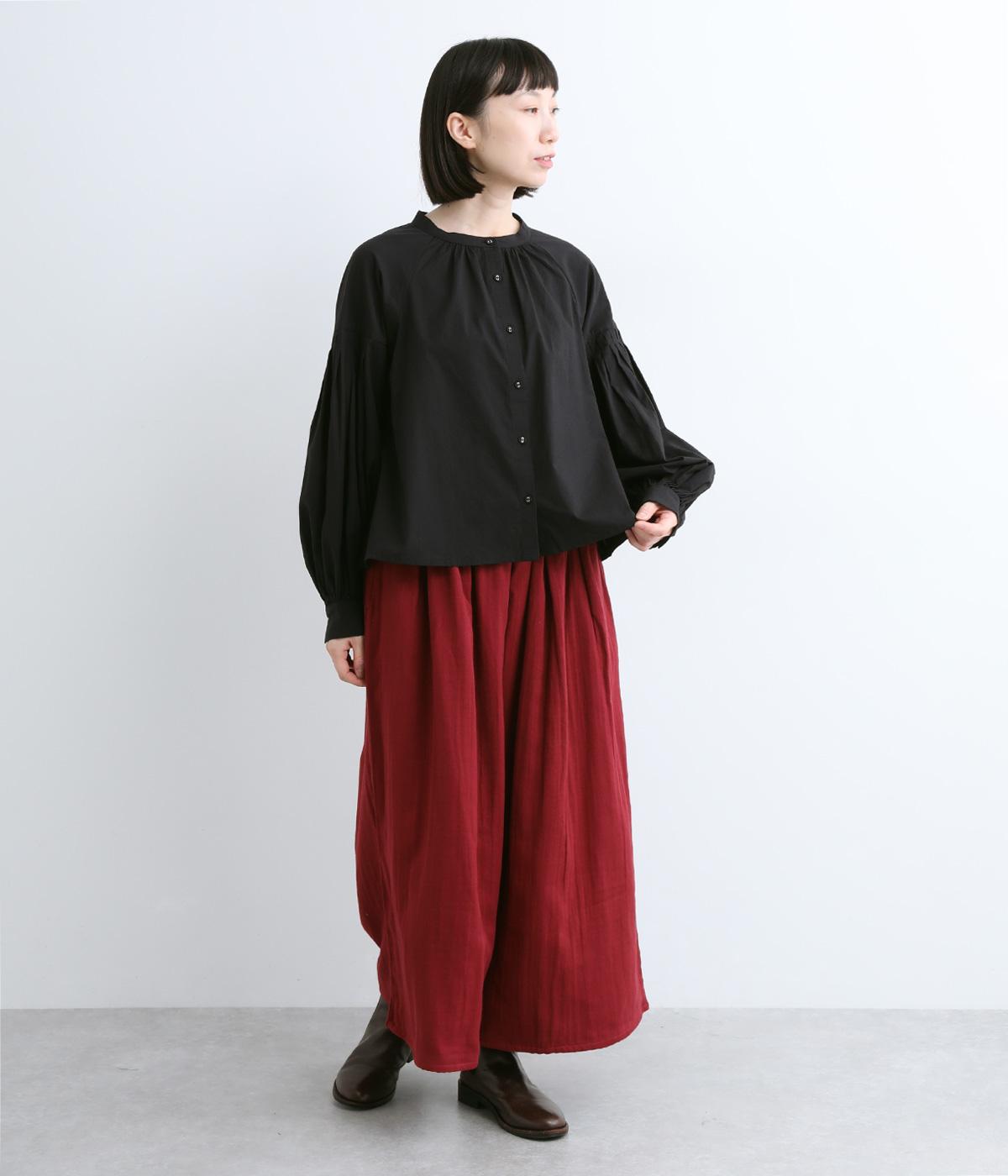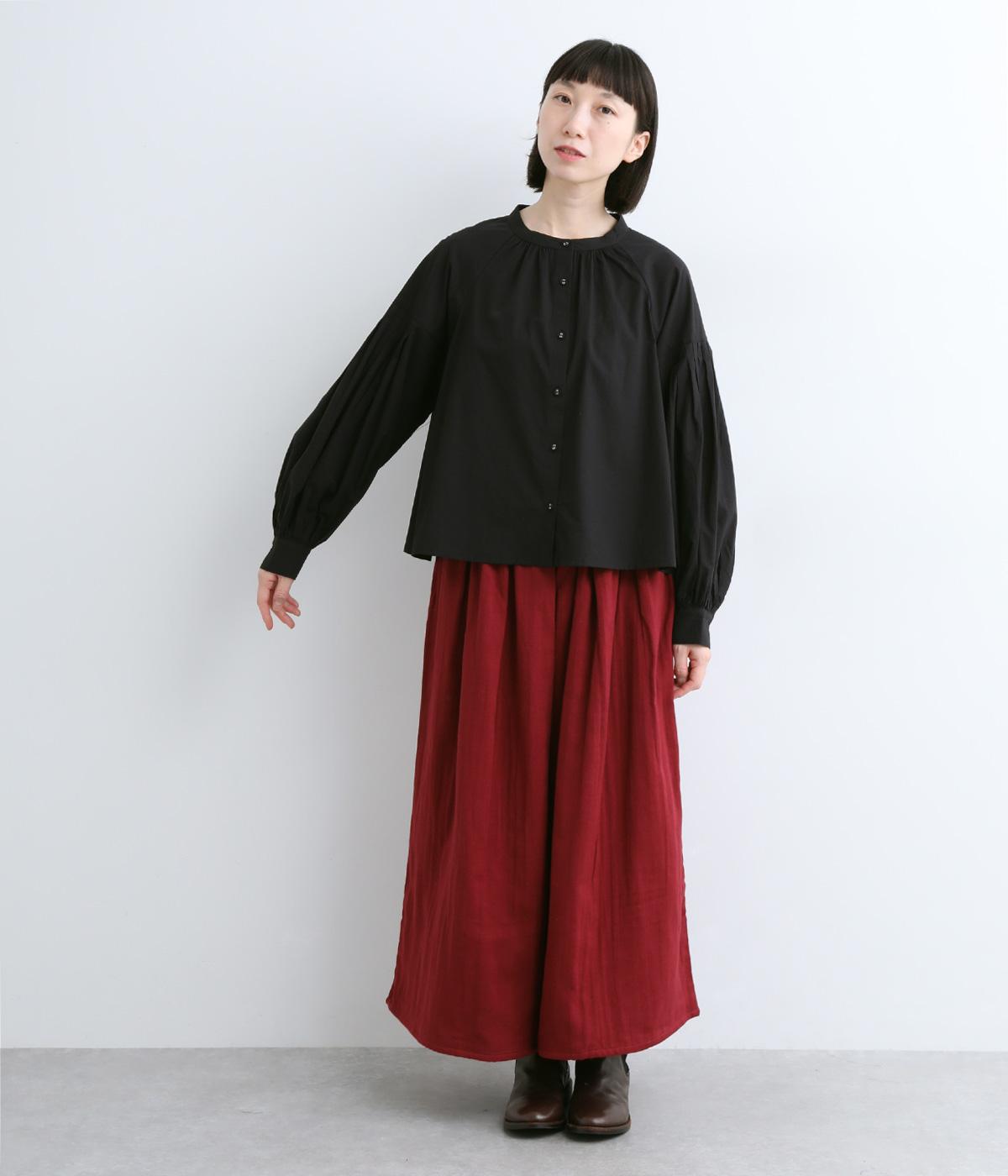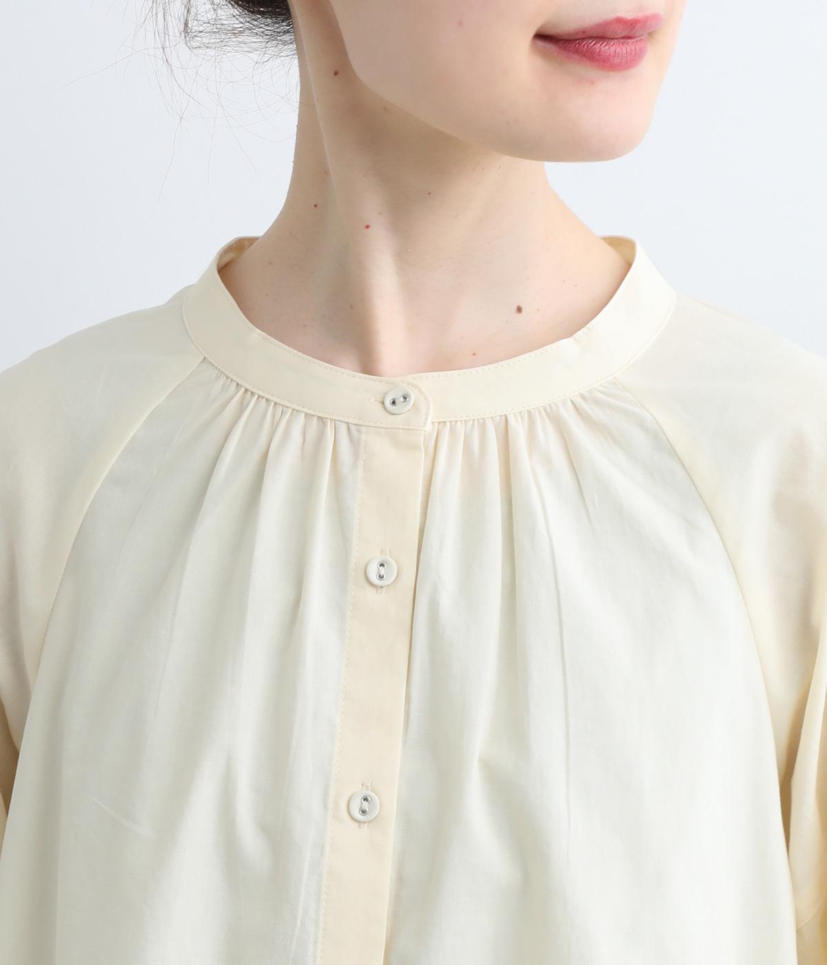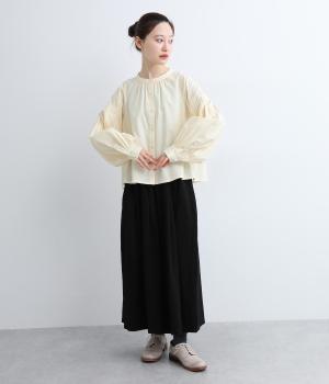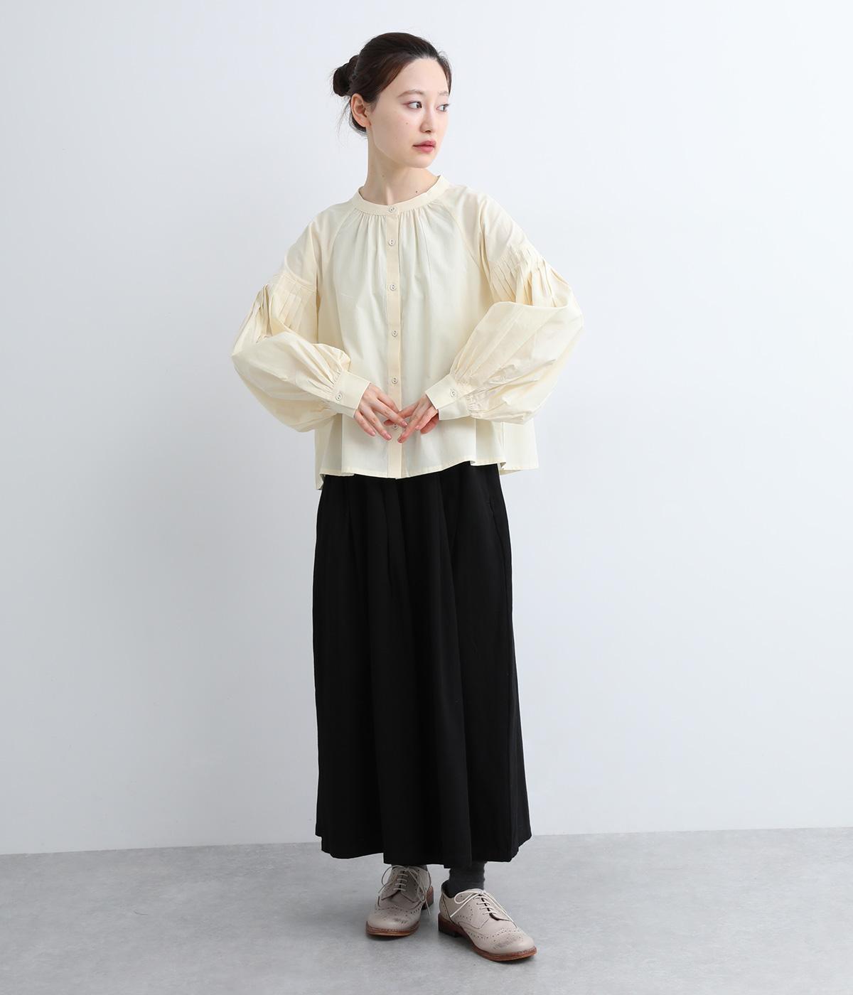 二の腕からふっくらと広がるバルーンスリーブが、フェミニンな愛らしさを引き立てるレディなブラウス。端正なスタンドカラーに対して、背面にはギャザーをたっぷりと施しふわりと優しく包み込んでくれます。体のラインを拾わず、着映えが叶う嬉しい一枚です。