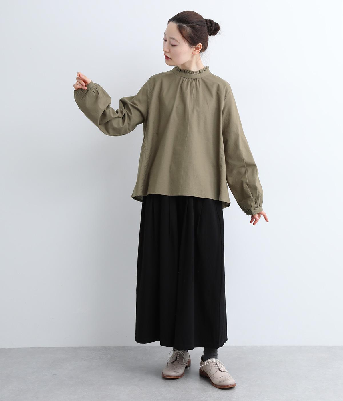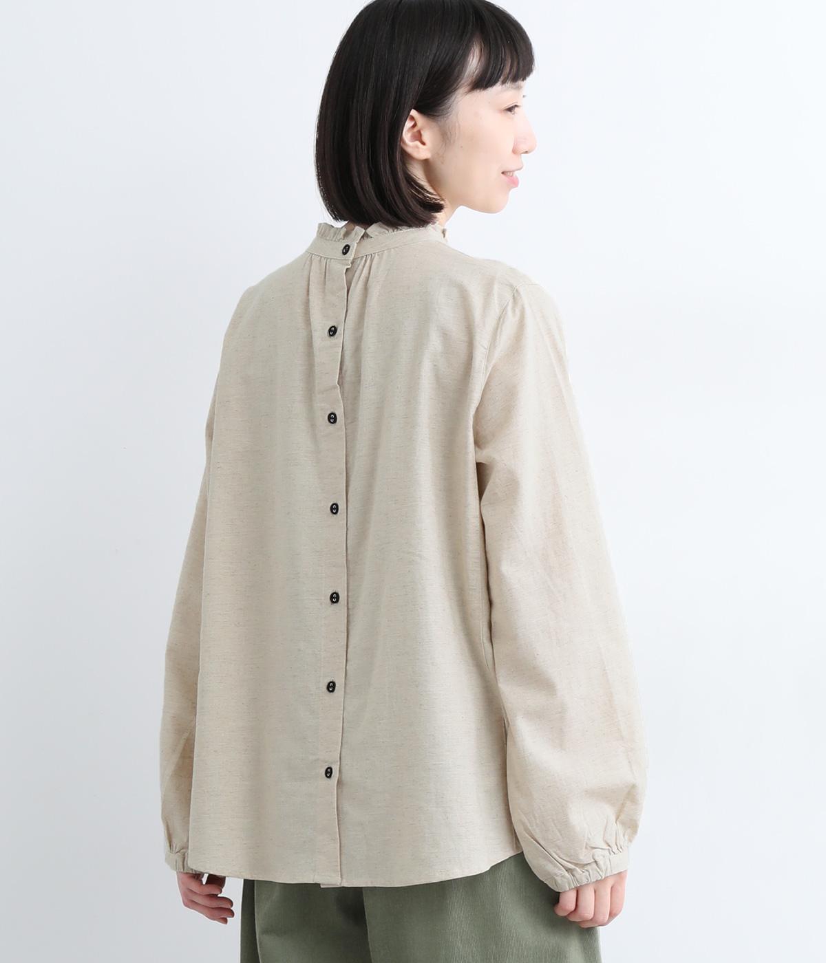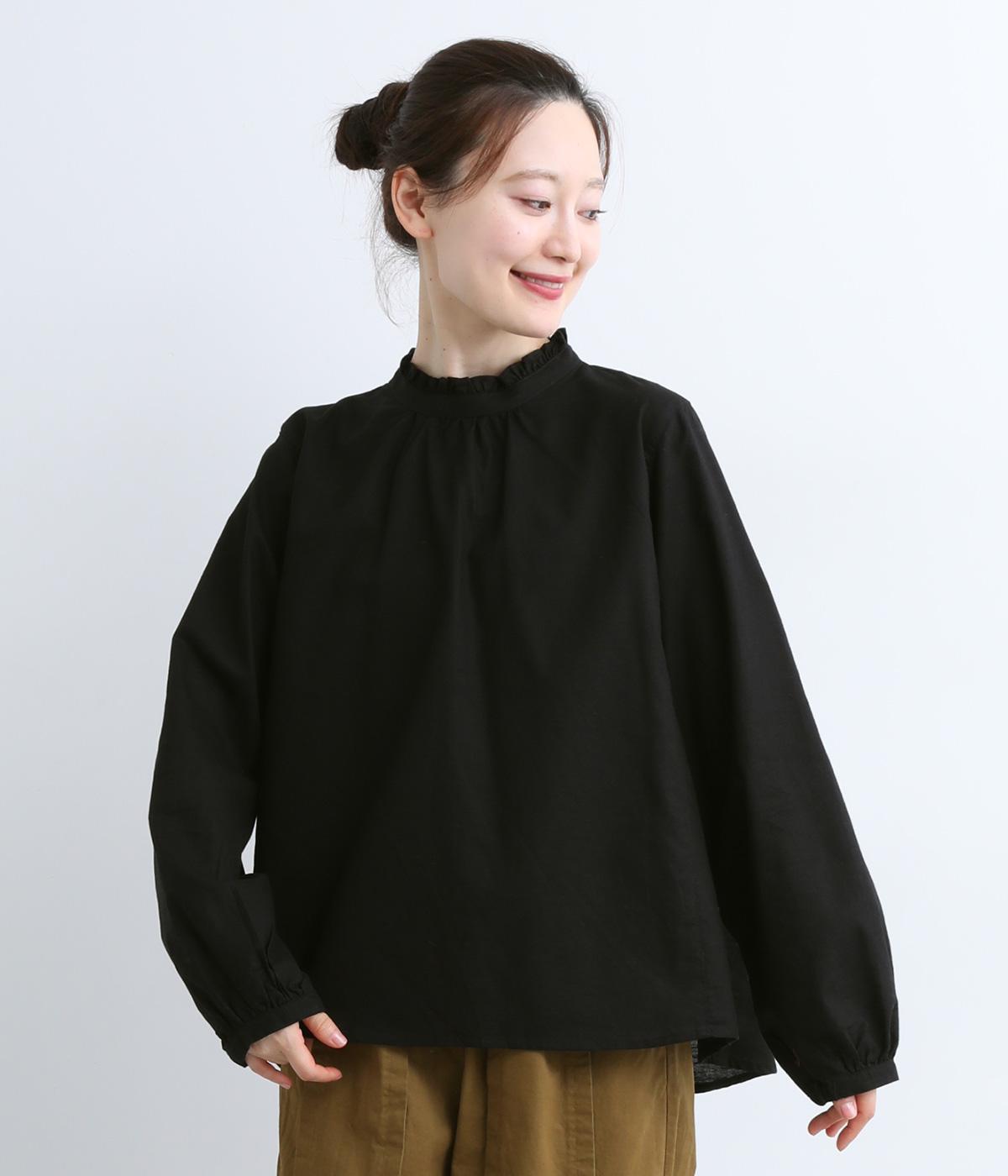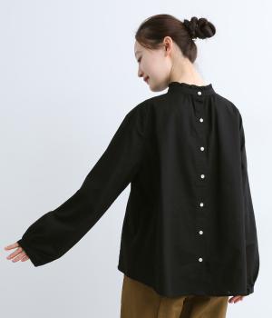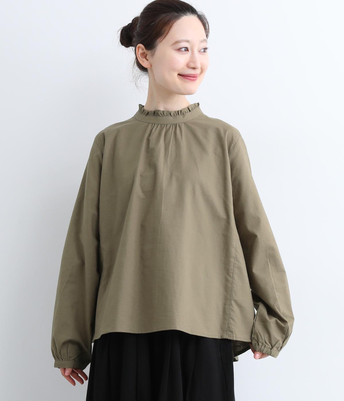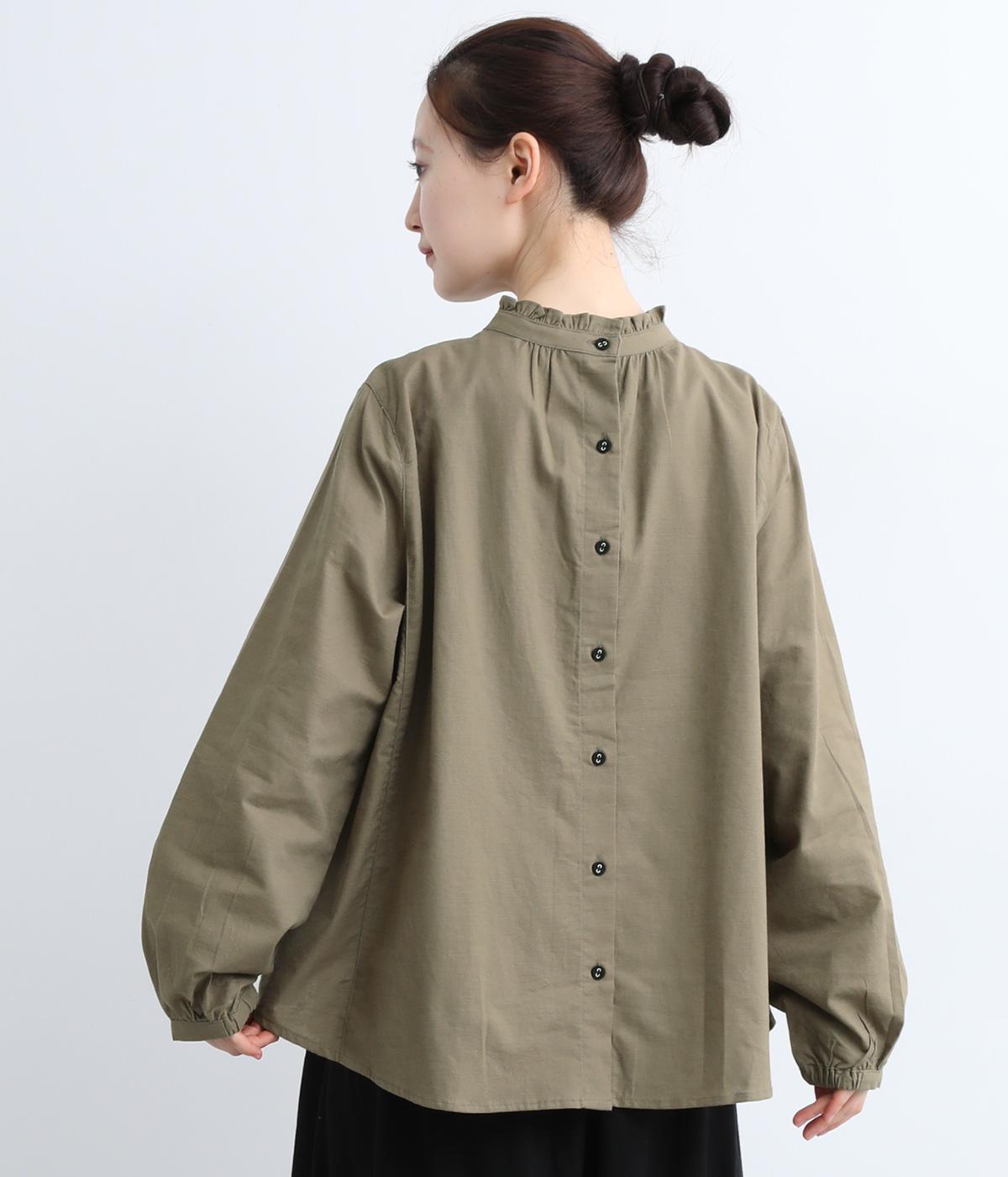 ゆとりのある身幅で着心地のいいワイドブラウスは、小ぶりなフリルのスタンドカラーで顔まわりがすっきり見えるように仕上げ。背面には配色ボタンをあしらい、後ろ姿でもお洒落を演出。ふわっと広がる裾が、女性らしいゆとりを演出してくれます。