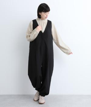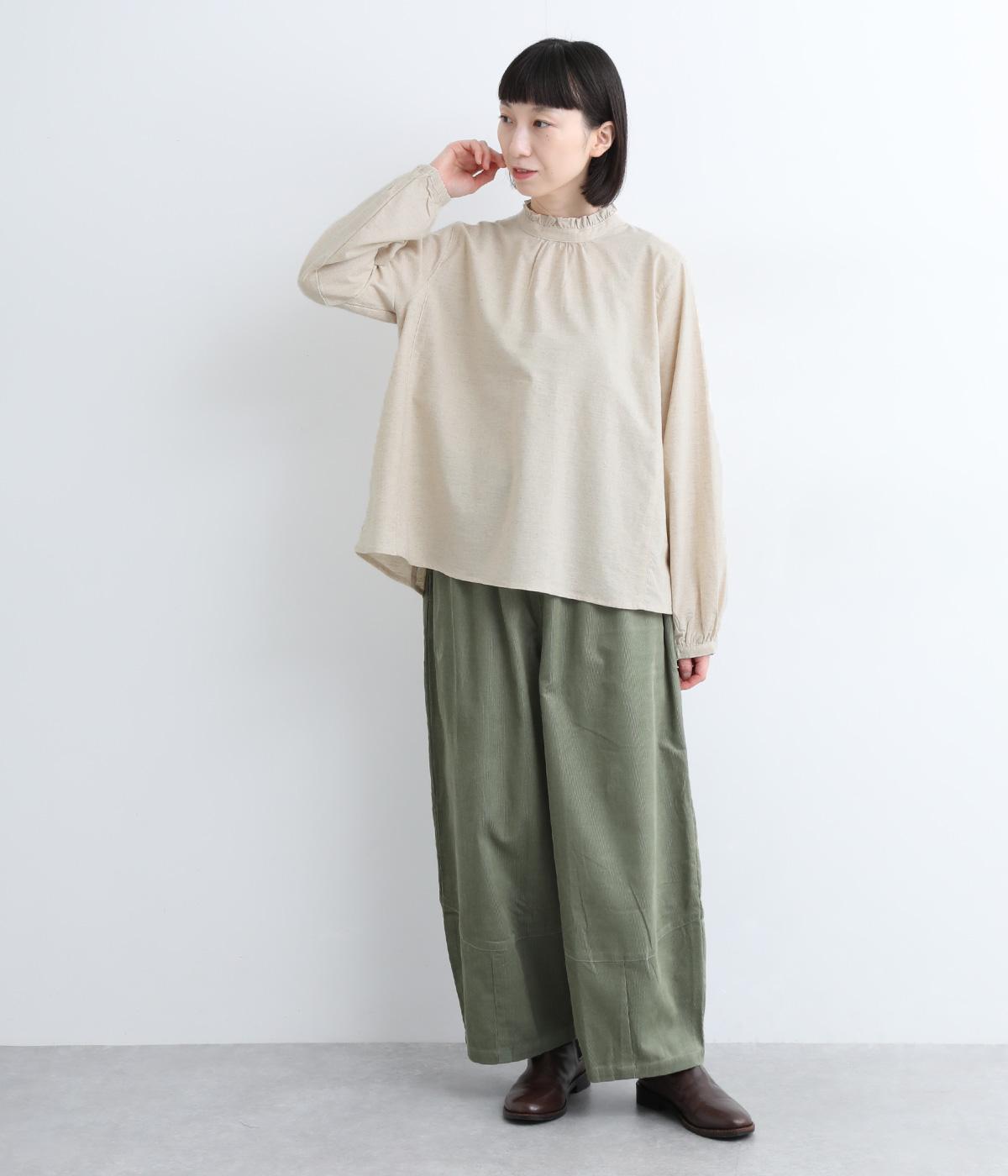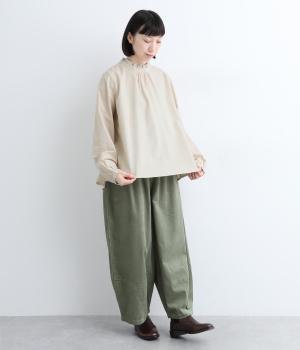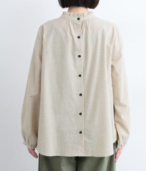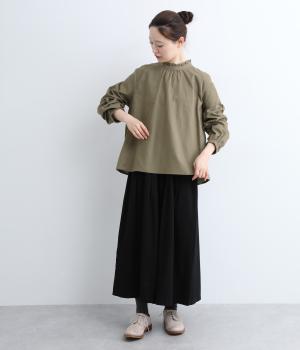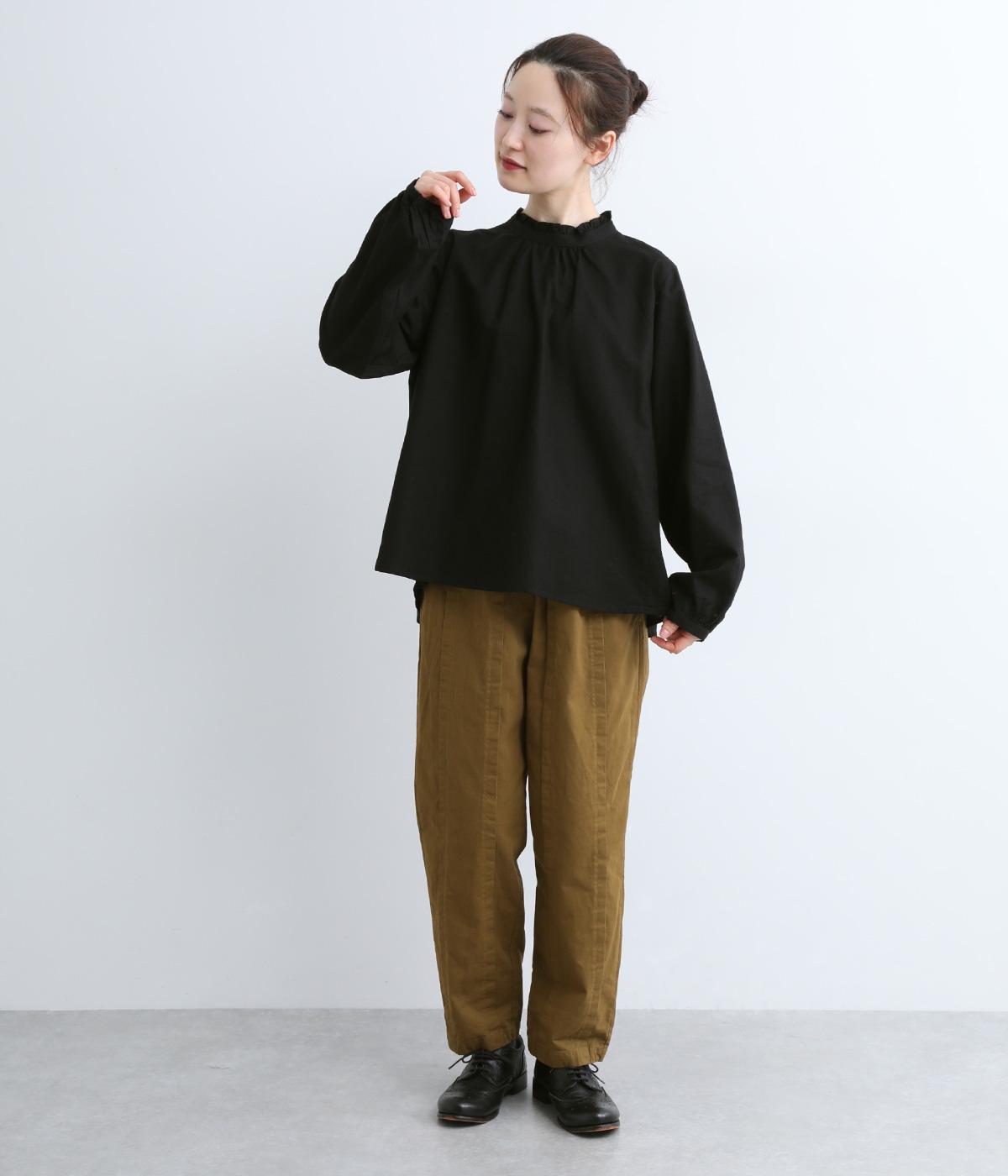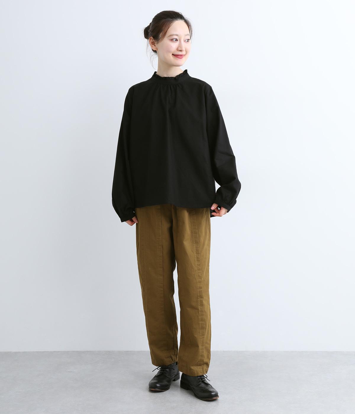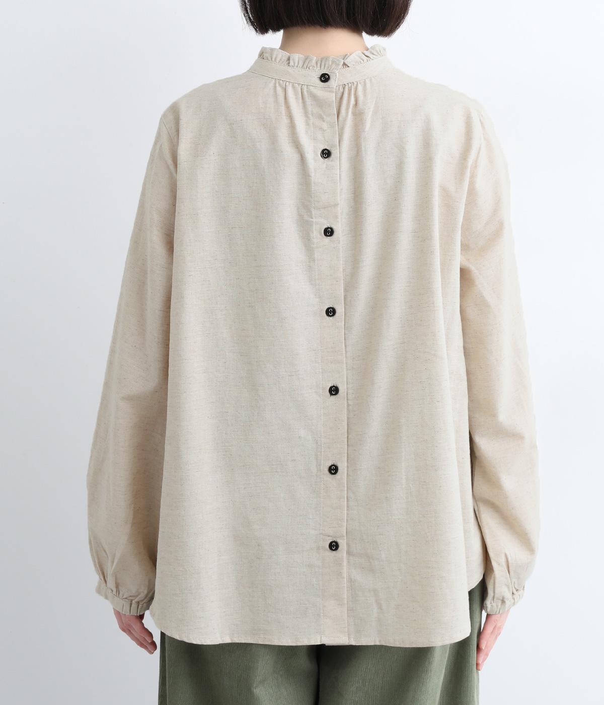 ゆとりのある身幅で着心地のいいワイドブラウスは、小ぶりなフリルのスタンドカラーで顔まわりがすっきり見えるように仕上げ。背面には配色ボタンをあしらい、後ろ姿でもお洒落を演出。ふわっと広がる裾が、女性らしいゆとりを演出してくれます。