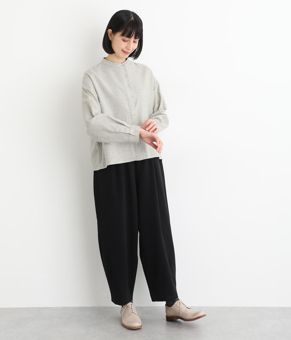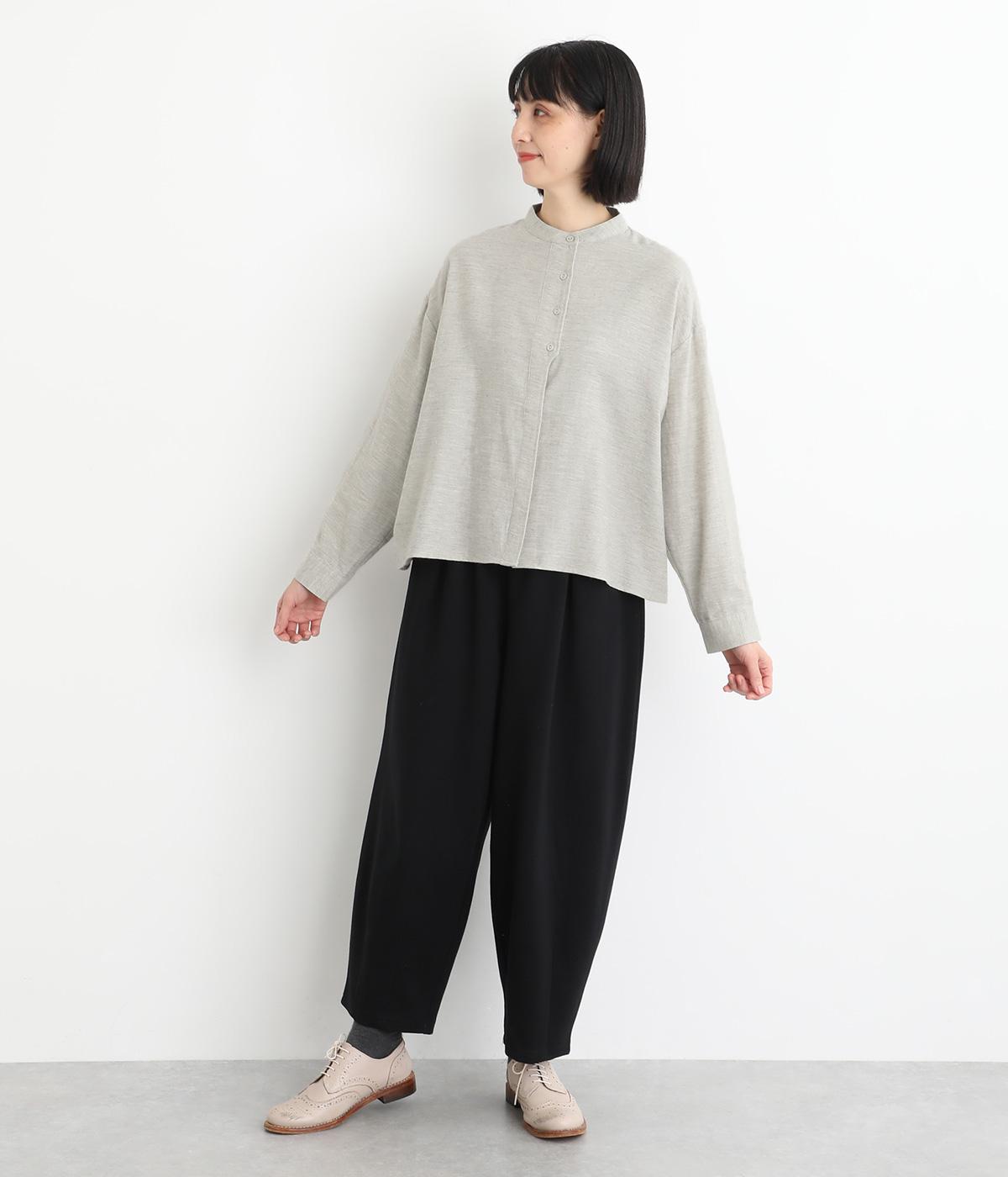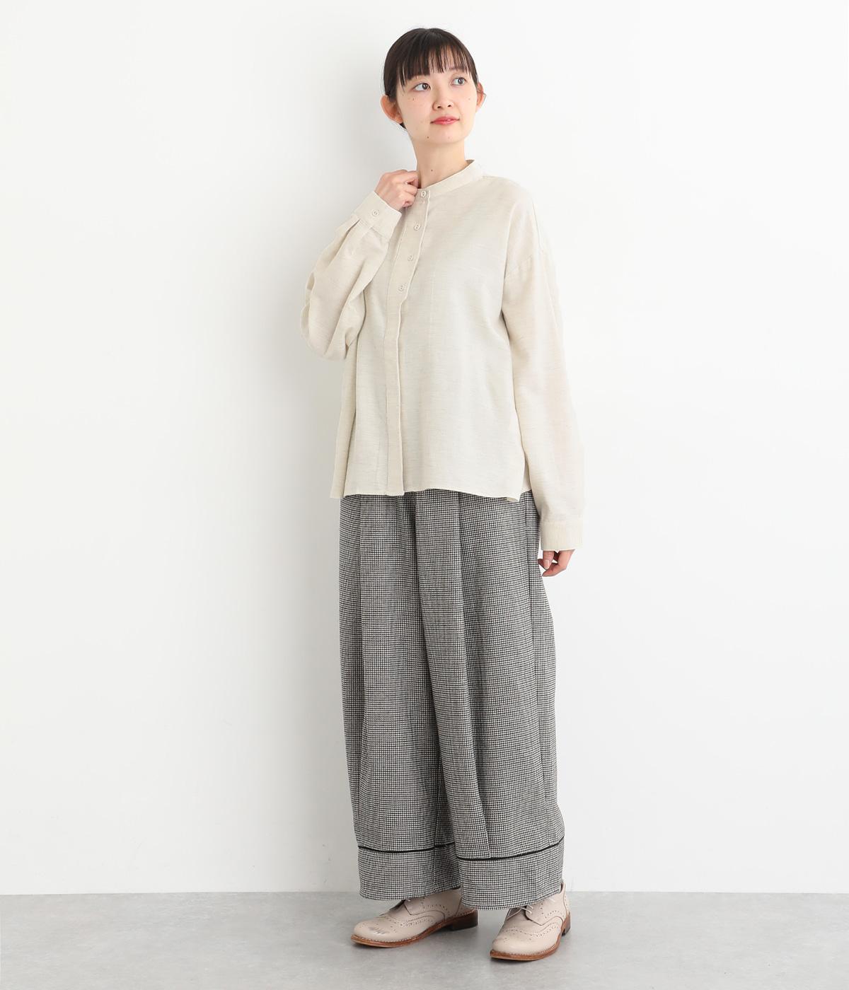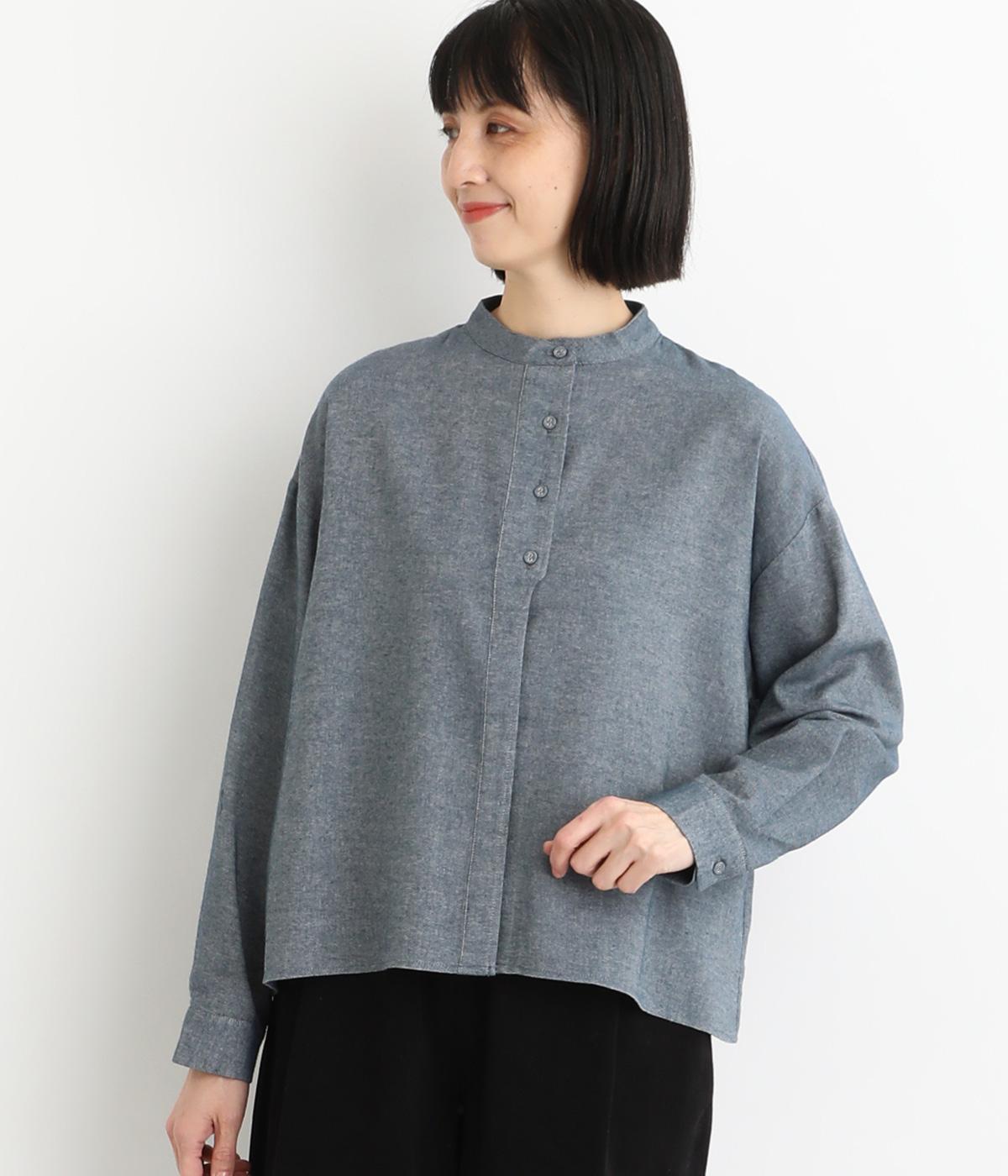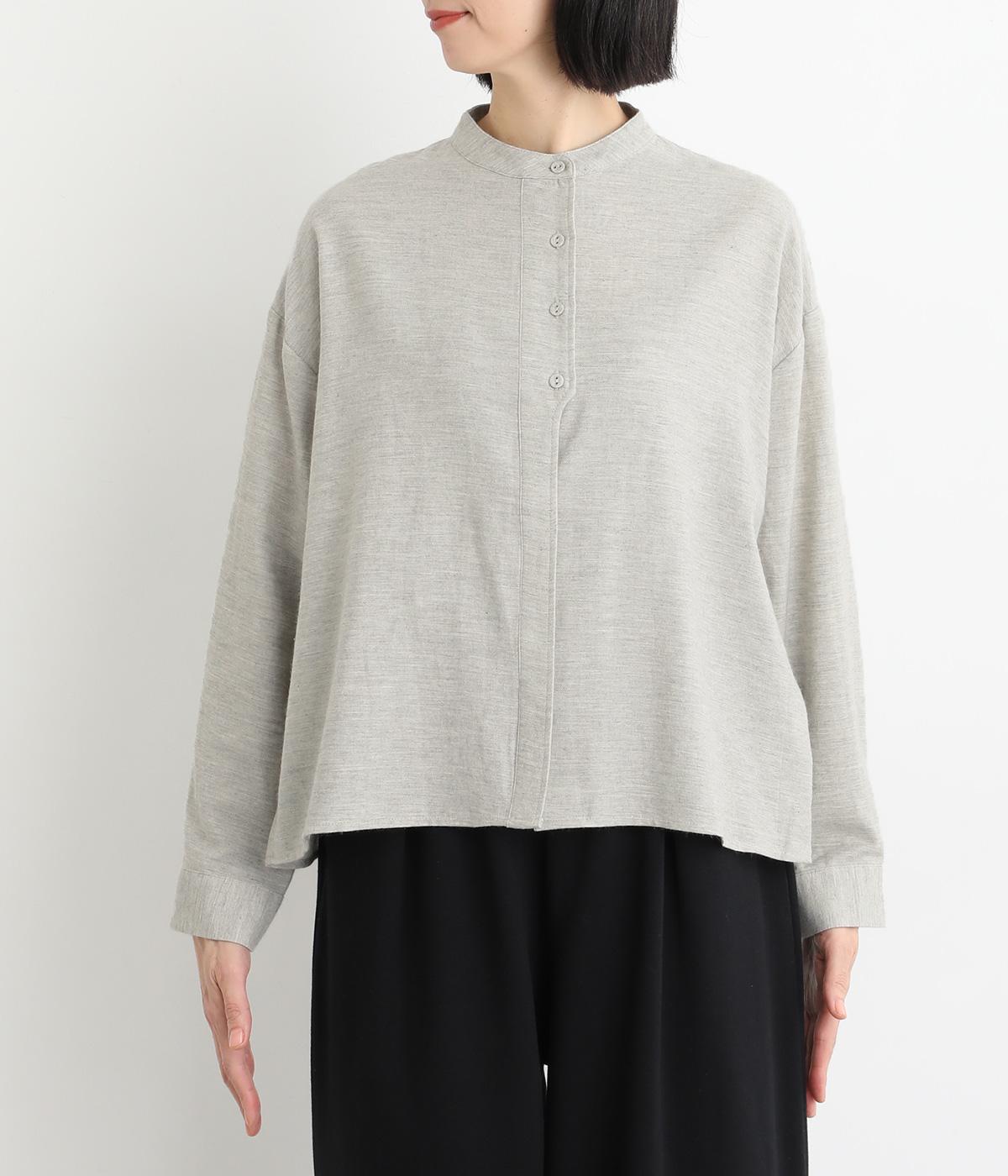 大人の魅力を惹きたてるシンプルさが魅力のバンドカラーブラウス。ゆったりとした身幅とコンパクトな着丈のバランスが◎です。前立ては胸から下を比翼仕立てにし、より品のある表情に仕上げました。
