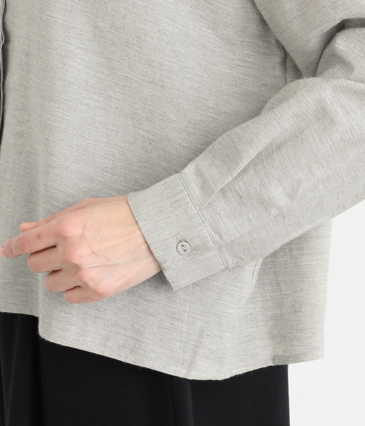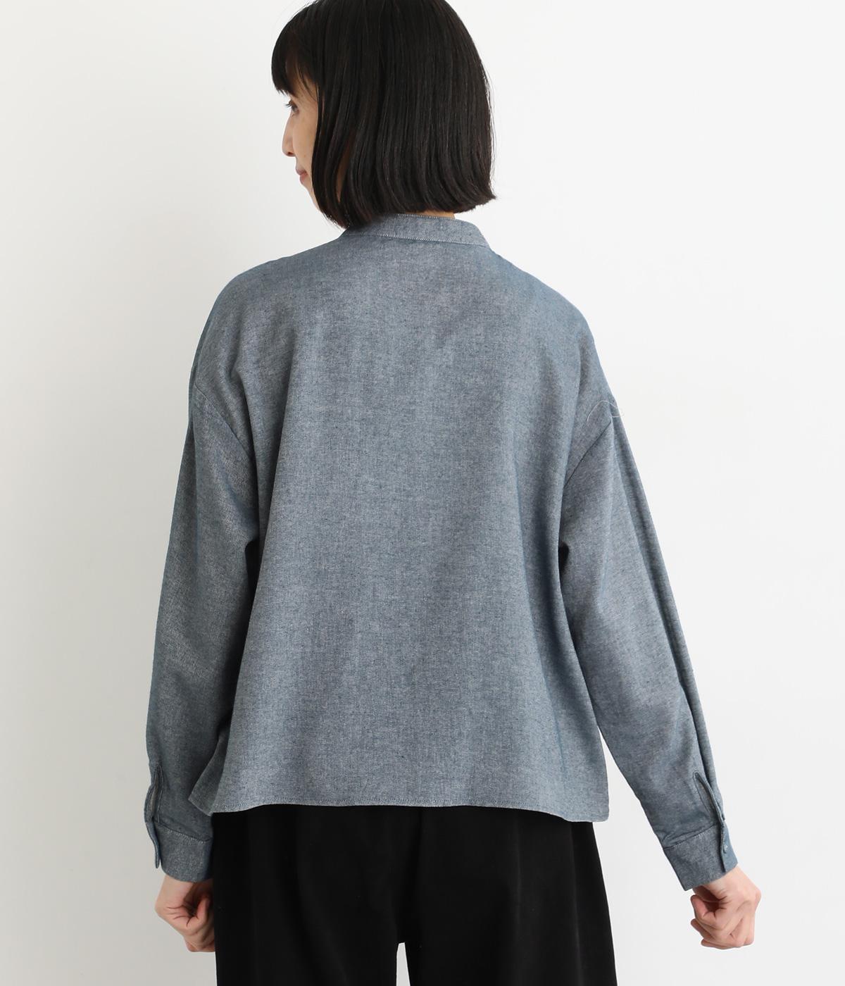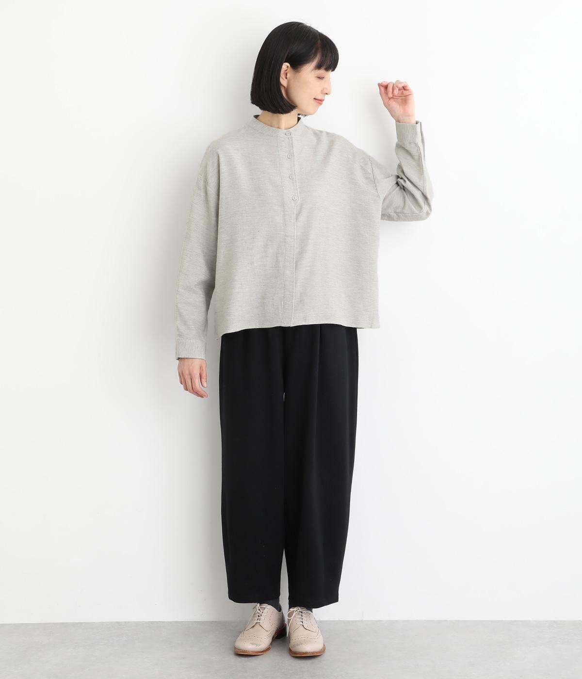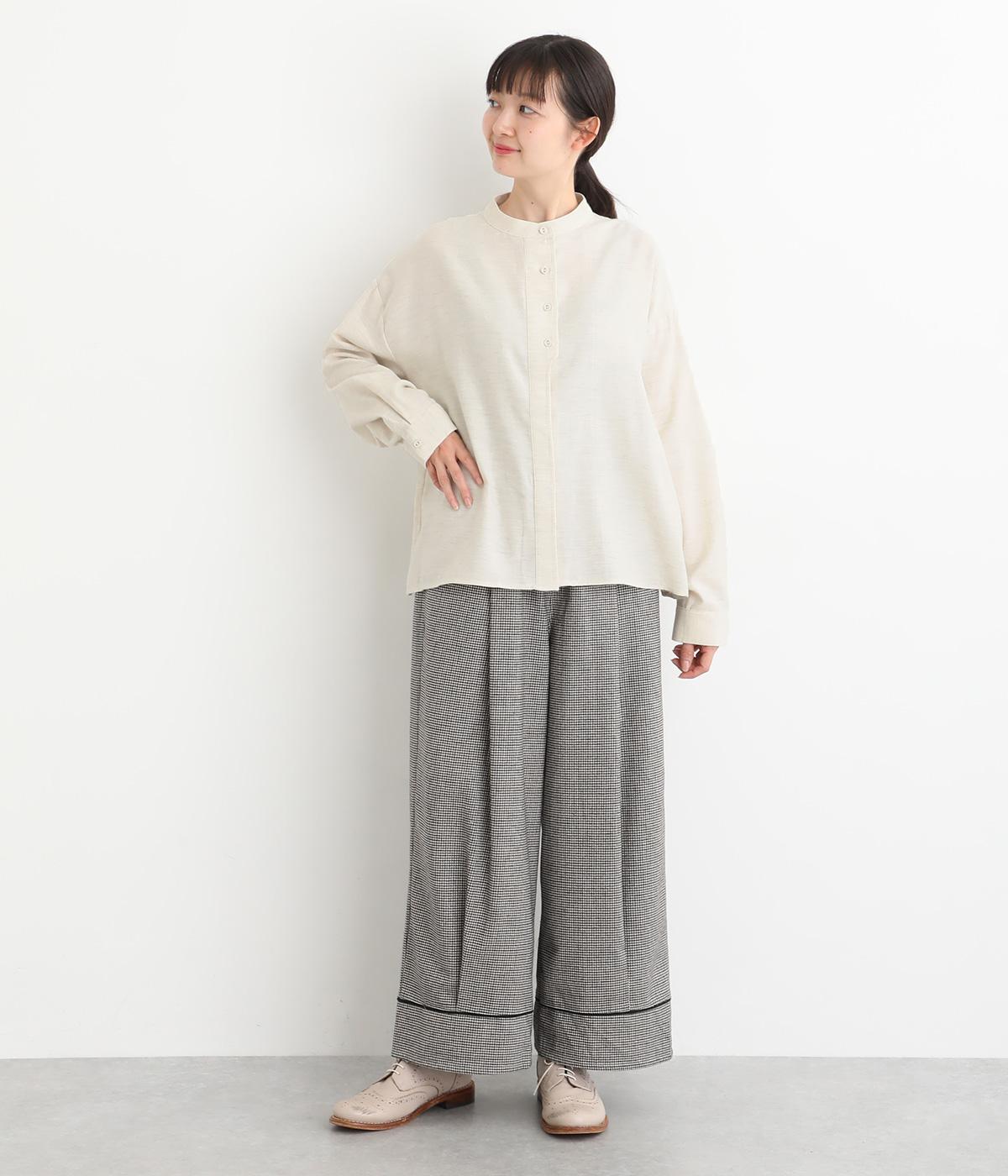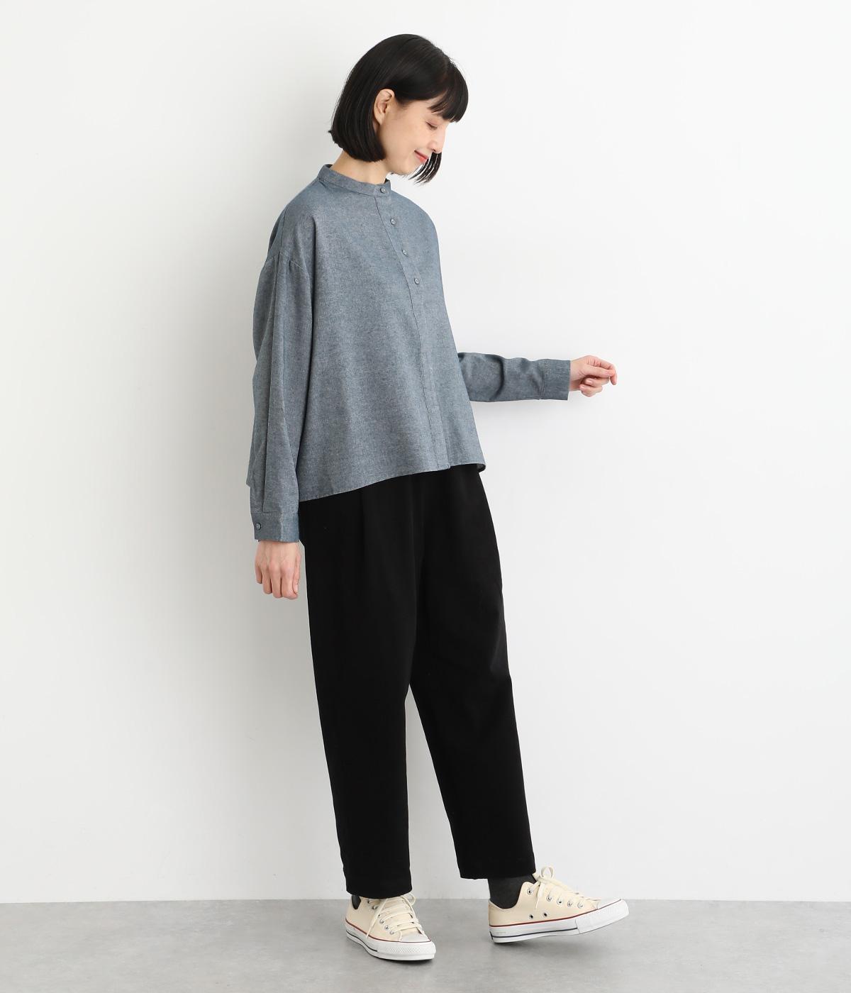 大人の魅力を惹きたてるシンプルさが魅力のバンドカラーブラウス。ゆったりとした身幅とコンパクトな着丈のバランスが◎です。前立ては胸から下を比翼仕立てにし、より品のある表情に仕上げました。