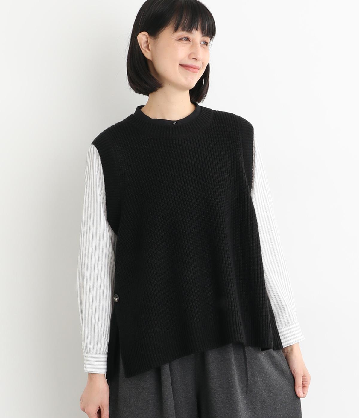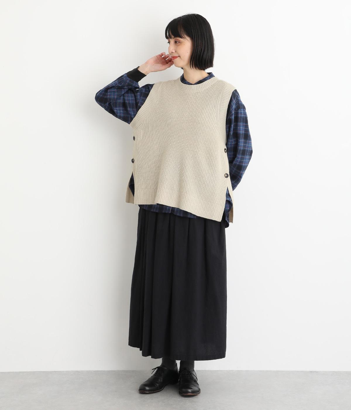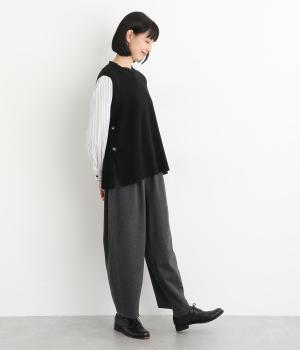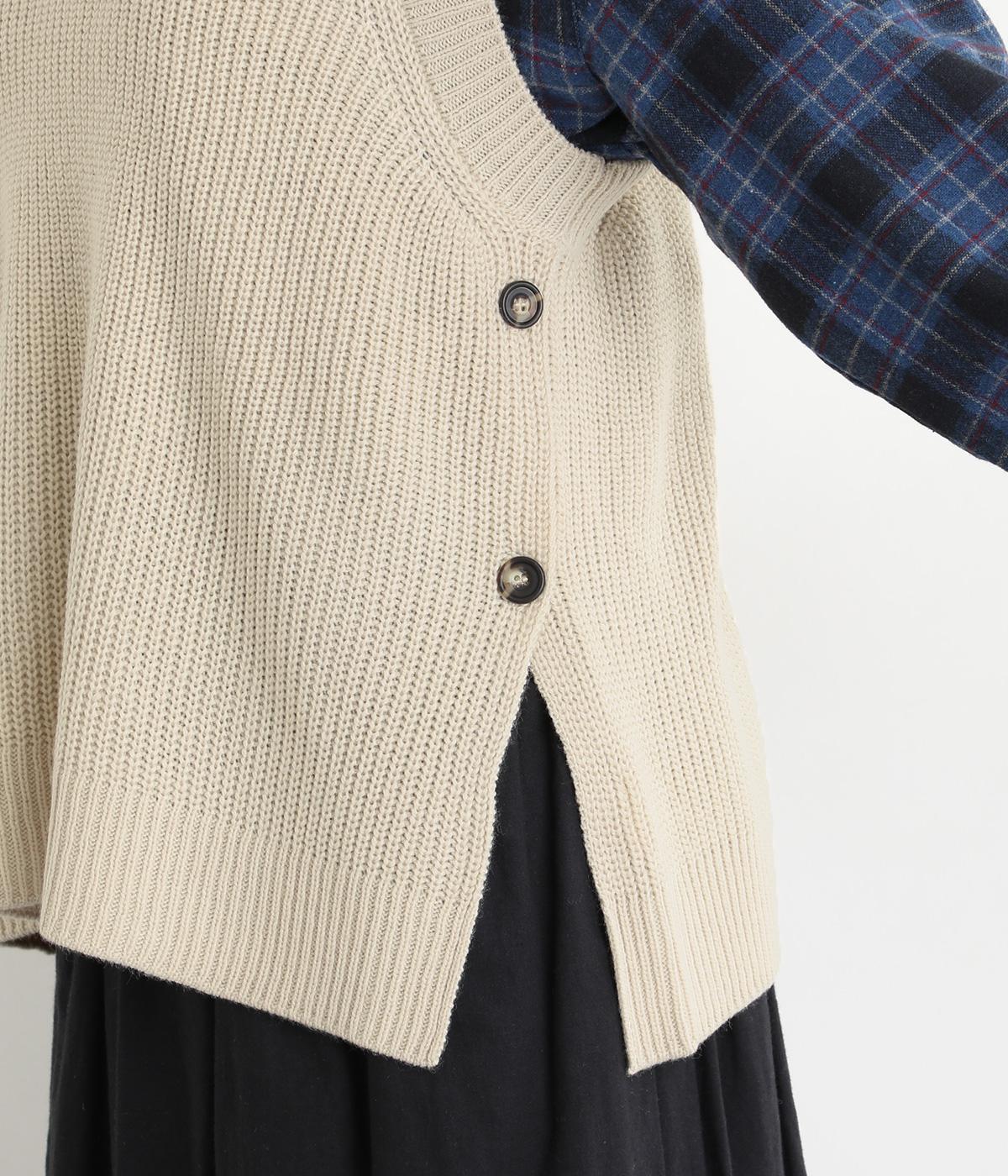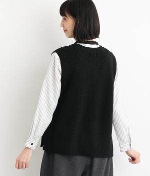 ゆとりのあるシルエットとシンプルなデザインで、さまざまな装いにレイヤードしやすいニットベスト。長めの着丈が腰まわりをカバーしてくれます。首元の開きを狭くした分、サイドスリットで抜け感を演出して好バランスに。ボタンを外してスリットをより深くすることもできます。