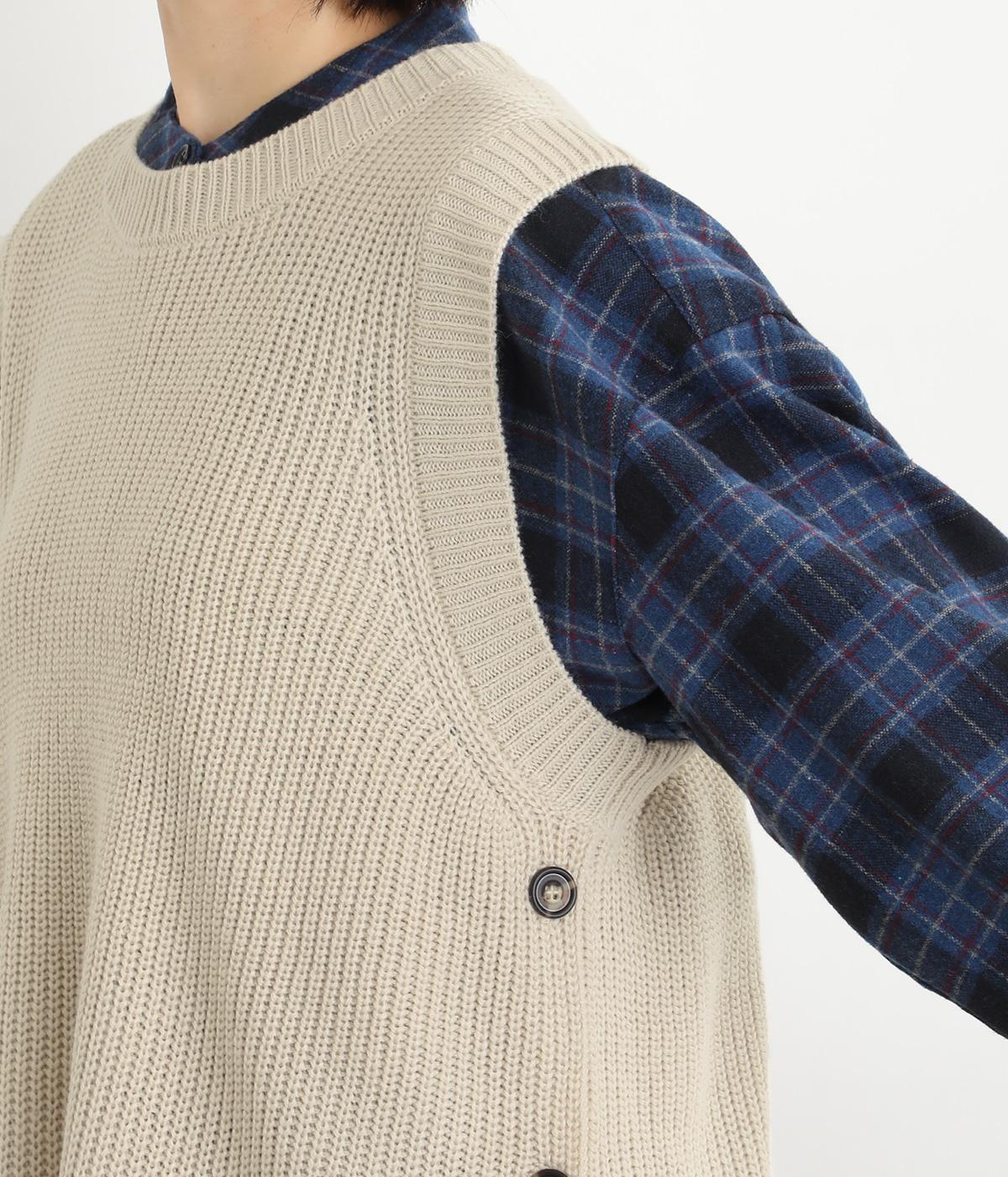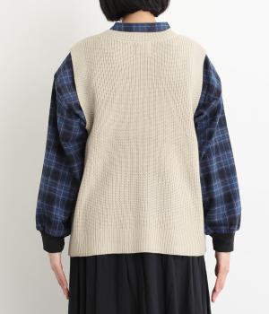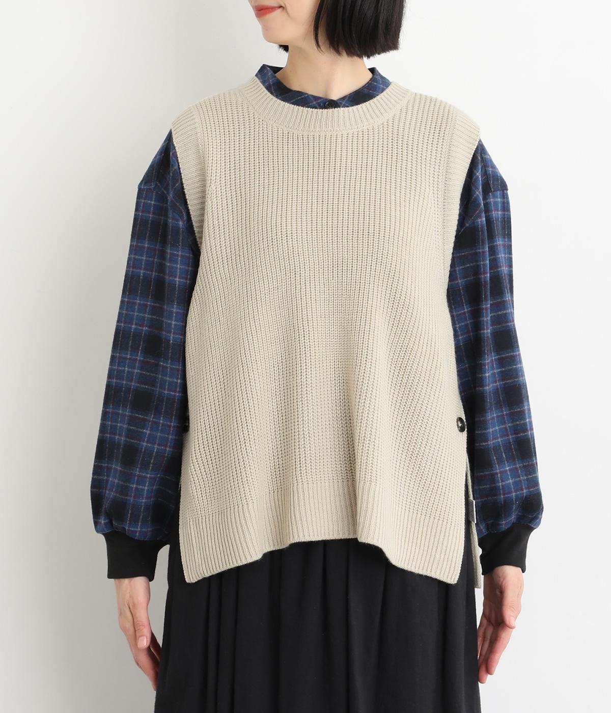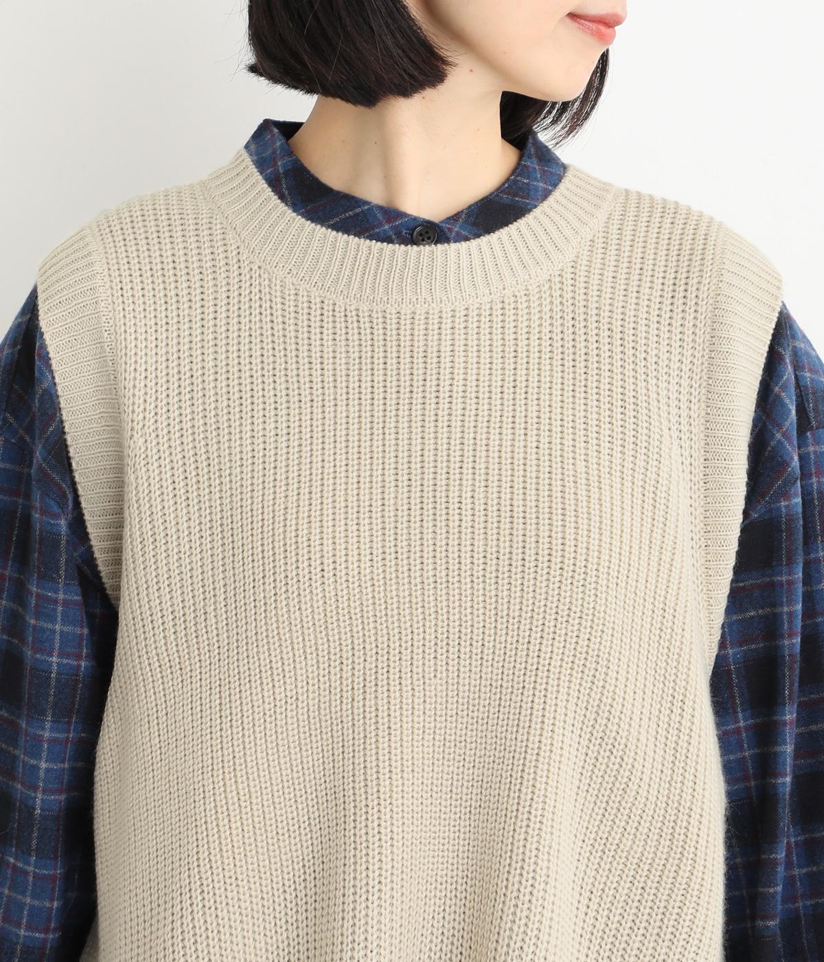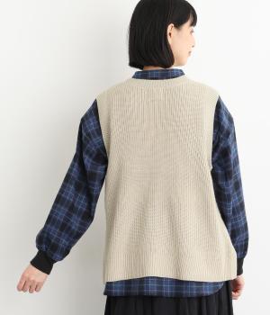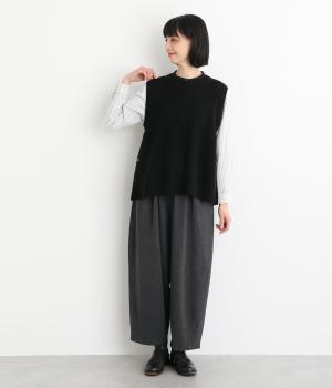 ゆとりのあるシルエットとシンプルなデザインで、さまざまな装いにレイヤードしやすいニットベスト。長めの着丈が腰まわりをカバーしてくれます。首元の開きを狭くした分、サイドスリットで抜け感を演出して好バランスに。ボタンを外してスリットをより深くすることもできます。