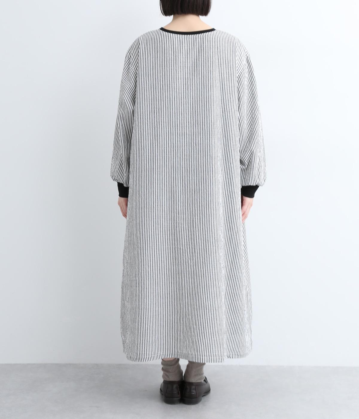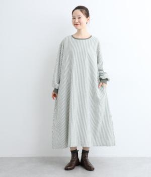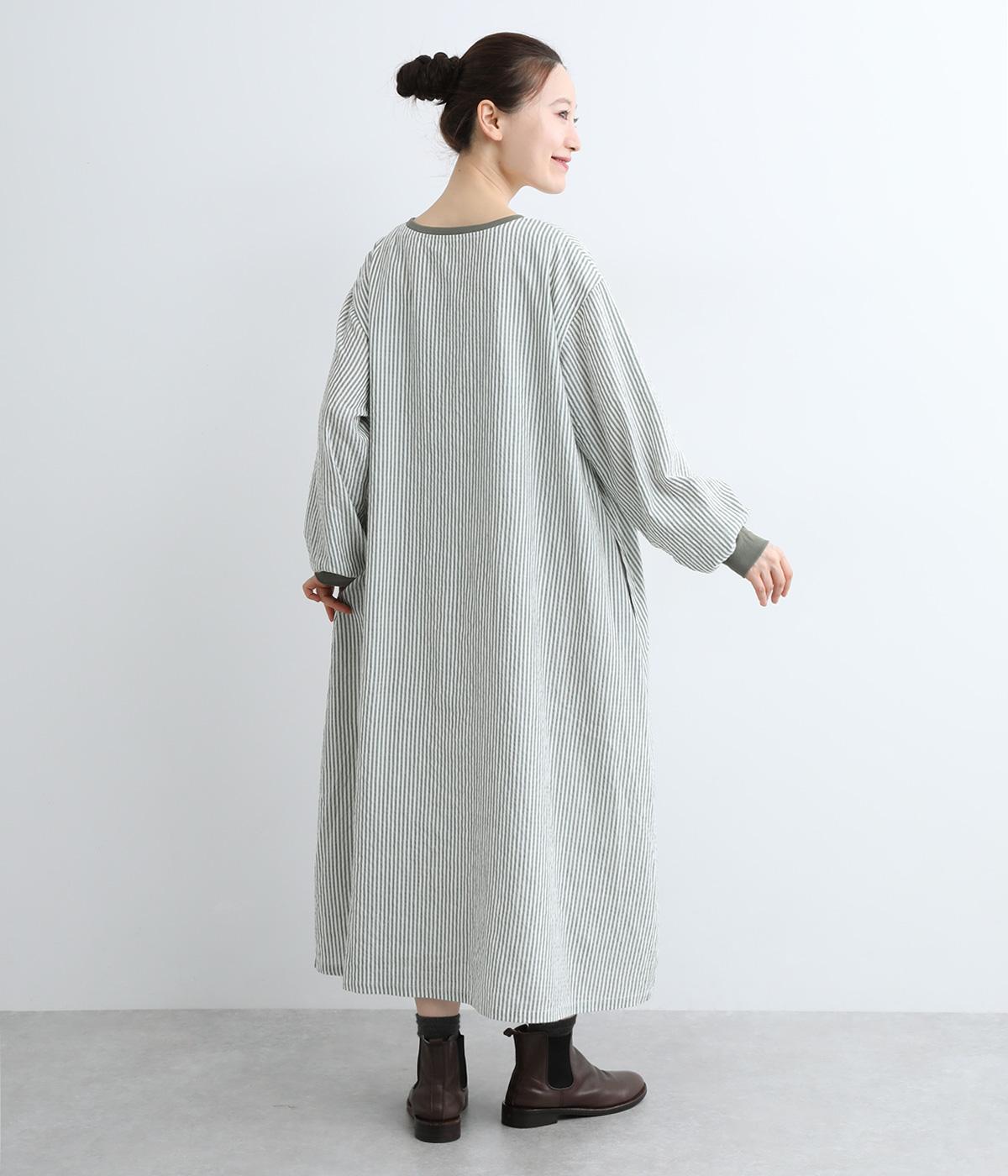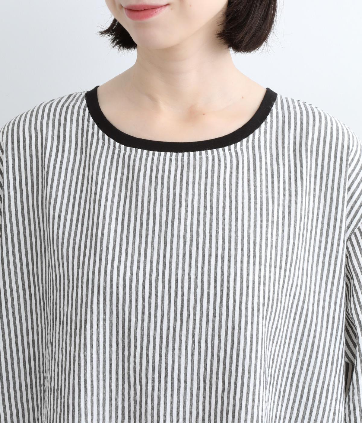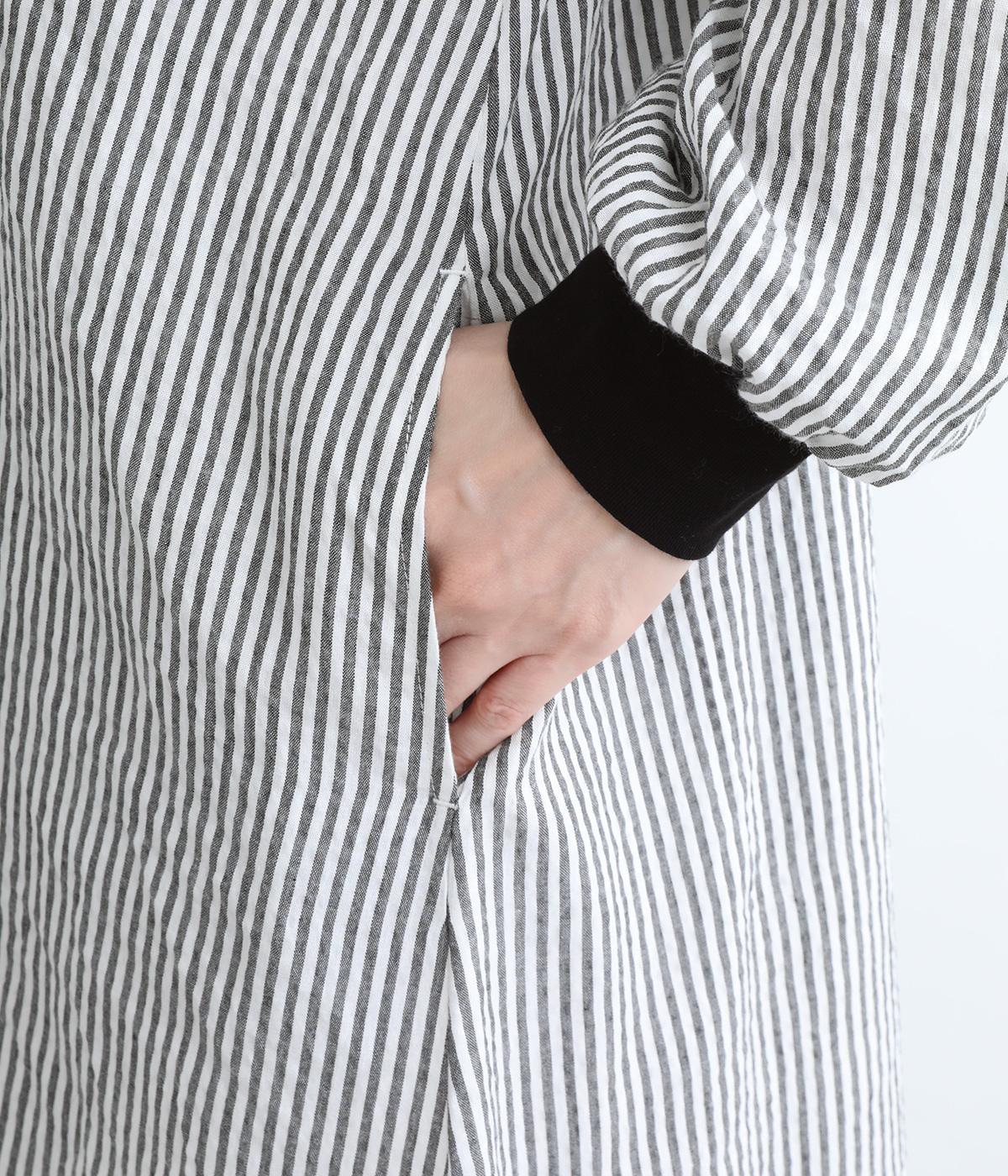Aラインに広がるボリュームが、大人の余韻を残す美しいシルエット。下に重みがある分、首まわりはクルーネックでスッキリと仕上げました。襟と袖口にはコットン混のリブ生地をあしらい、サッカーストライプの爽やかさに深みを与えています。