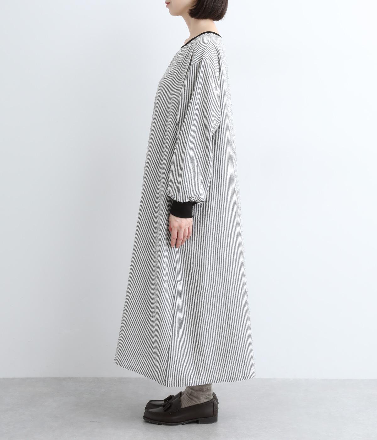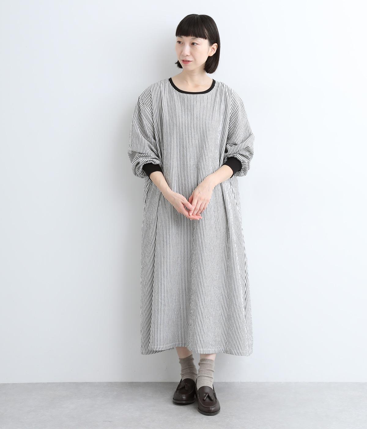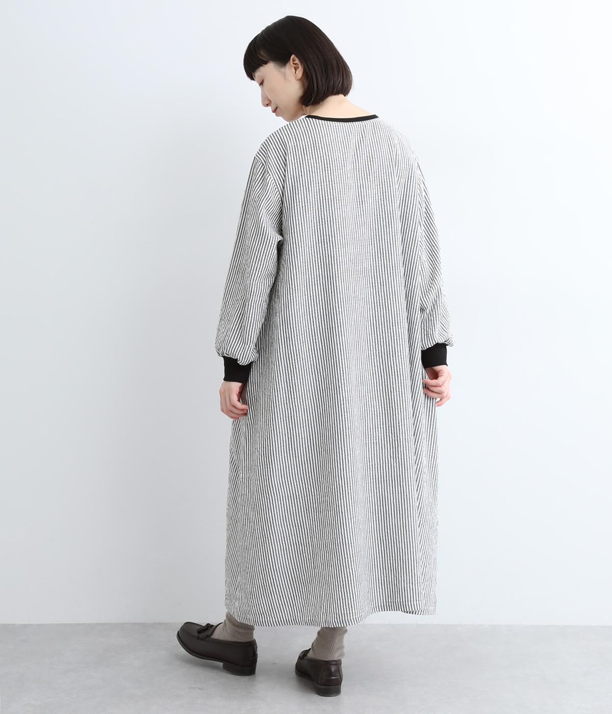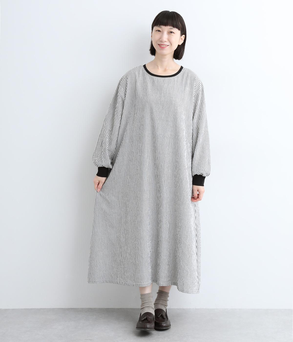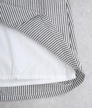 Aラインに広がるボリュームが、大人の余韻を残す美しいシルエット。下に重みがある分、首まわりはクルーネックでスッキリと仕上げました。襟と袖口にはコットン混のリブ生地をあしらい、サッカーストライプの爽やかさに深みを与えています。