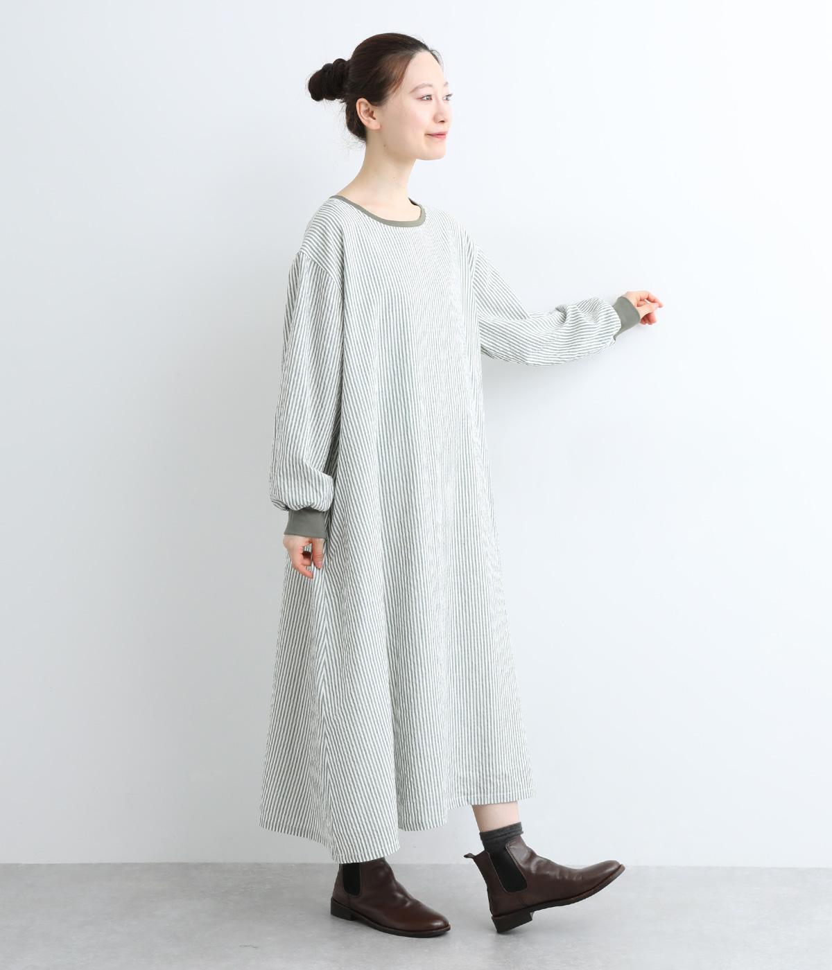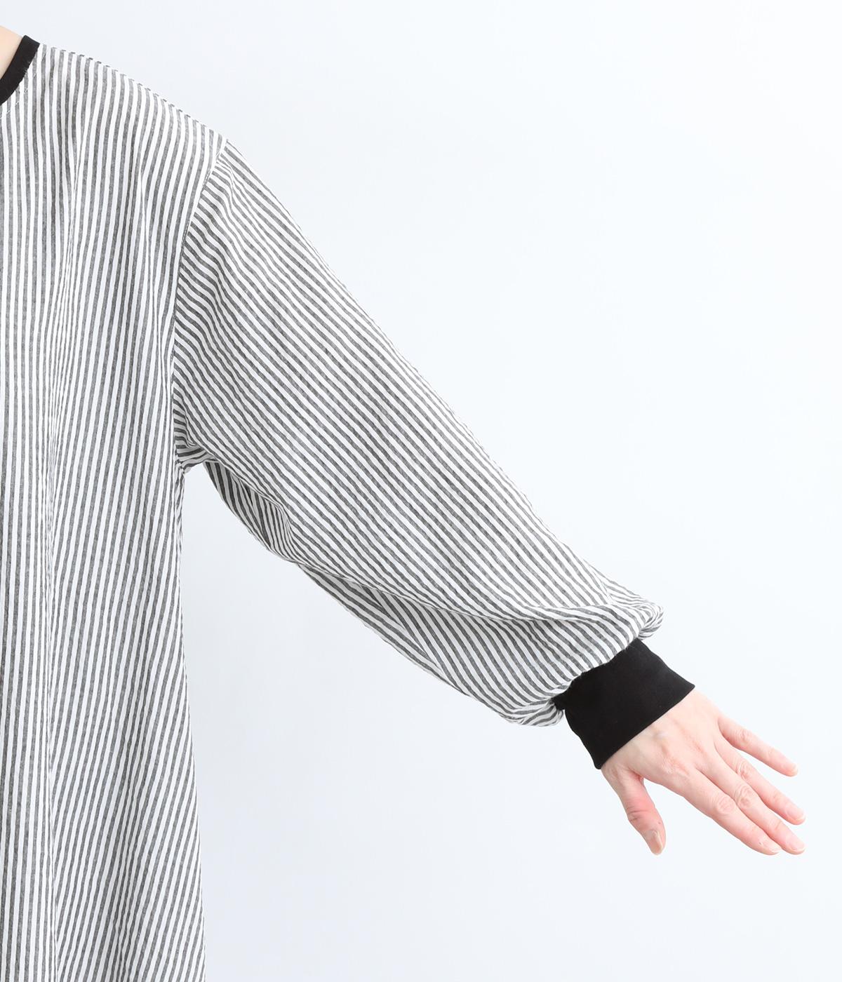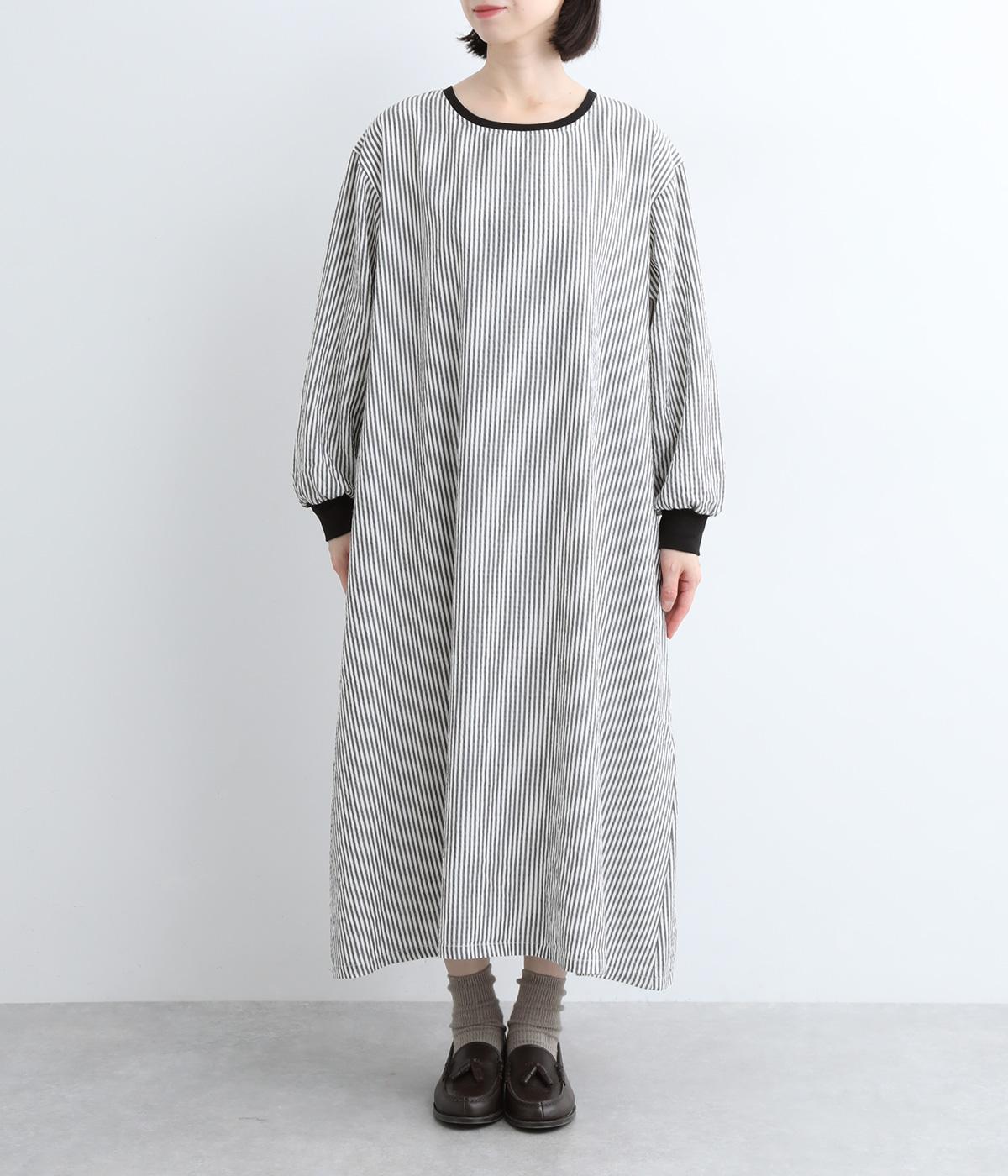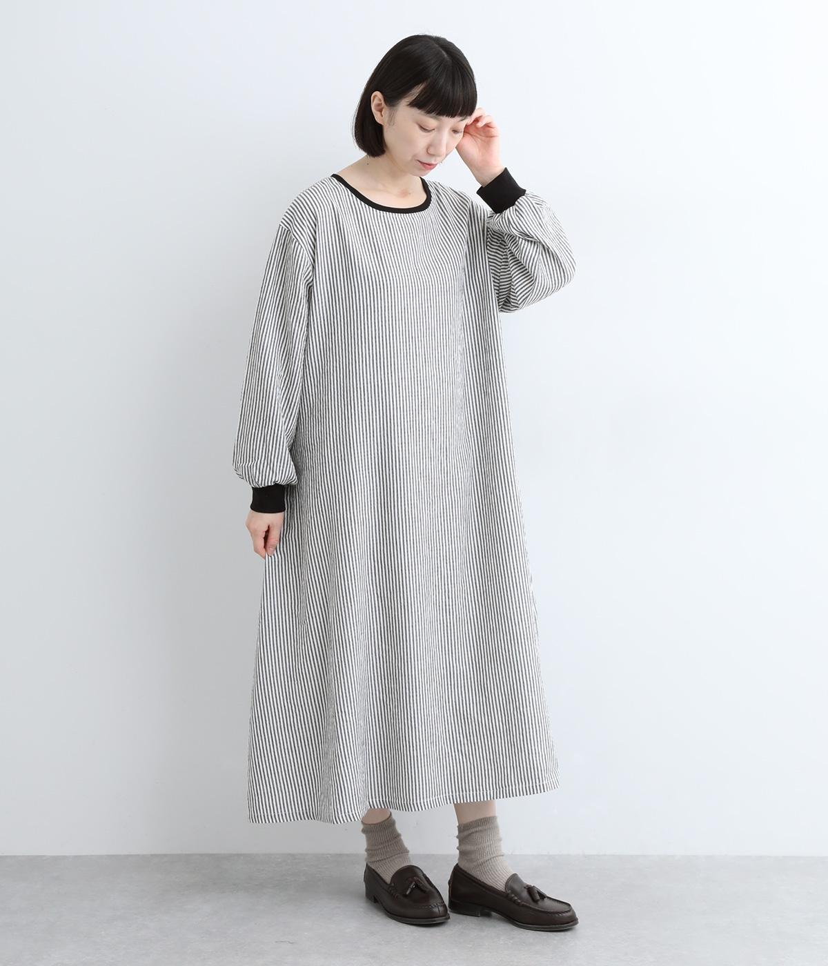 Aラインに広がるボリュームが、大人の余韻を残す美しいシルエット。下に重みがある分、首まわりはクルーネックでスッキリと仕上げました。襟と袖口にはコットン混のリブ生地をあしらい、サッカーストライプの爽やかさに深みを与えています。