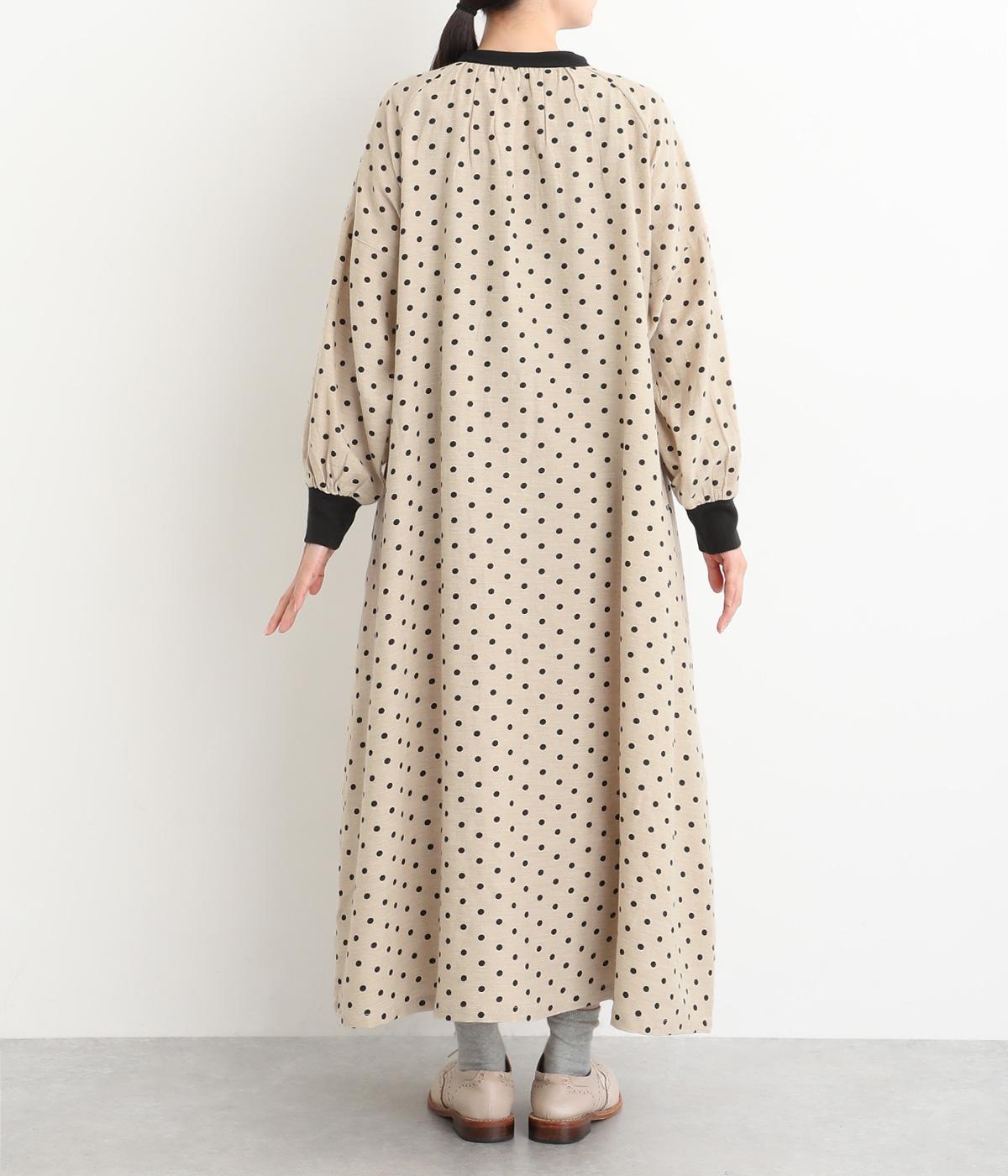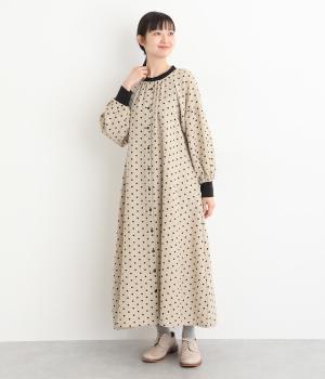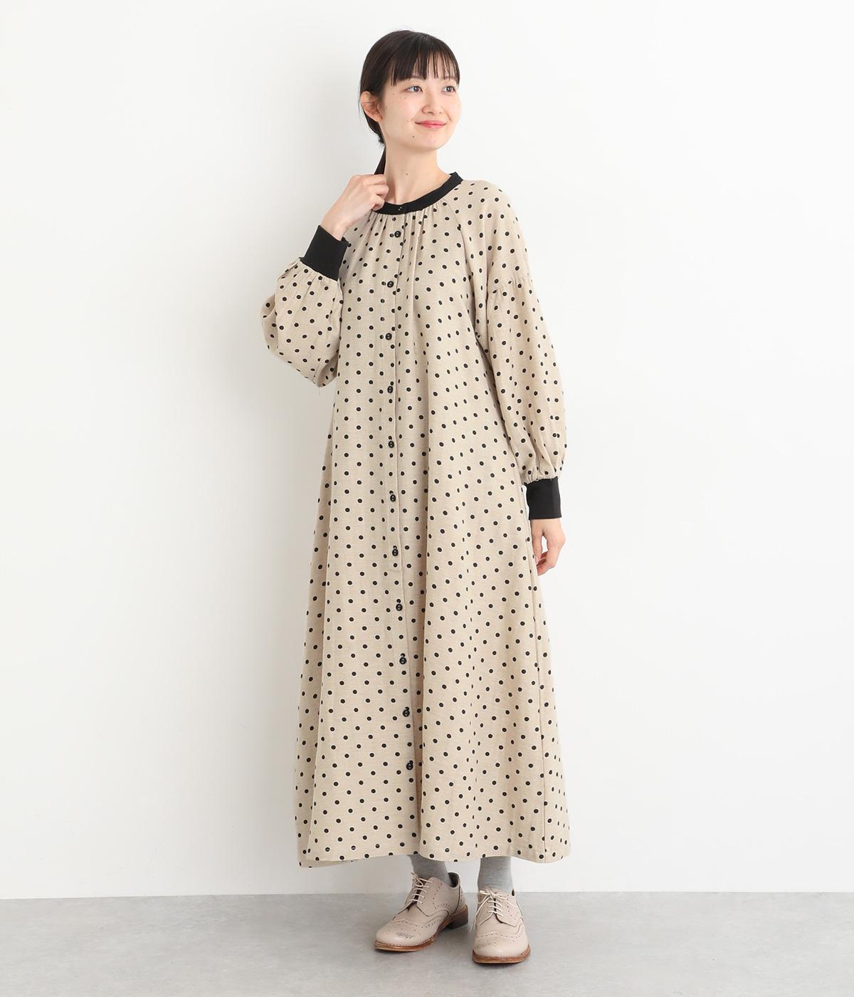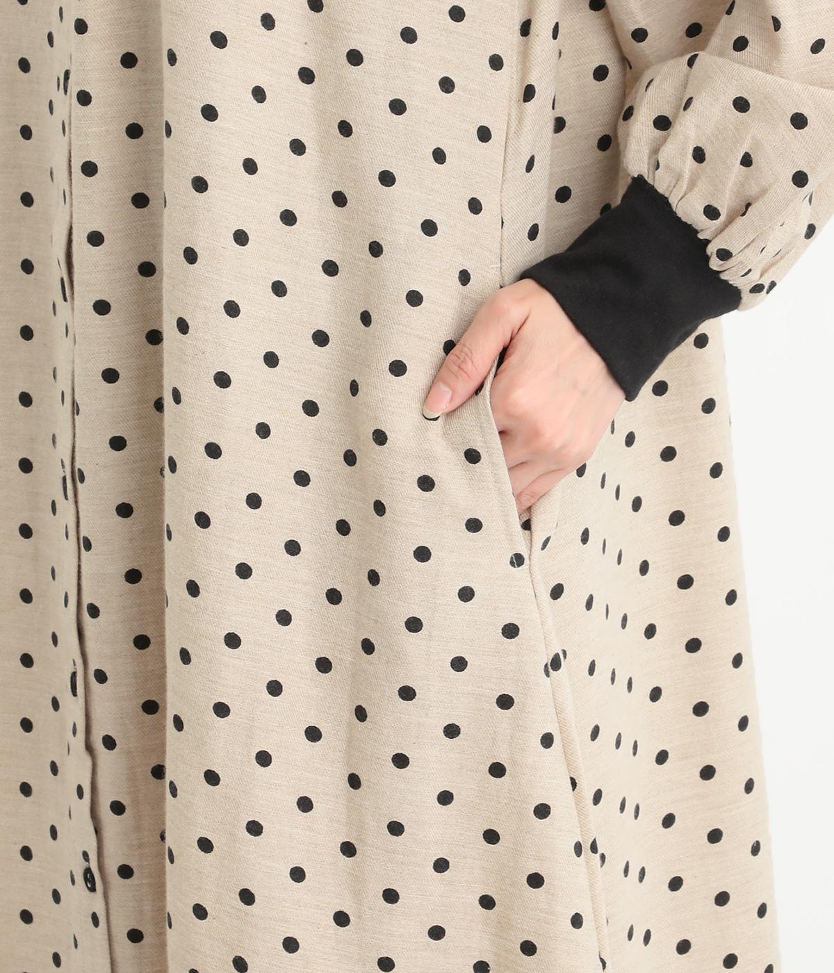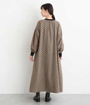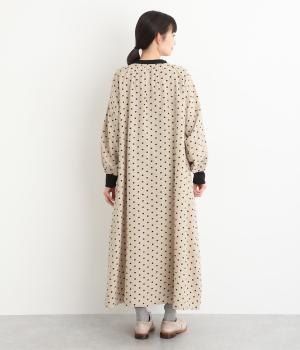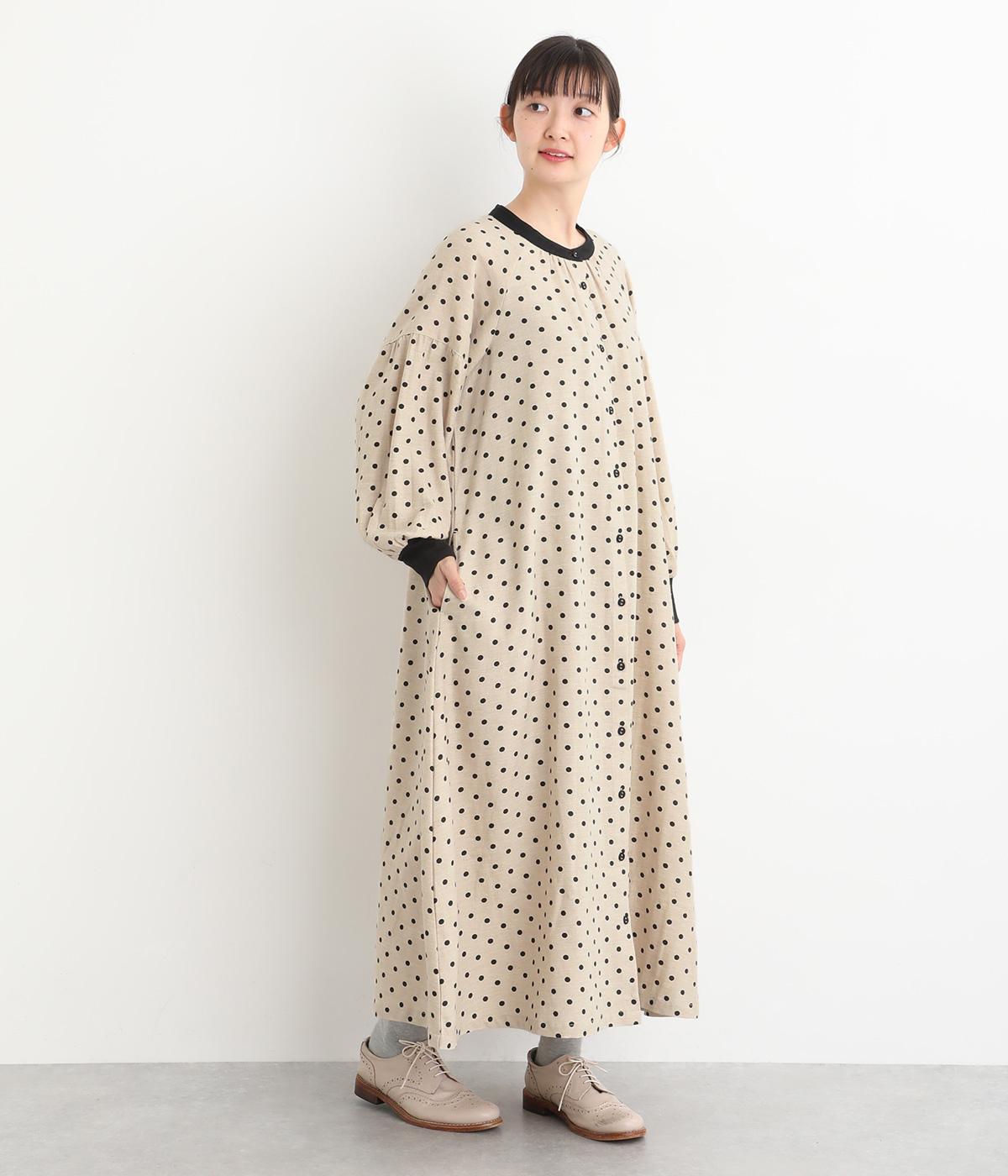 フレアシルエットのフェミニンなドット柄ワンピース。ギャザーをあしらったボリューム袖が愛らしいムードを加速させます。全体をすっきりと引き締める、襟ぐりと袖口の配色生地が◎。両サイドには便利なポケットをつけました。