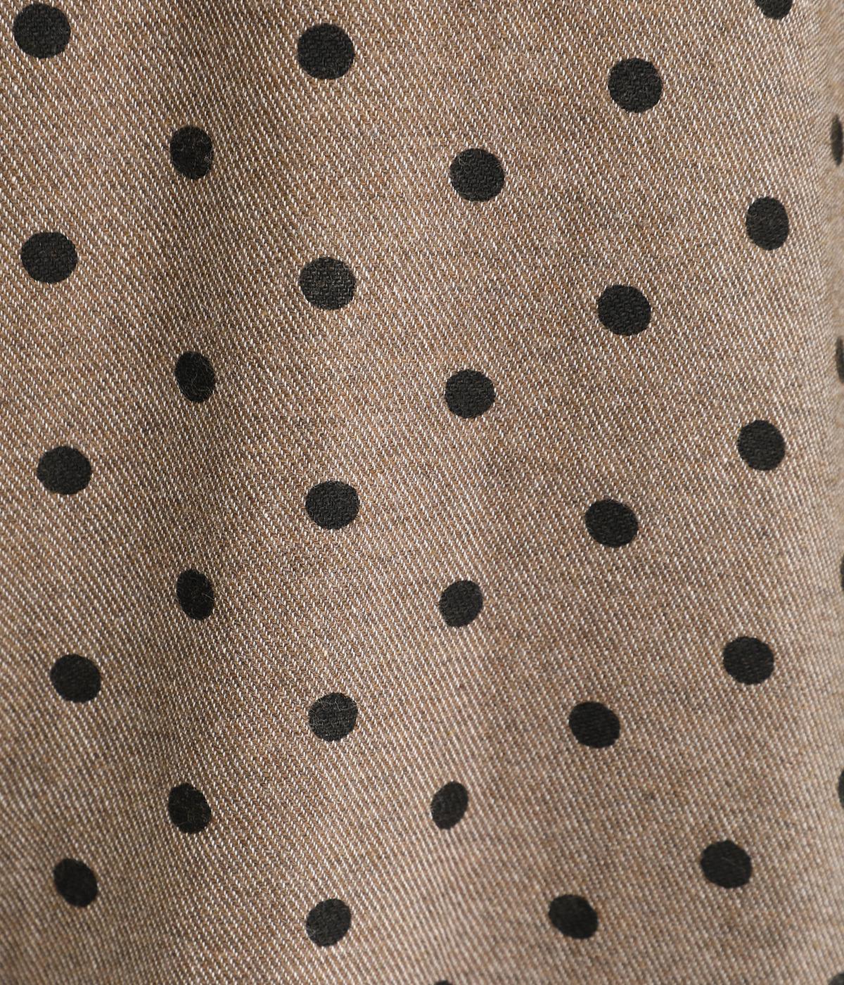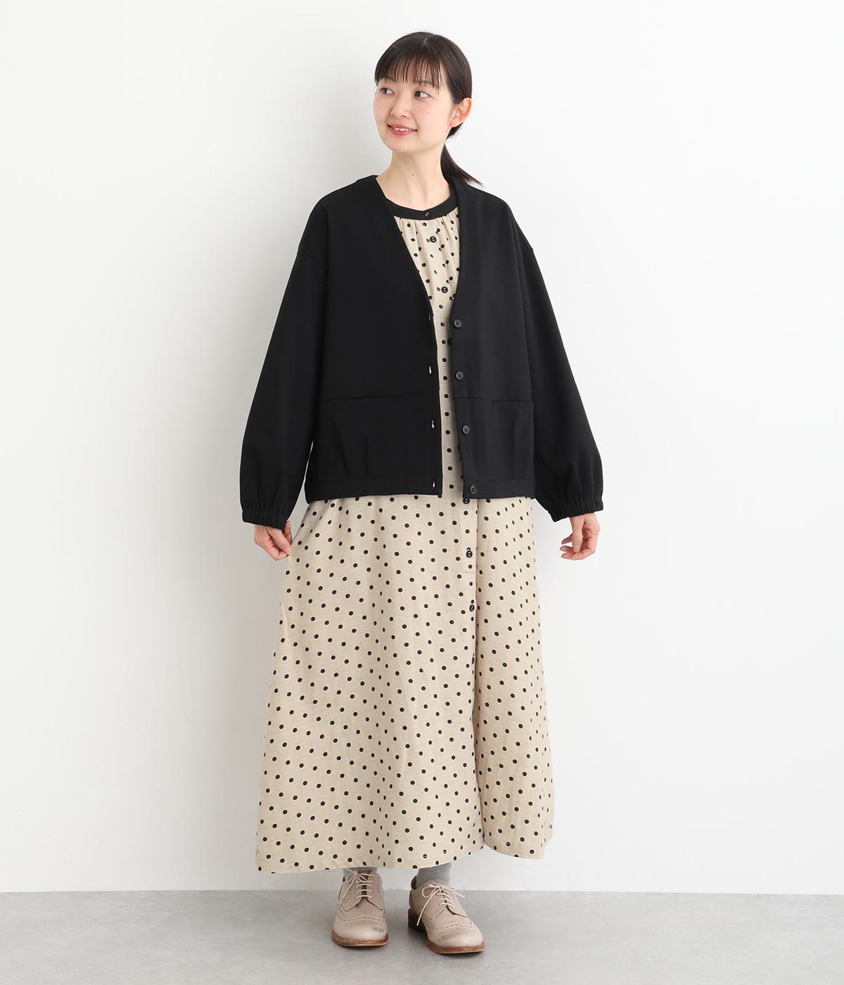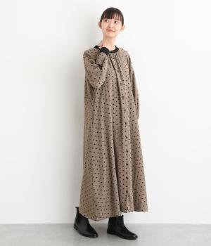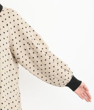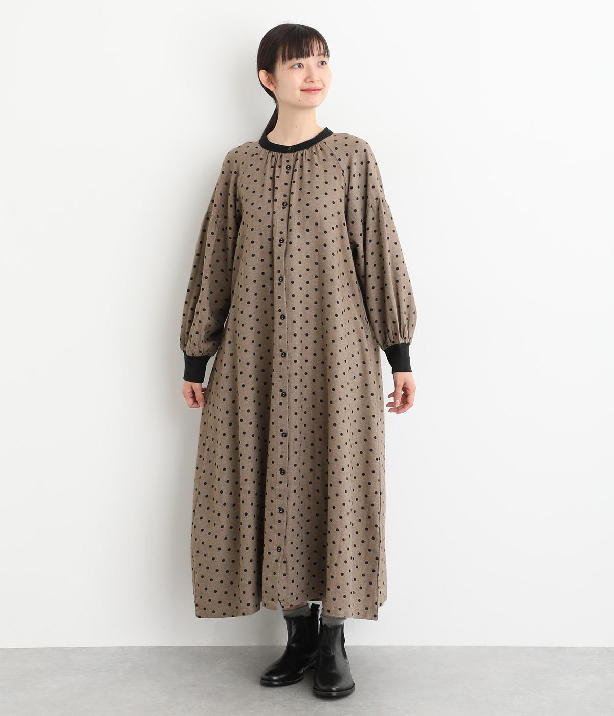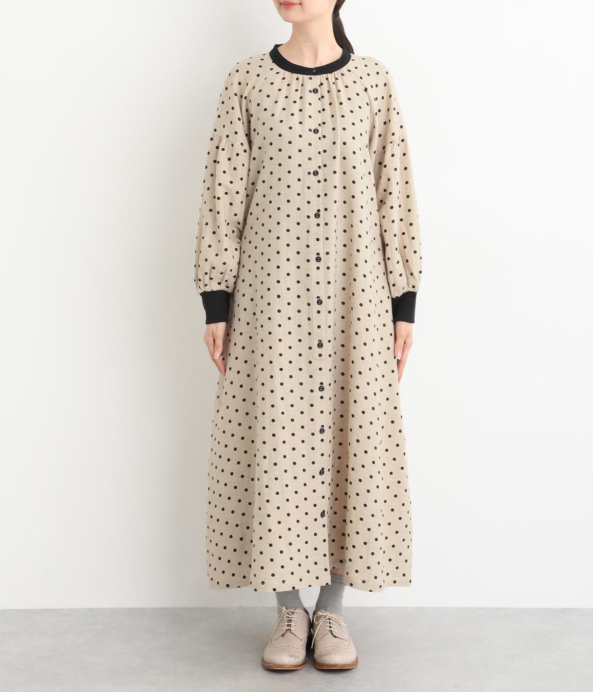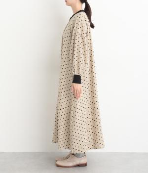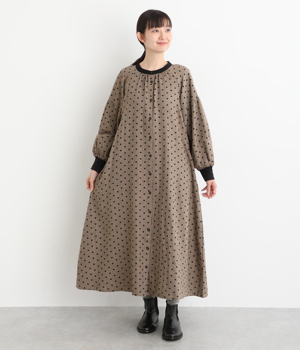 フレアシルエットのフェミニンなドット柄ワンピース。ギャザーをあしらったボリューム袖が愛らしいムードを加速させます。全体をすっきりと引き締める、襟ぐりと袖口の配色生地が◎。両サイドには便利なポケットをつけました。