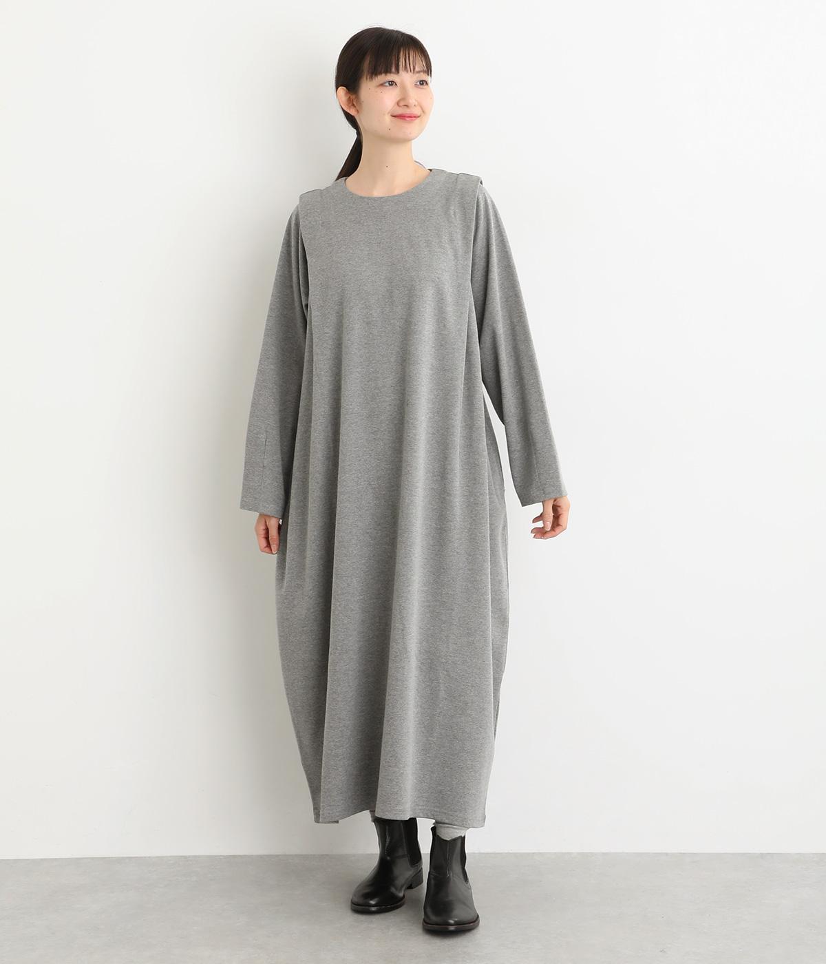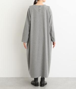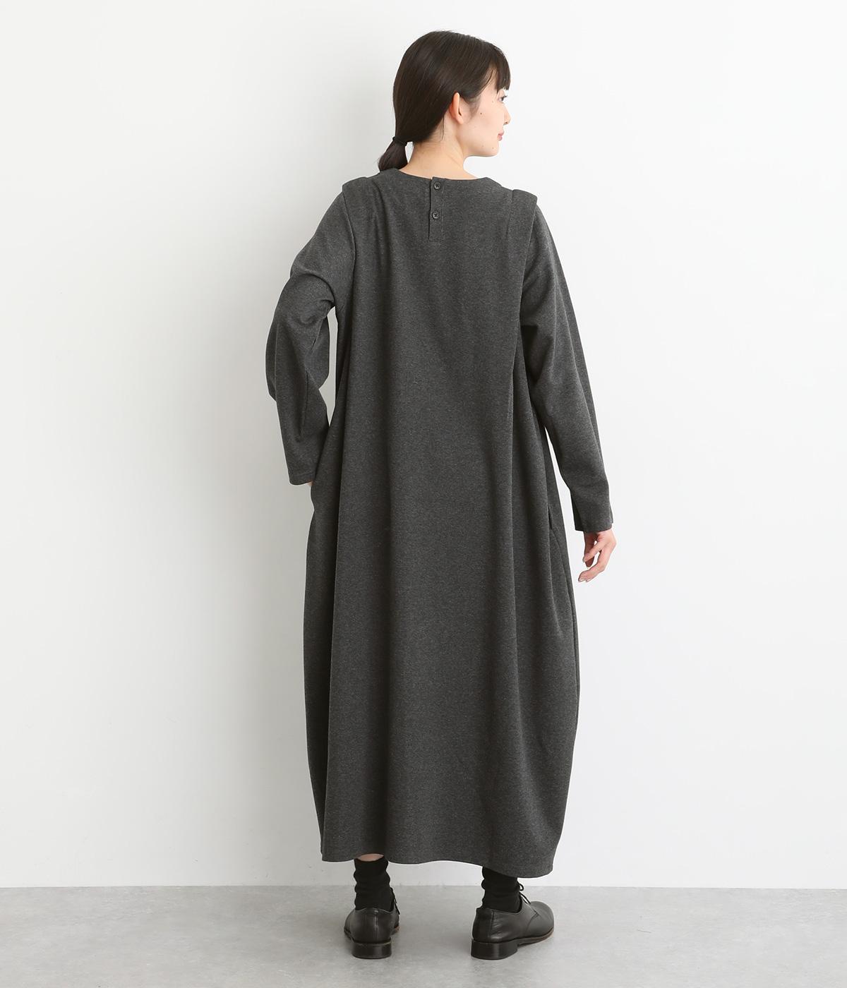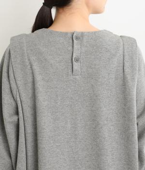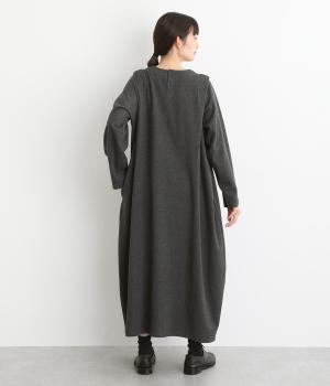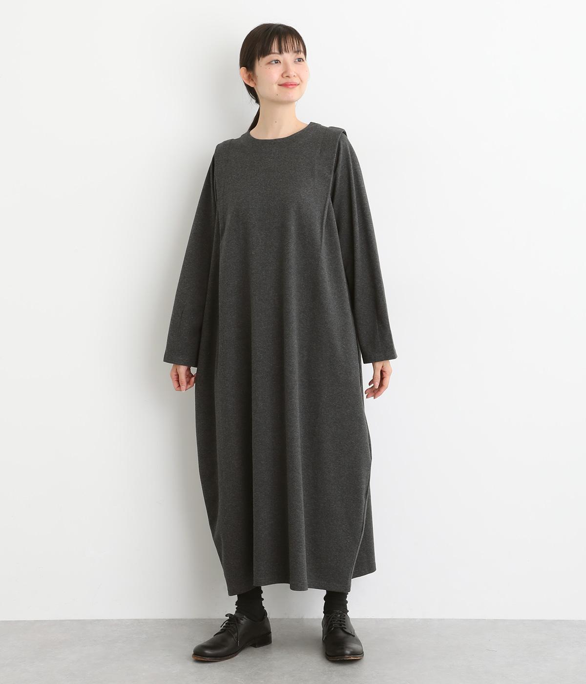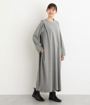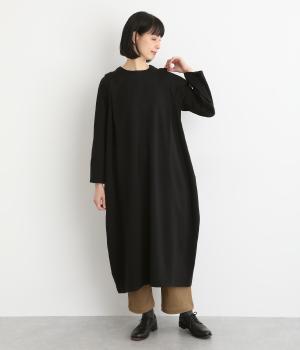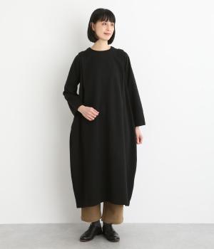 肩に大きくほどこしたタックをアクセントにしたワンピース。腰まわりにボリュームを持たせ、裾の広がりをおさえたコクーンシルエットが大人らしい印象を醸します。後ろネックのボタンが着脱をアシスト。合わせる小物次第でも印象が変わるシンプルさが魅力の一着です。