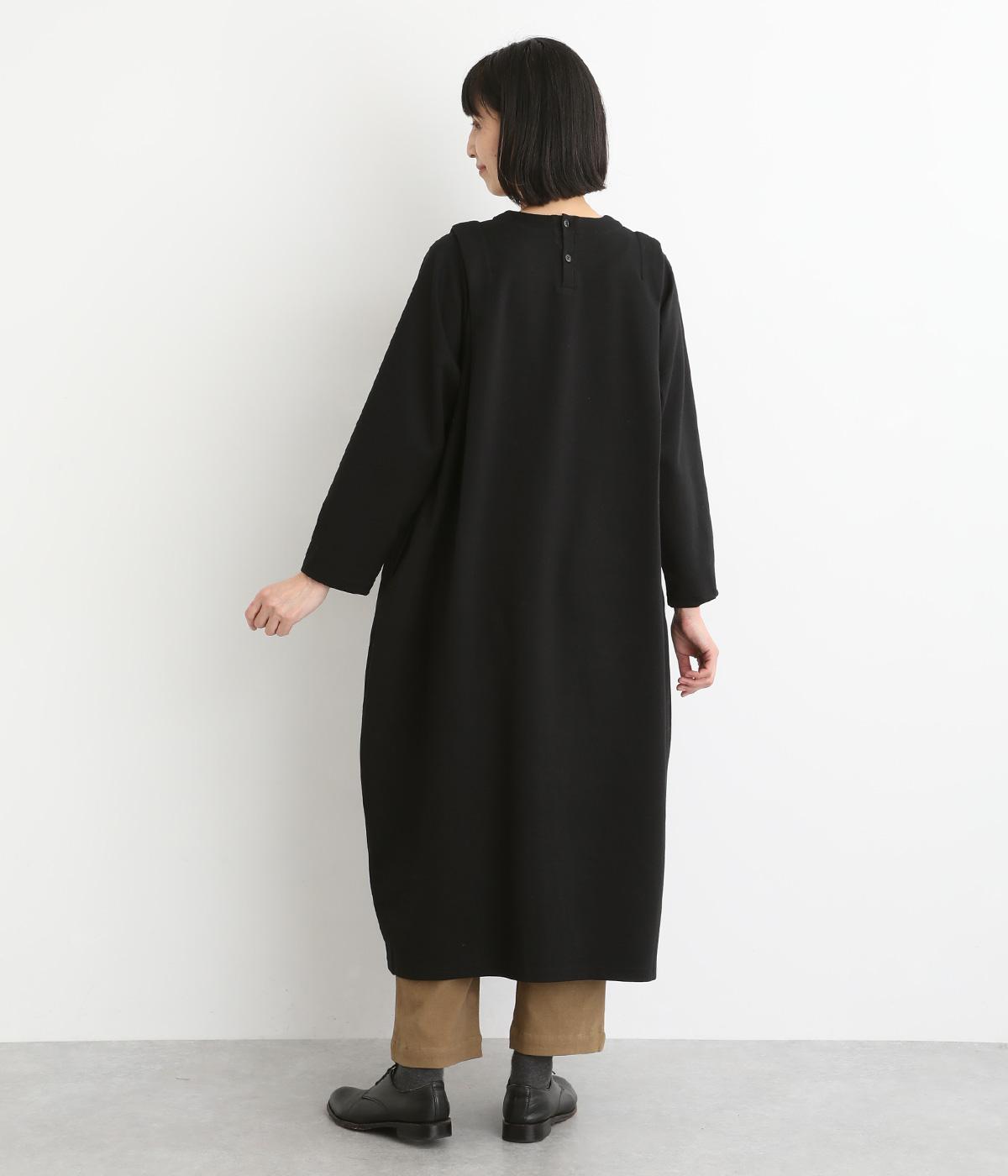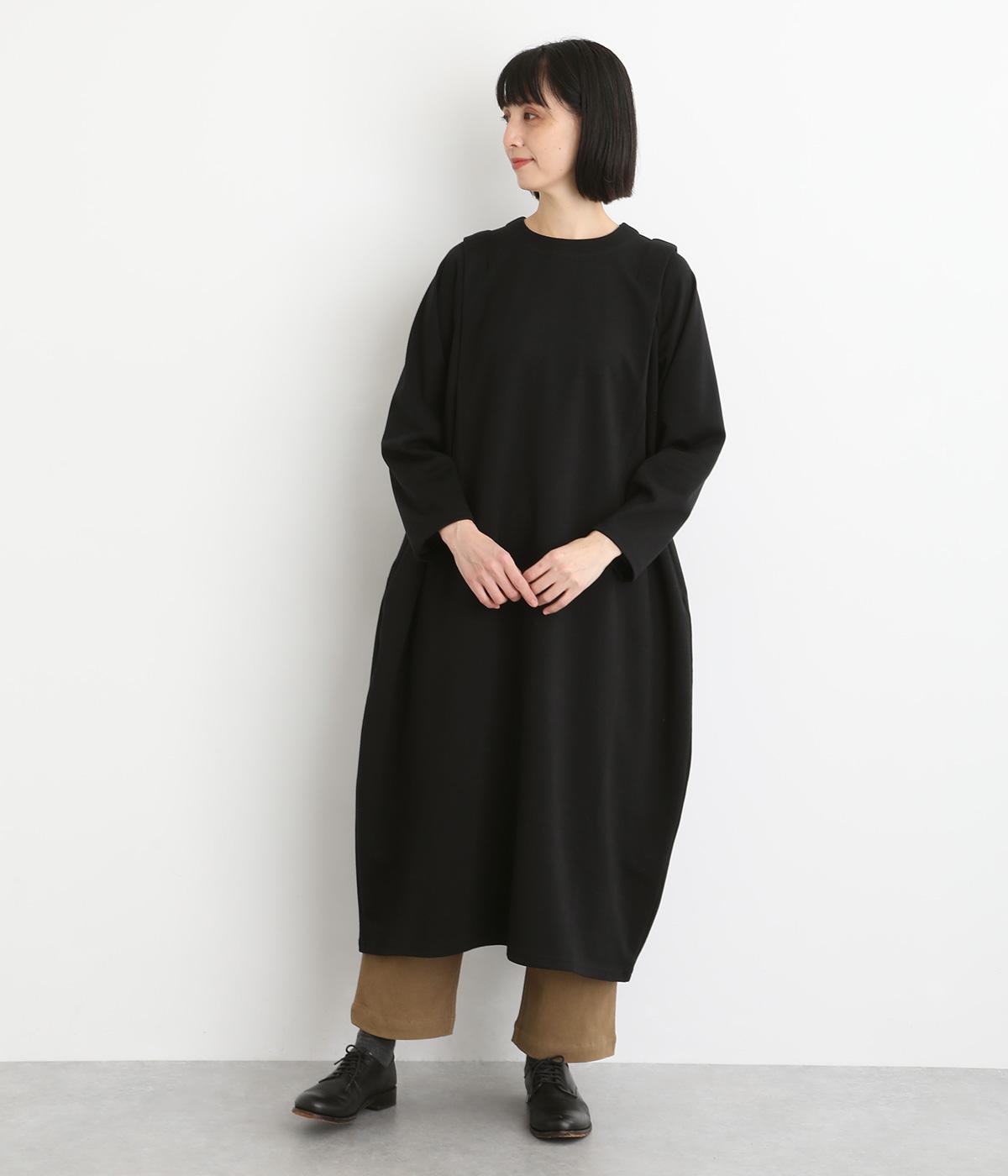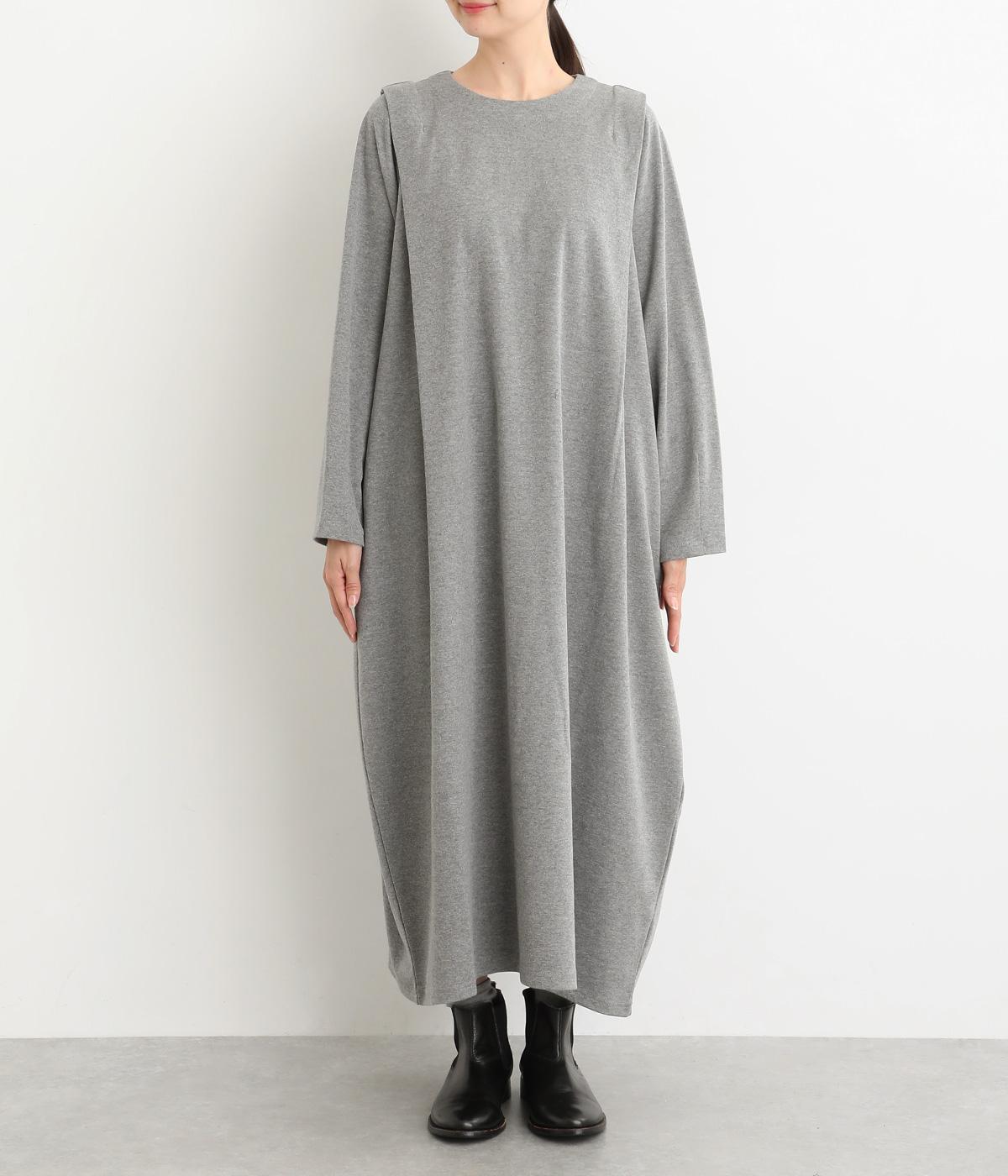 肩に大きくほどこしたタックをアクセントにしたワンピース。腰まわりにボリュームを持たせ、裾の広がりをおさえたコクーンシルエットが大人らしい印象を醸します。後ろネックのボタンが着脱をアシスト。合わせる小物次第でも印象が変わるシンプルさが魅力の一着です。