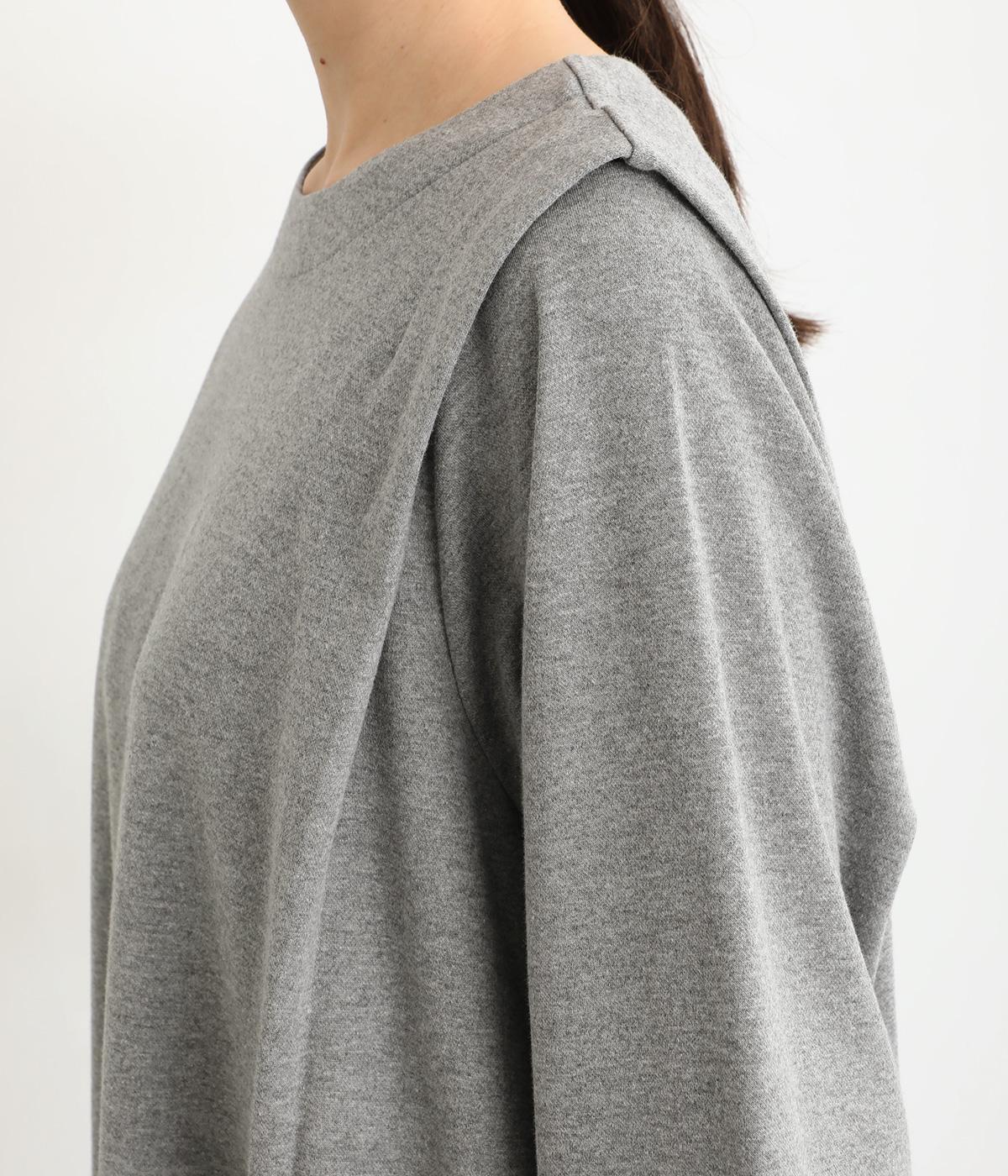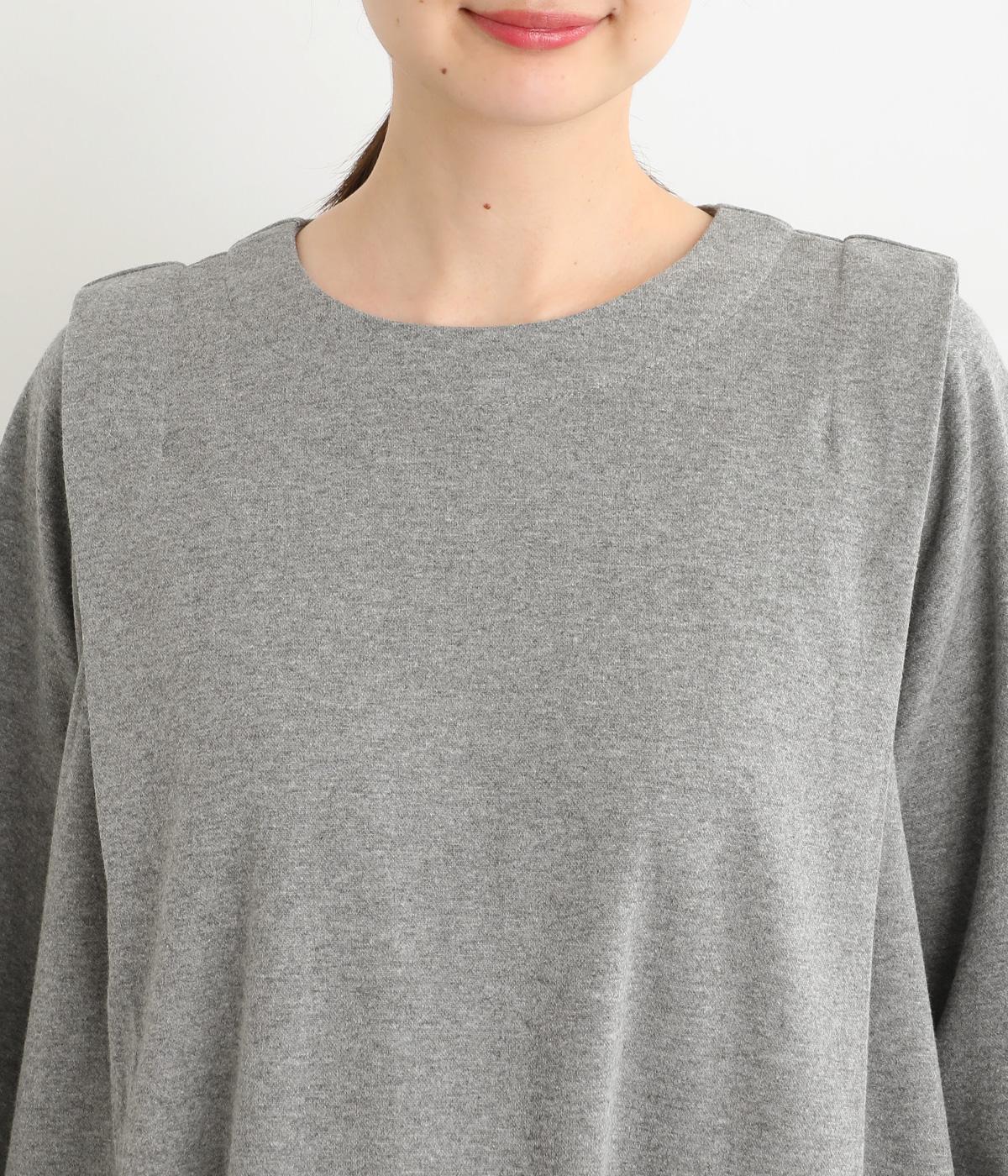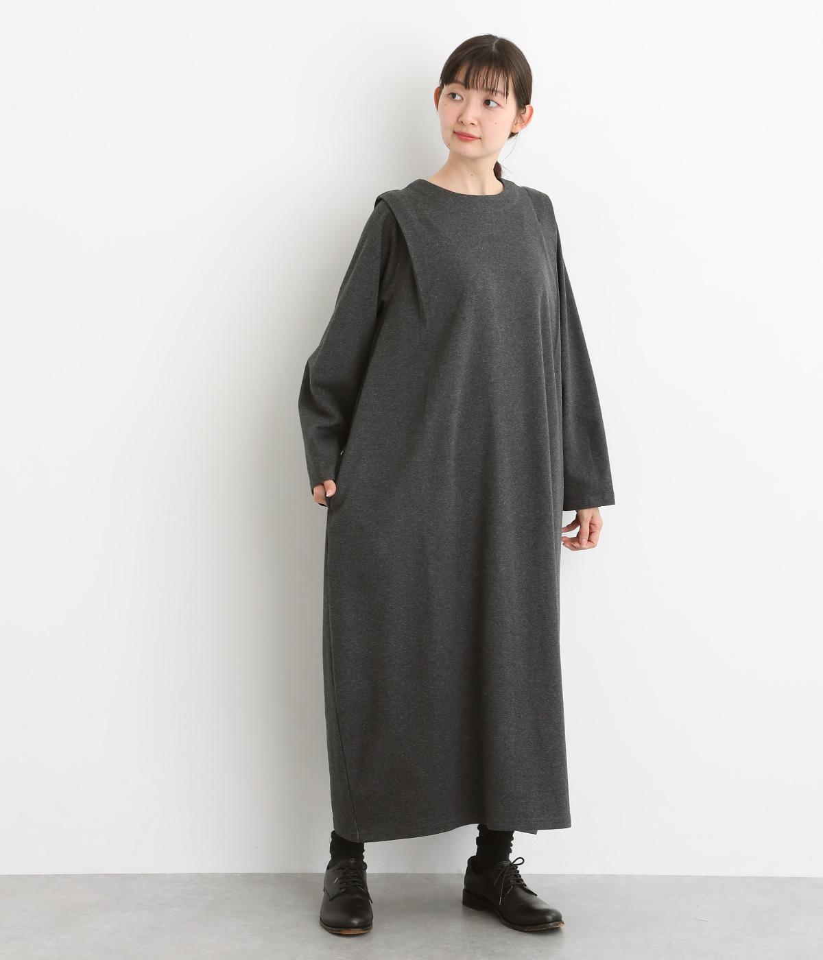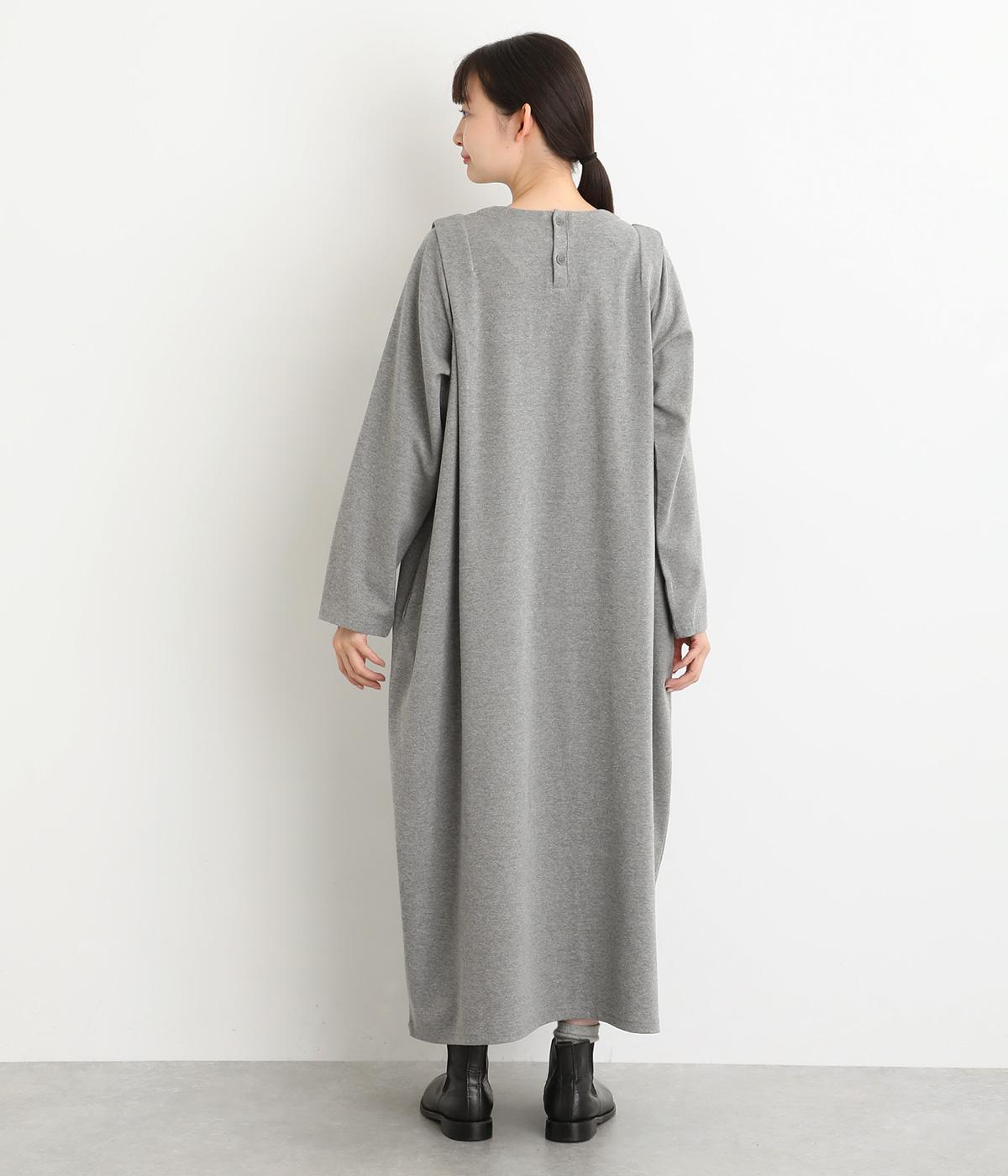 肩に大きくほどこしたタックをアクセントにしたワンピース。腰まわりにボリュームを持たせ、裾の広がりをおさえたコクーンシルエットが大人らしい印象を醸します。後ろネックのボタンが着脱をアシスト。合わせる小物次第でも印象が変わるシンプルさが魅力の一着です。